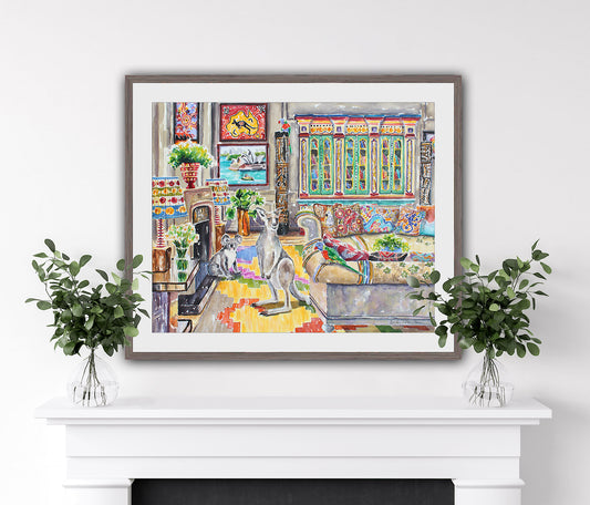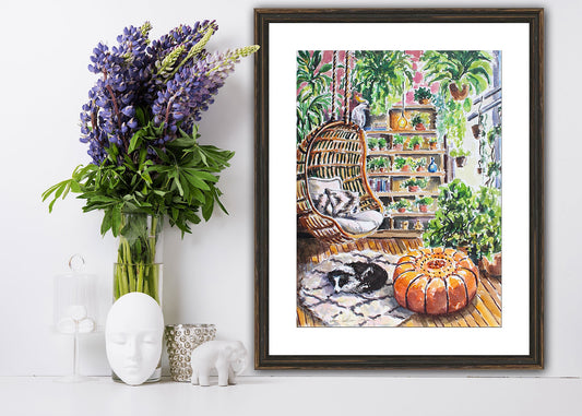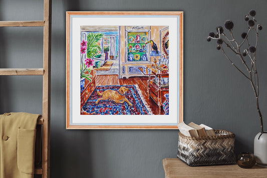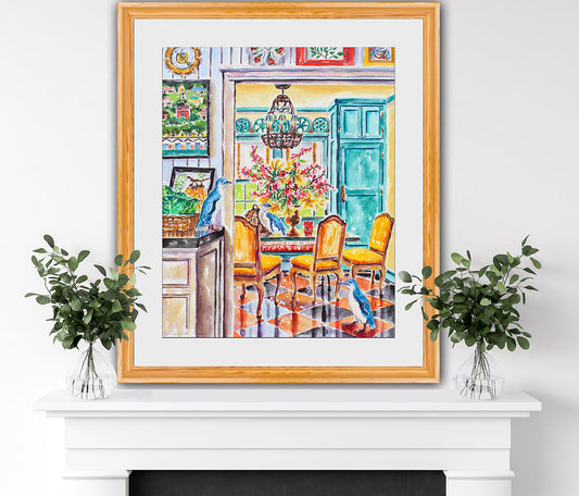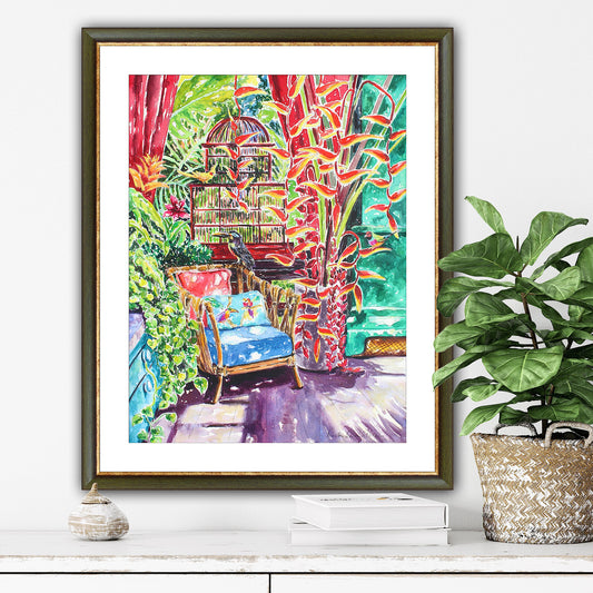 An Original Watercolor tropical home and birds painting, "Feathering The Nest"
