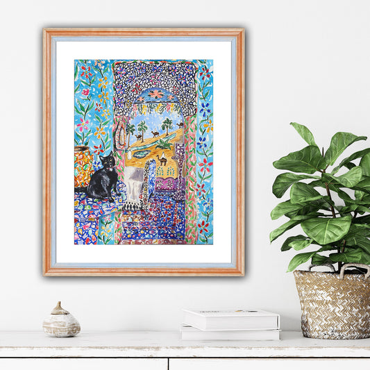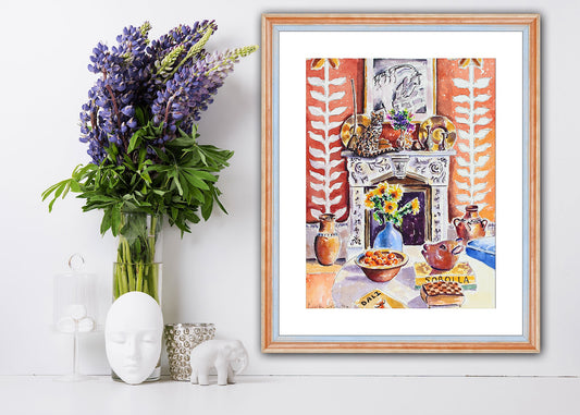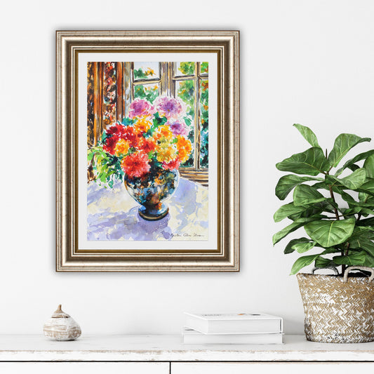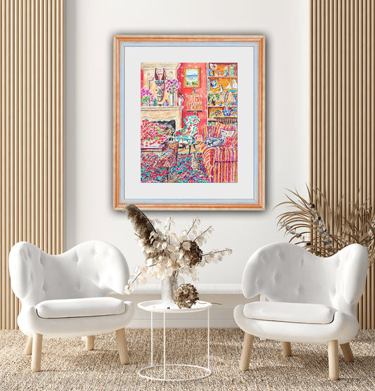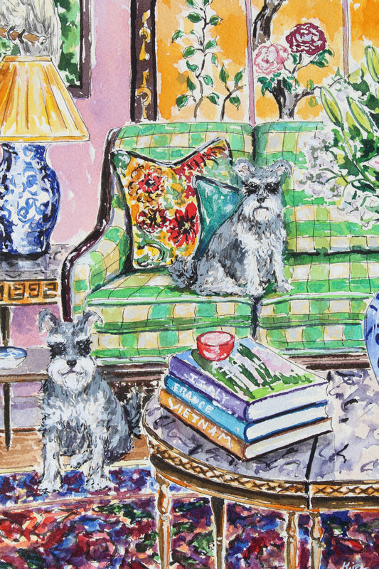 An original watercolor painting of 2 schnauzer dogs in an interior setting, The Schnauzers
