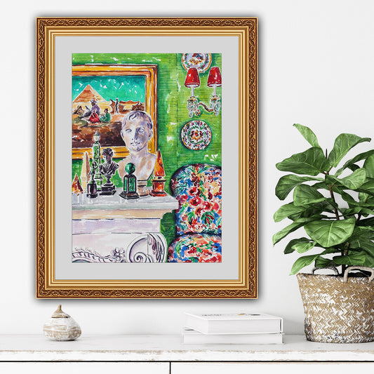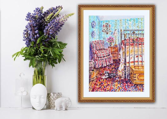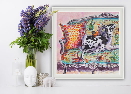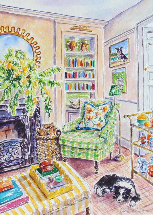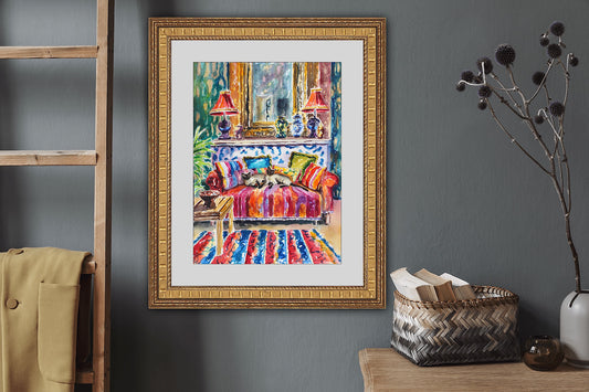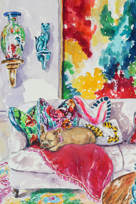Dreaming Away, Original Watercolor And Ink Interior Painting Of A French Bulldog Asleep