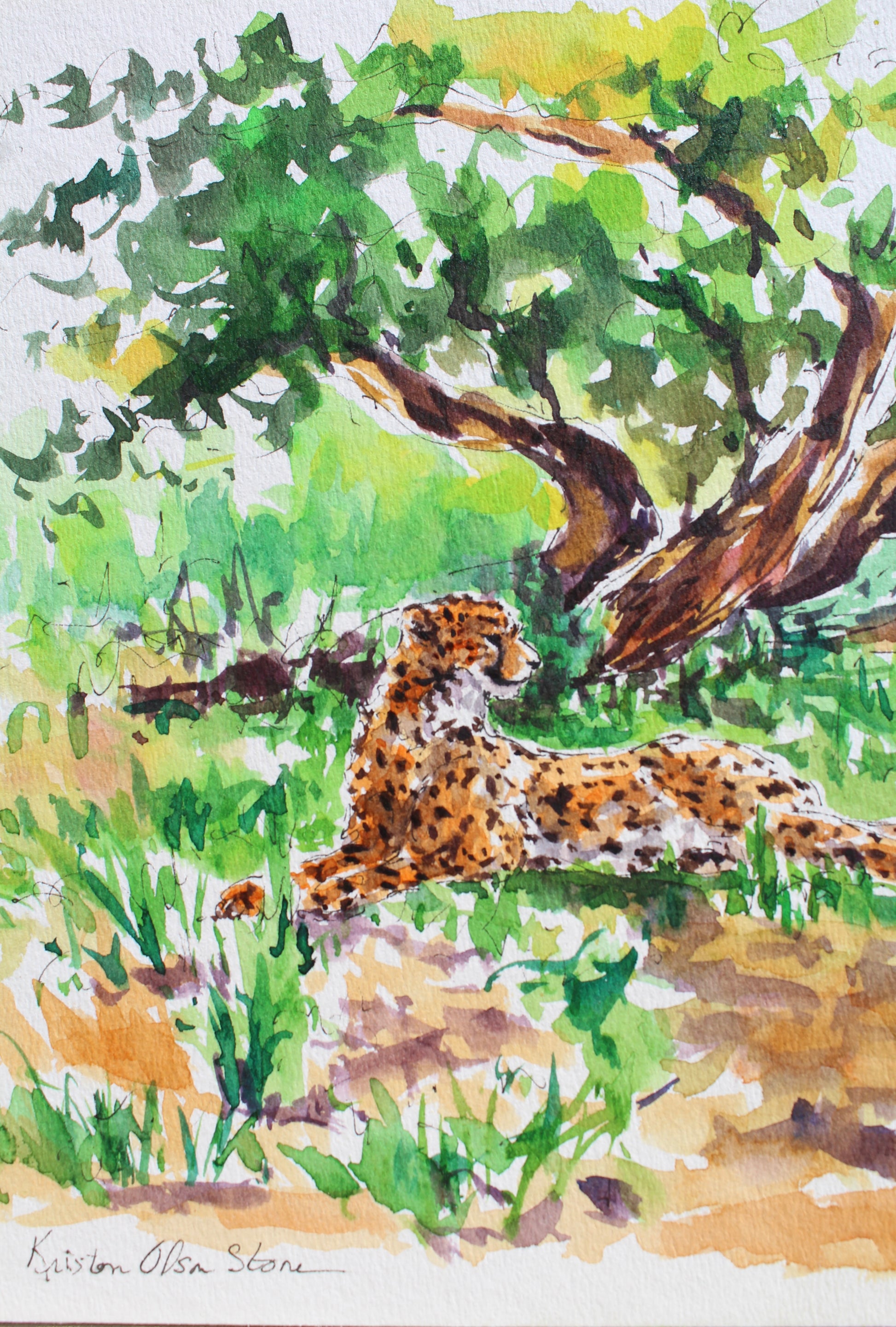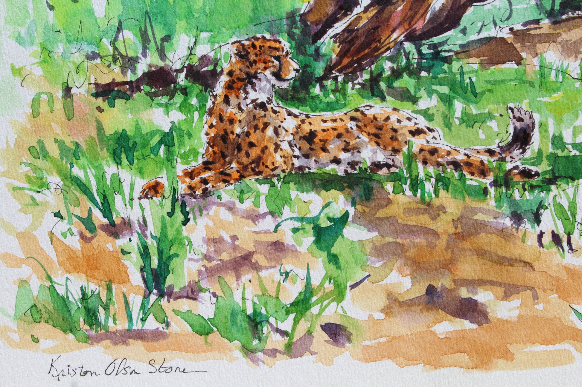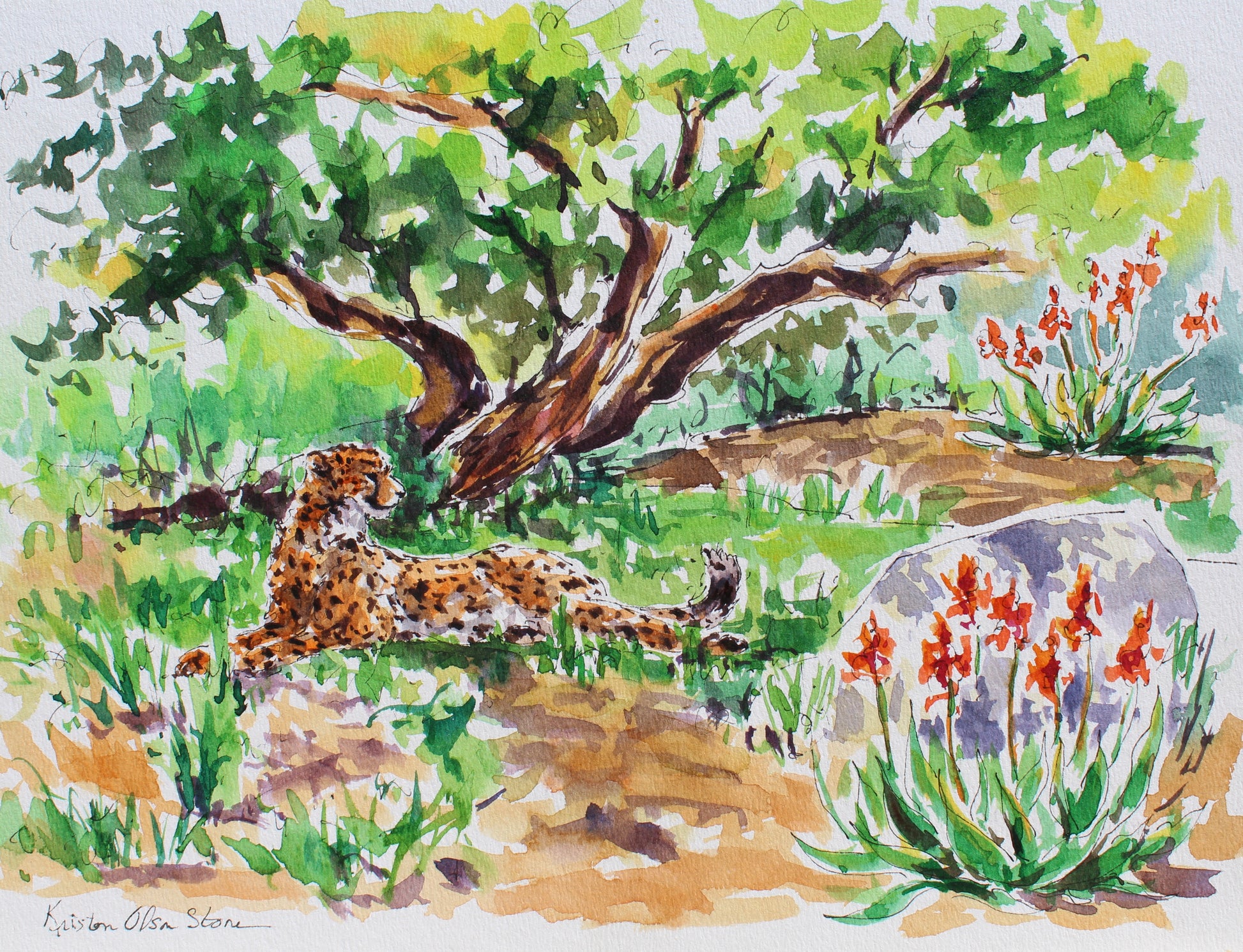 An original watercolor painting done on location or, "en plein air", at The Living Desert Zoo And Botanical Garden in Palm Desert, Southern California. I enjoy painting and sketching wildlife on location! This beautiful cheetah and I enjoyed a cool, breezy spring morning!