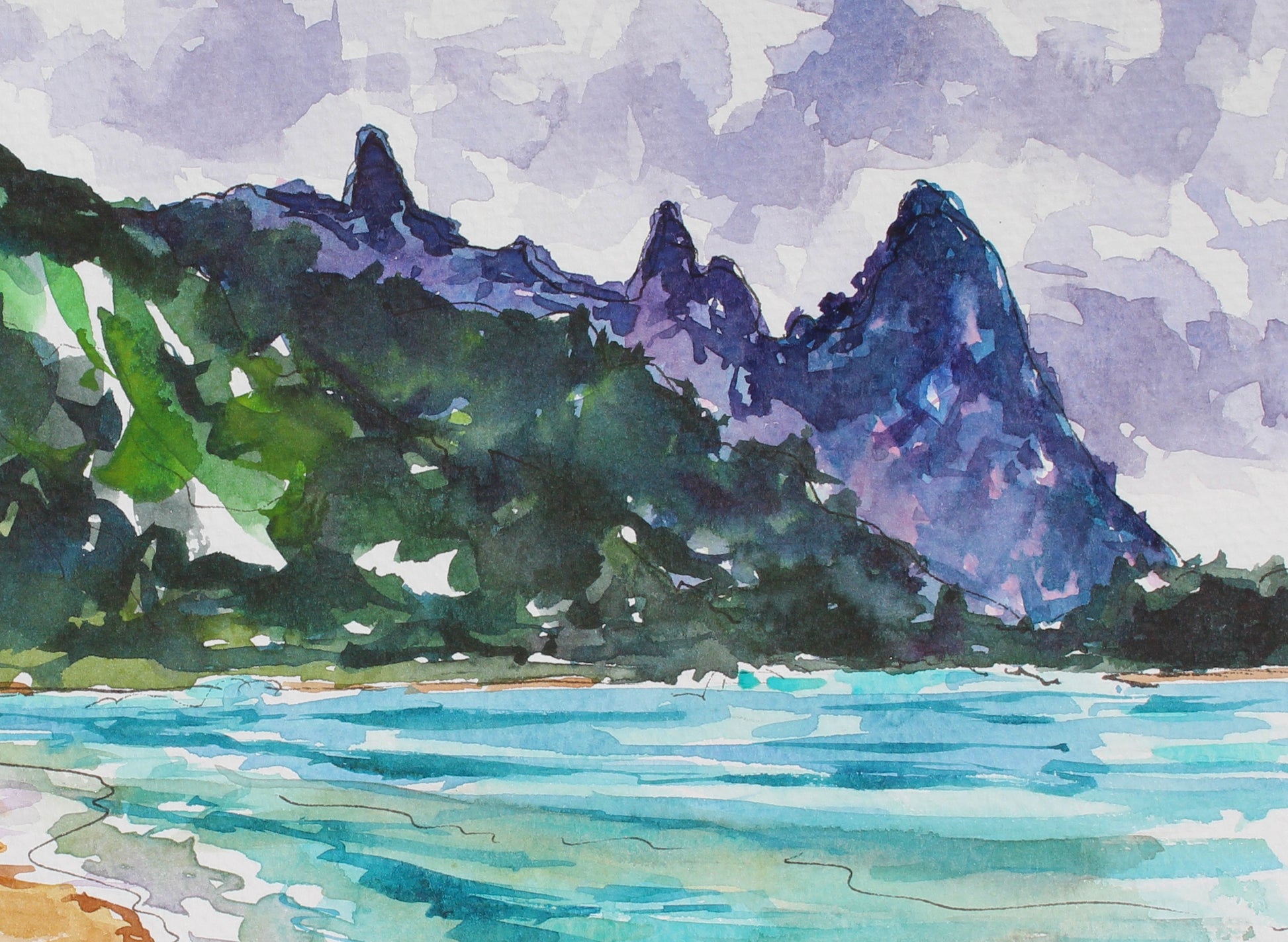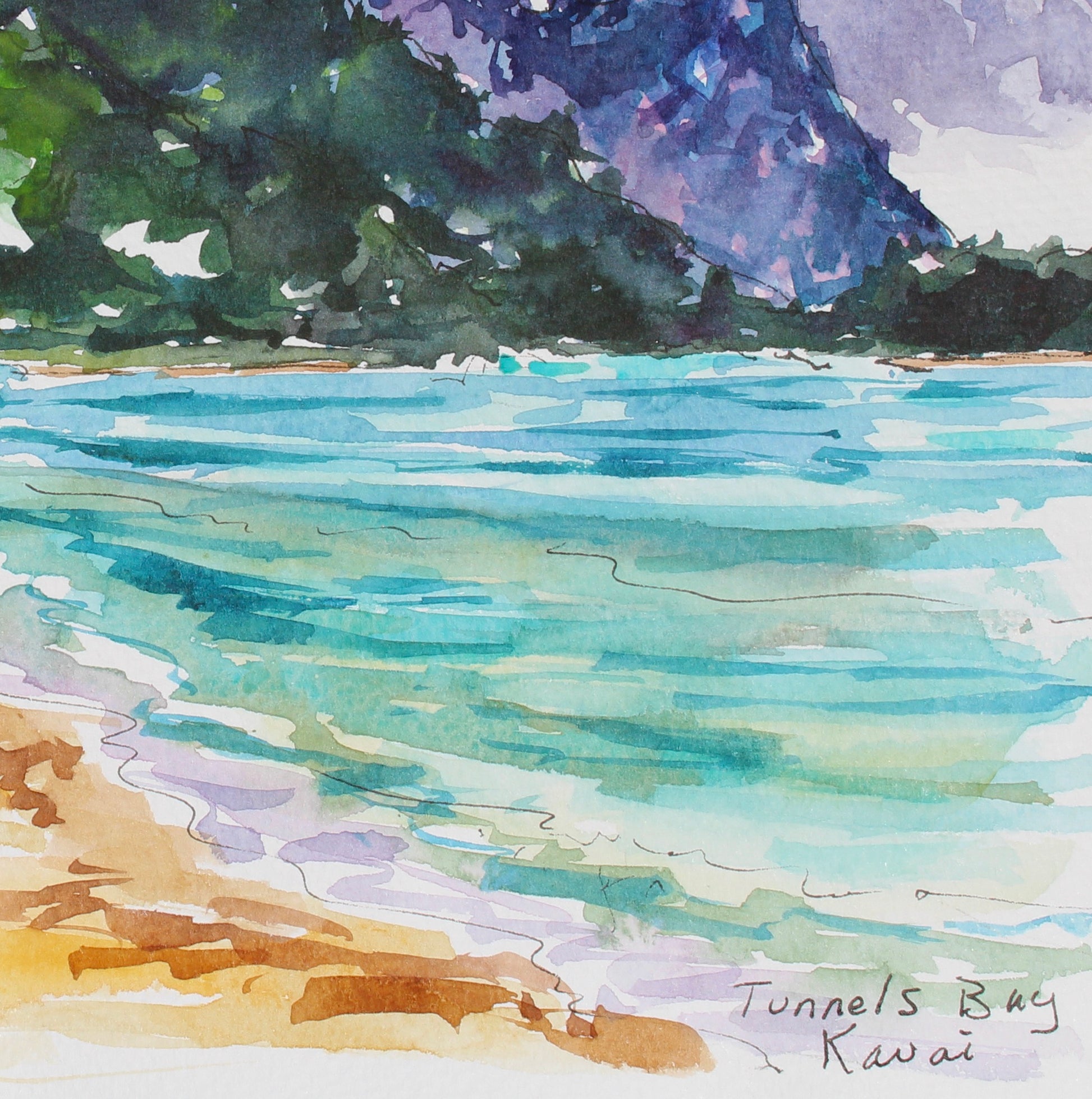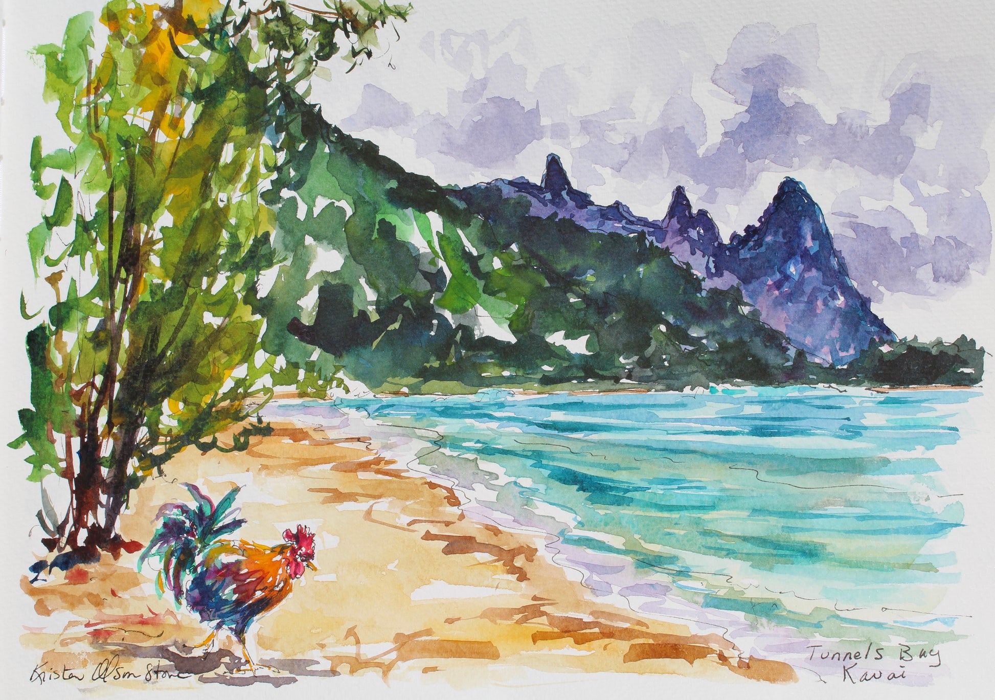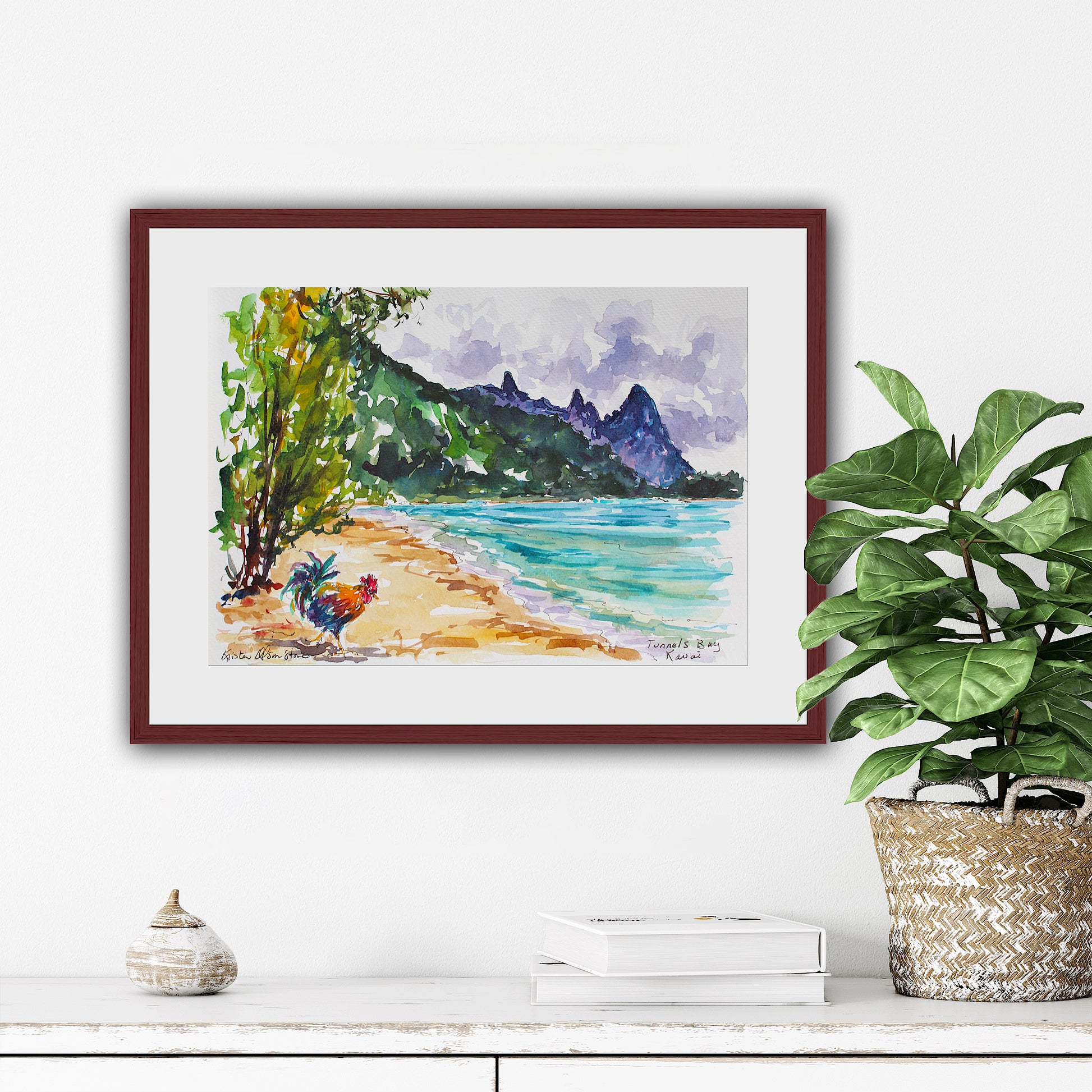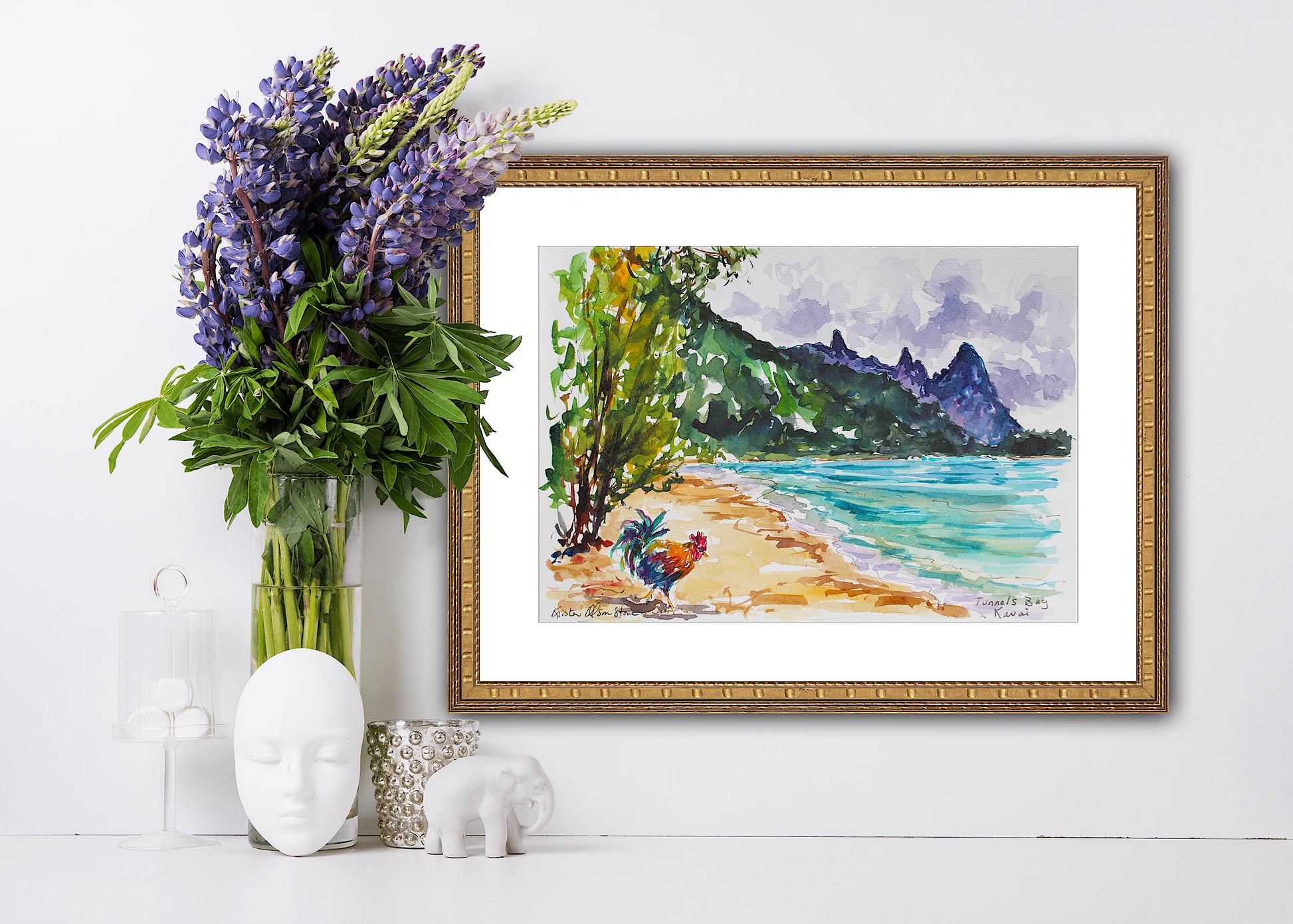 An original 8.5” x 11.5” or 21.59cm x 29.21cm, watercolor and ink painting of a rooster on the beach at Tunnels Beach on the island of Kauai in Hawaii! Kauai is famous for their wild chickens.