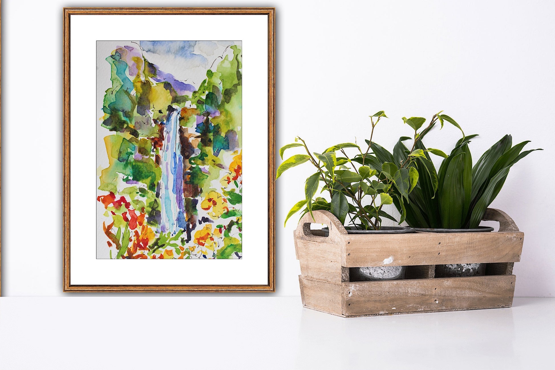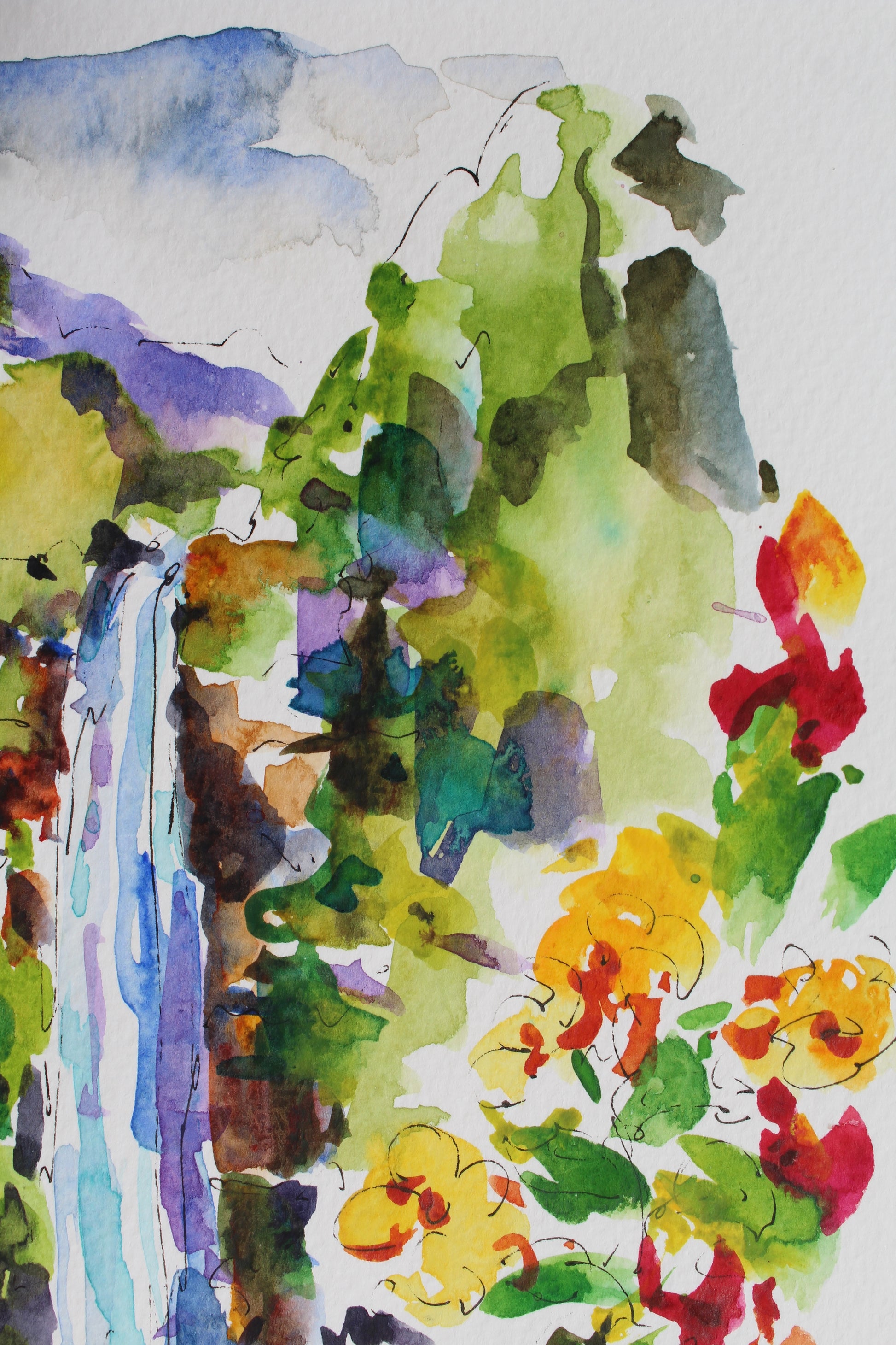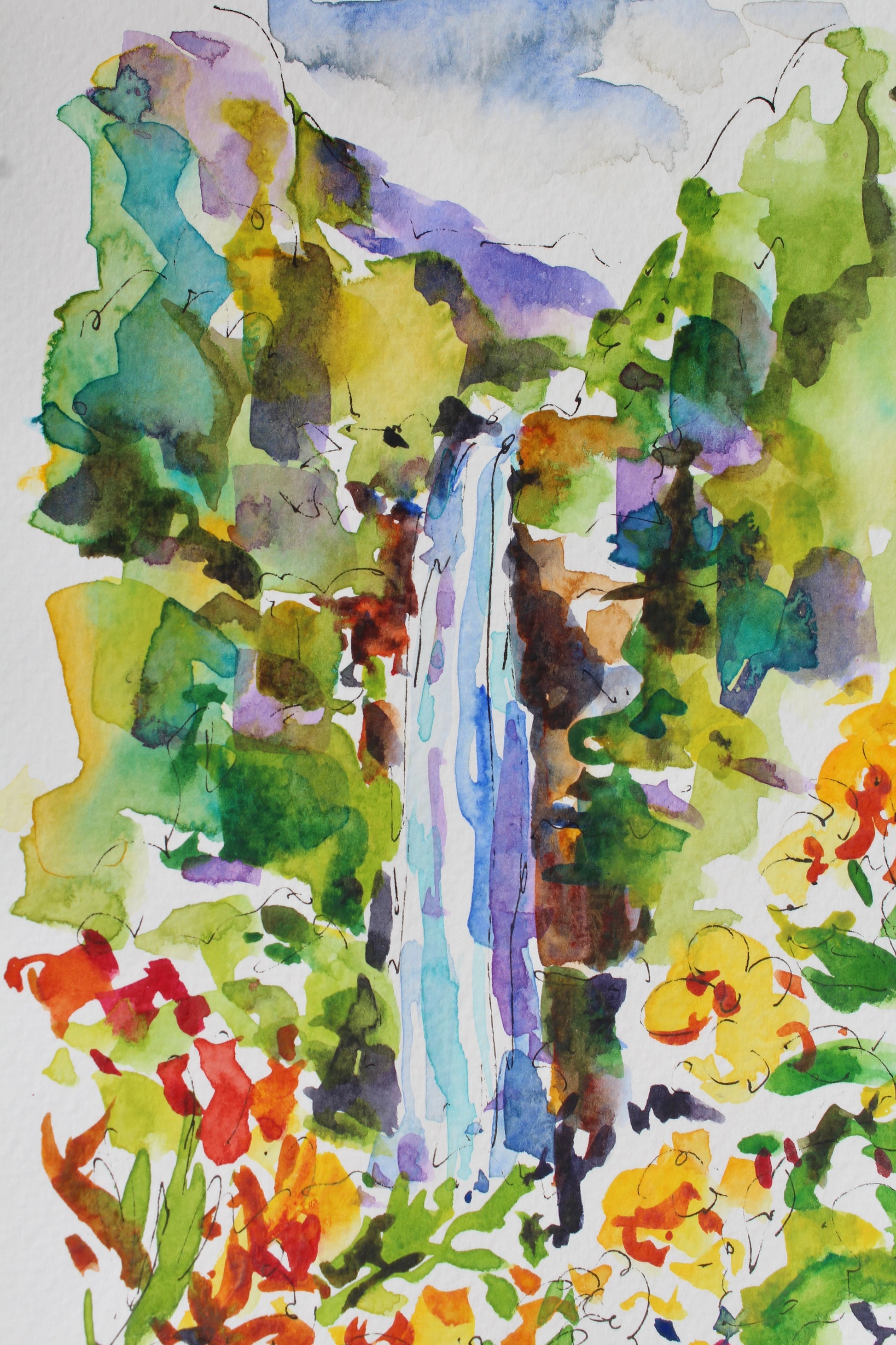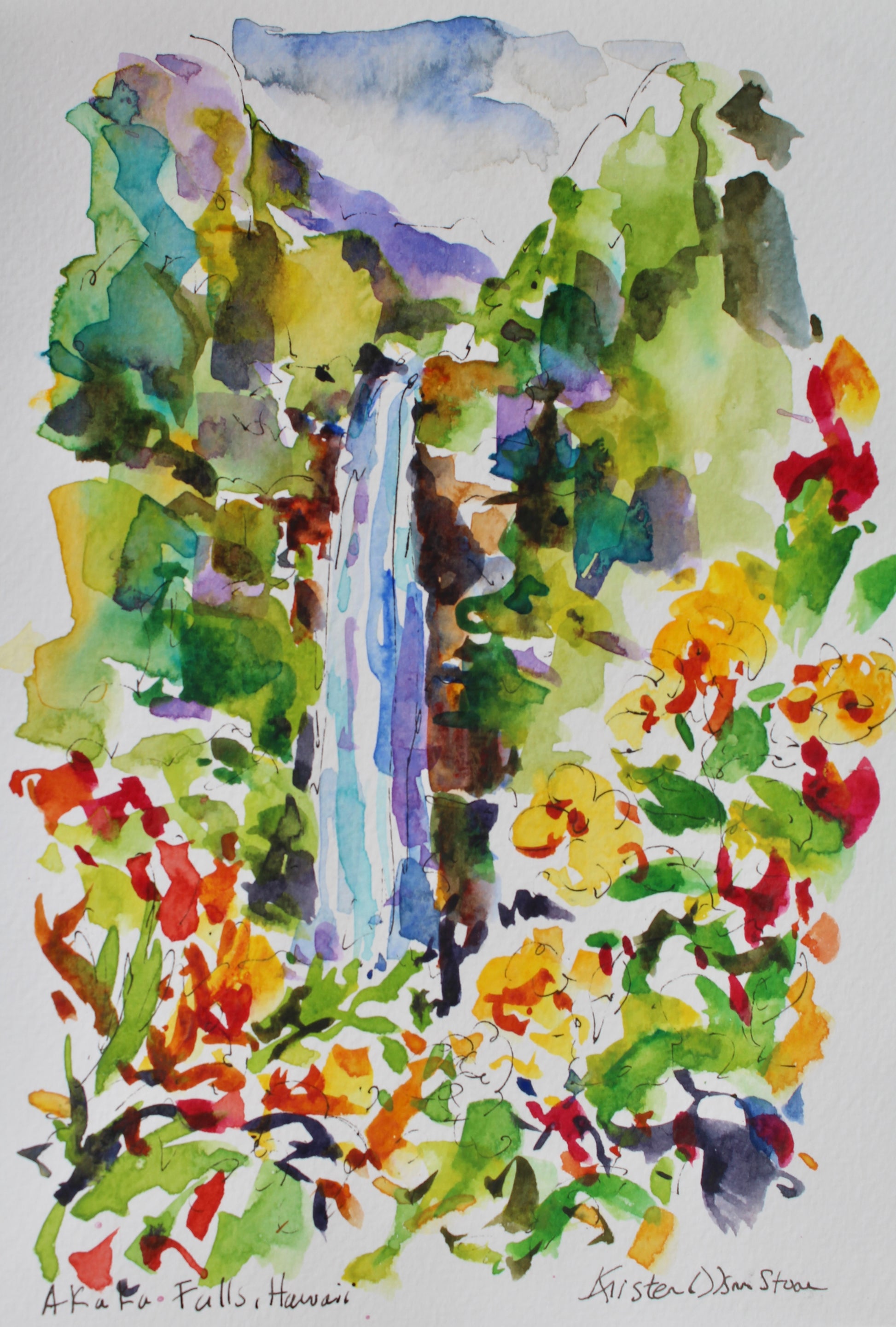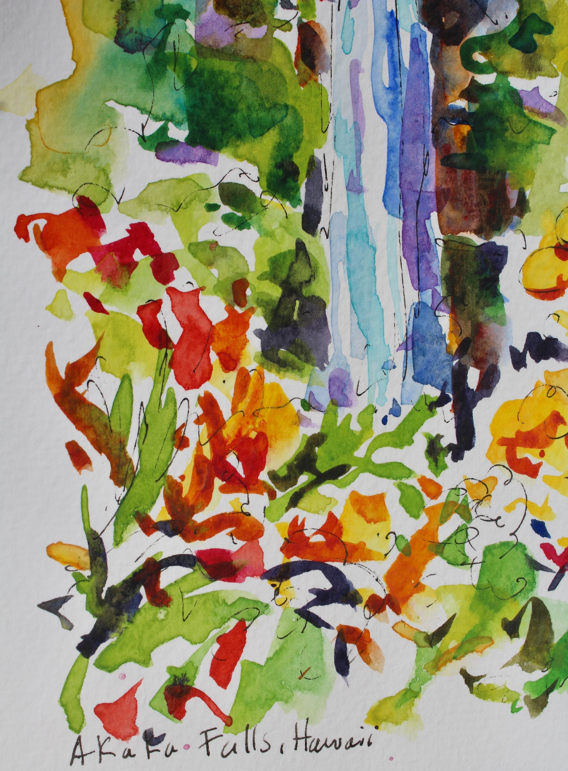 An original 7.5" x 8.25" or 21.51cm x 19.05cm, watercolor and ink sketch of Akaka Falls in Hilo, Hawaii. This painting is painted on Rembrandt watercolor paper with Rembrandt professional watercolor paints and archival ink.