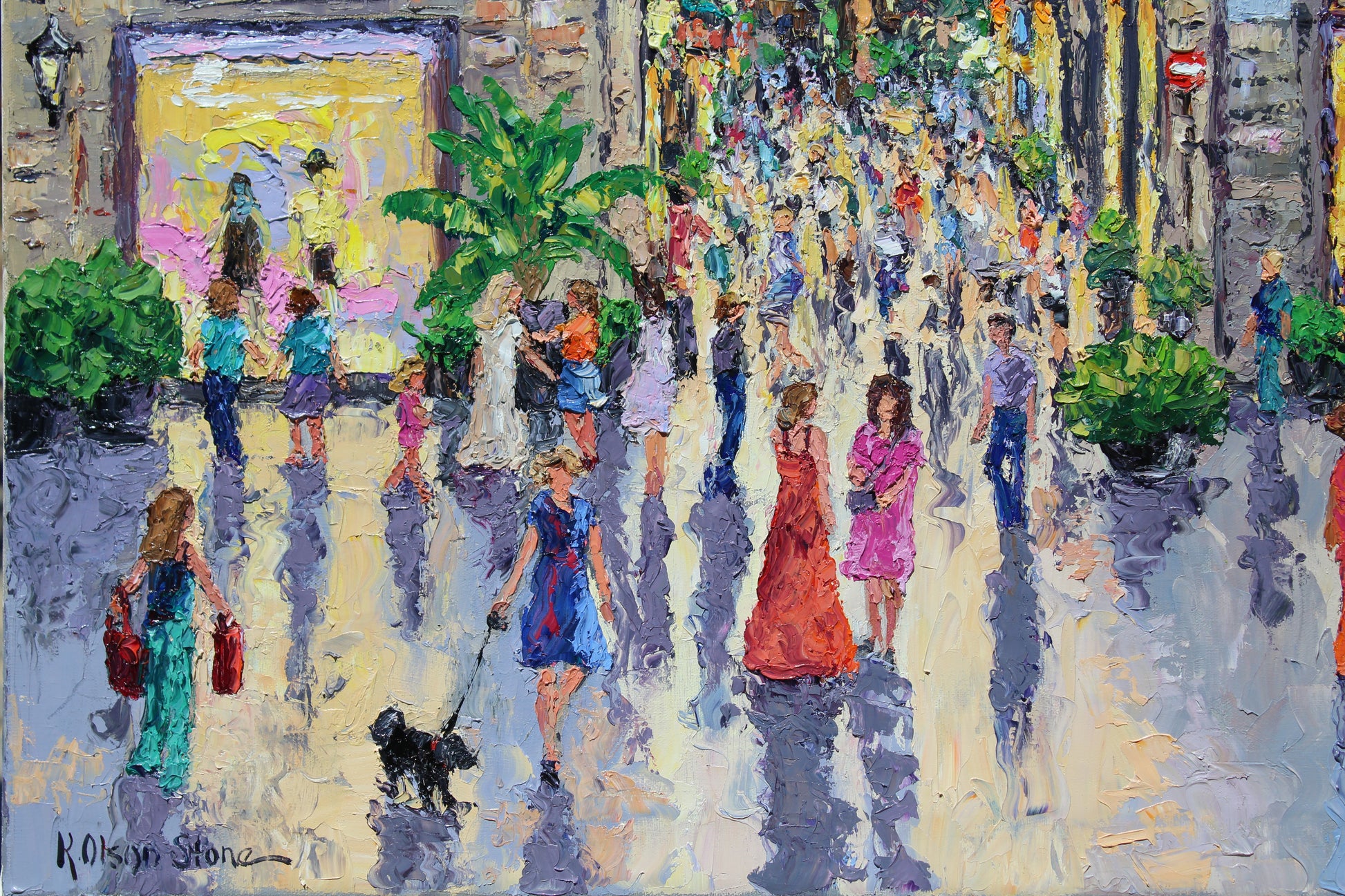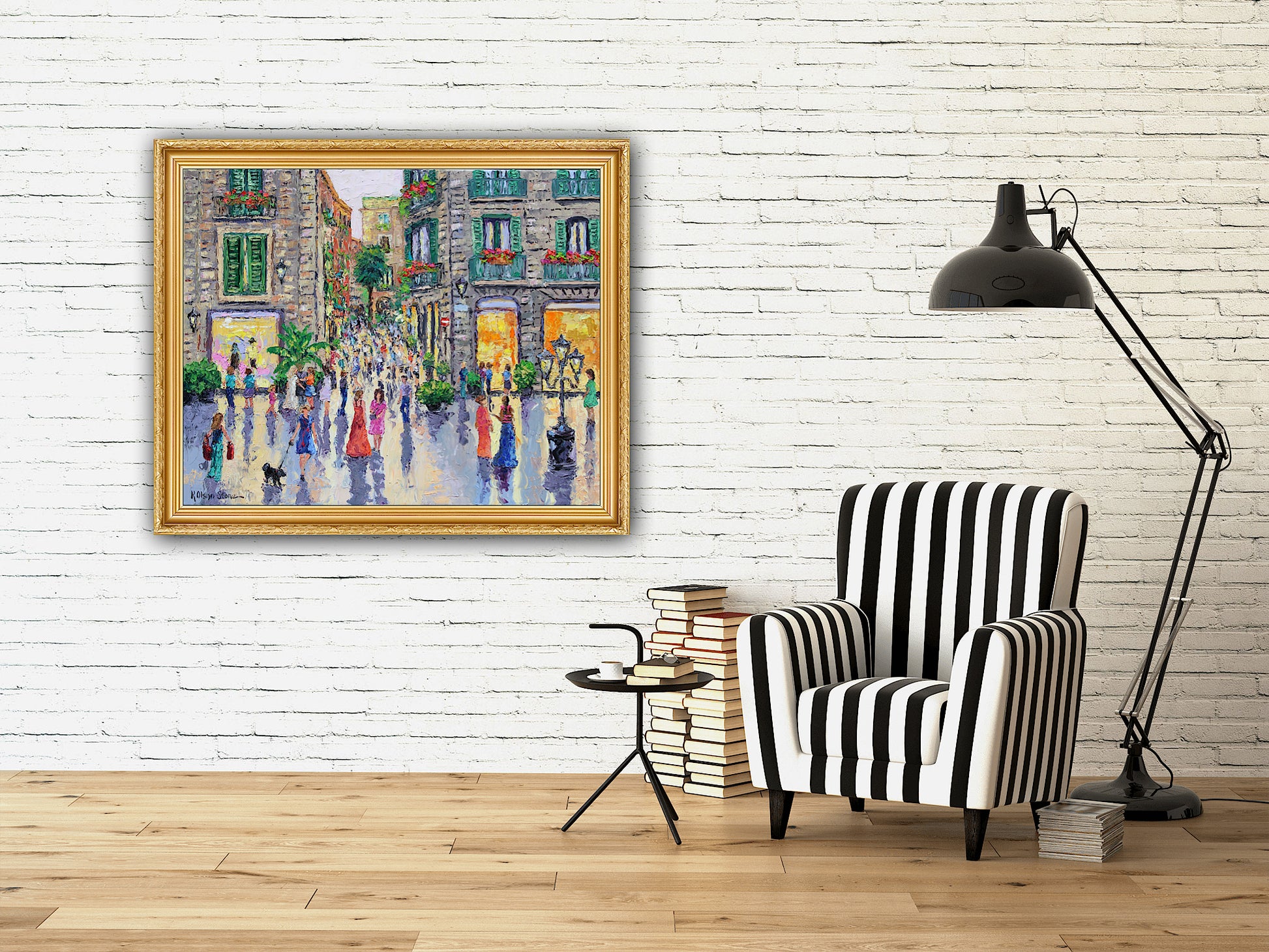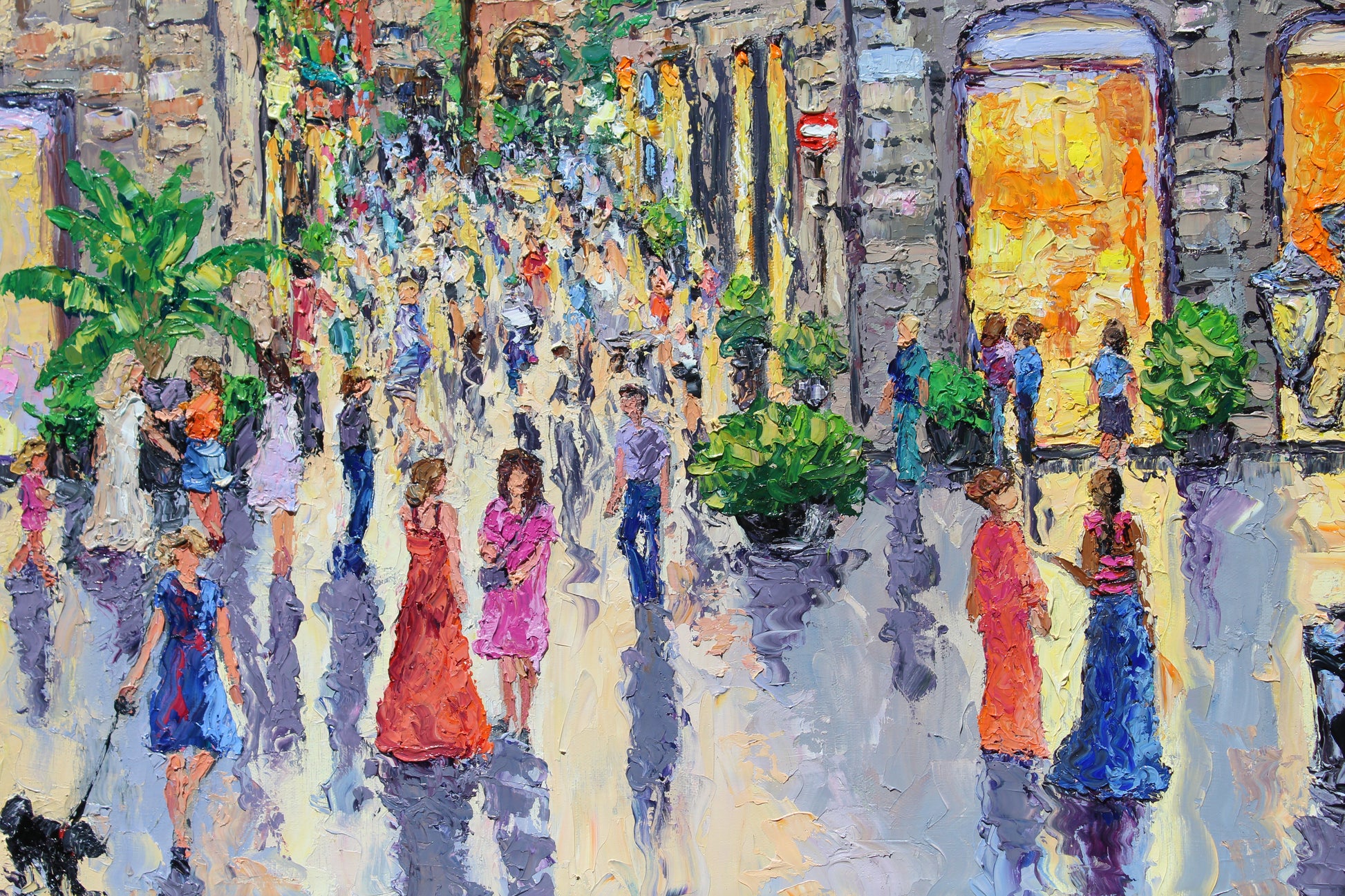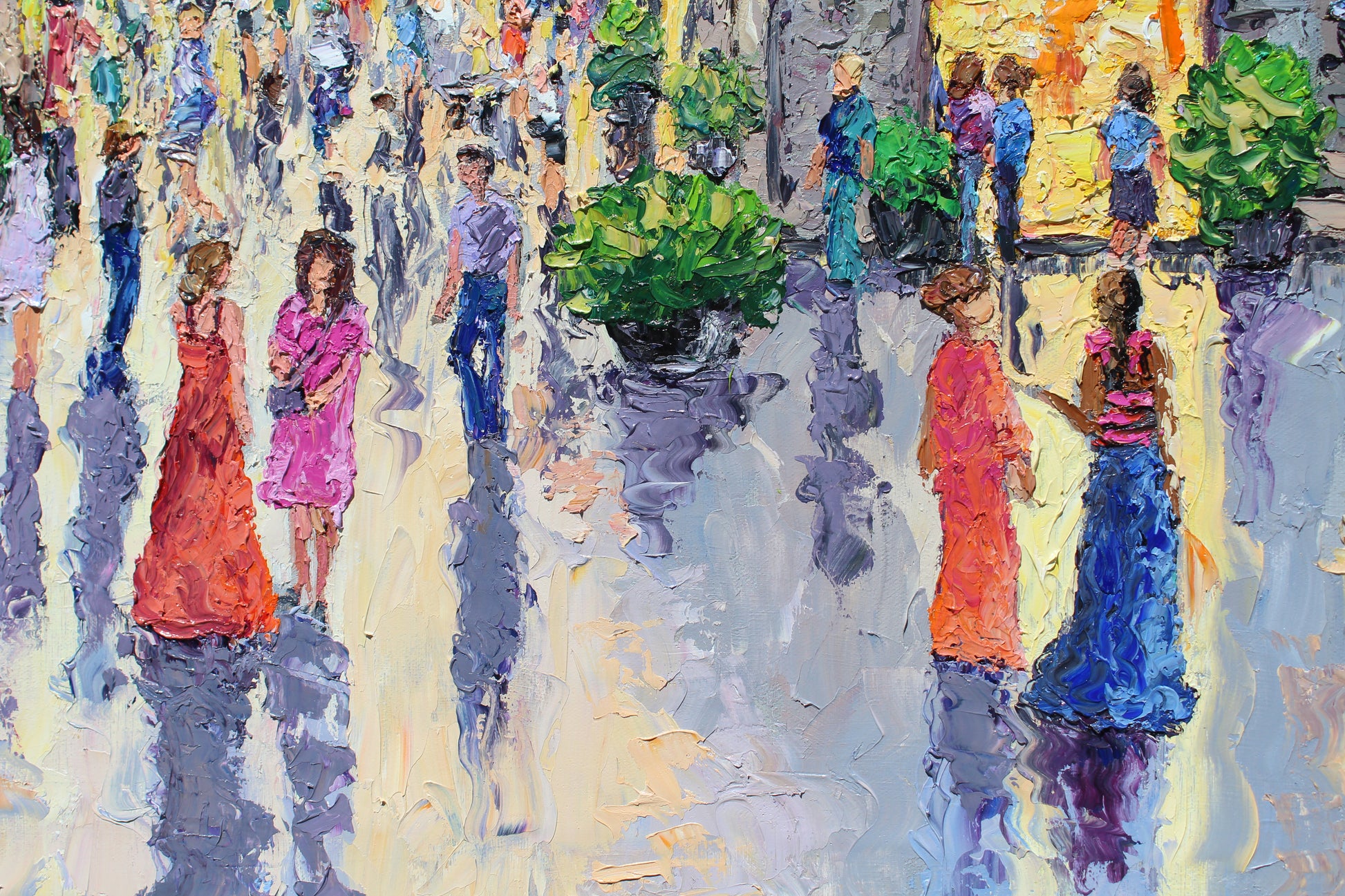 An original 30" x 24" or 76.2cm x 60.96cm, cityscape oil painting of Barcelona. This painting depicts people enjoying the warm summer evening in the El Born neighborhood which borders the Gothic Quarter of Barcelona, Spain.