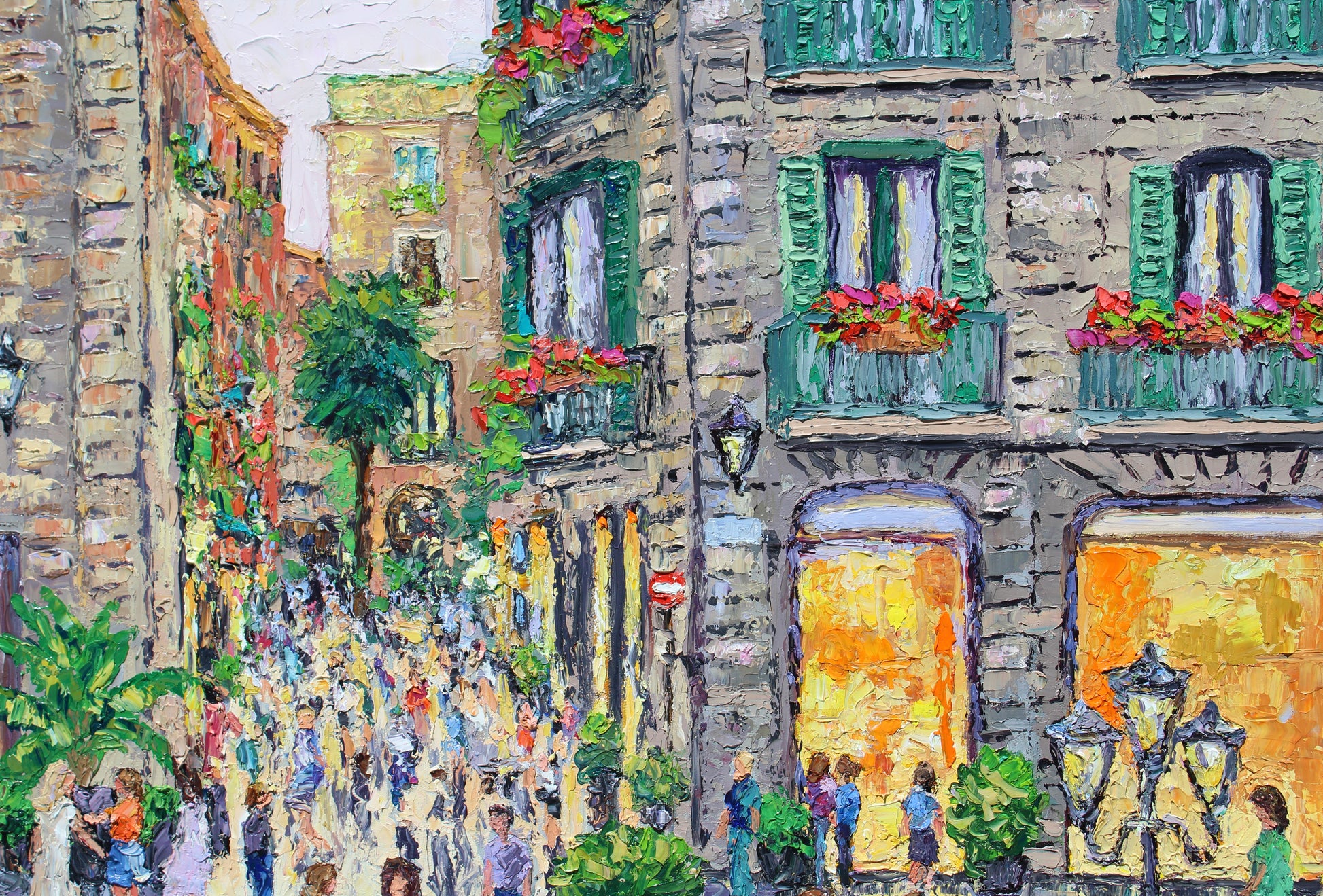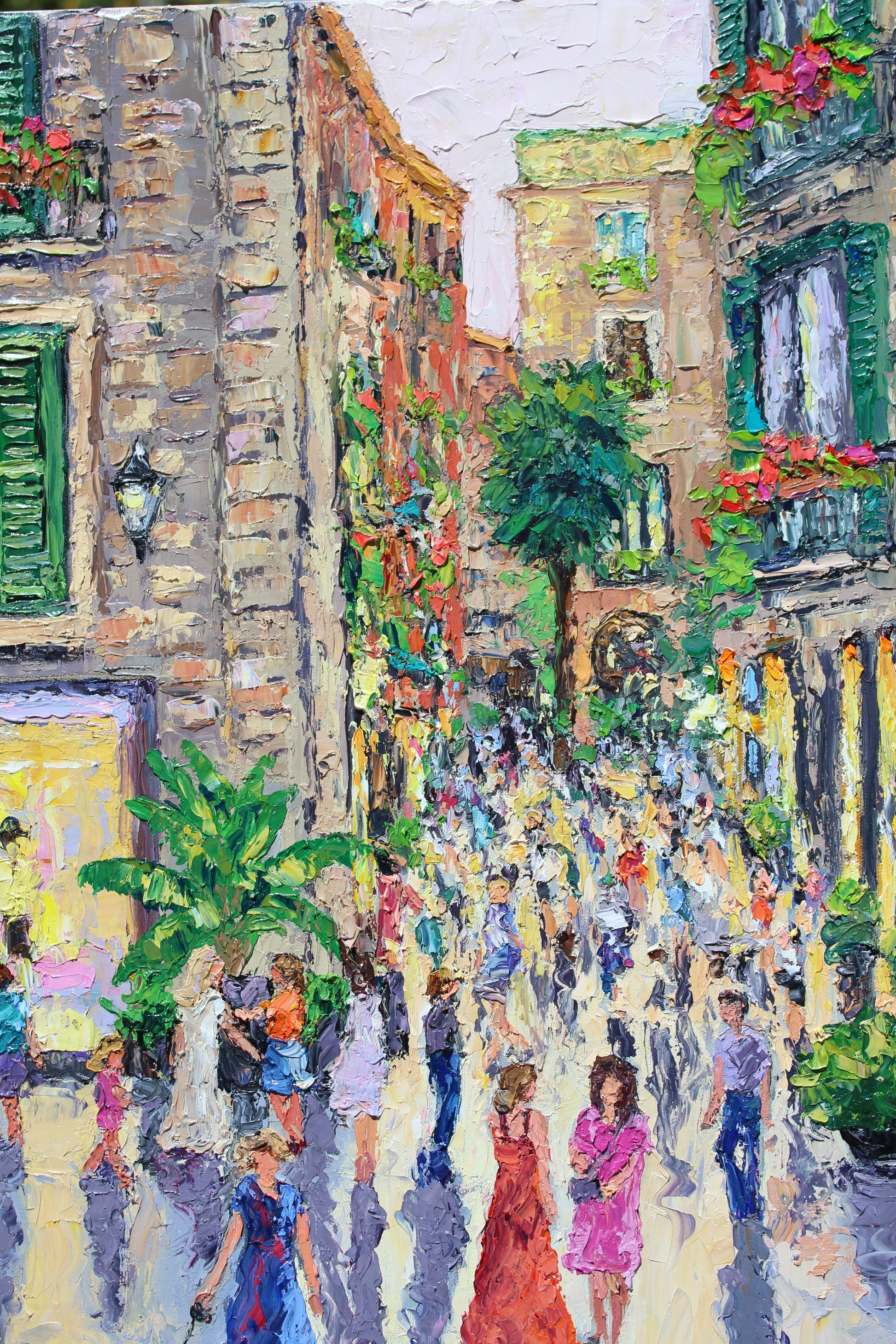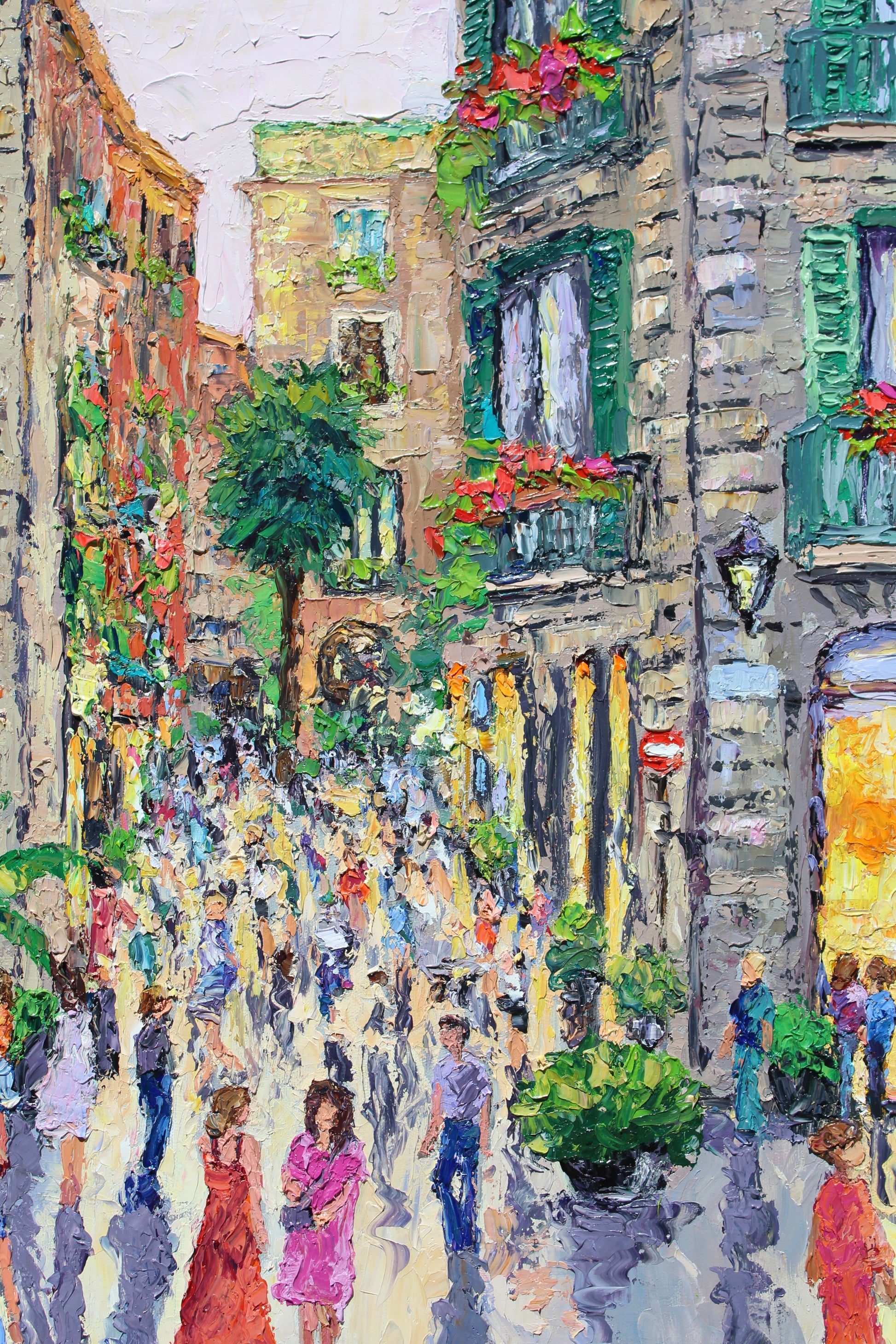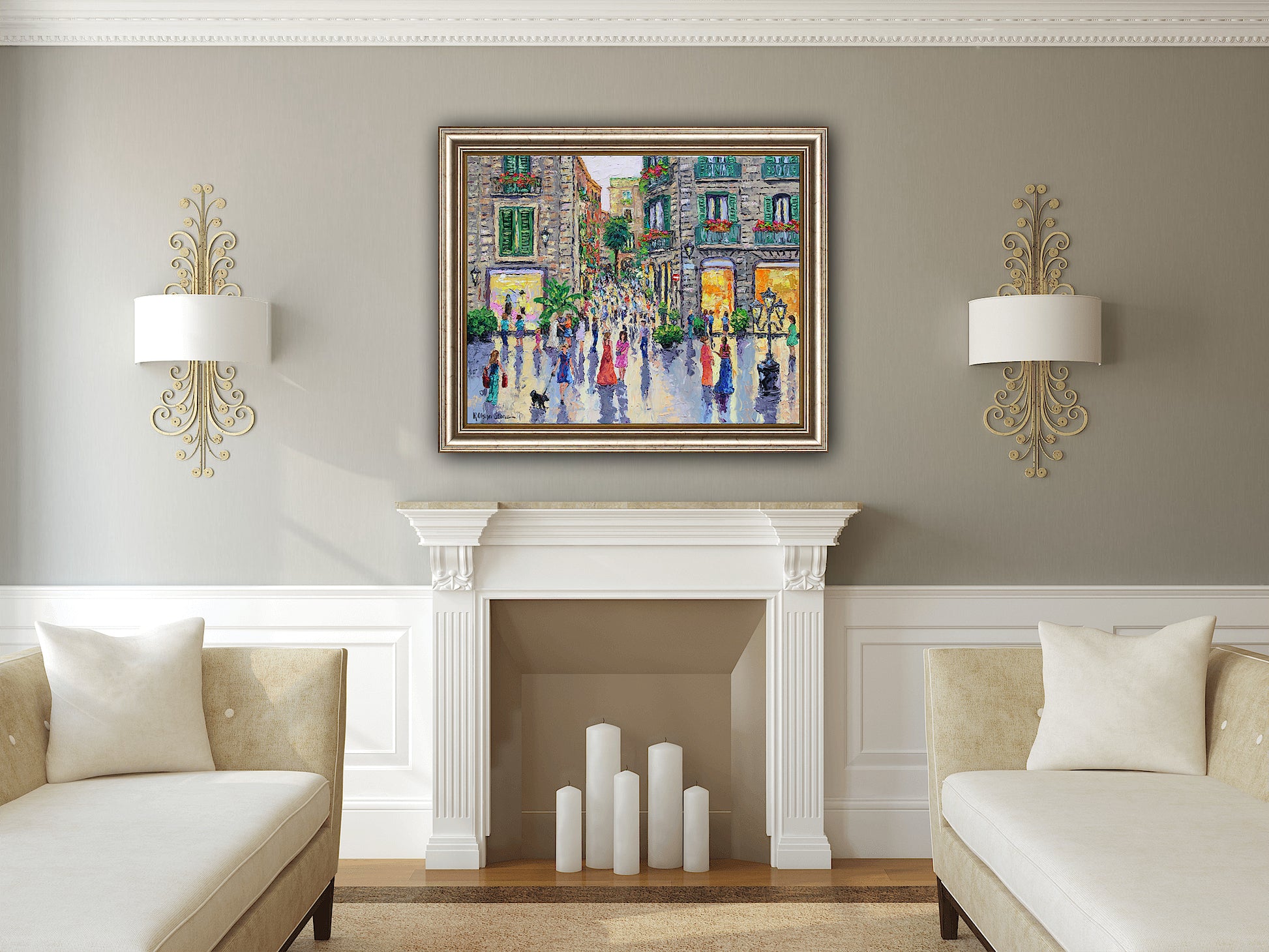 An original 30" x 24" or 76.2cm x 60.96cm, cityscape oil painting of Barcelona. This painting depicts people enjoying the warm summer evening in the El Born neighborhood which borders the Gothic Quarter of Barcelona, Spain.