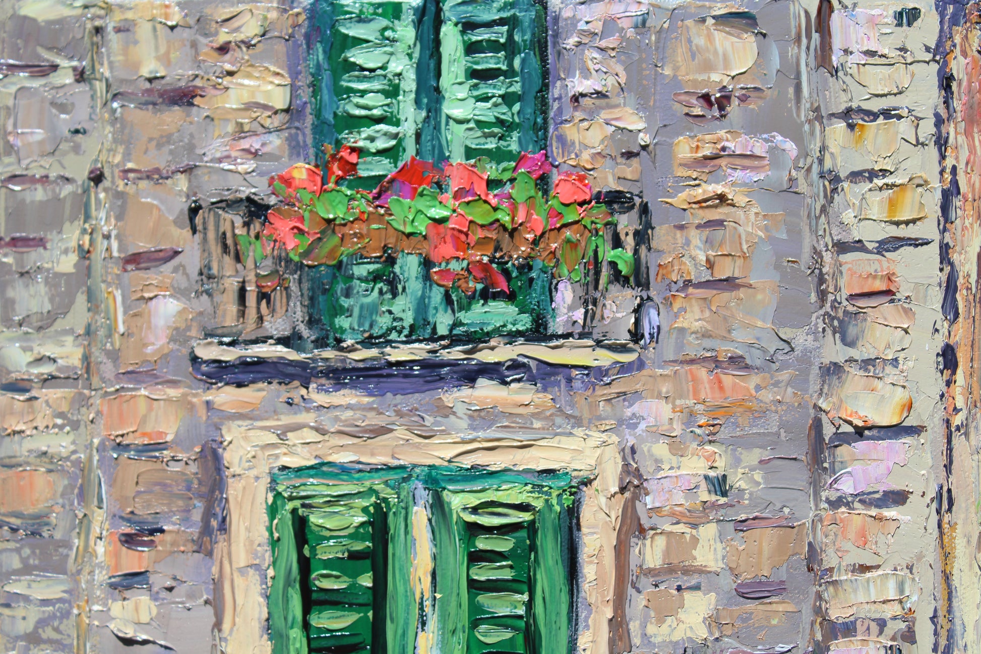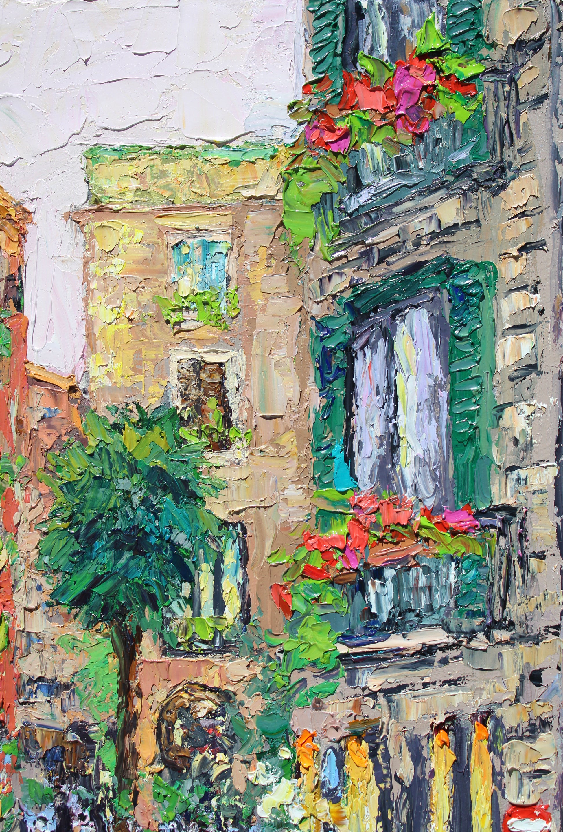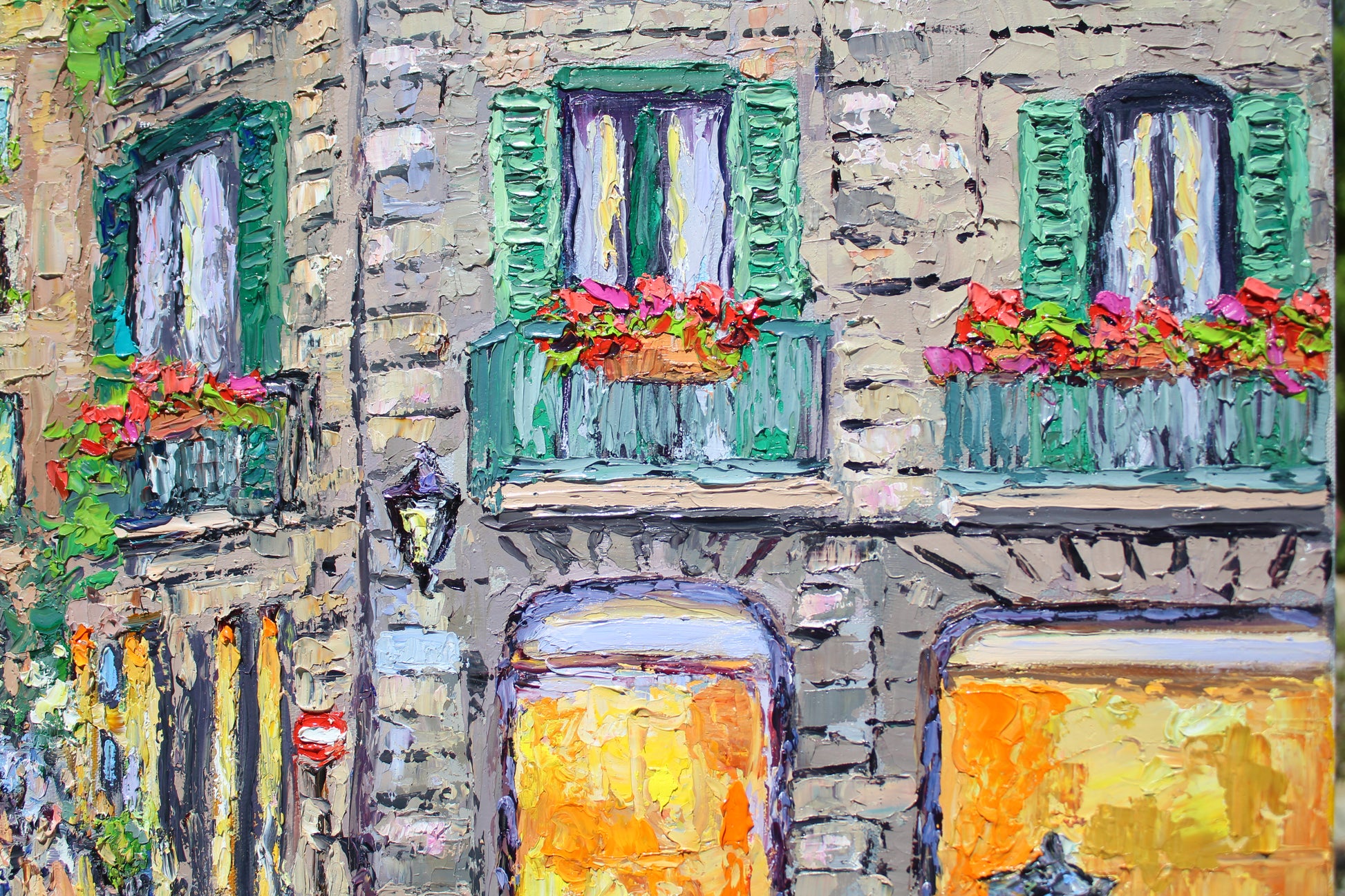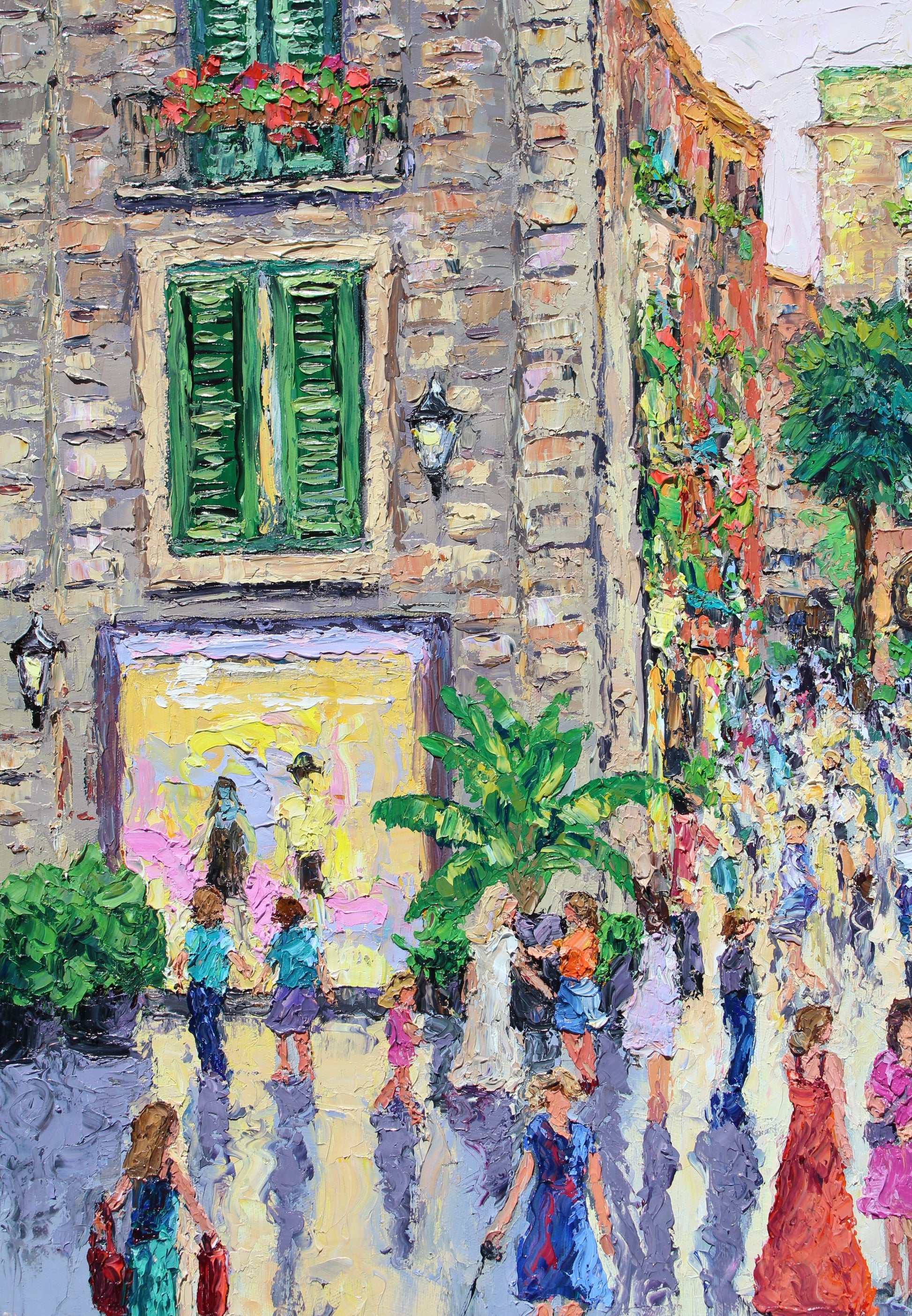 The whole scene captures the golden light of the late evening, summer sun. Tourists and shoppers are strolling and chatting in front of beautiful buildings with shop windows with green shutters and begonias.