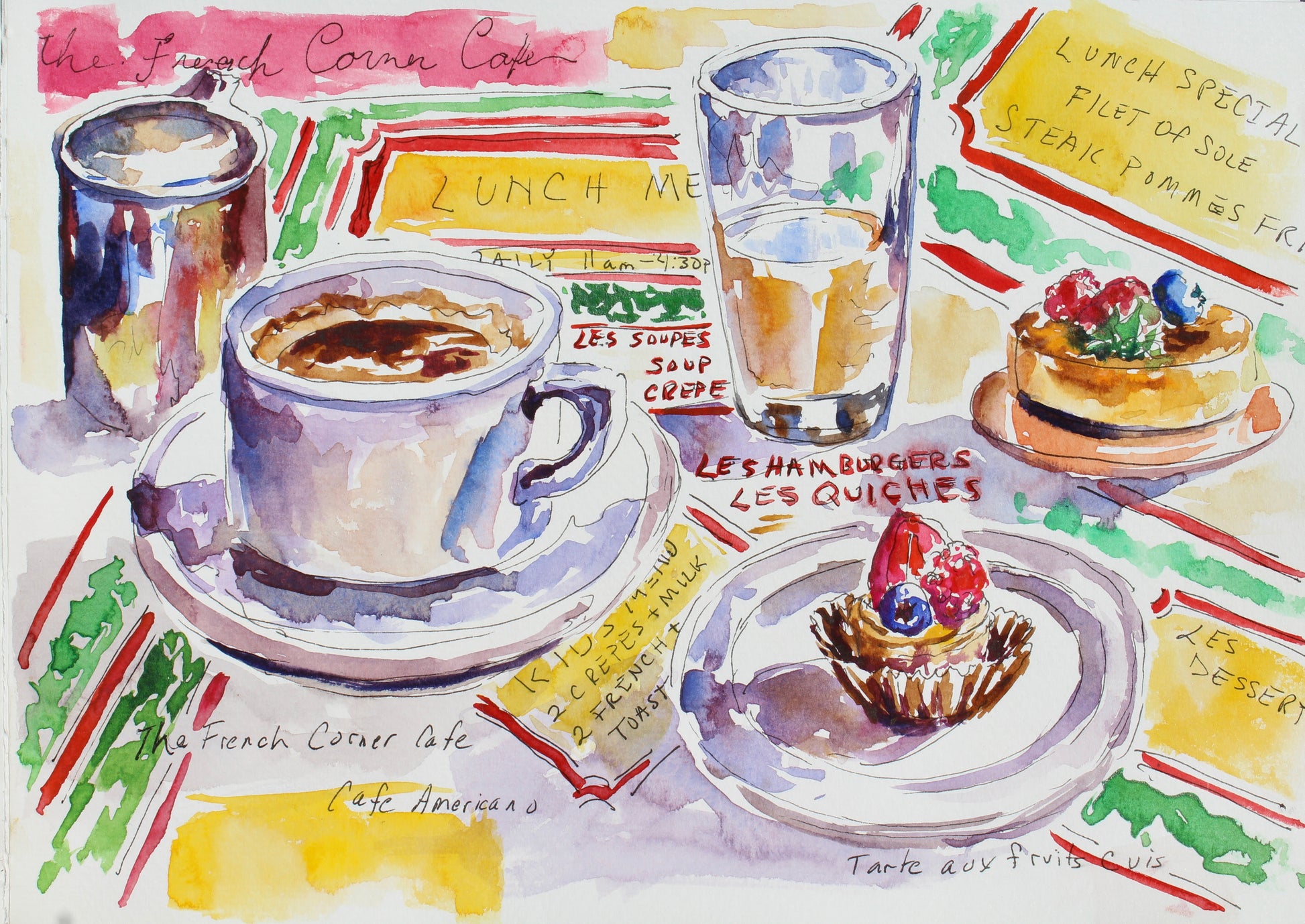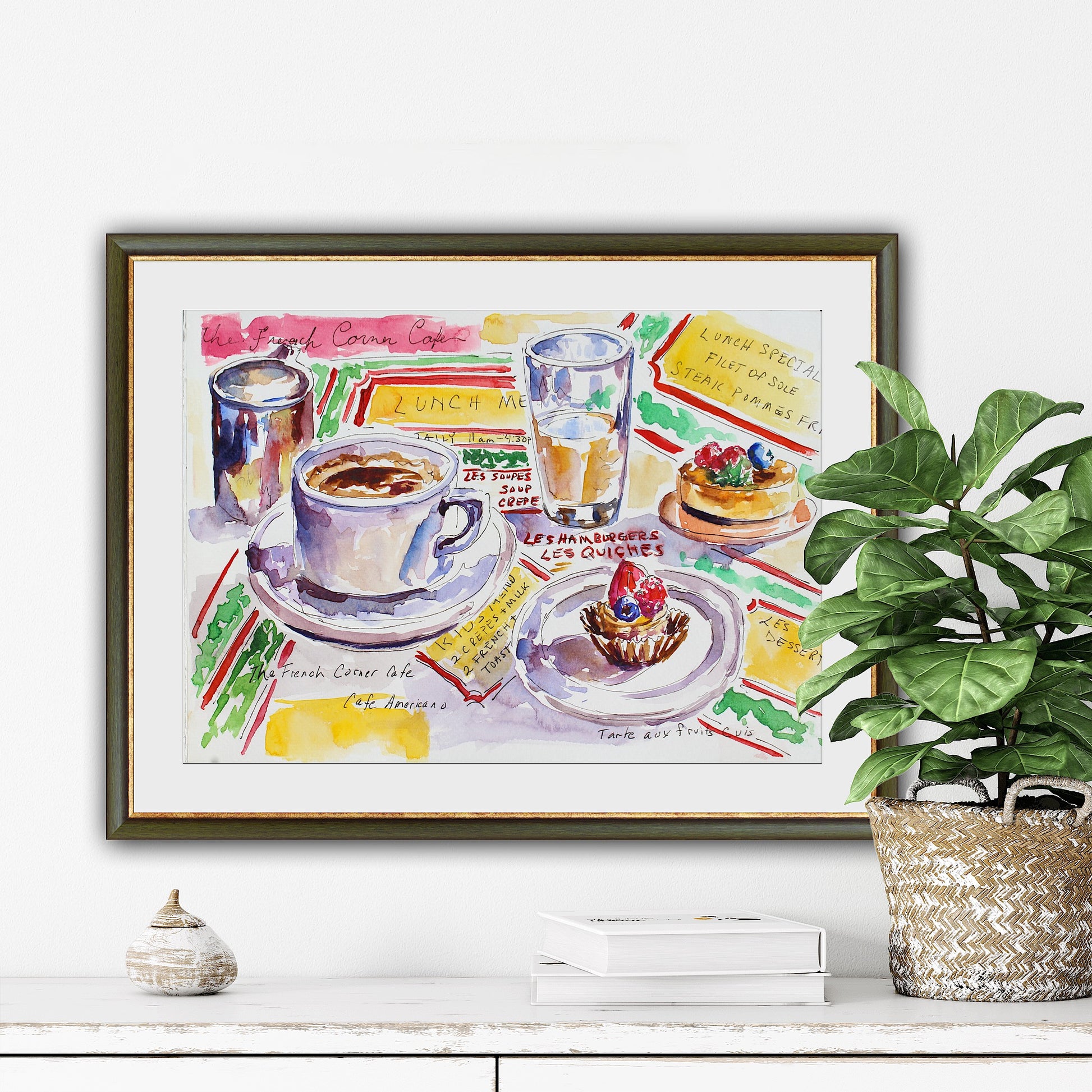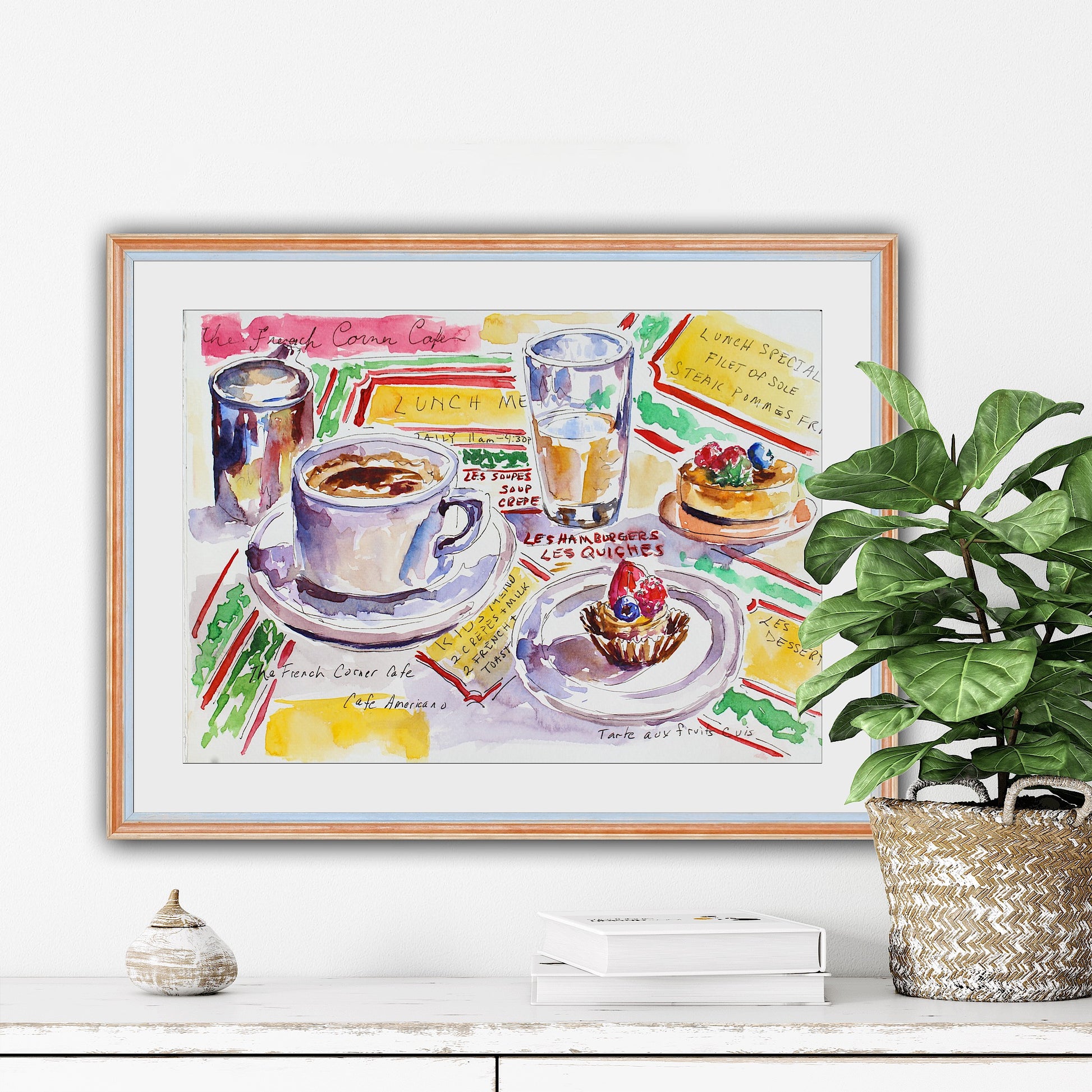 An original 8.5” x 11.5” or 21.59cm x 29.21cm, watercolor and ink painting of my gorgeous pastries and coffee at my favorite cafe!