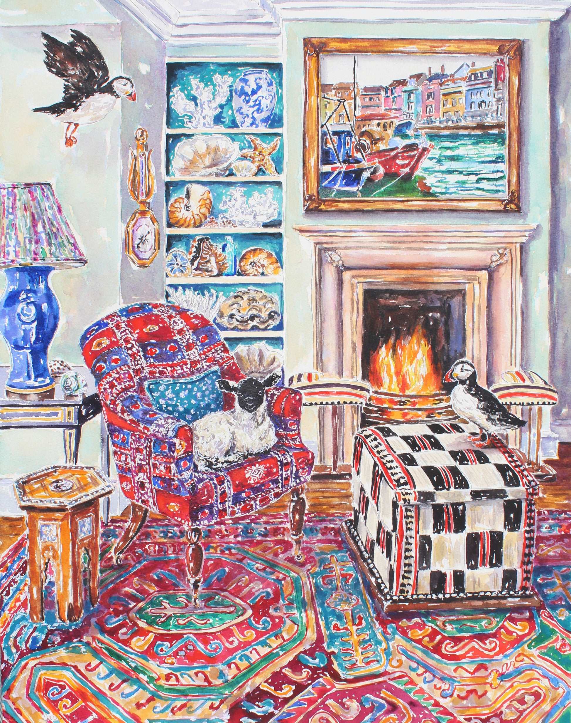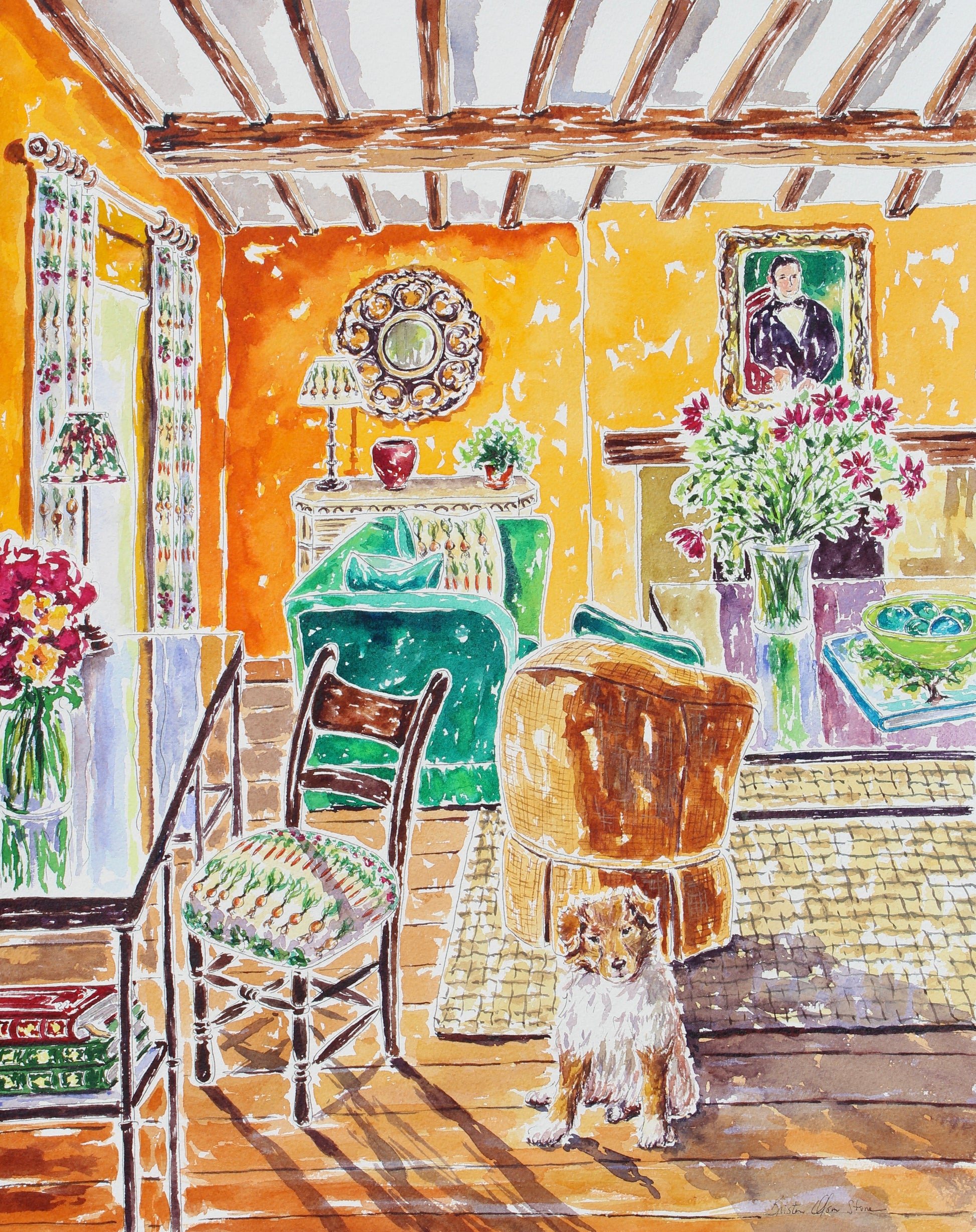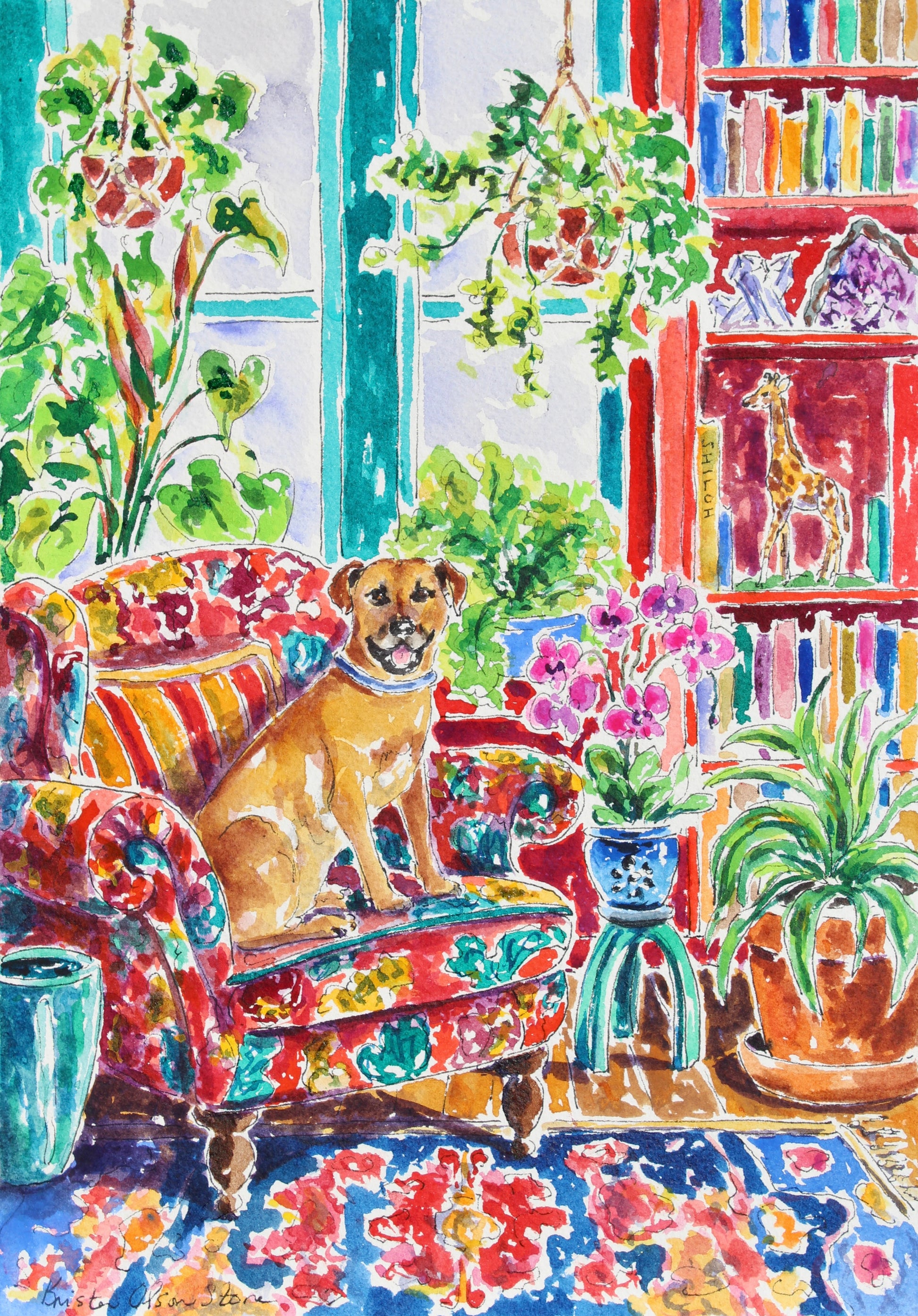 Working on commissions with collectors is so much fun. I developed this unique style of watercolor painting on my own. I enjoy creating paintings with pets in colorful, beautifully designed, colorful rooms. These are not your standard pet portrait but a very unique work of art which is customizable in many ways.