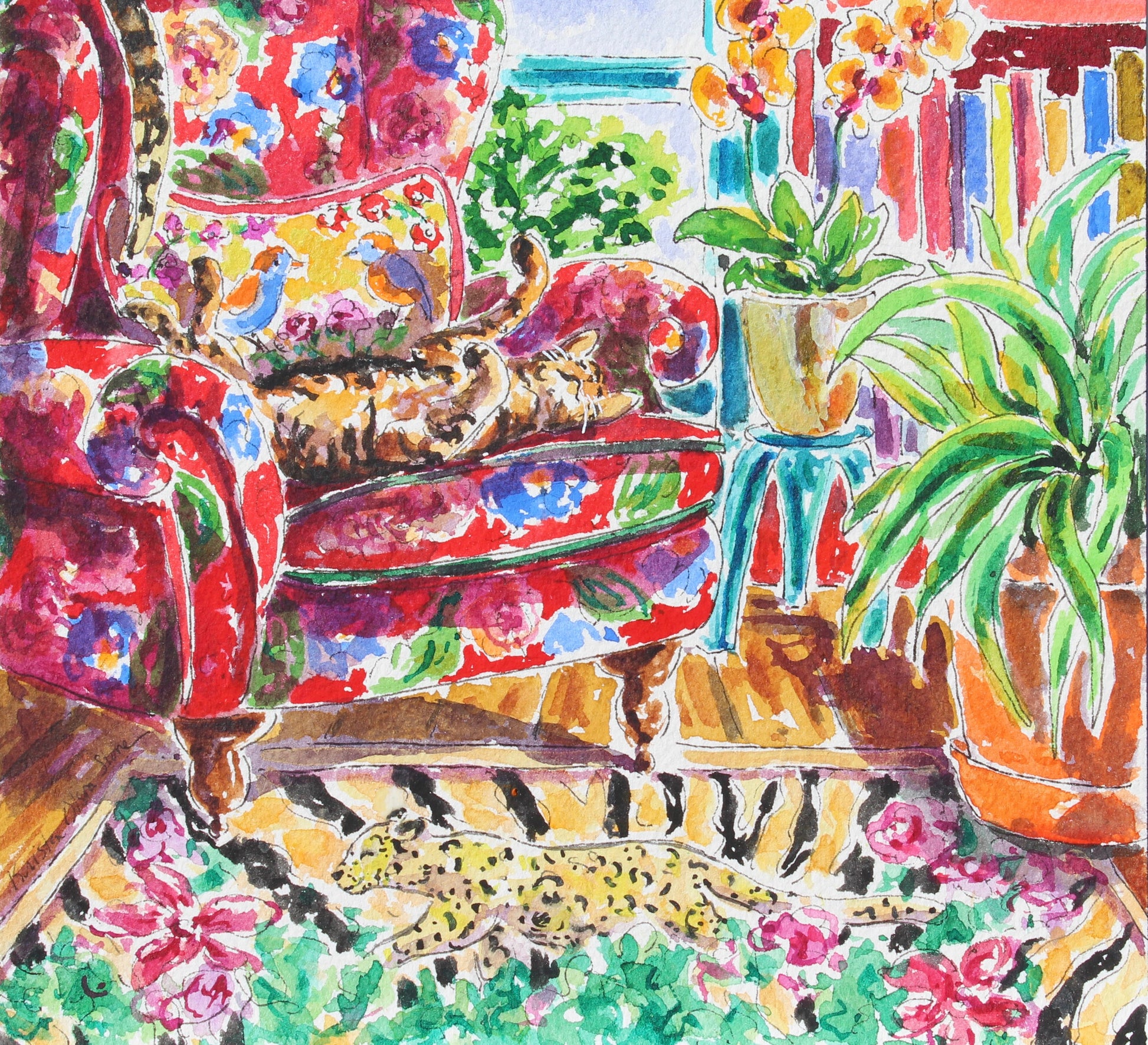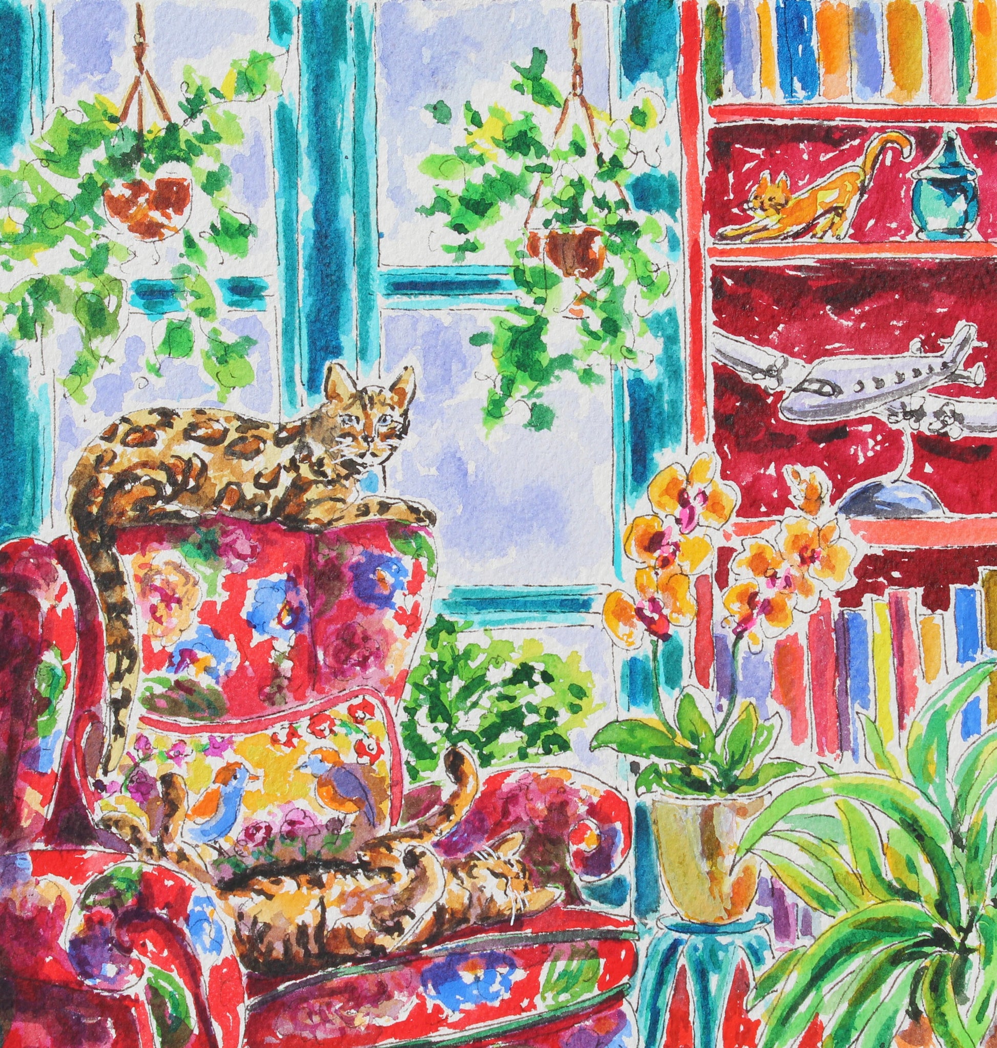 A commissioned 10" x 7", original watercolor painting of 2 Bengal cats, Mac and Octane in a beautifully decorated room. Octane, posed on the back of the chair is a slightly smaller cat than Mac who is on his back on the seat of the chair. Also included is a statue of an airplane.