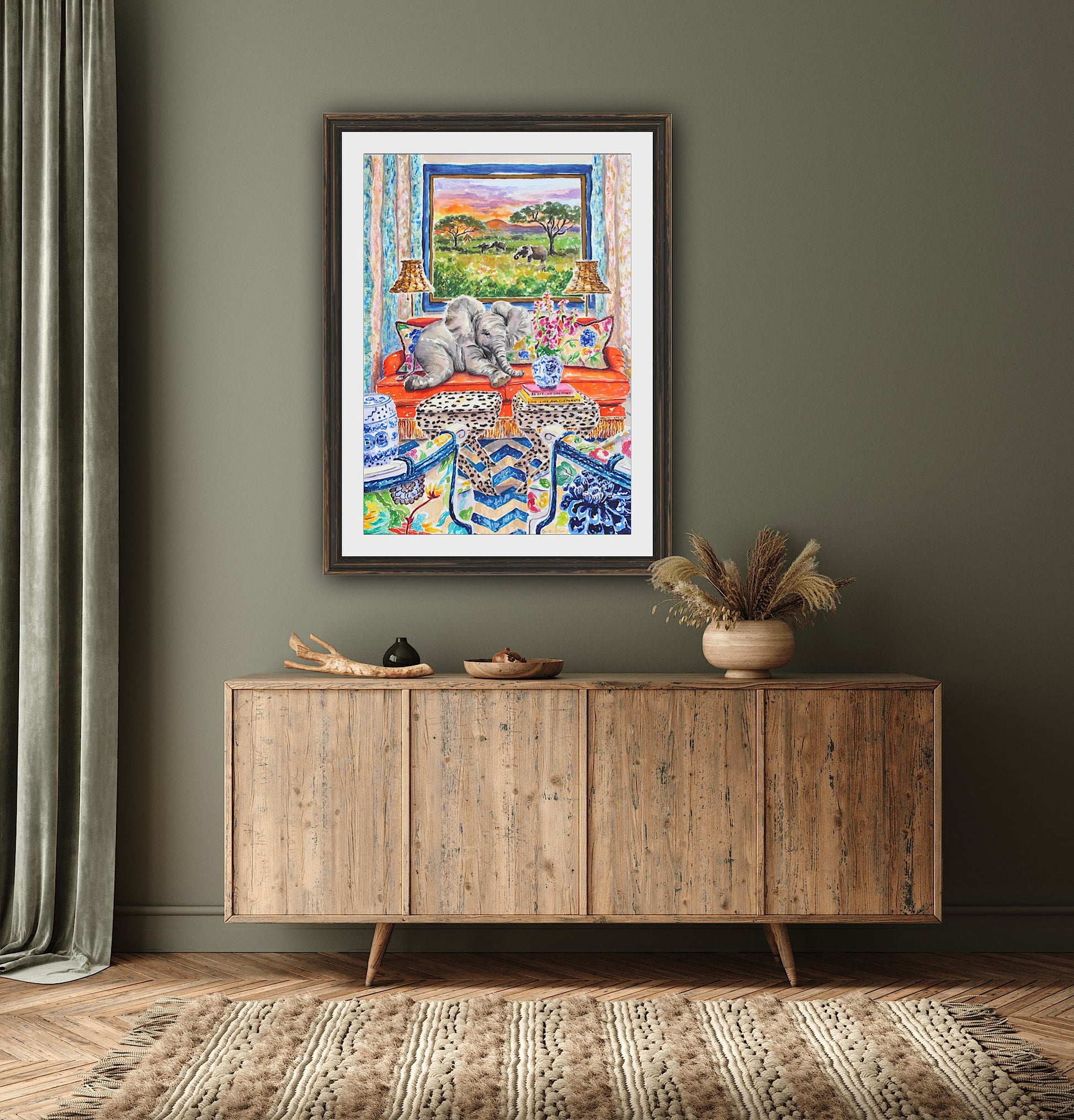 I am particularly fond of elephants! "Couch Safari", is a giclee print of my original watercolor painting of a baby elephant in a room decorated with animal prints and chinoiserie.