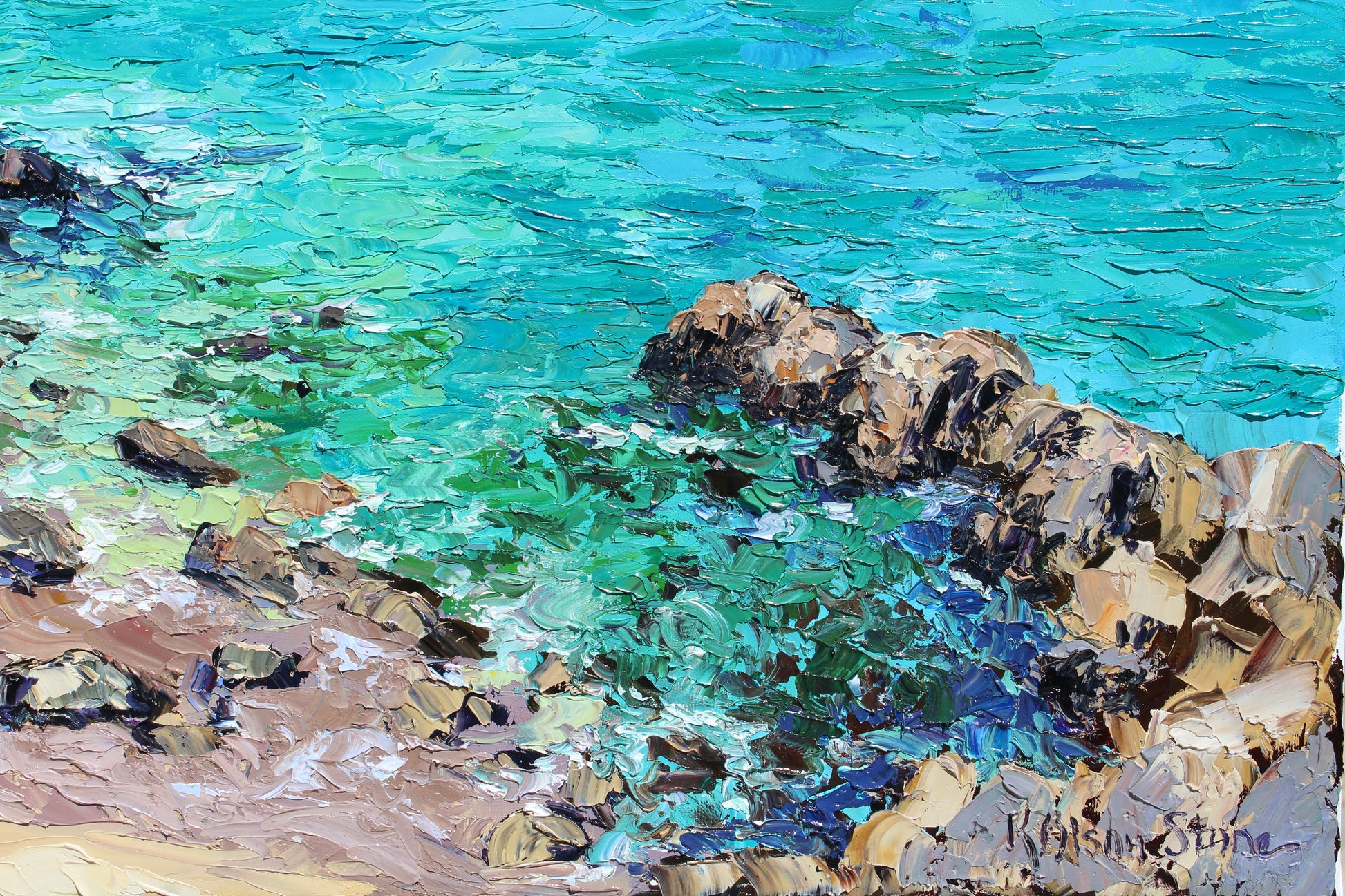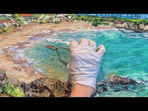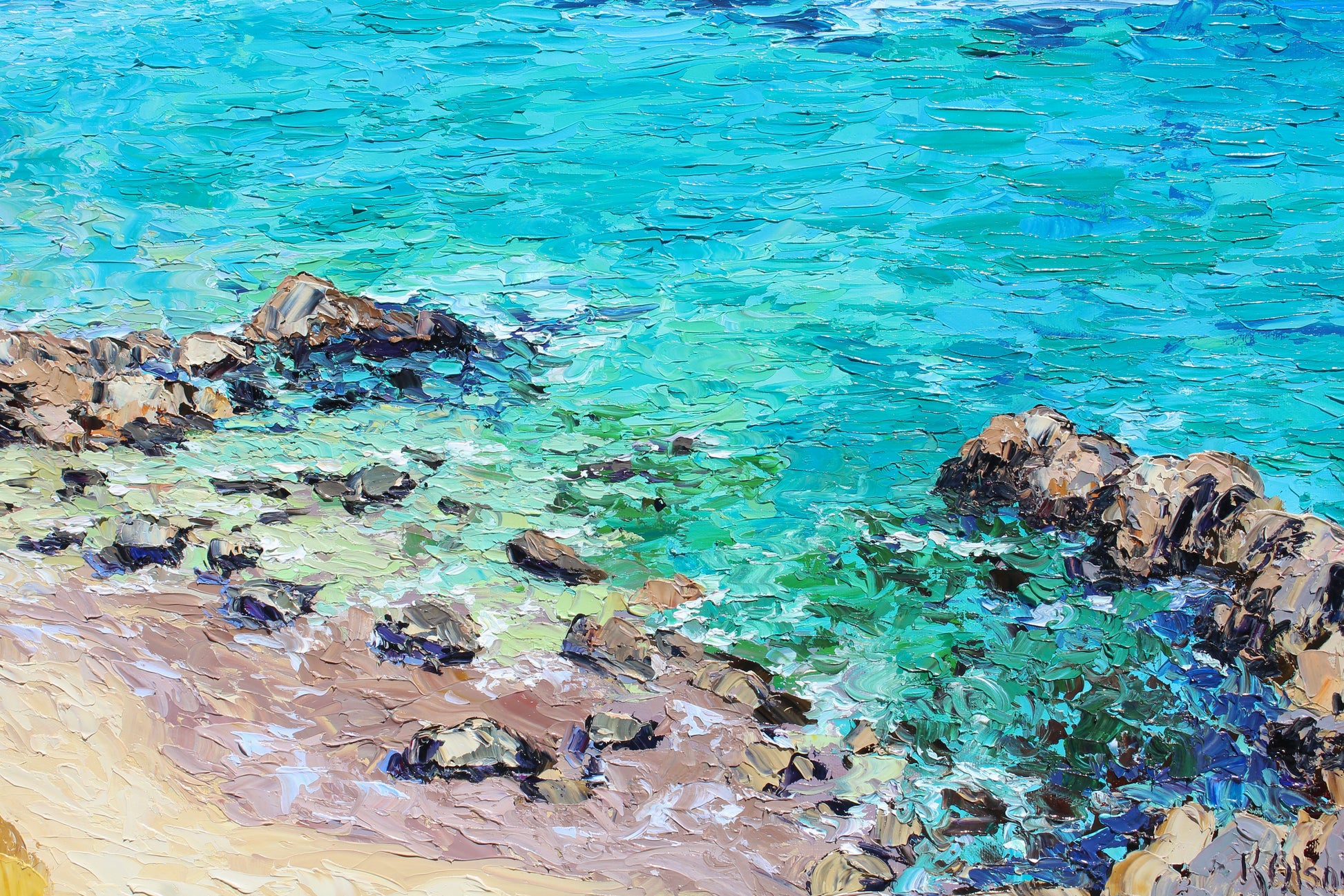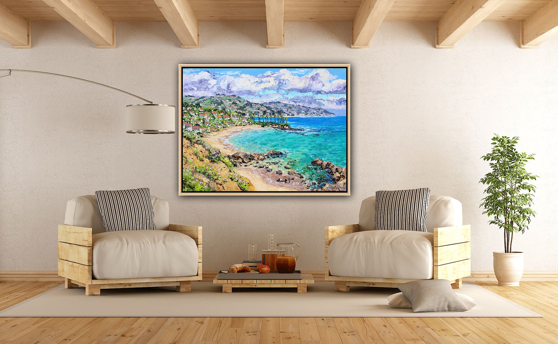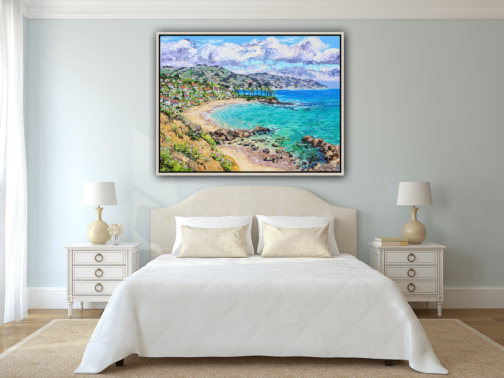 An original oil 30" x 40" or 76.2cm x 101.6cm, painting of the view looking south along the coastline from Crescent Bay Point Park which overlooks Crescent Bay and Beach as well as the iconic palm lined peninsula. This is an especially nice view of the sea cove with a myriad of gorgeous colors of shallow water with sea rocks. The foreground sea cliff has some nice greenery and softly colored flowers. This painting is stunning!