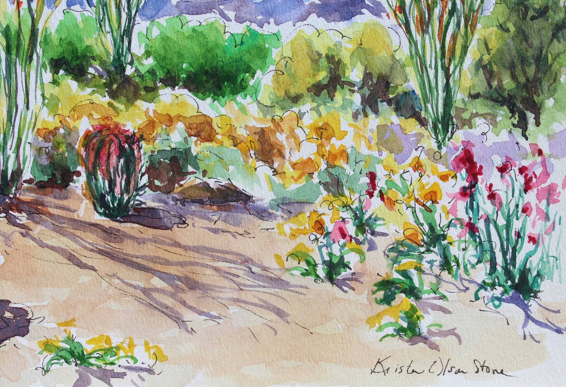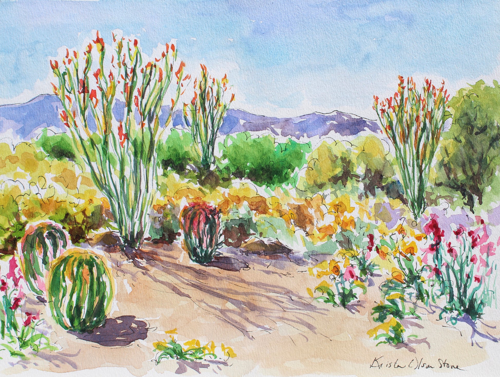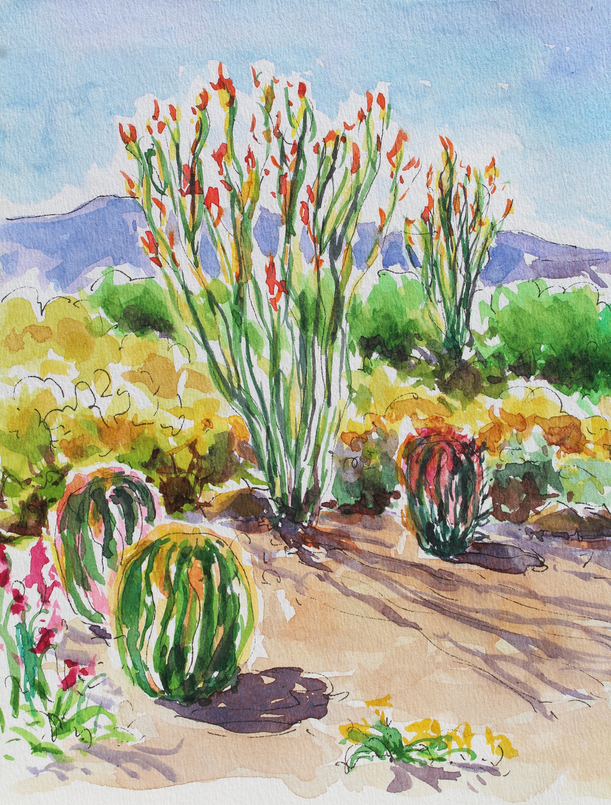 An original 9" x 12" or 23 x 30 cm watercolor and ink plein air painting of Barefoot Ocotillo, barrel cactus and other wildflowers with mountain scenery. I painted this on location at The Living Desert in Palm Desert, California.