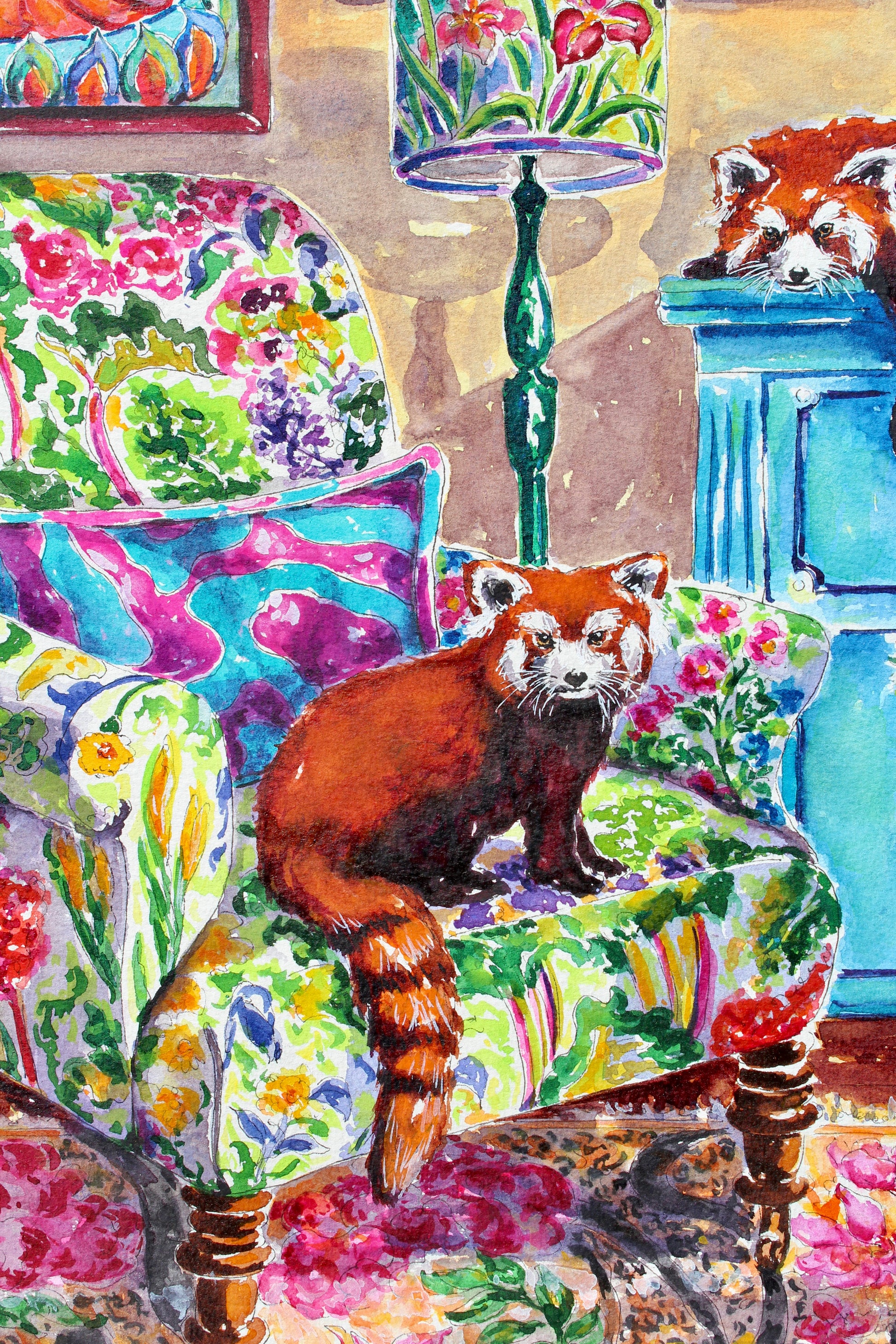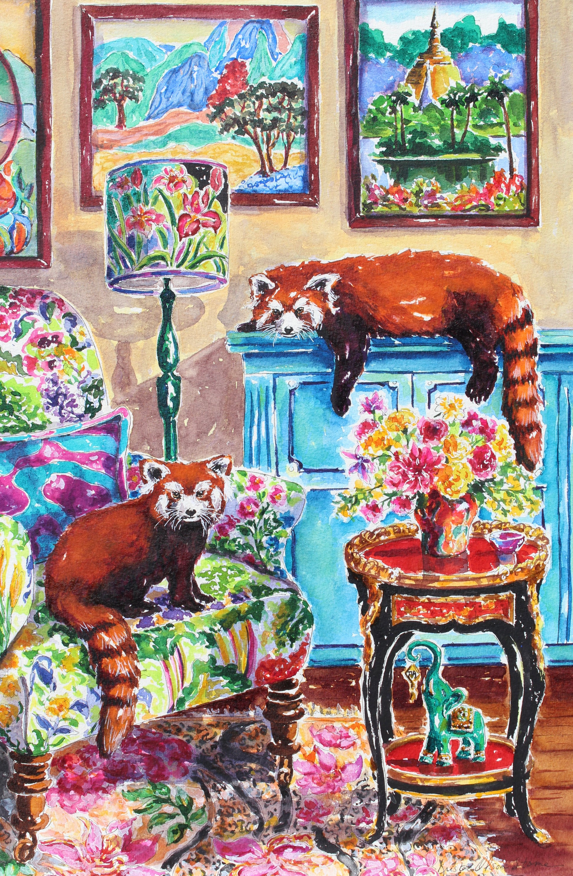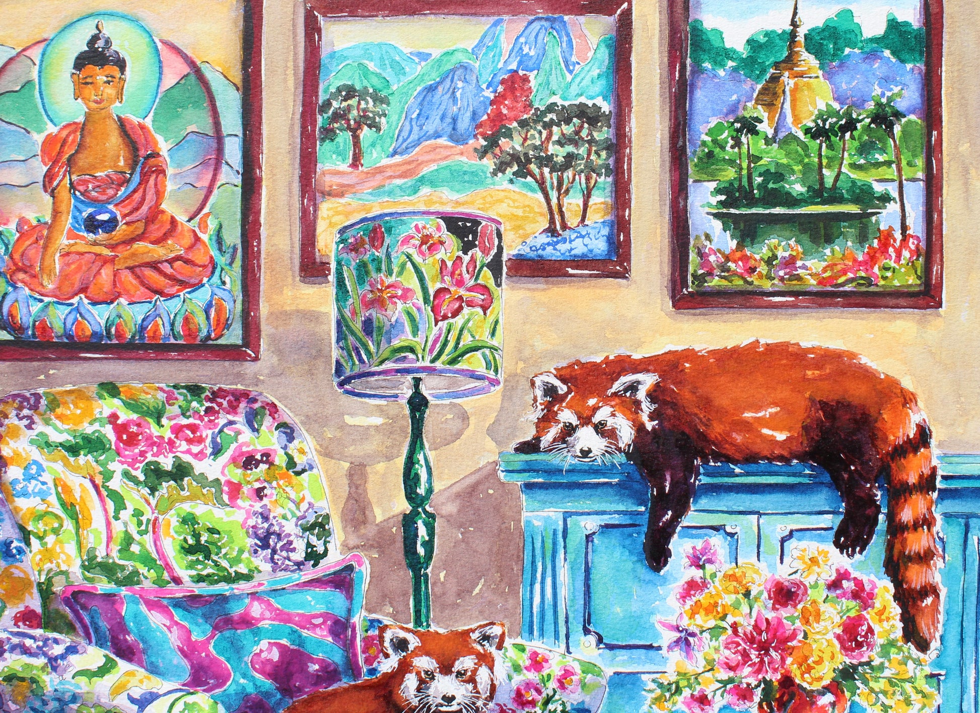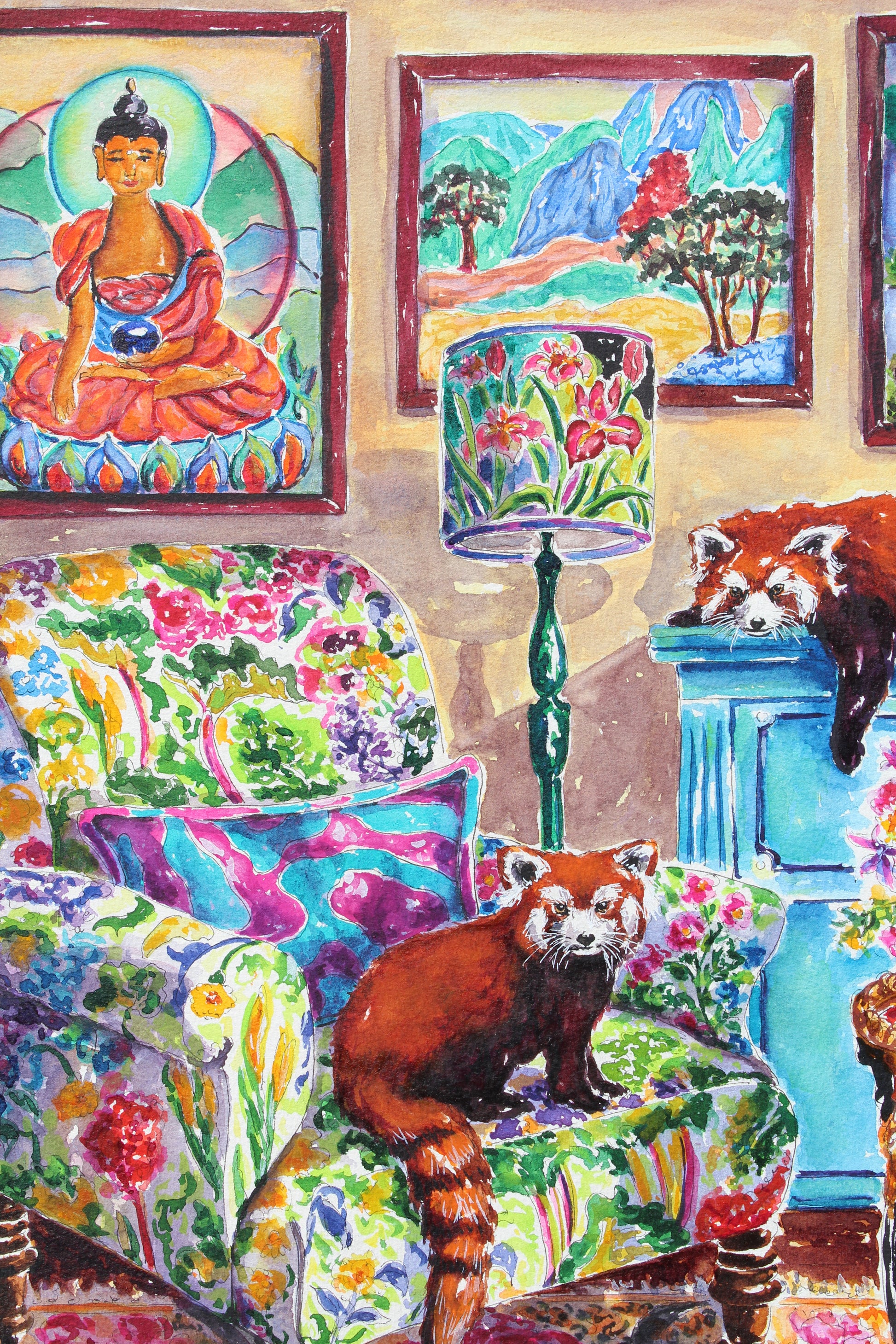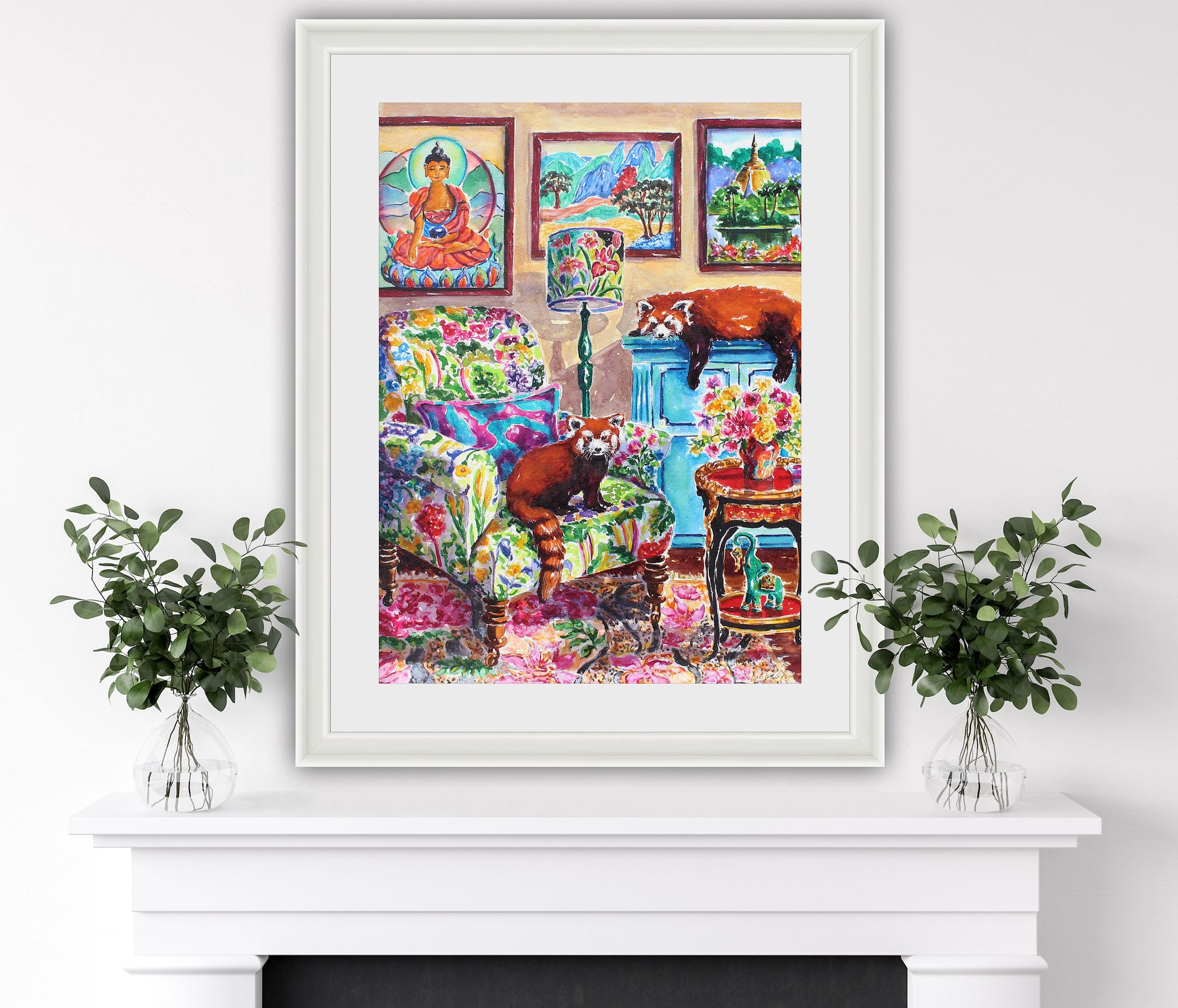 This is an original watercolor painting featuring a gorgeous pair of Red Pandas in a joyful room filled with Asian-themed decor including a Good Luck Elephant! On the wall hang paintings of a Golden Buddha, a jungly temple scene in Myanmar and a Chinese landscape. Red Pandas are beautiful animals that live in the forests of Myanmar, Southern China, Bhutan, India, Nepal.