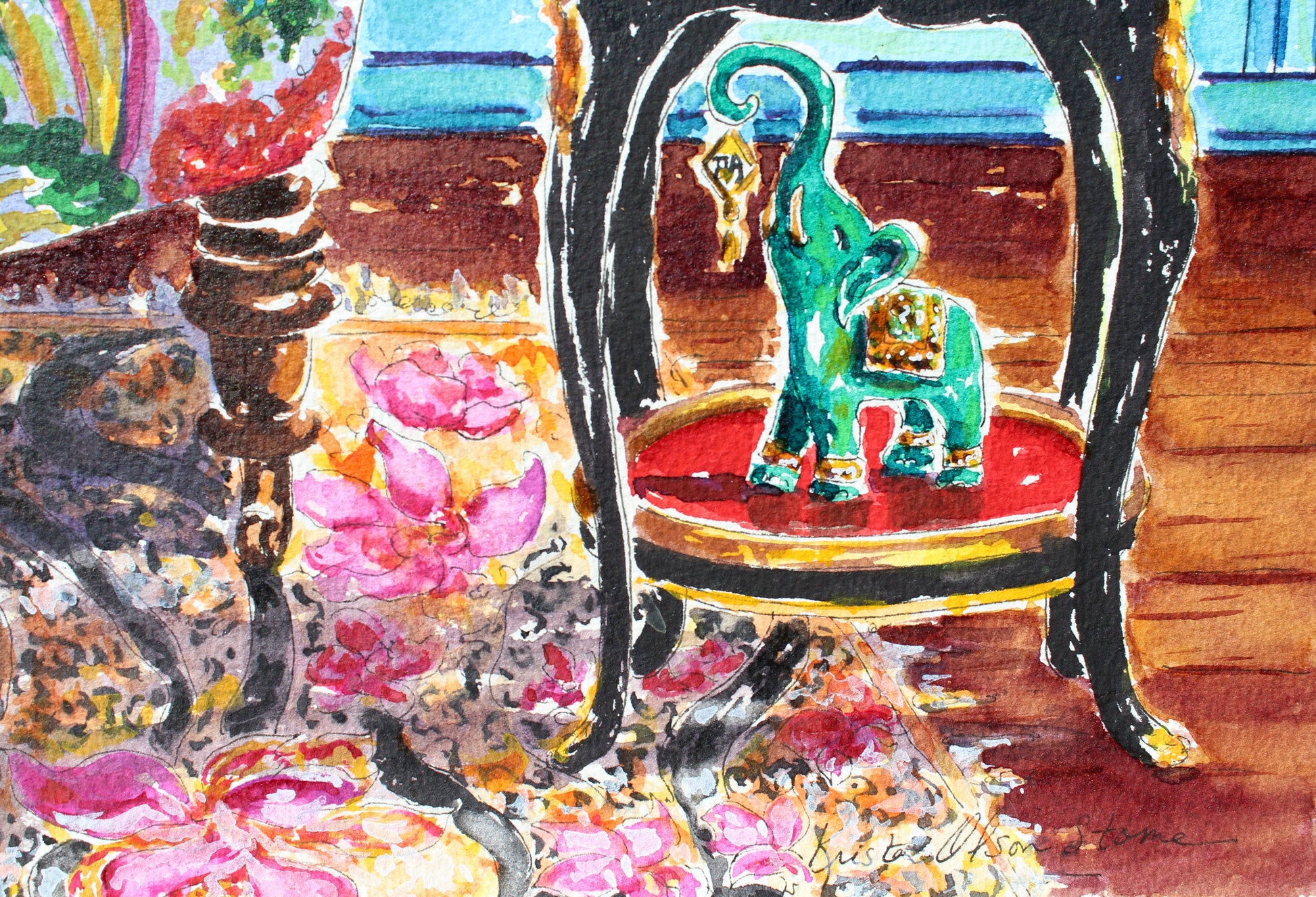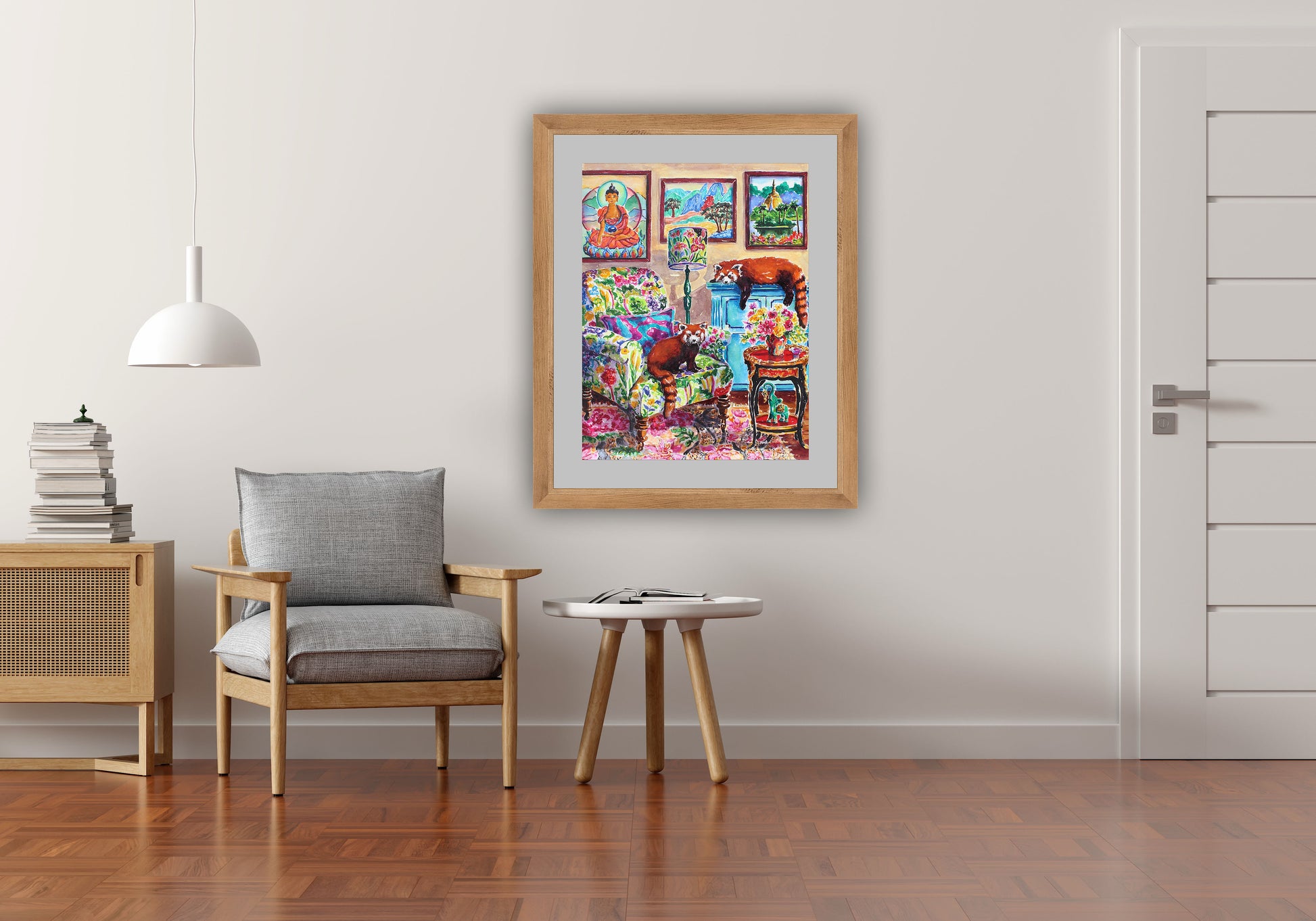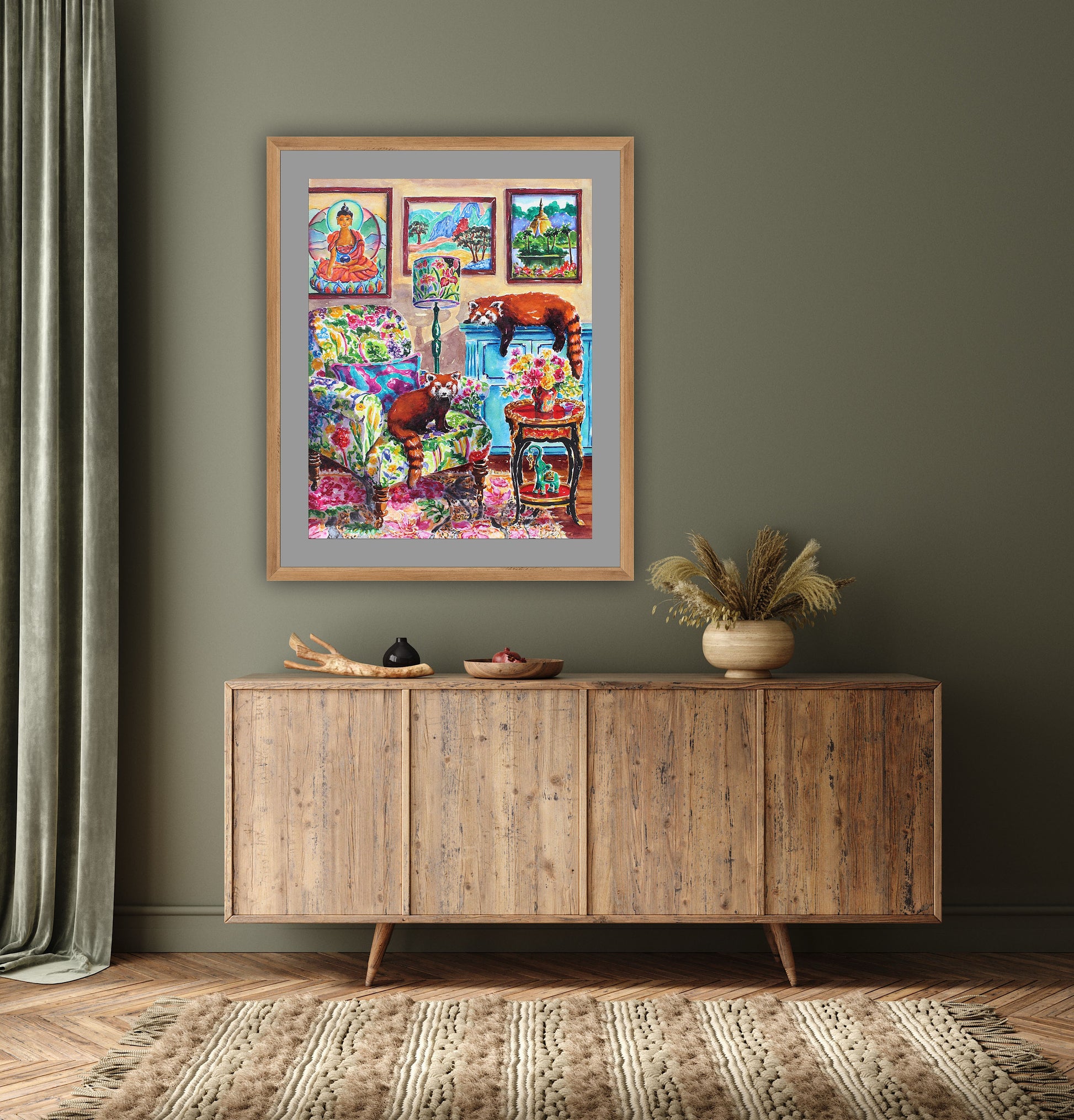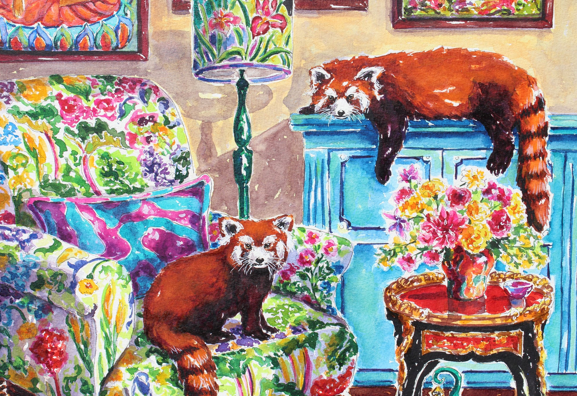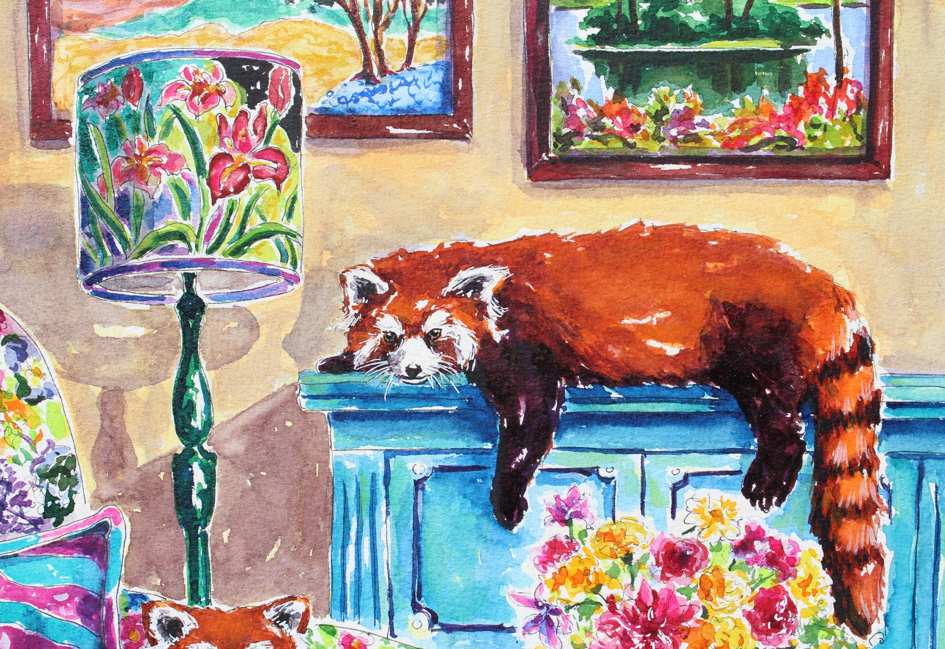 This is an original watercolor painting featuring a gorgeous pair of Red Pandas in a joyful room filled with Asian-themed decor including a Good Luck Elephant! On the wall hang paintings of a Golden Buddha, a jungly temple scene in Myanmar and a Chinese landscape. Red Pandas are beautiful animals that live in the forests of Myanmar, Southern China, Bhutan, India, Nepal.