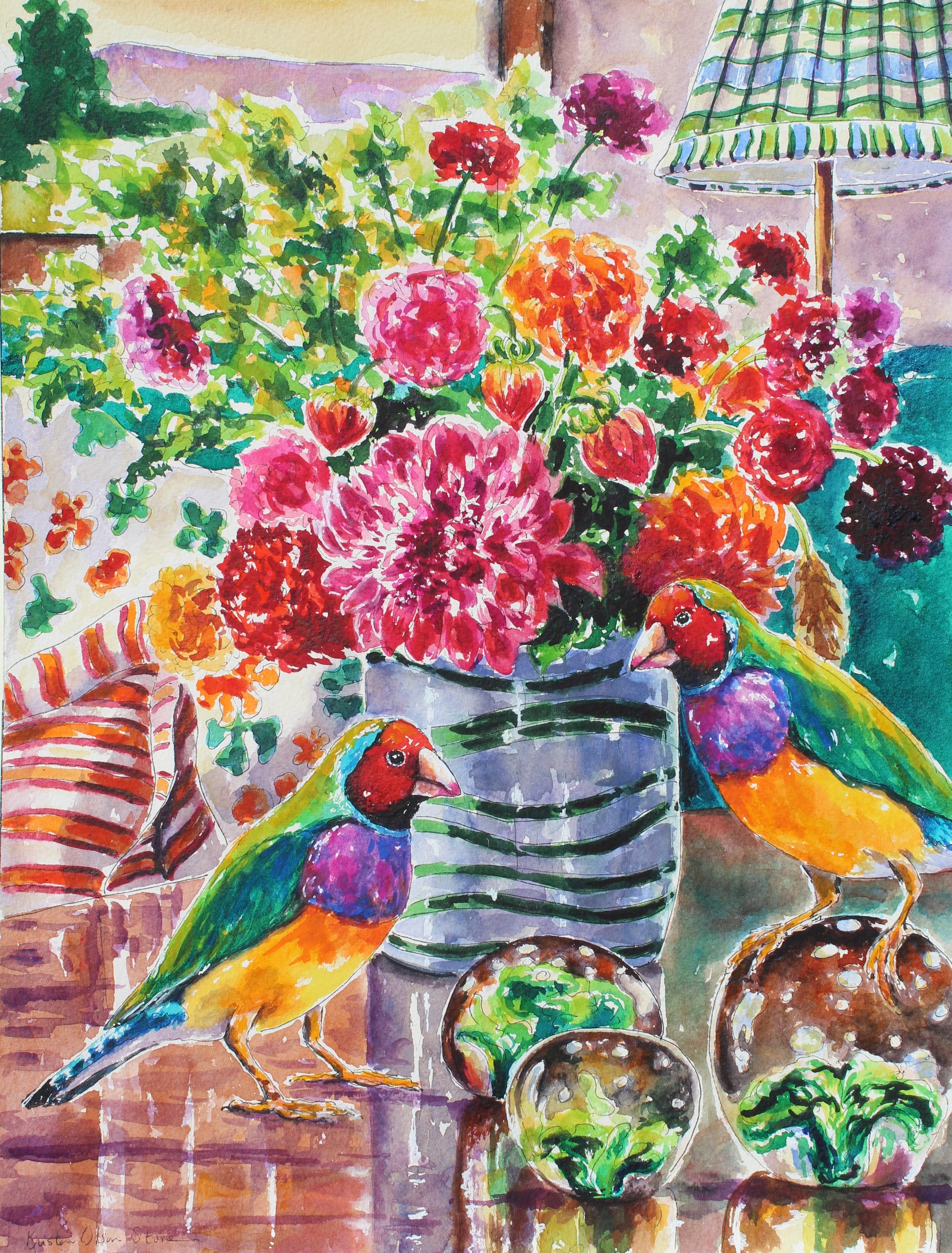 An original 12" x 9" watercolor painting of a pair of Gouldian Finches on a table with glass sculptures and glorious dahlia flowers. The birds will be life size, 5" tip to tail.