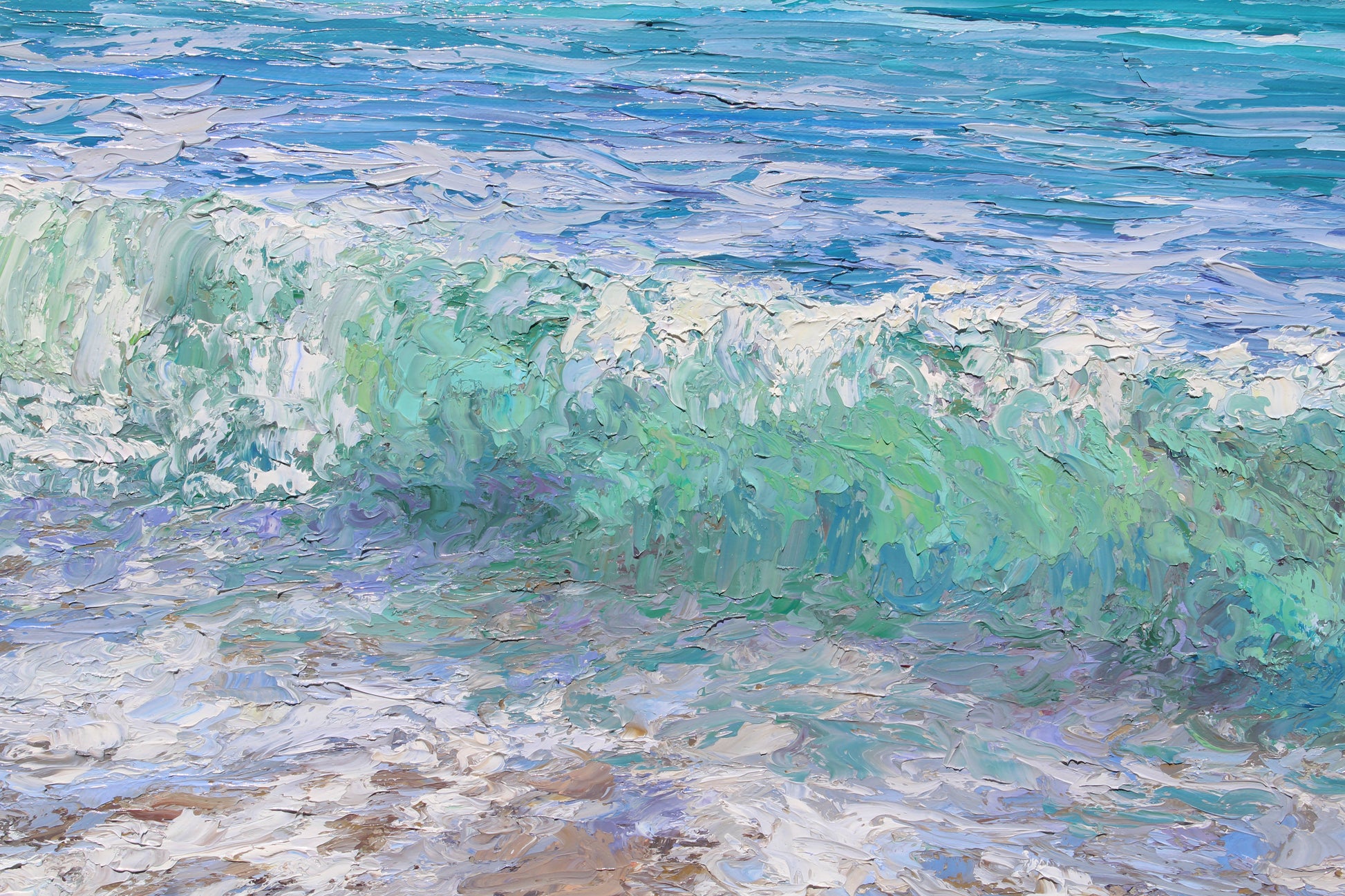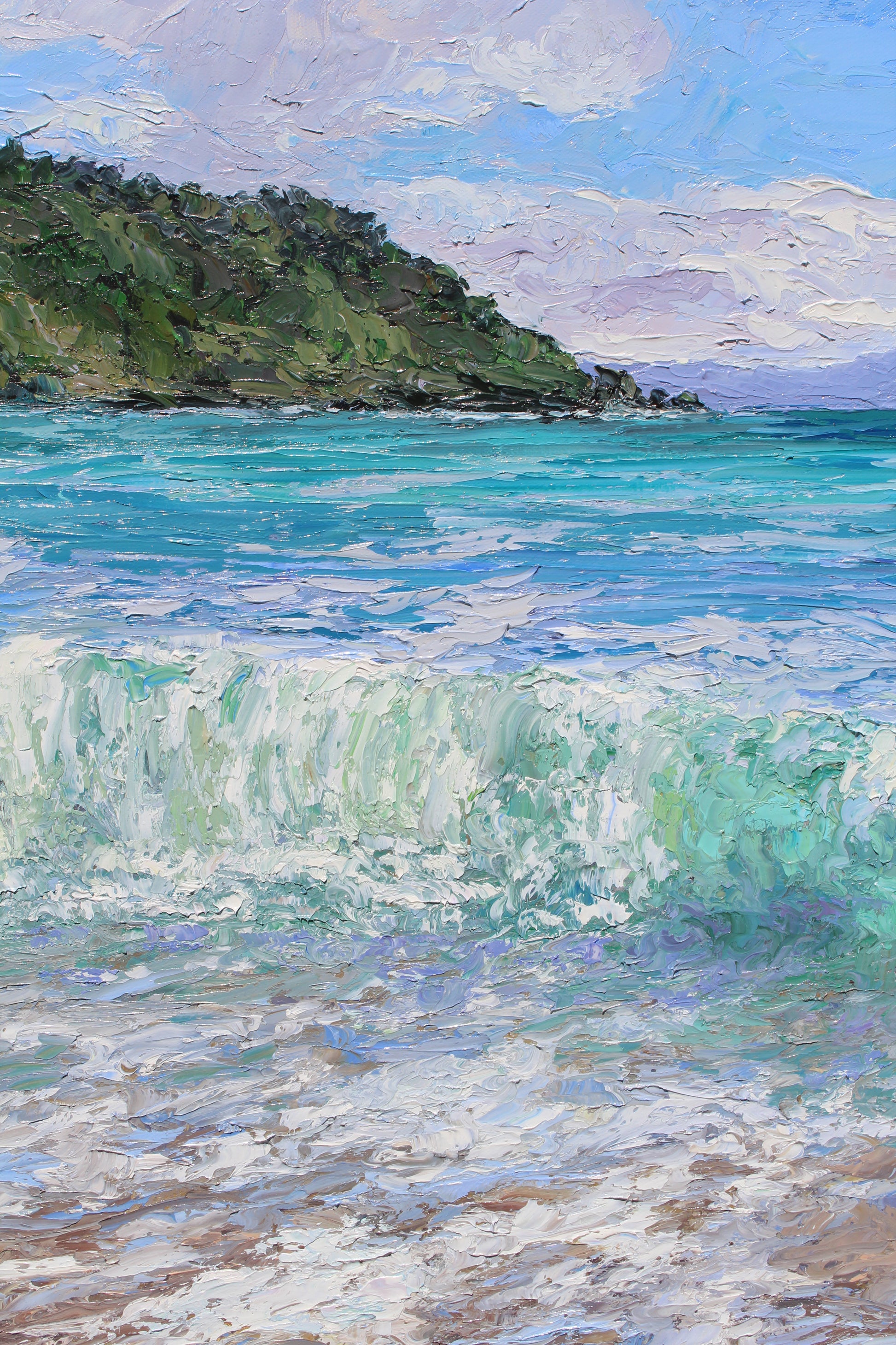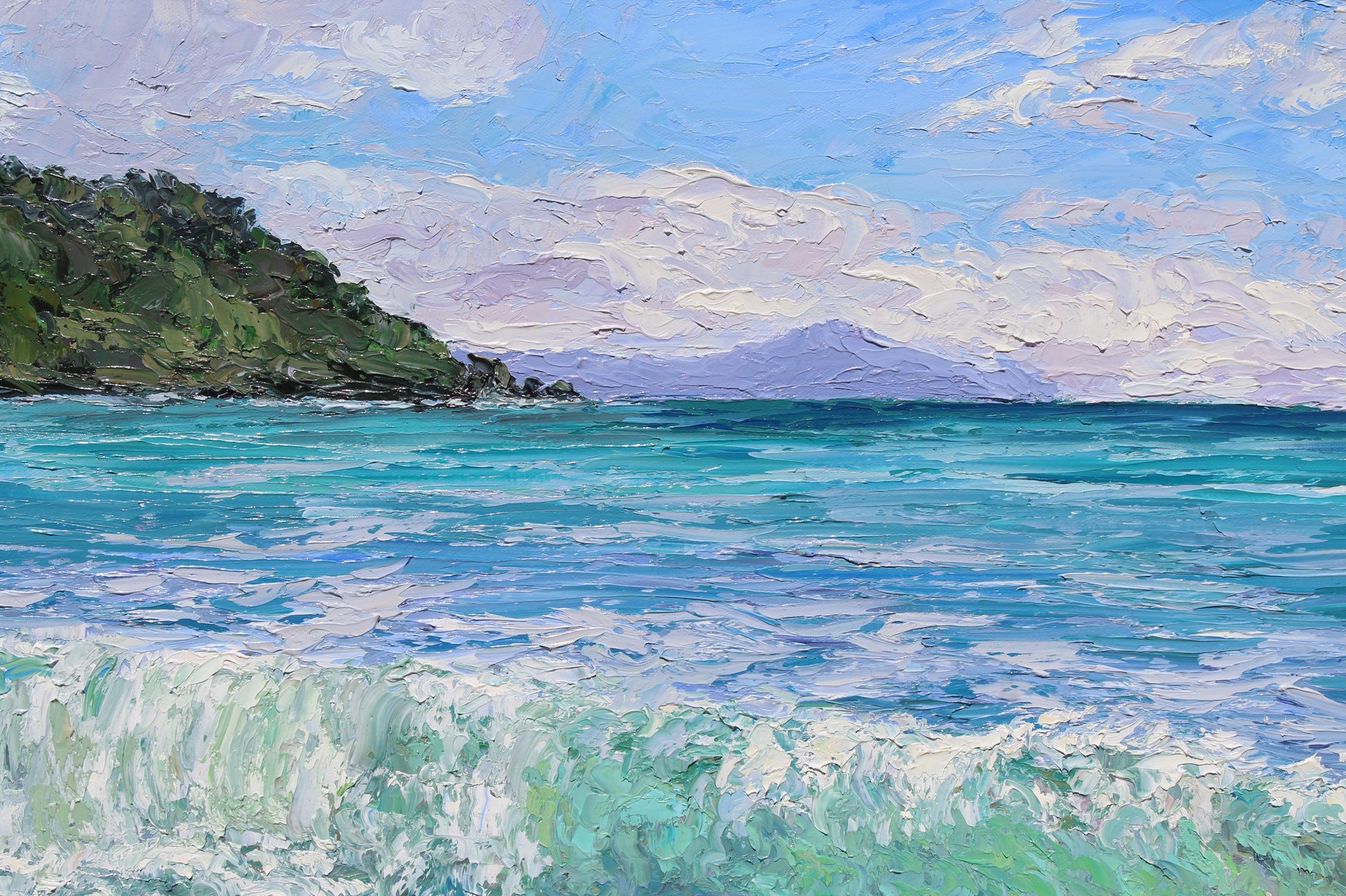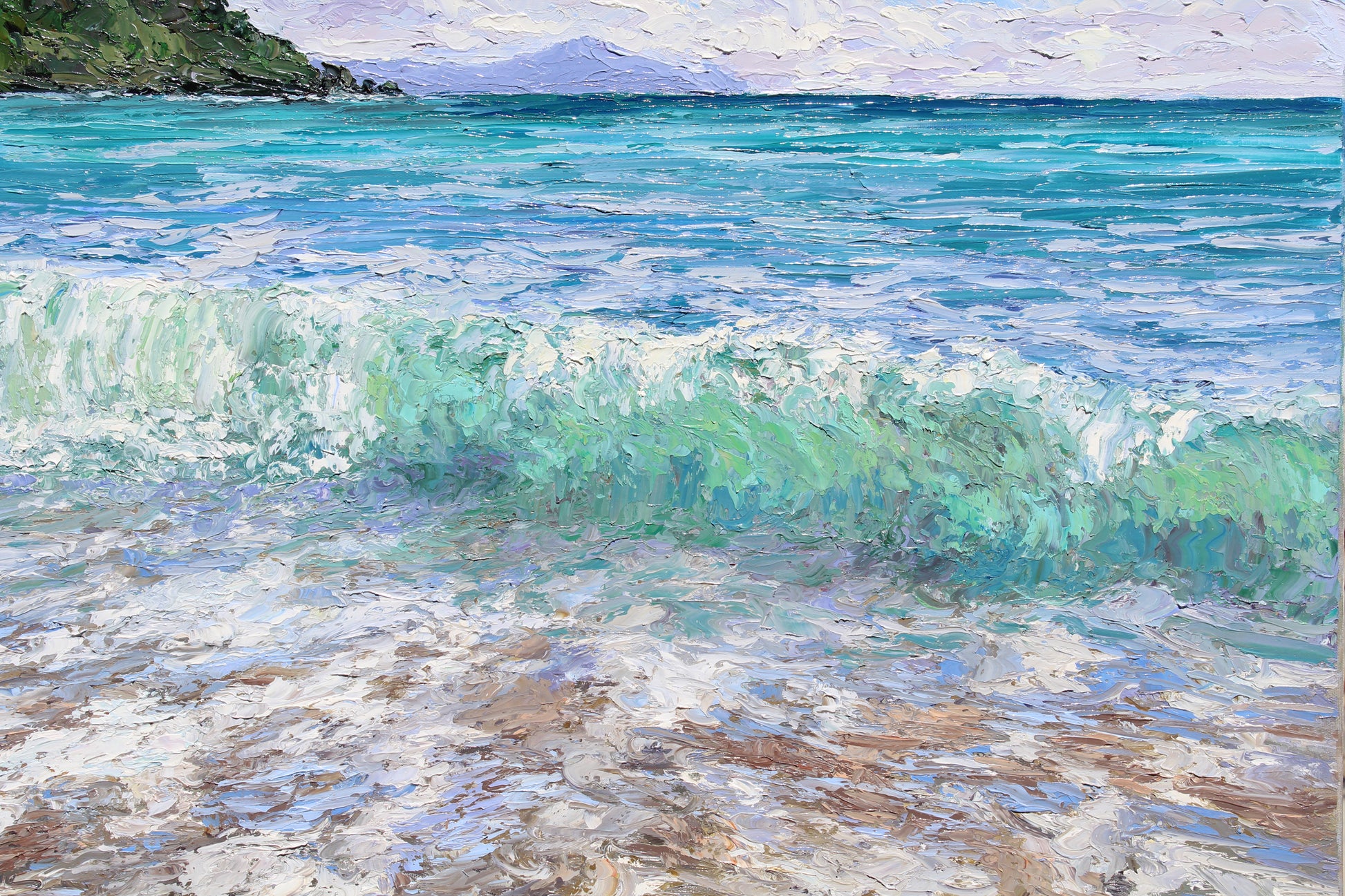 An original 22" x 28" or 55.88 x 71.12 cm, oil painting on canvas of beautiful coastal scenery in New Zealand. This is a contemporary textured oil painting. I love the coastline around New Zealand, the hues of the water are so pretty. I've had many happy swims there too in the fresh ocean water.