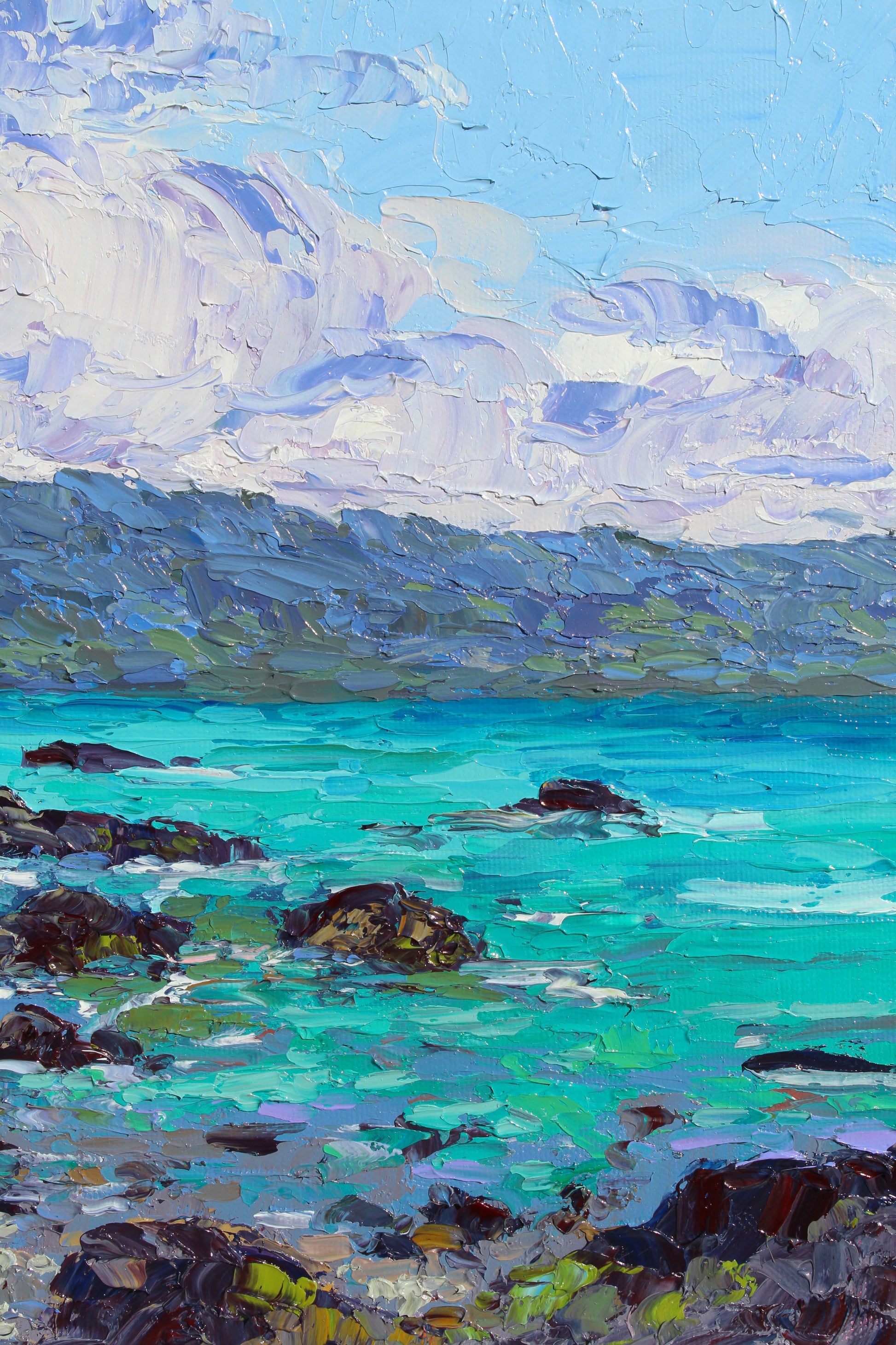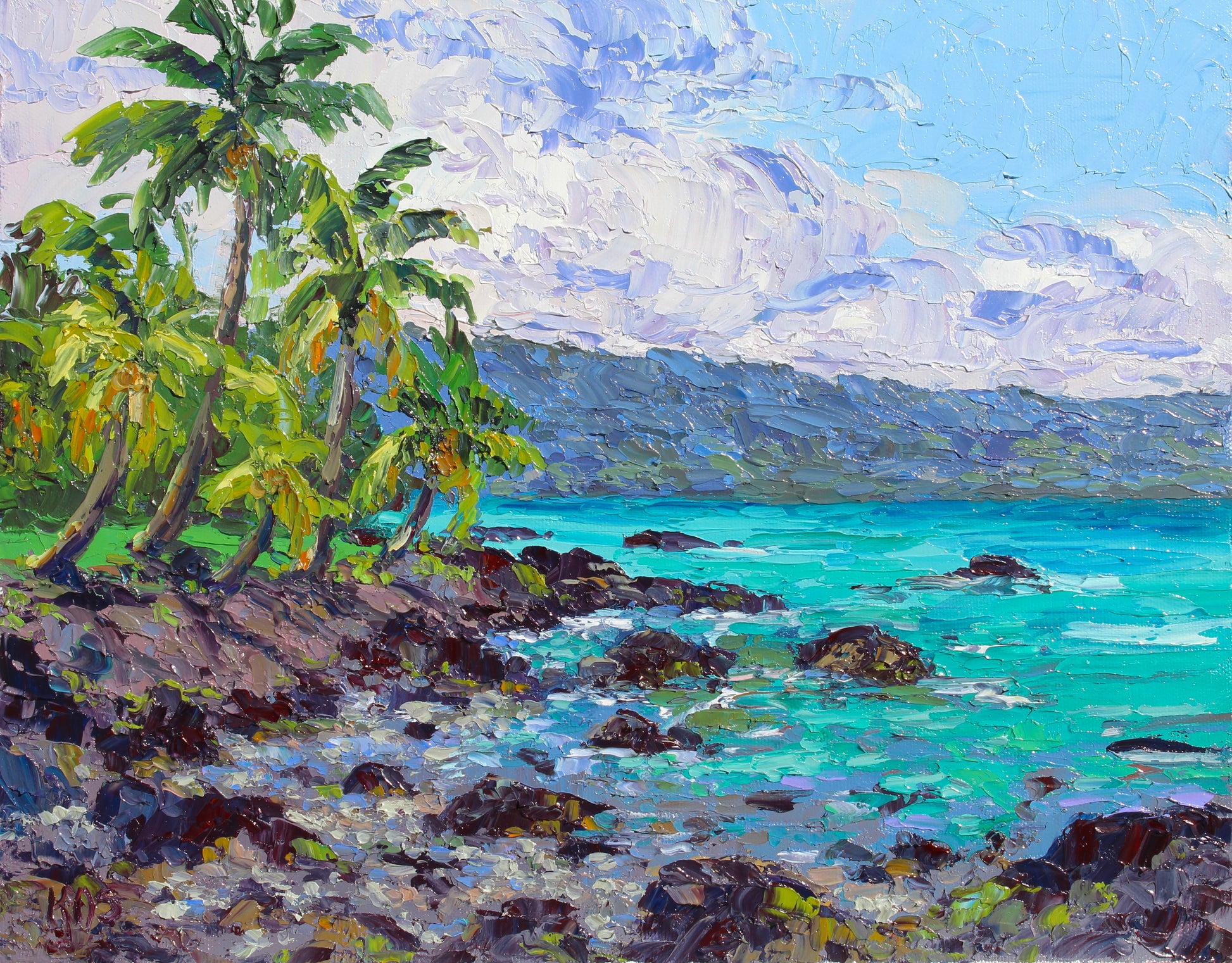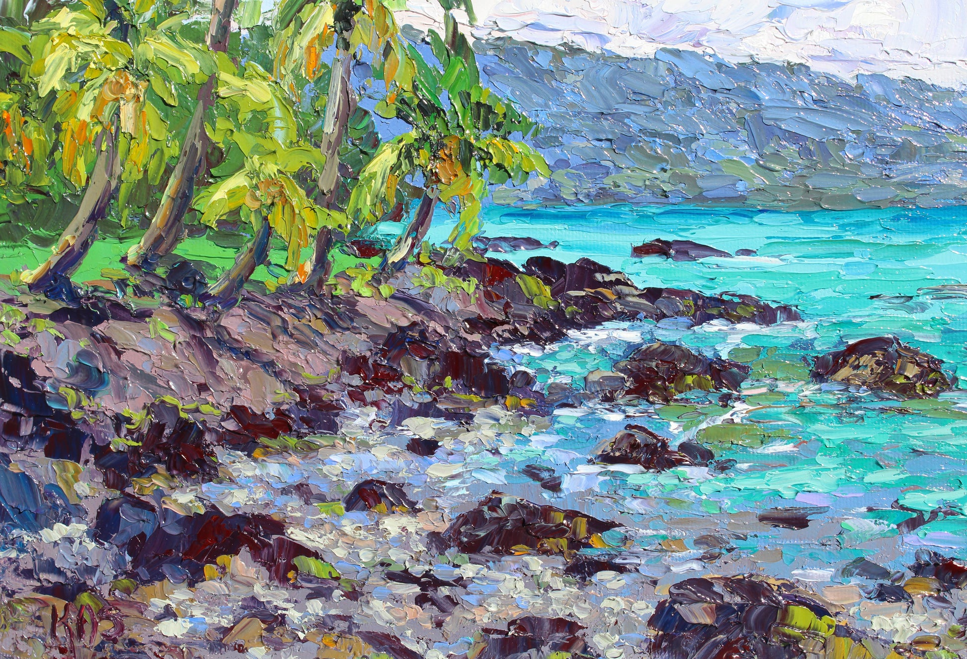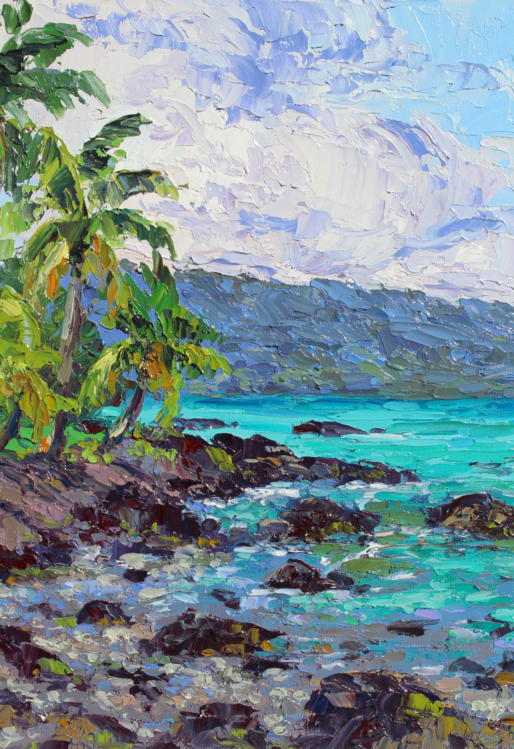 An 11" x 14" or 27.94cm x 35.56cm, textured Hawaiian seascape oil painting of a black sand beach and lava rock cove at Keaukaha Beach Park in Hilo, Hawaii. This painting captures the feeling of standing on the shore of this beach and viewing the gorgeous turquoise hues in the water and the distant Big Island coastline of Hilo in the distance. I lived on the Big Island for 14 years, it is a place that is close to my heart, I hope that those feelings come through in my paintings of Hawaii.