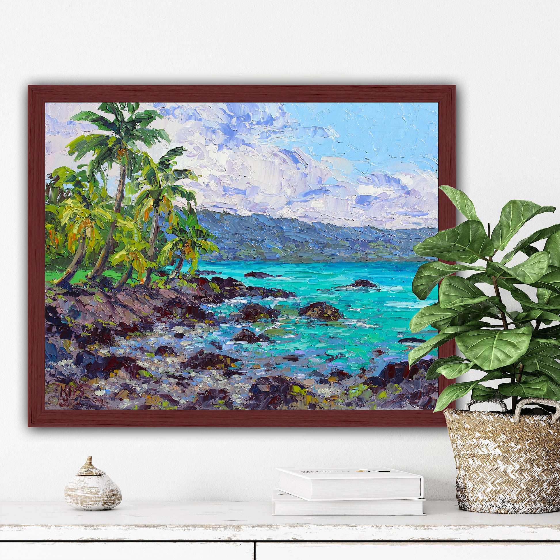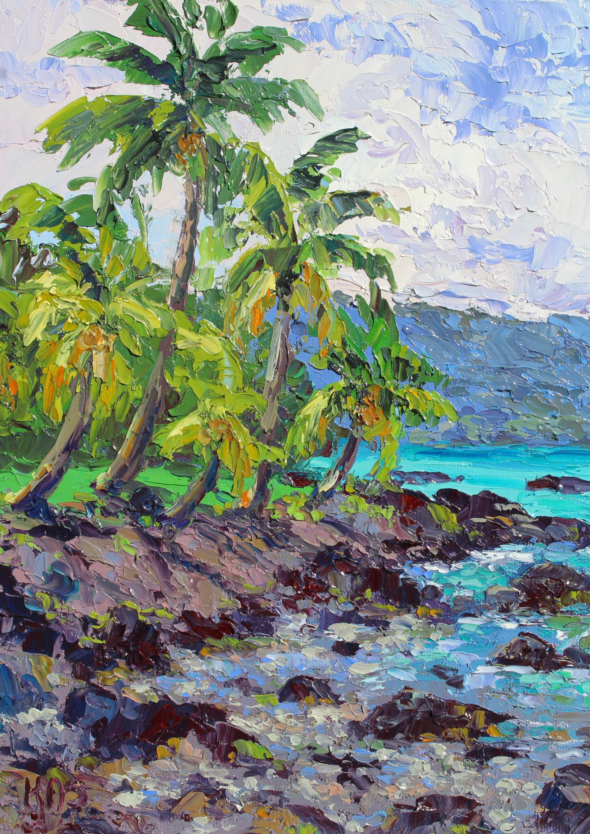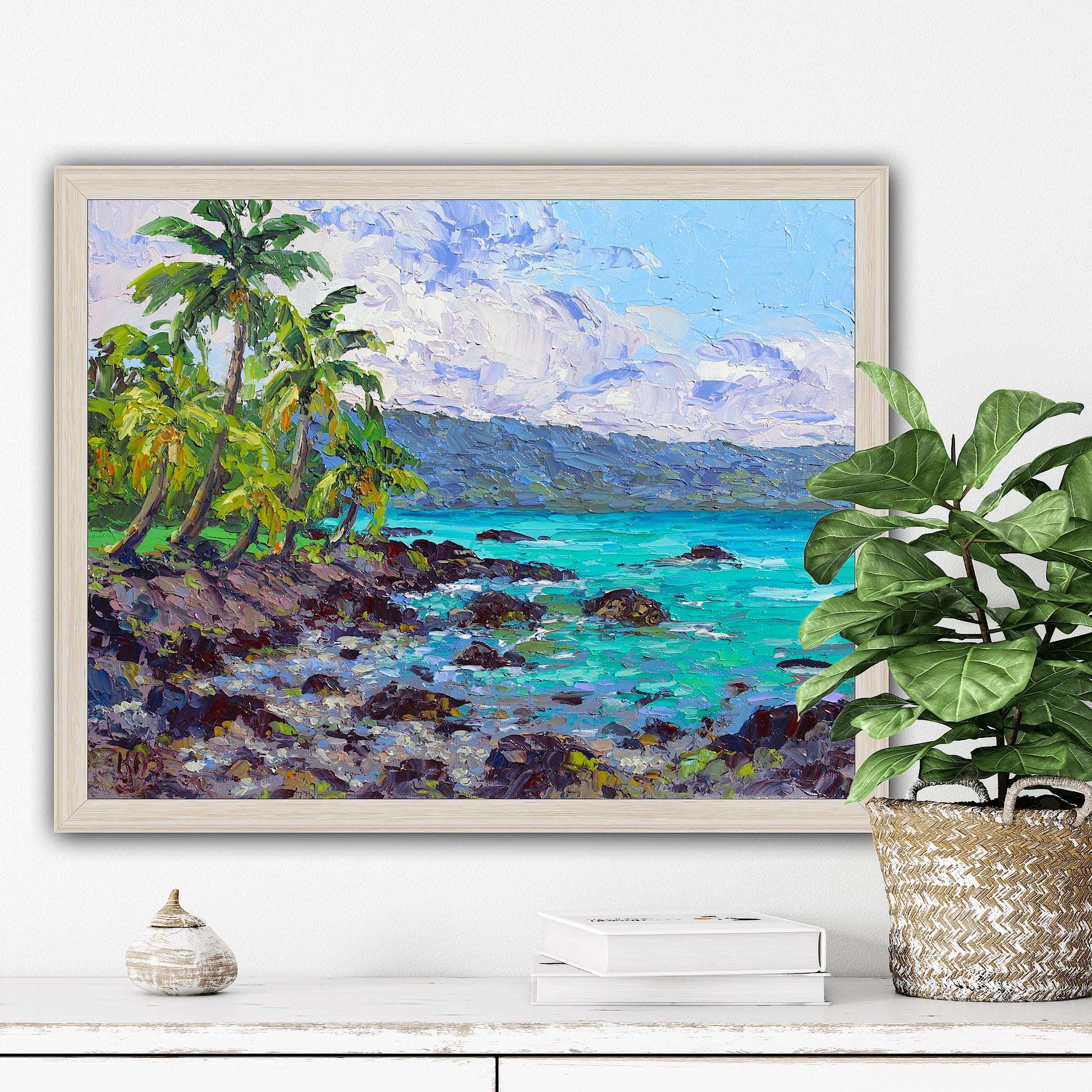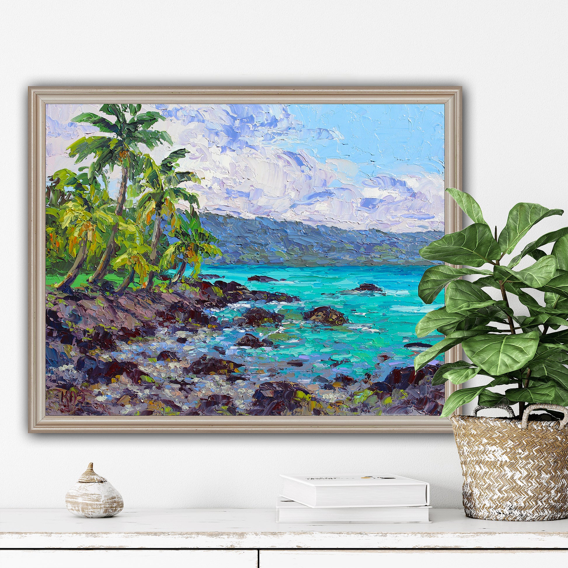An 11" x 14" or 27.94cm x 35.56cm, textured Hawaiian seascape oil painting of a black sand beach and lava rock cove at Keaukaha Beach Park in Hilo, Hawaii. This painting captures the feeling of standing on the shore of this beach and viewing the gorgeous turquoise hues in the water and the distant Big Island coastline of Hilo in the distance. I lived on the Big Island for 14 years, it is a place that is close to my heart, I hope that those feelings come through in my paintings of Hawaii.
