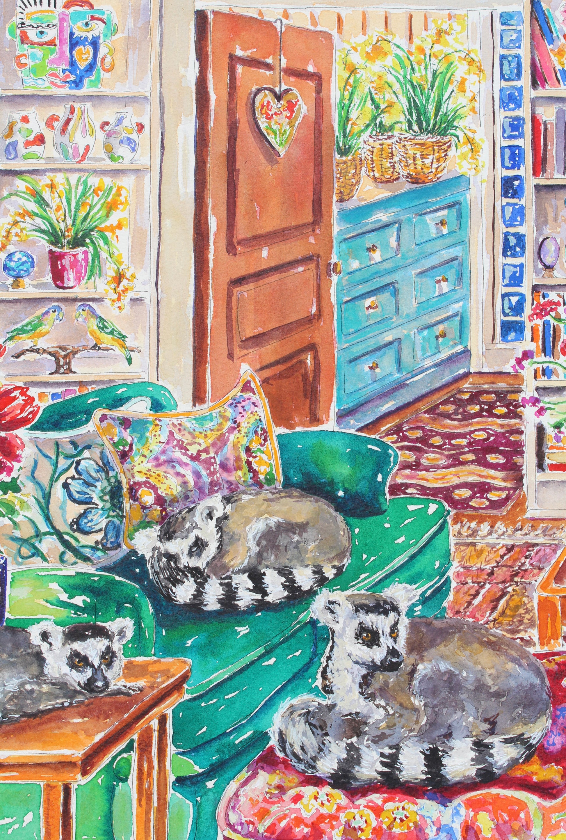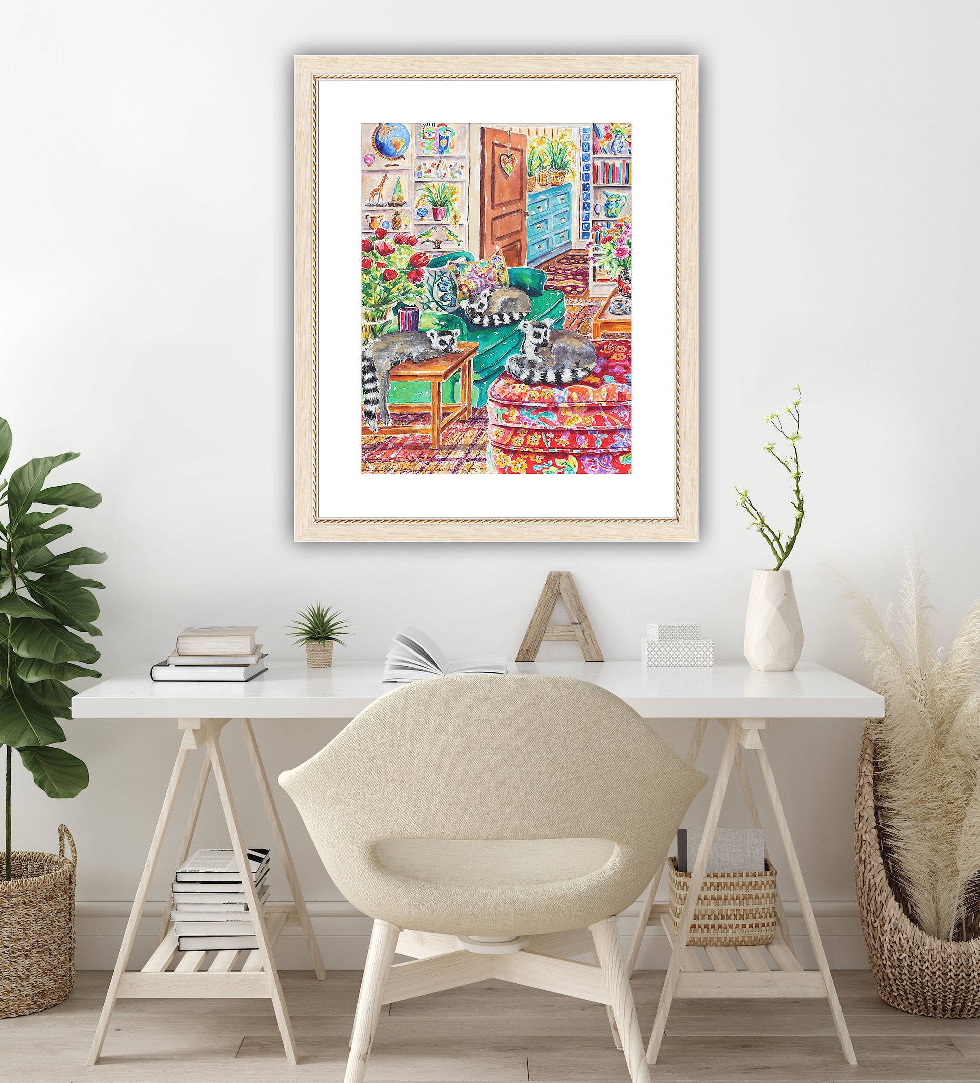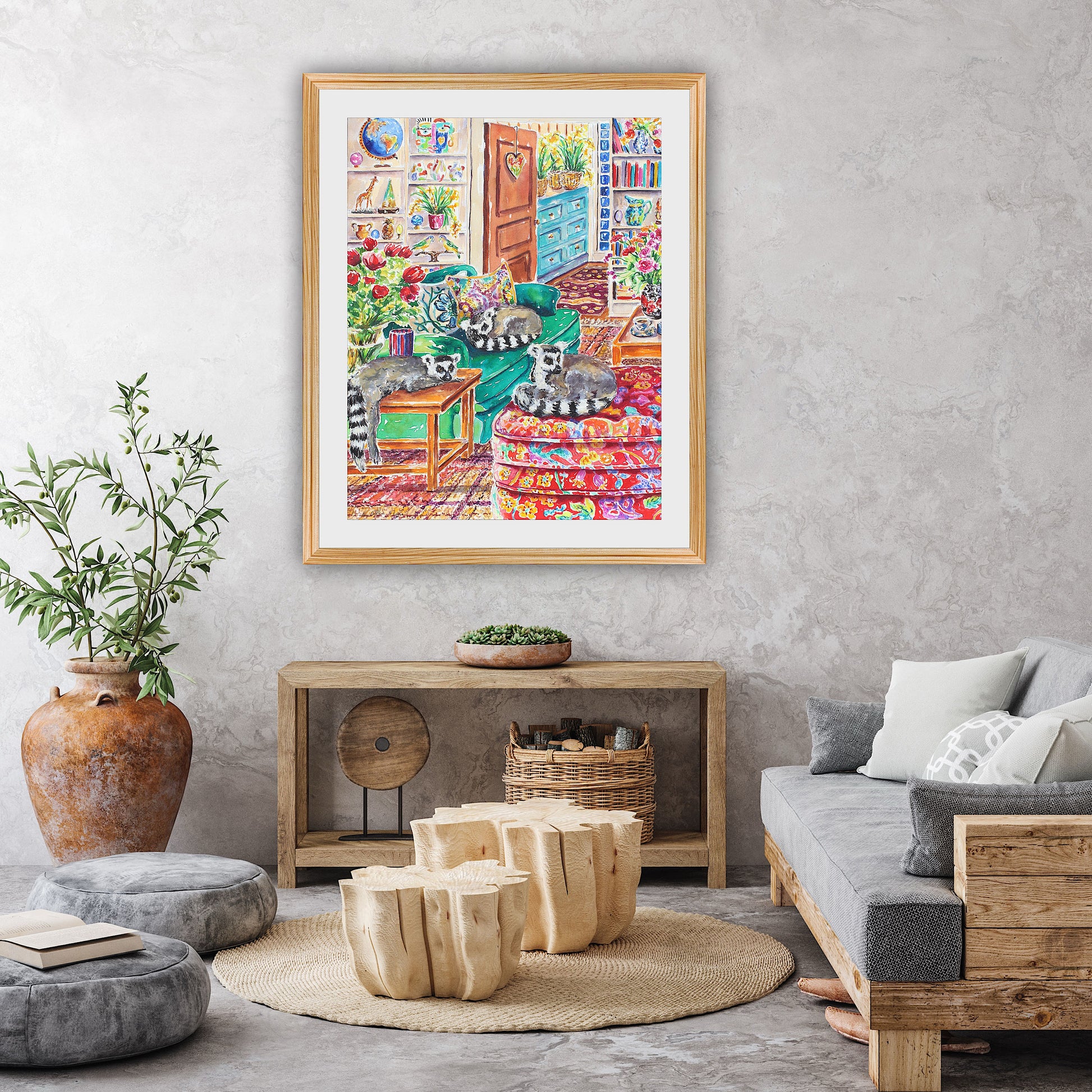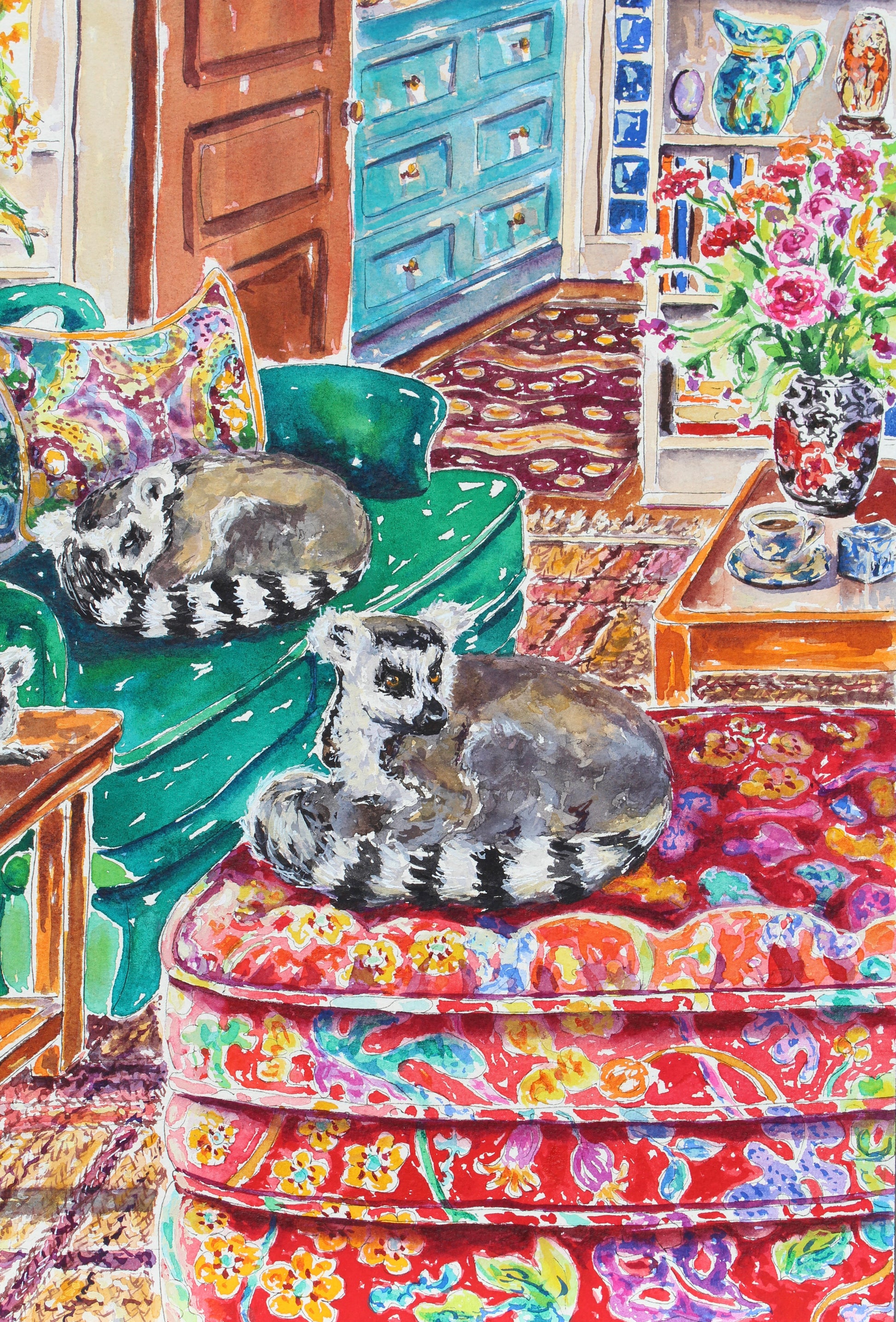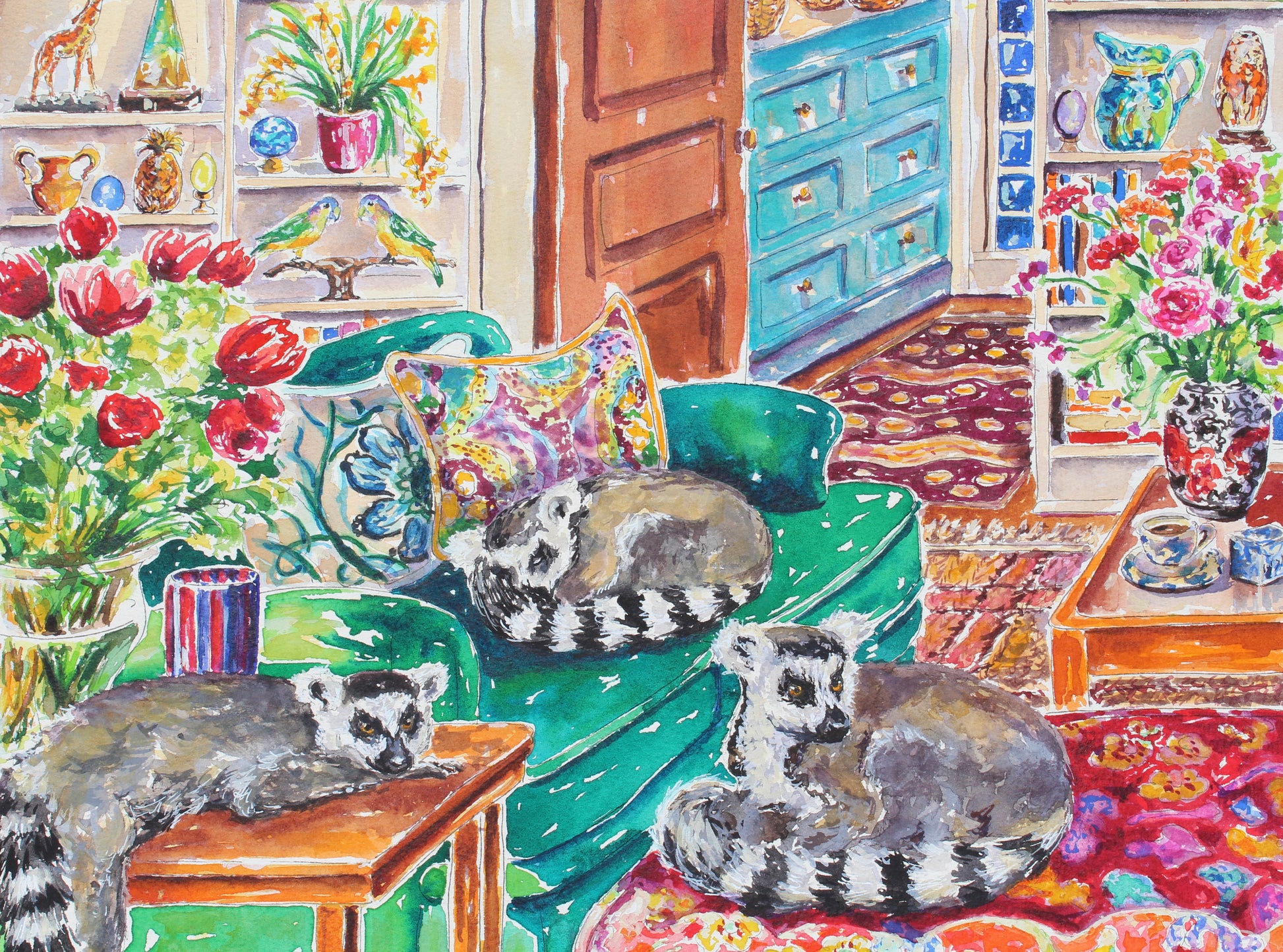 An original watercolor depicting 3 adorable Ring-Tailed Lemurs relaxing in a cozy living room. In addition to flowers and books, you'll spot decorations around the room from Madagascar, the island home of Lemurs. These include Vanilla orchids, a sculpture of Madagascar Lovebirds, a giraffe sculpture, stone eggs and an obelisk.