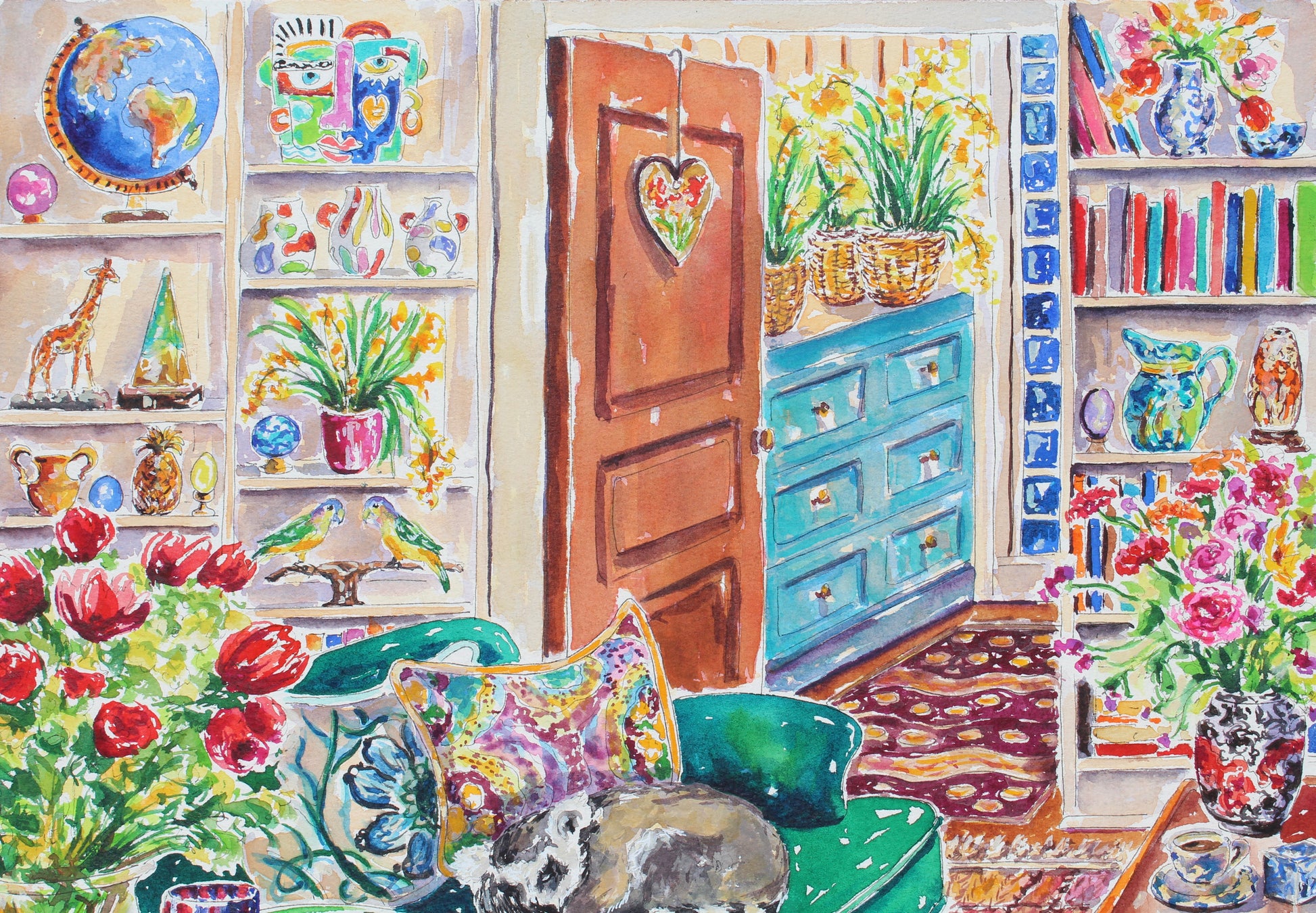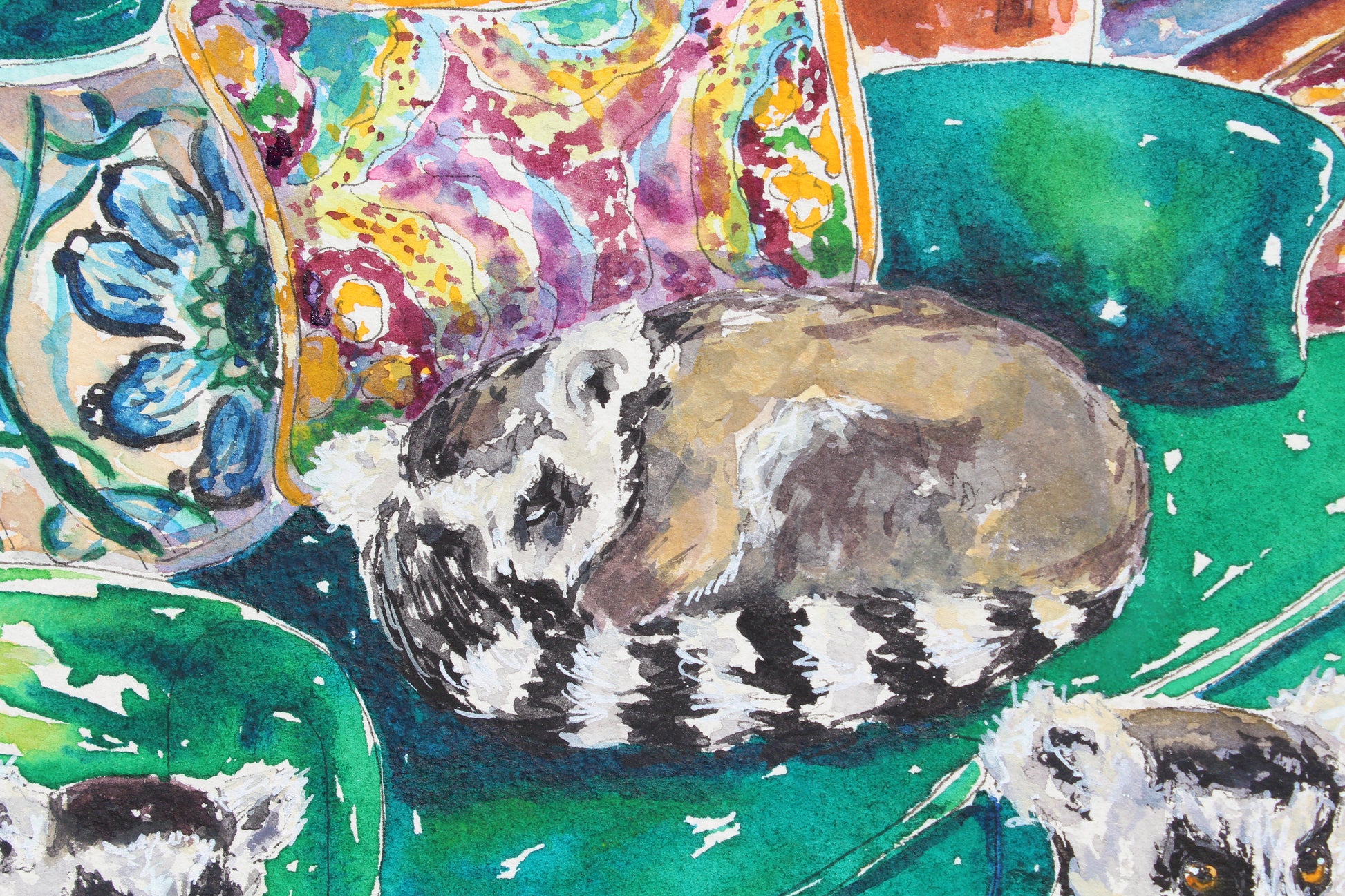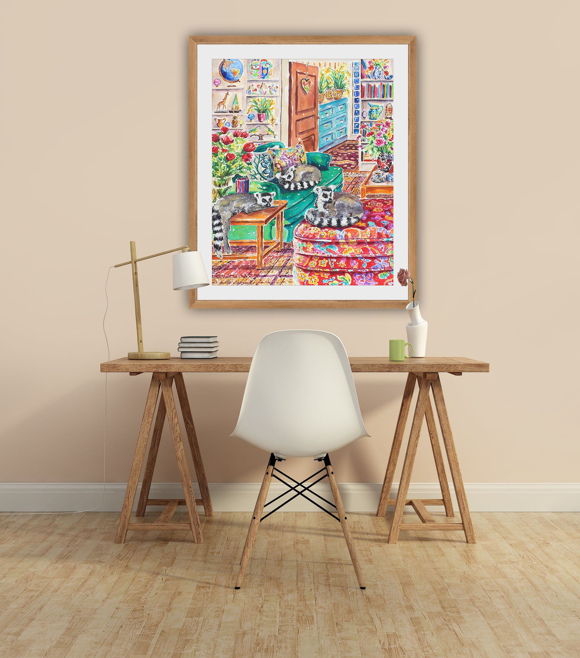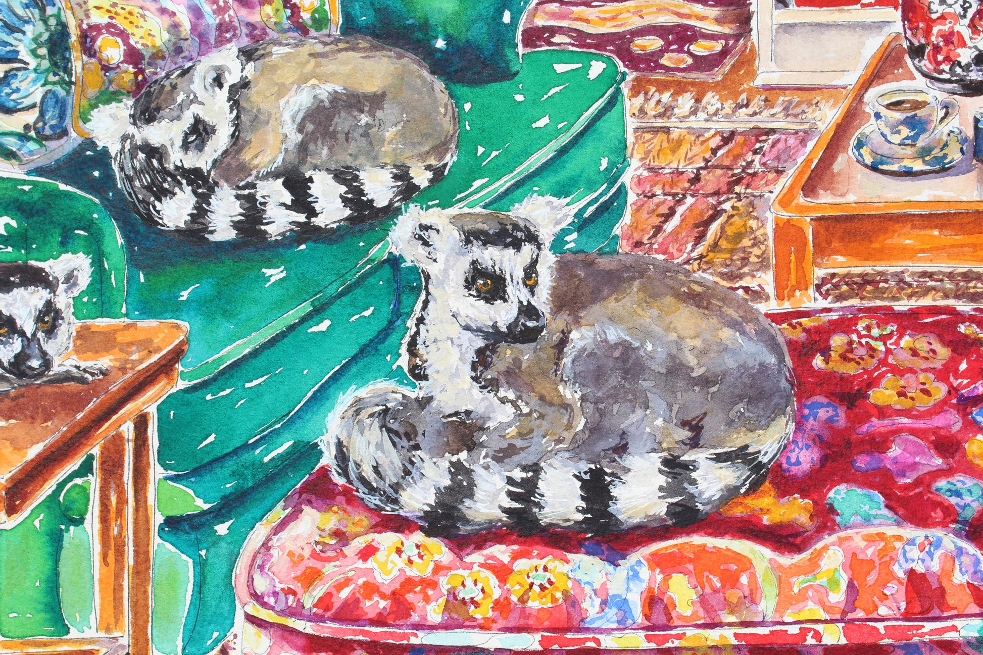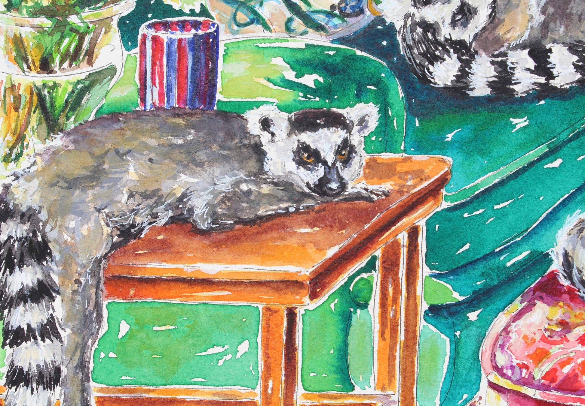 An original watercolor depicting 3 adorable Ring-Tailed Lemurs relaxing in a cozy living room. In addition to flowers and books, you'll spot decorations around the room from Madagascar, the island home of Lemurs. These include Vanilla orchids, a sculpture of Madagascar Lovebirds, a giraffe sculpture, stone eggs and an obelisk.