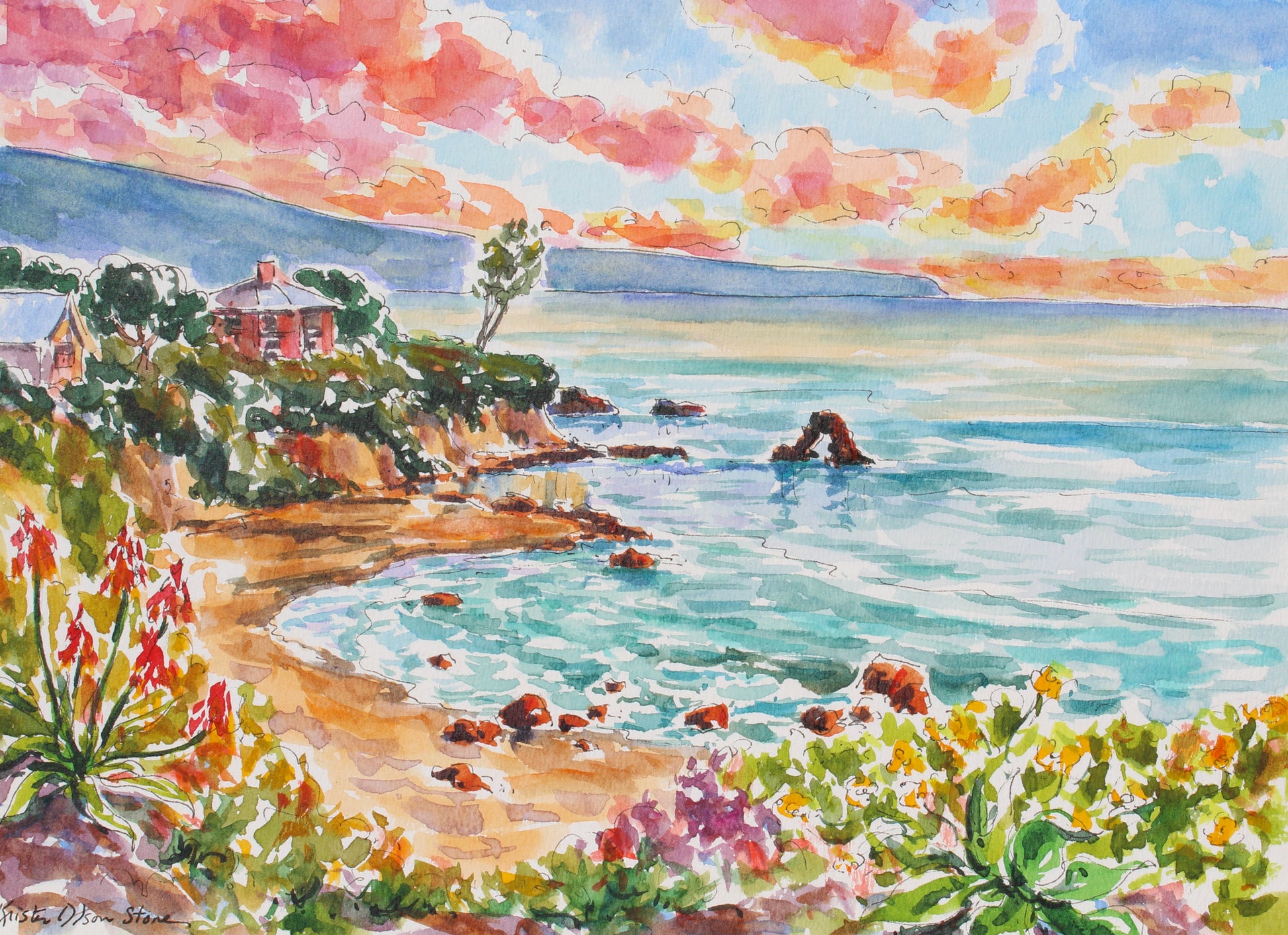 An original 9" x 12" or 22.86 x 30.48 cm watercolor and ink painting of the view from the lookout at Little Corona Del Mar. This painting has been painted with Rembrandt professional watercolors and archival ink on Rembrandt 300gsm watercolor paper.