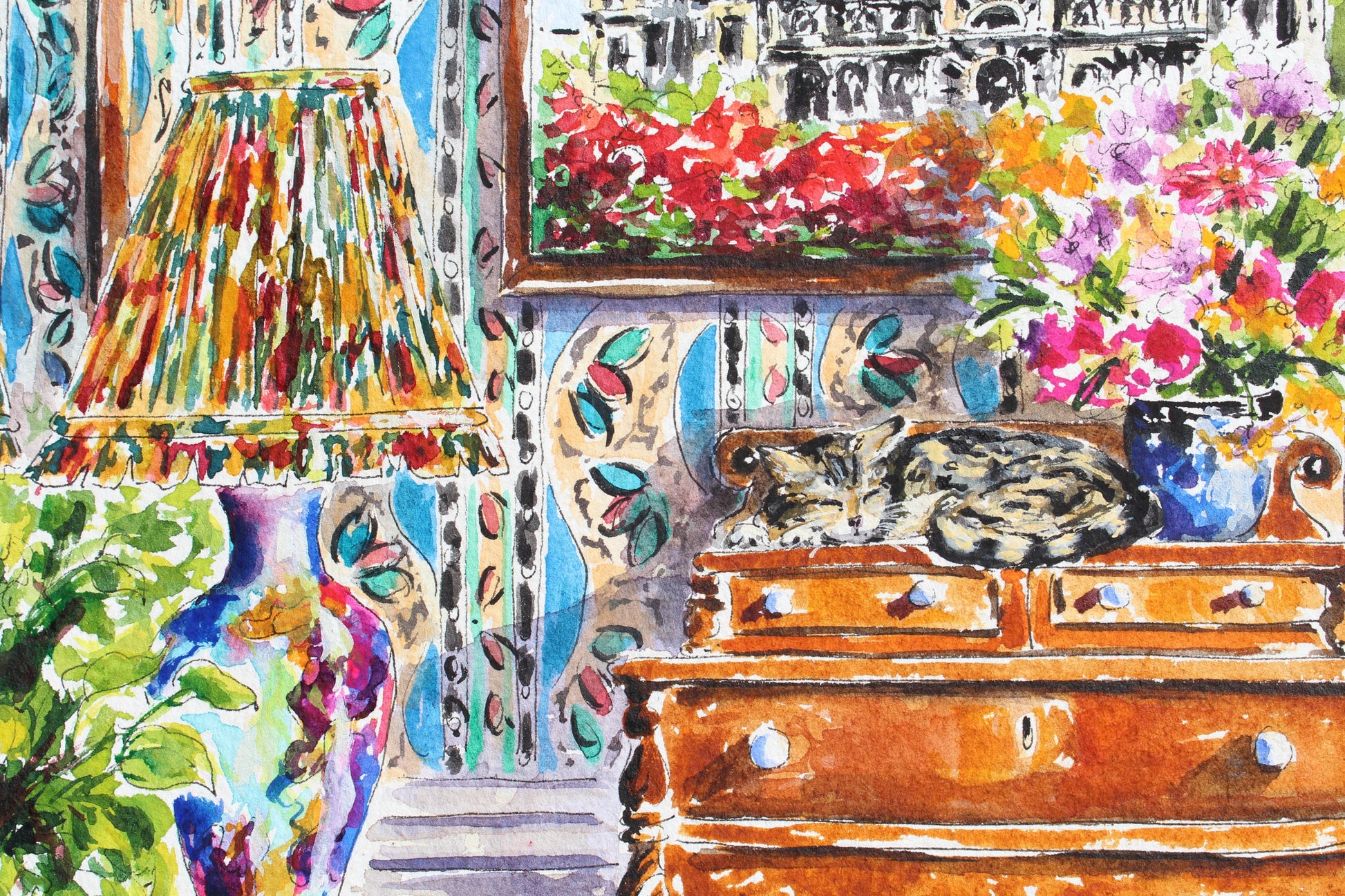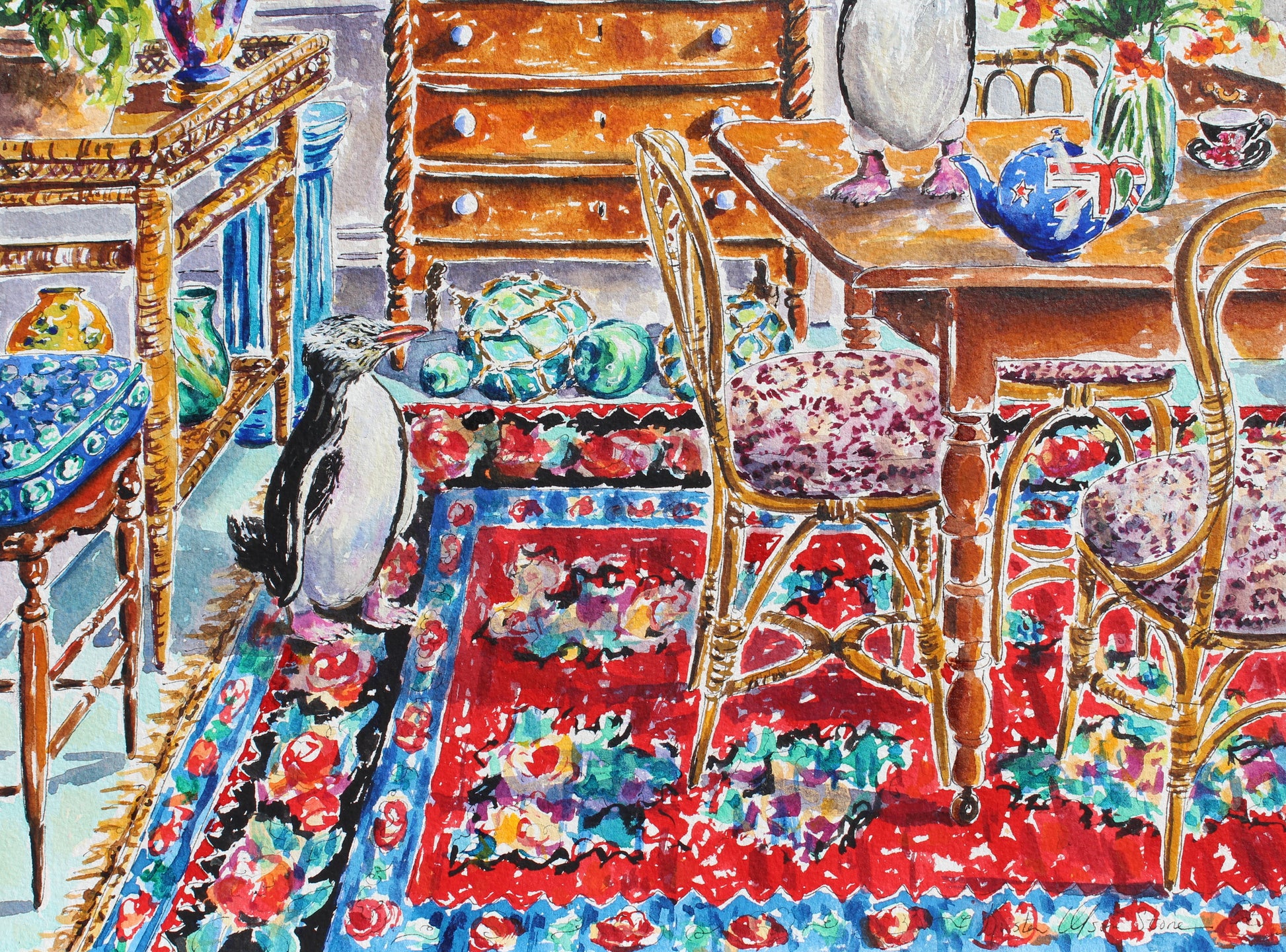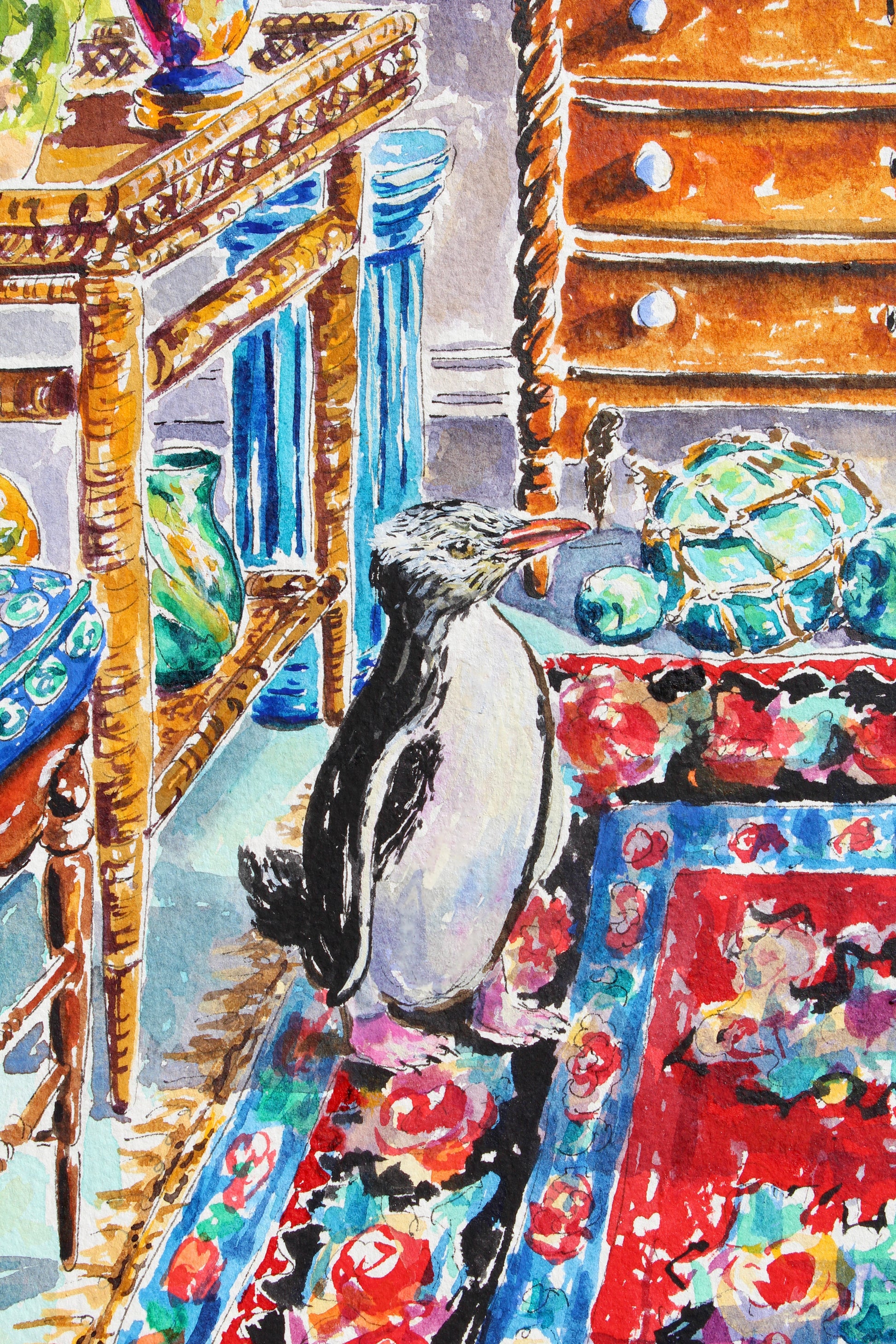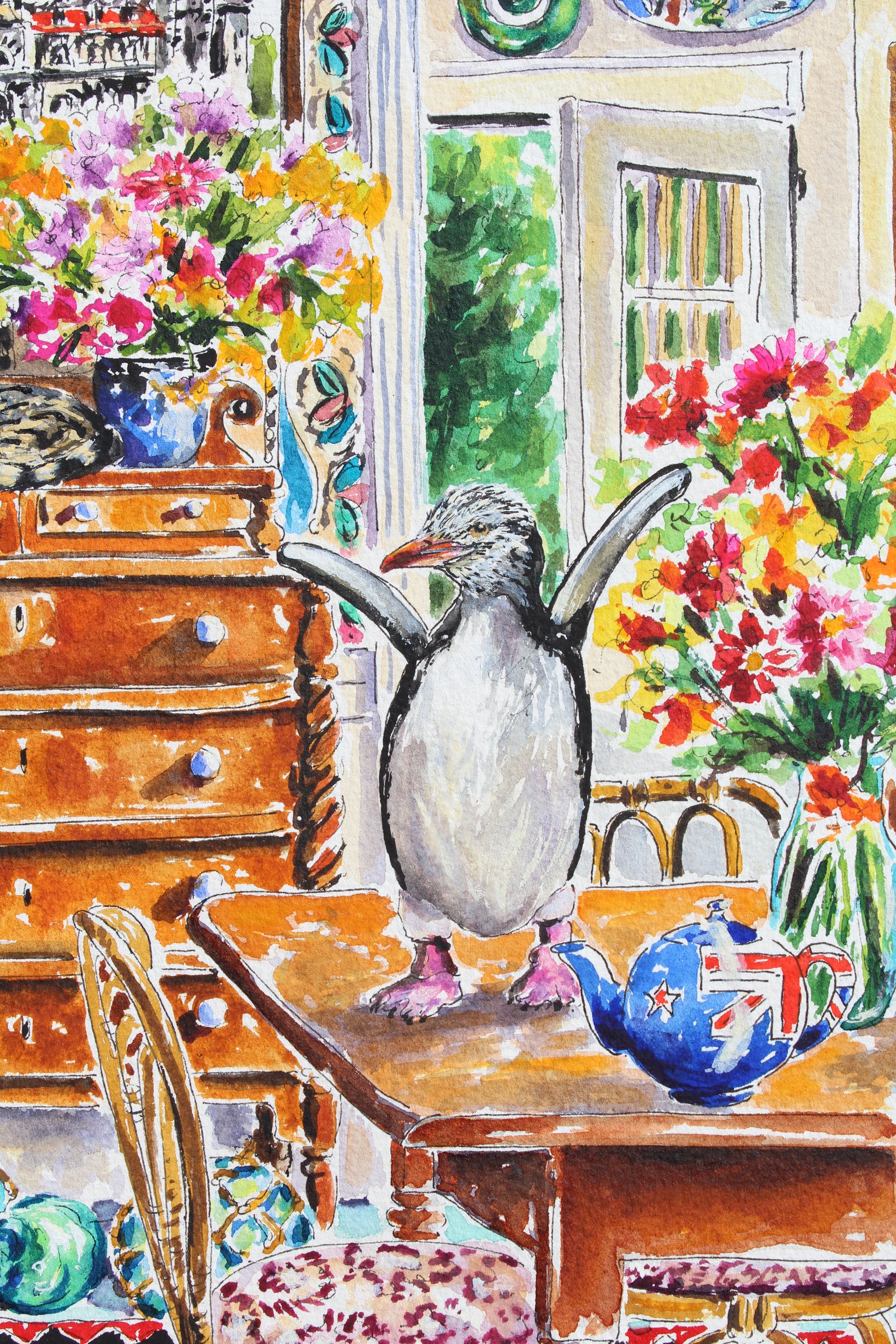 This painting will make you smile every time you look at it! A pair of Yellow-Eyed penguins are playing in a delightful, sunny room filled with colorful flowers whilst a tabby cat is napping on the nearby dresser!