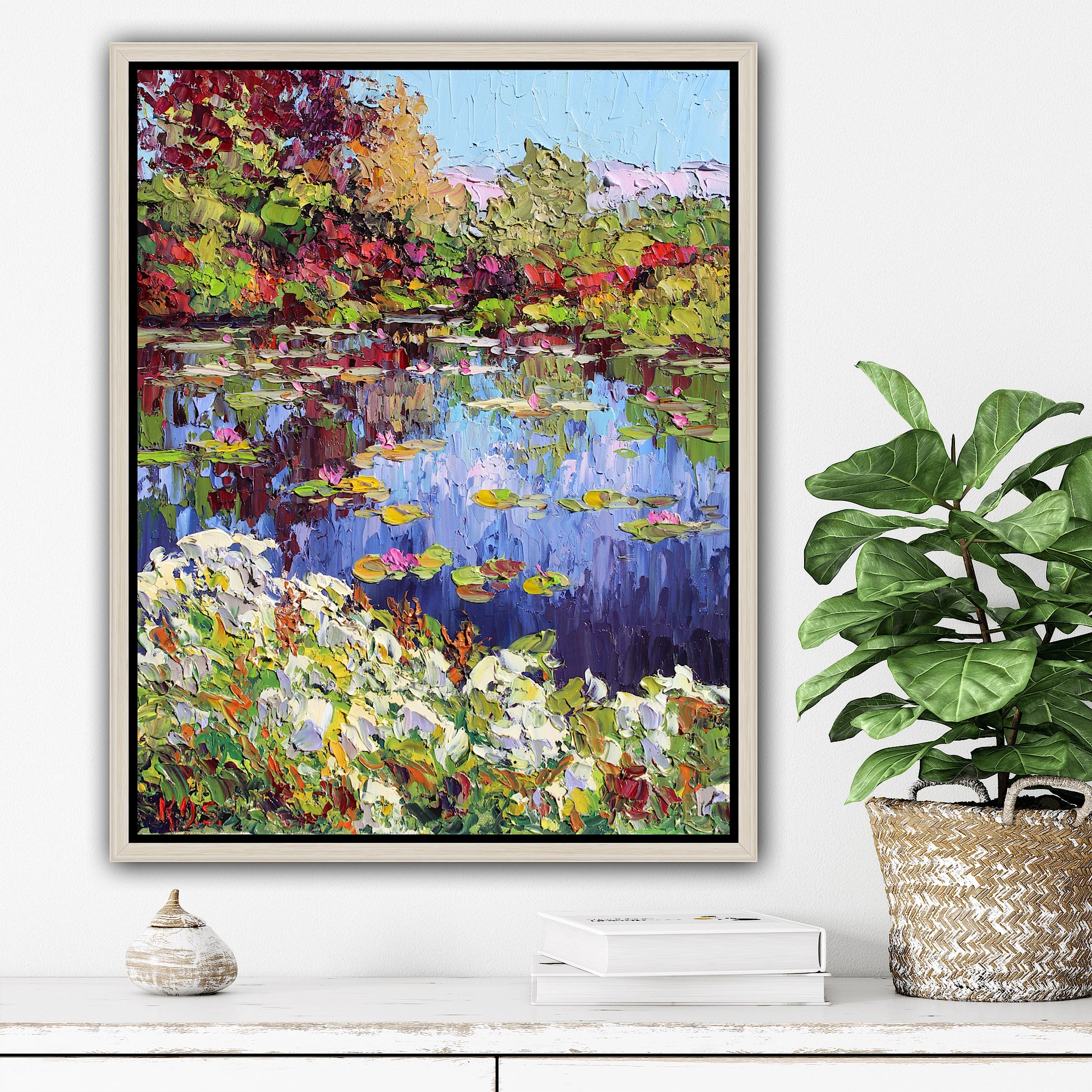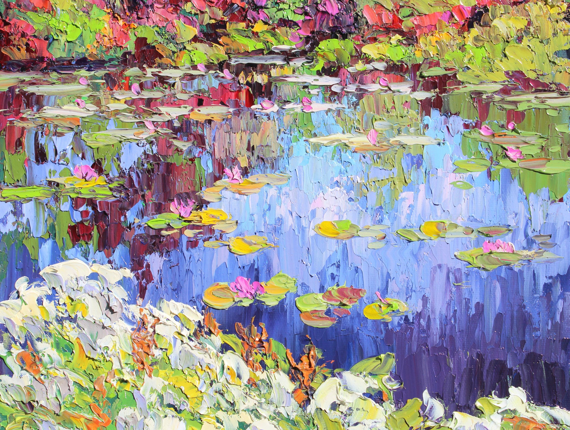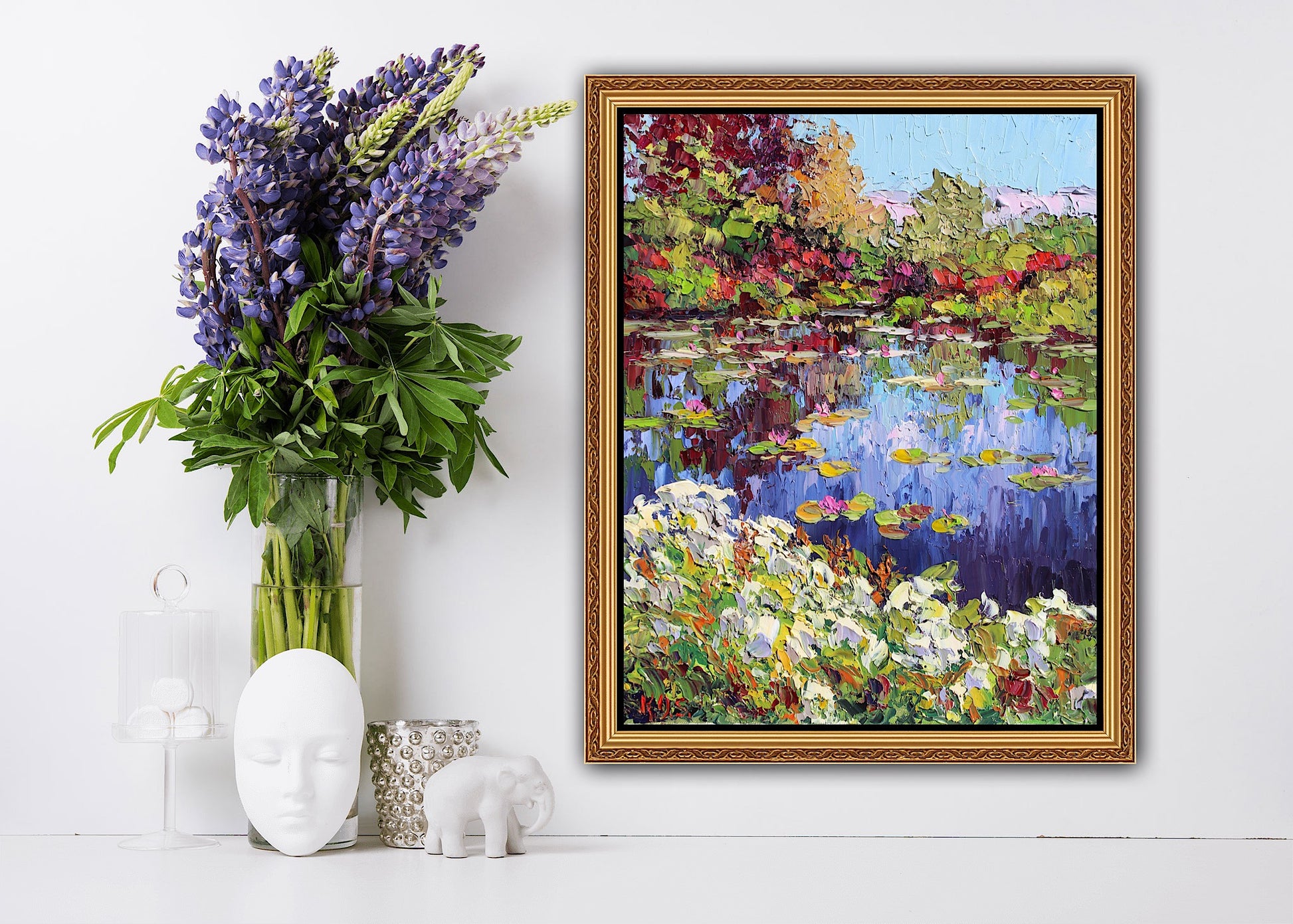 An original 14" x 10" or 35.56 x 27.94cm, oil painting on canvas of gorgeous morning light and soft violet reflections in the pond at Giverny, France.