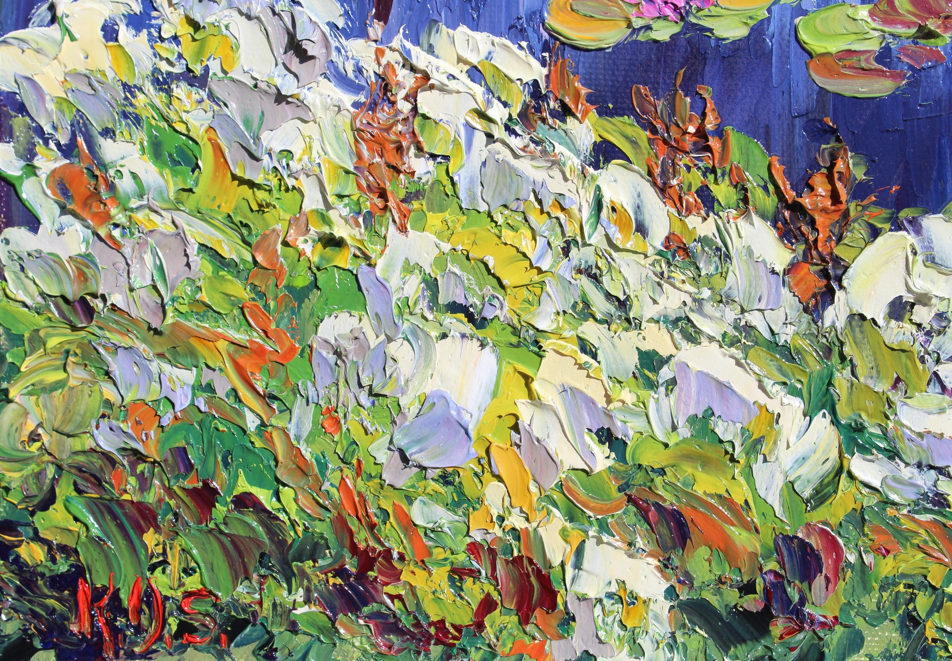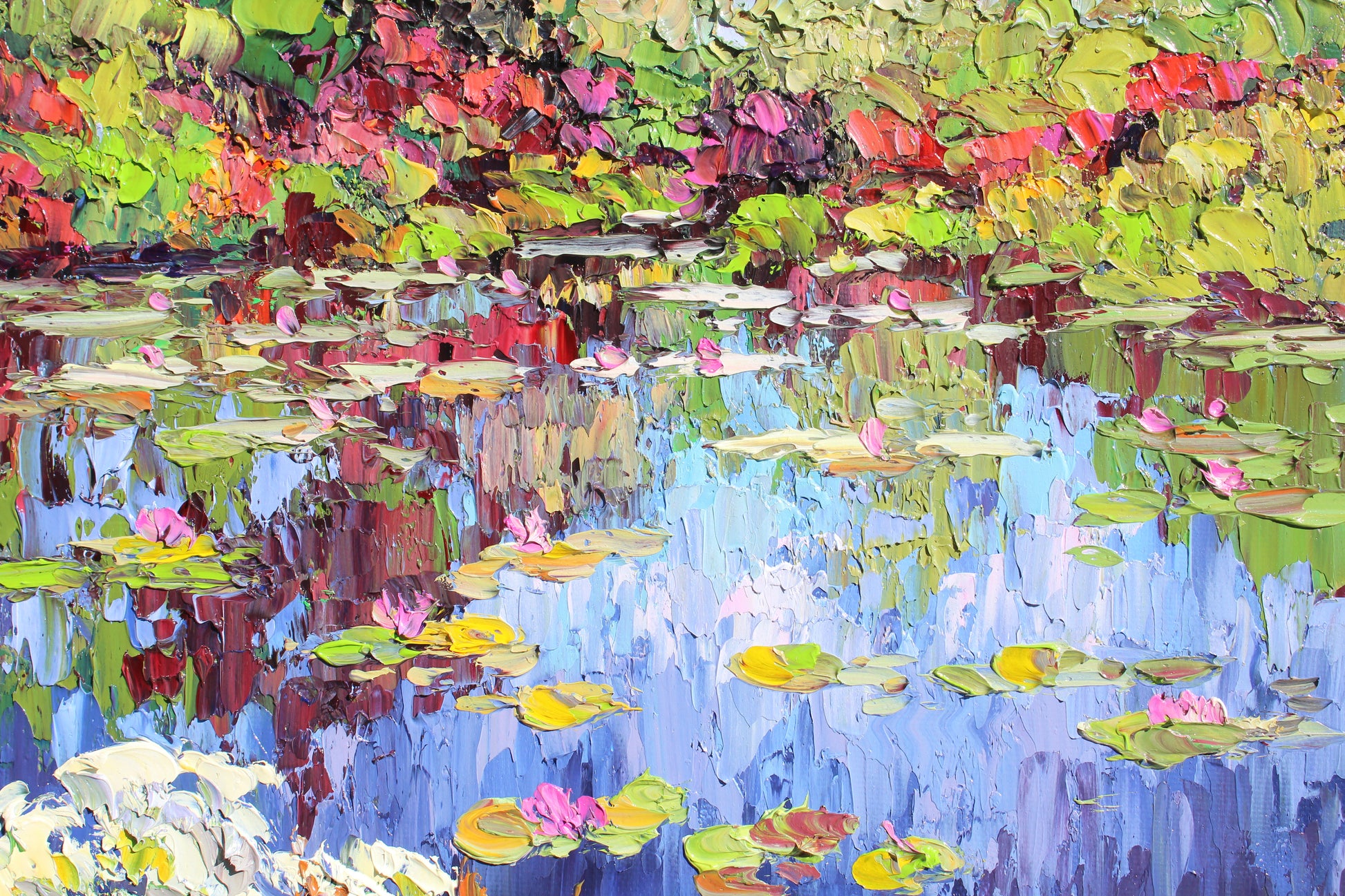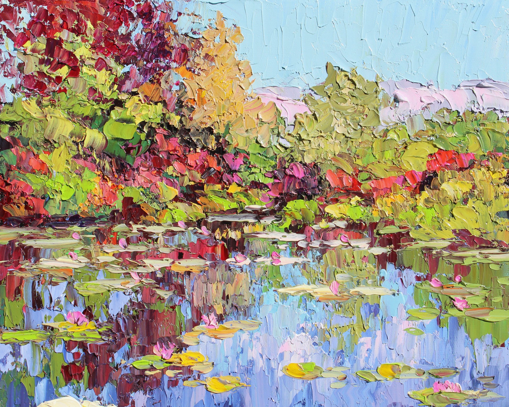 An original 14" x 10" or 35.56 x 27.94cm, oil painting on canvas of gorgeous morning light and soft violet reflections in the pond at Giverny, France.