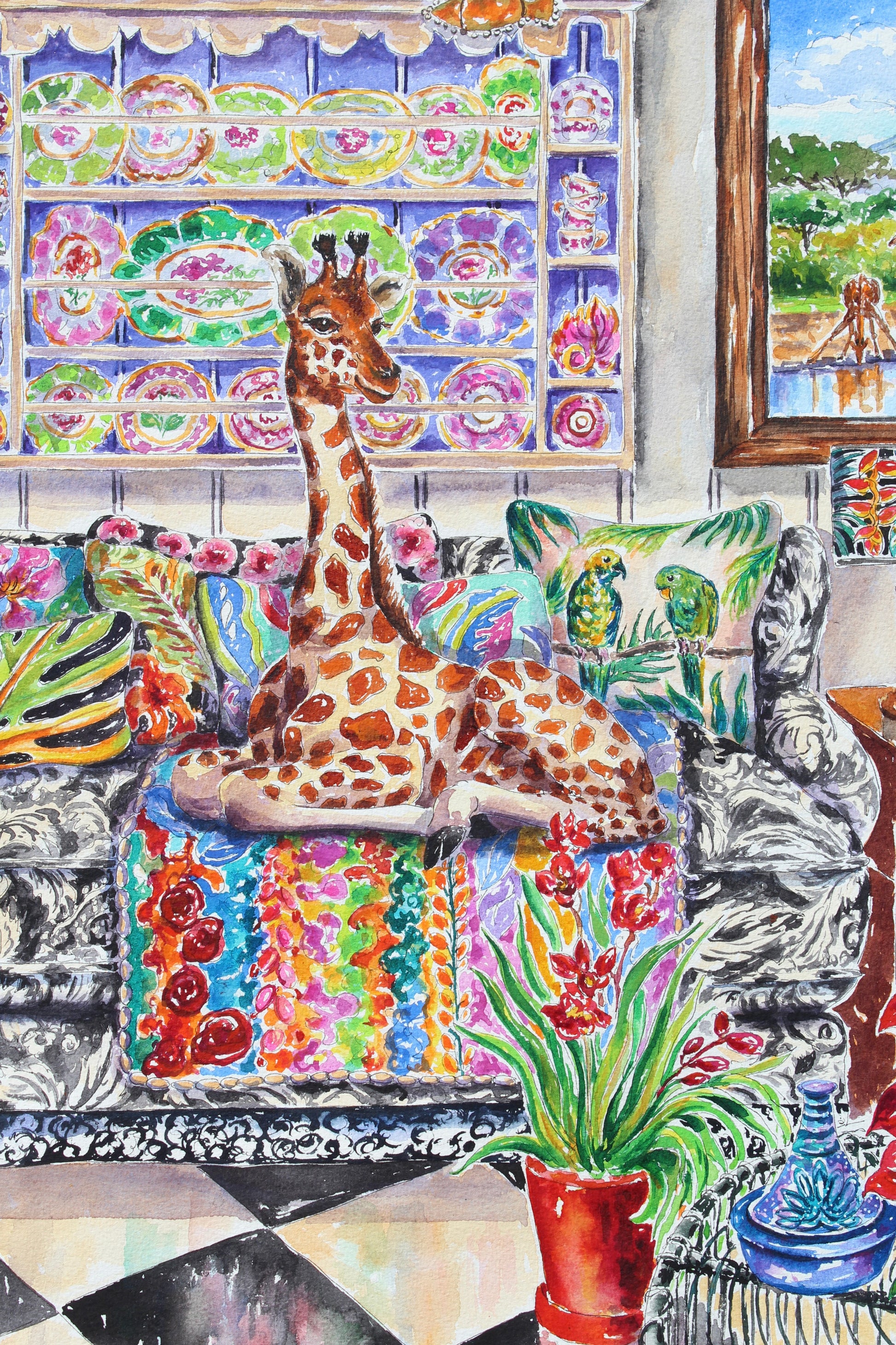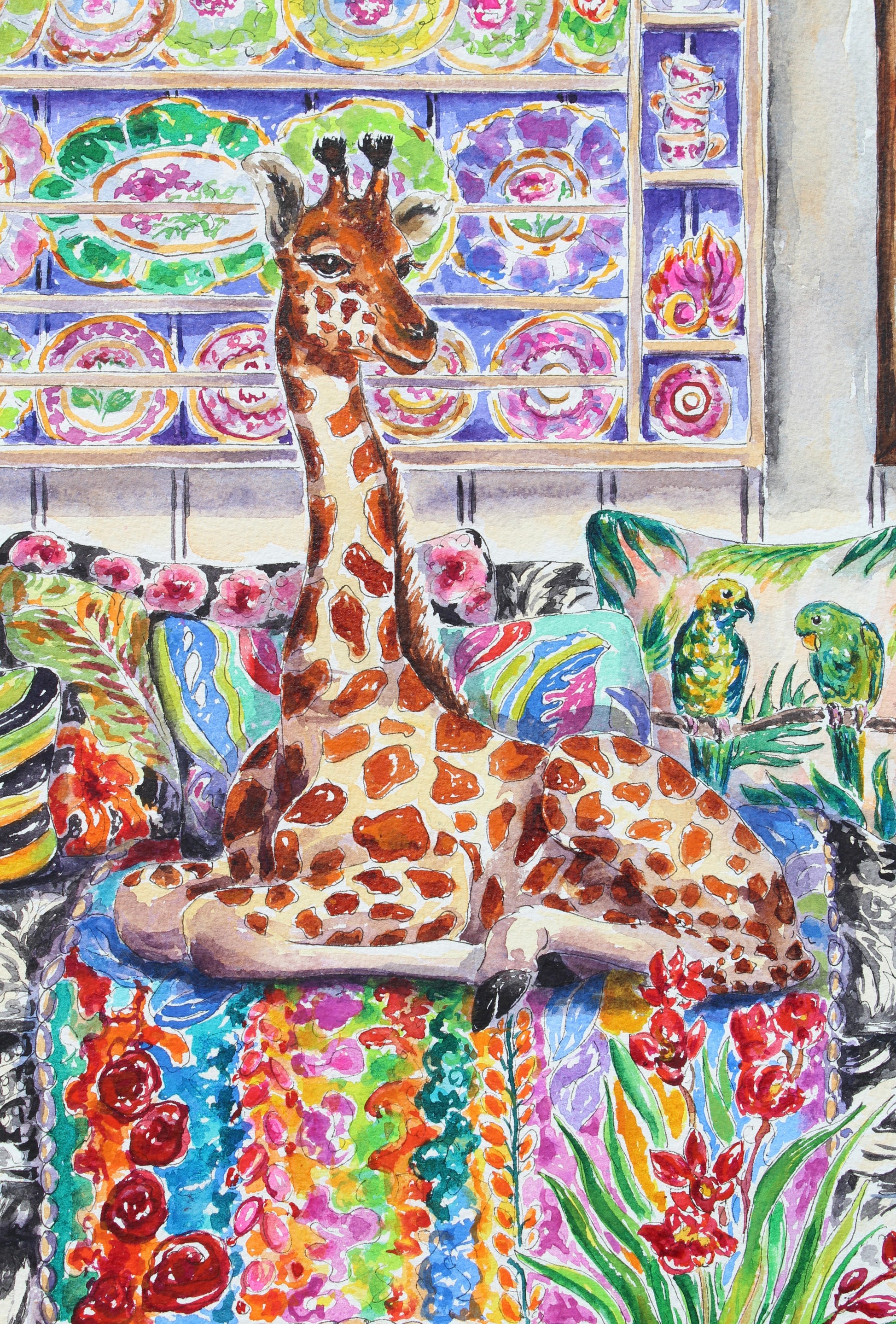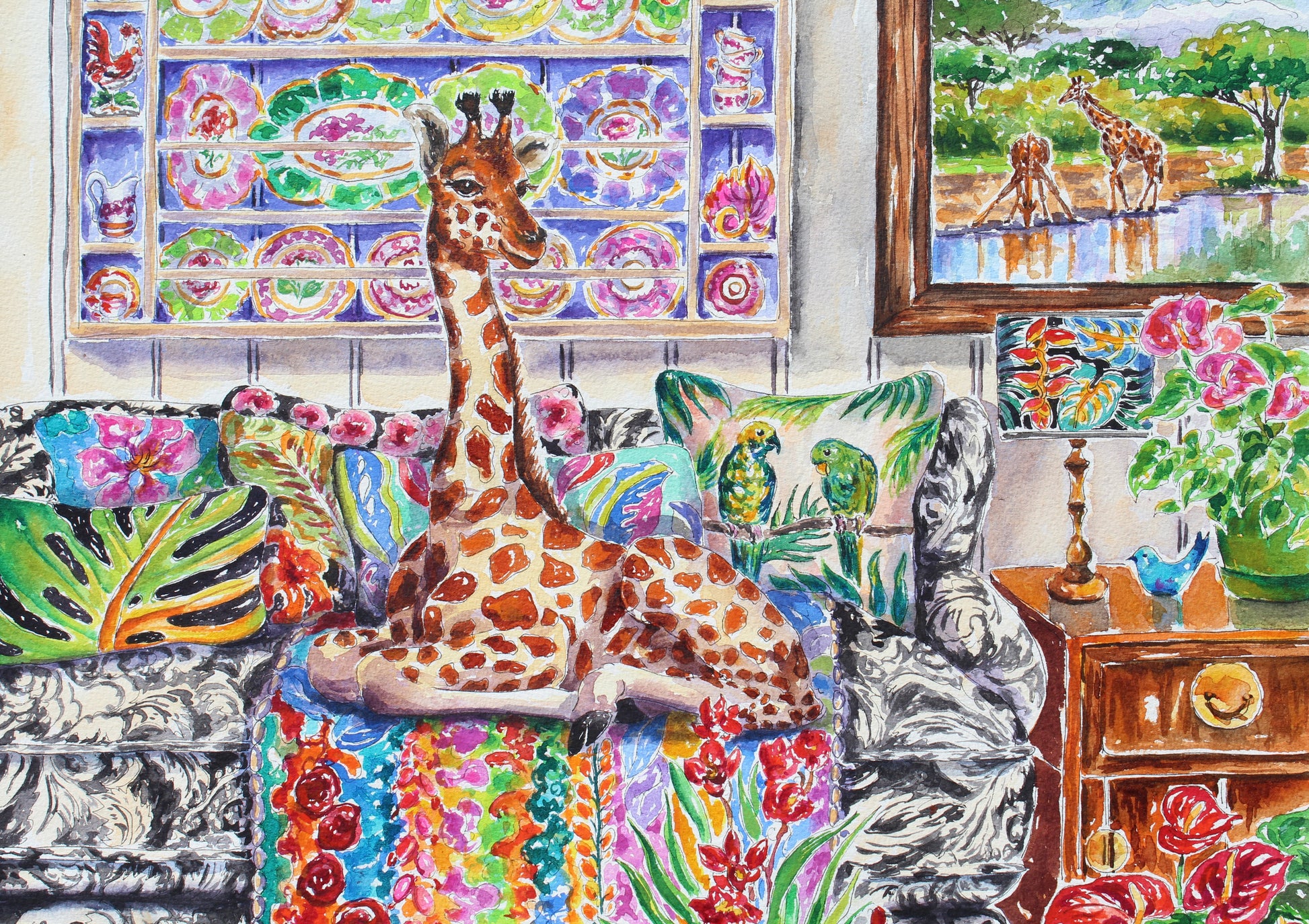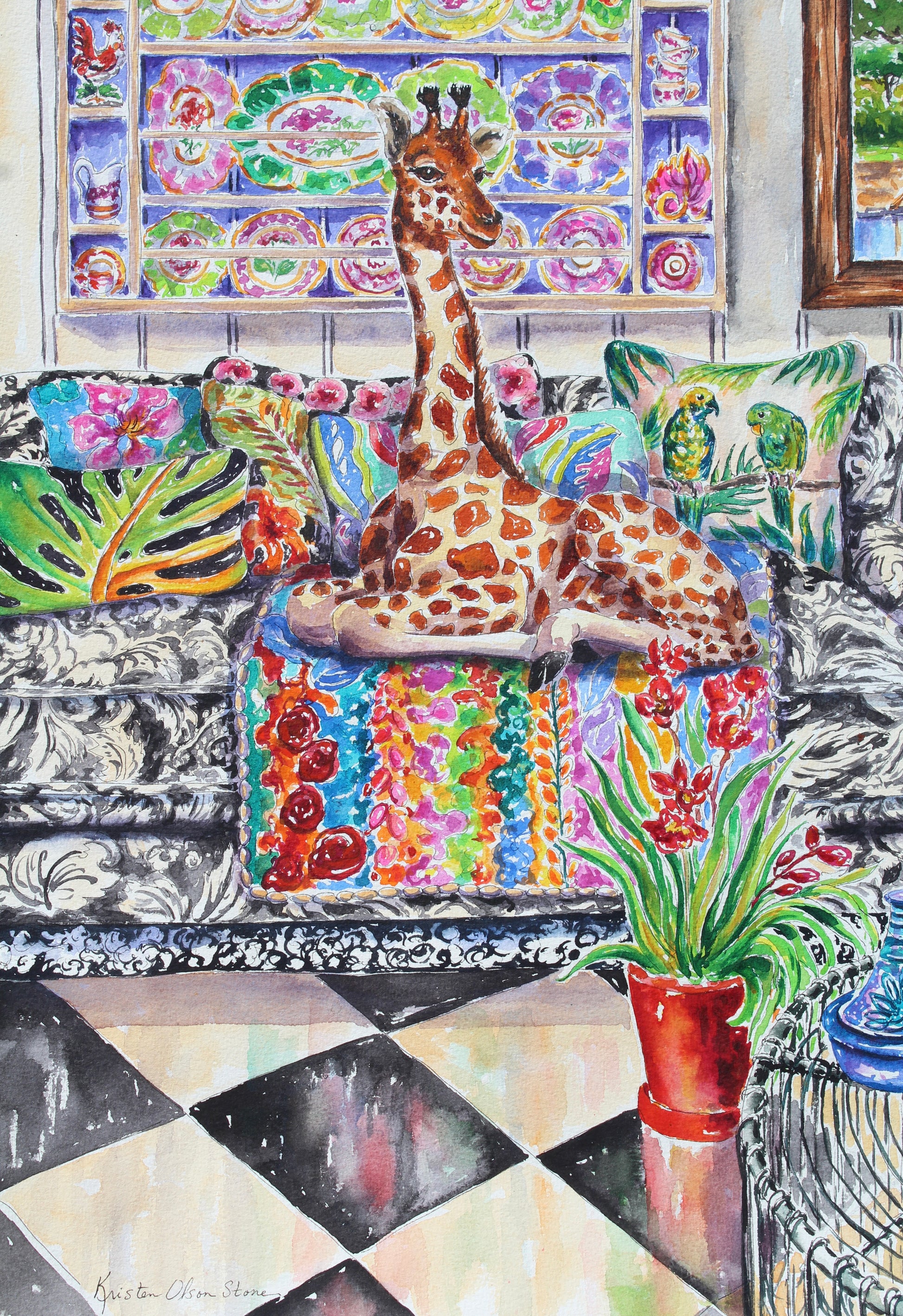 This is a joyful painting of a young giraffe casually lounging on a sofa in a garden sun room. The sofa is filled with a tropical themed blanket and pillows. This style of this painting is impressionistic and detailed at the same time.
