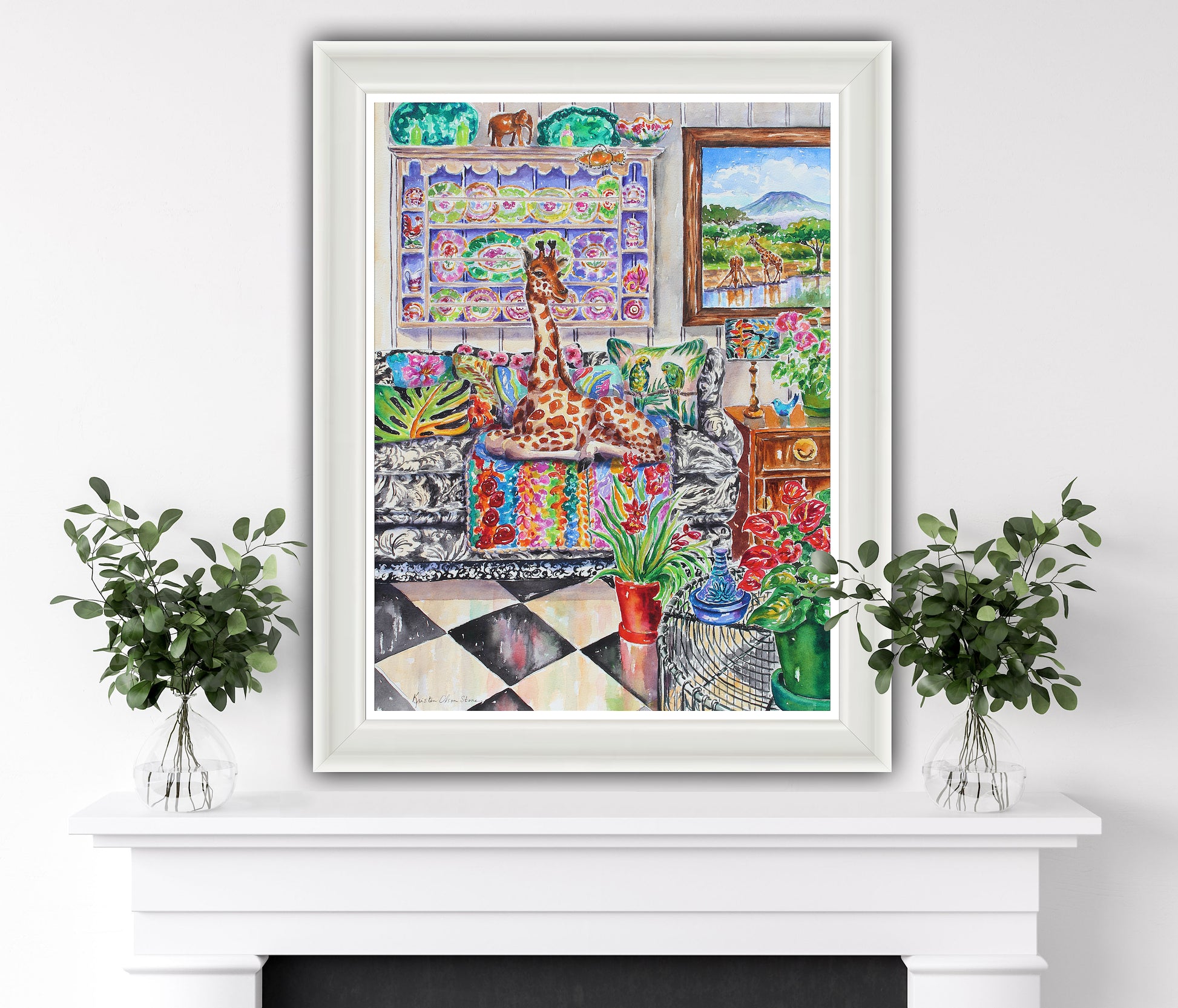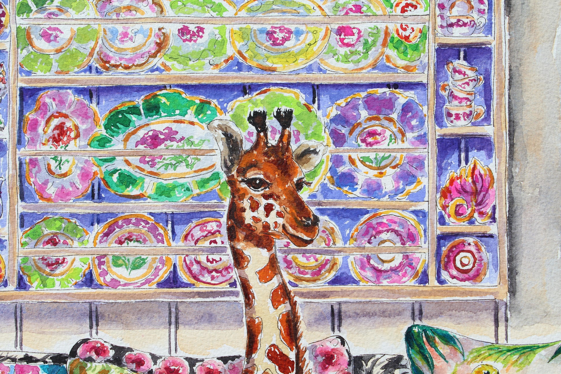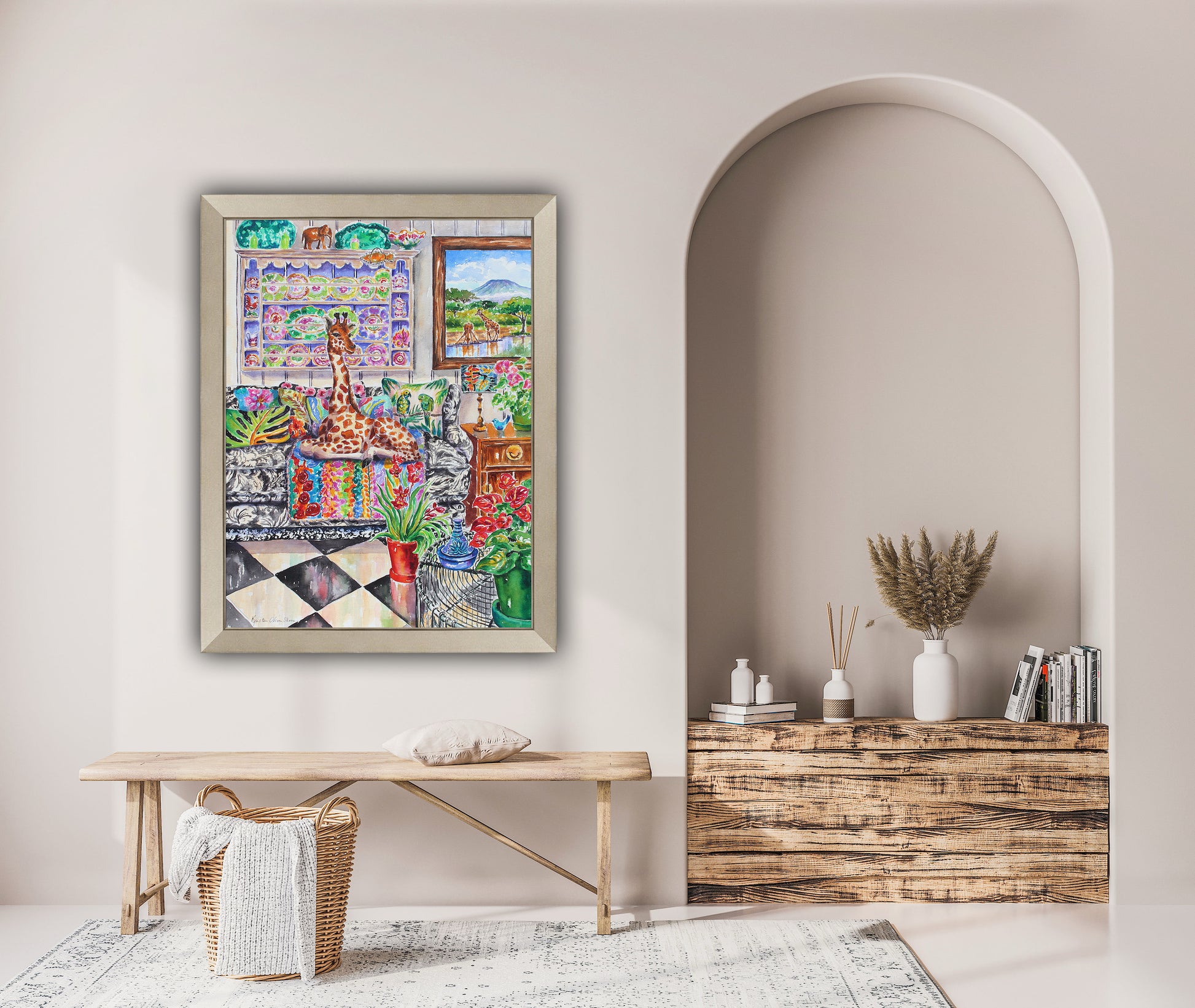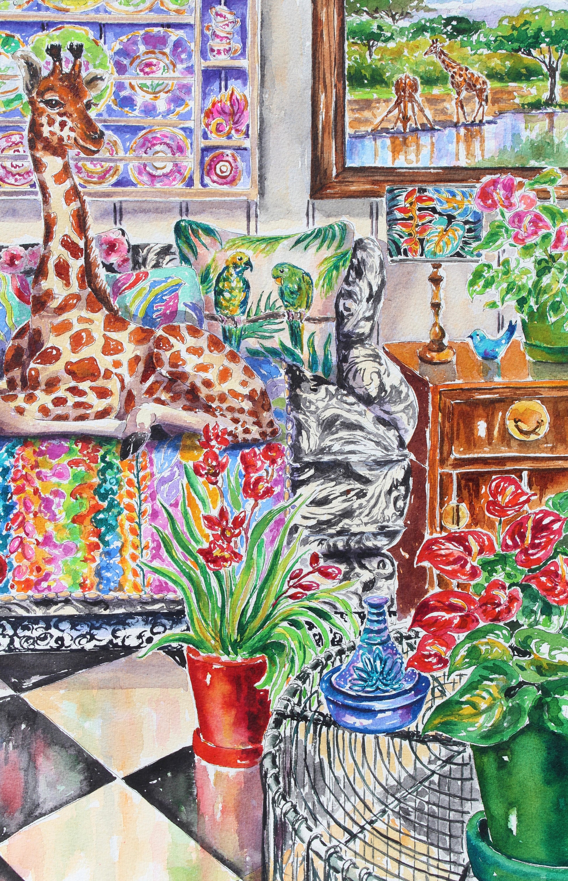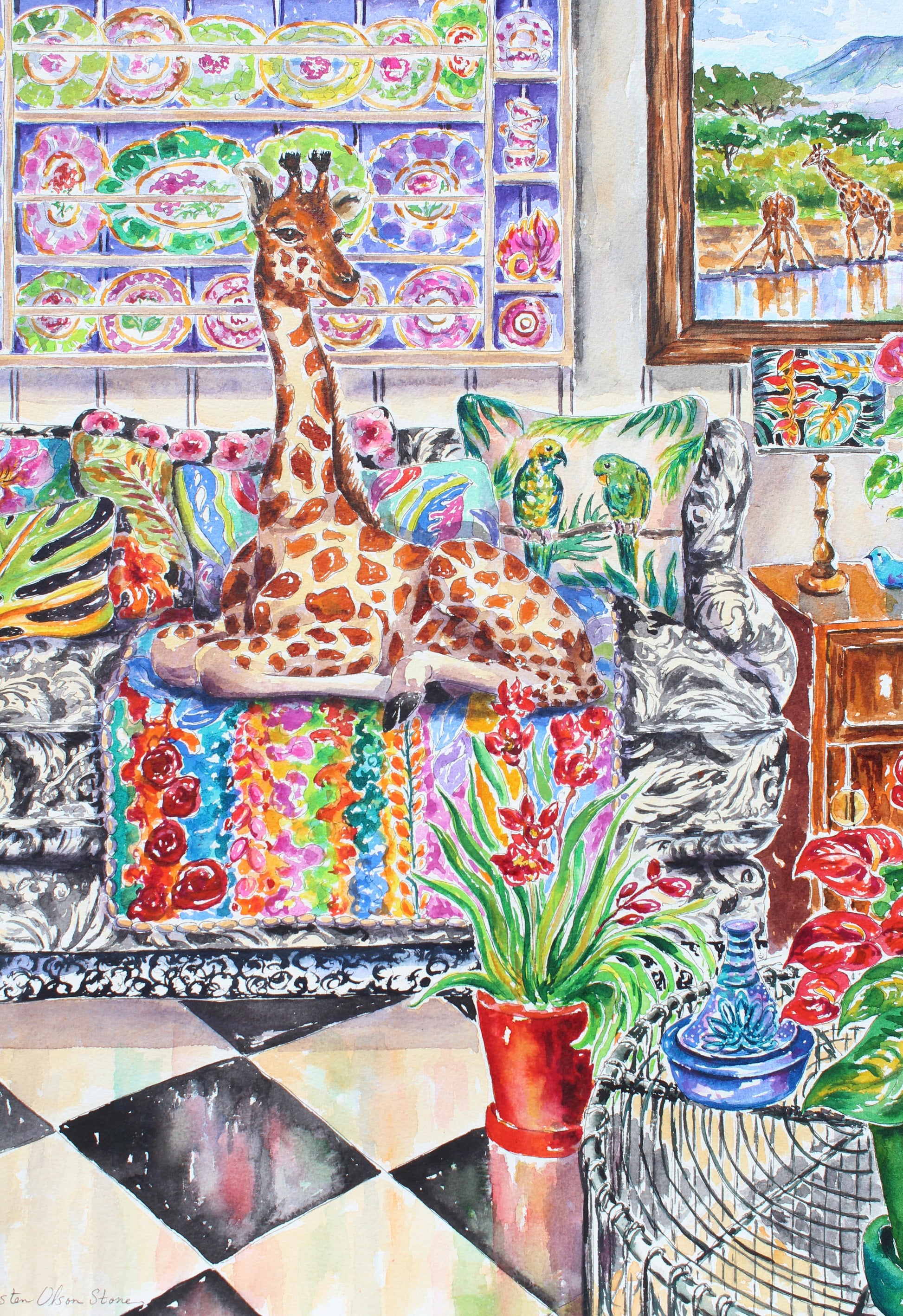 This is a joyful painting of a young giraffe casually lounging on a sofa in a garden sun room. The sofa is filled with a tropical themed blanket and pillows. This style of this painting is impressionistic and detailed at the same time.
