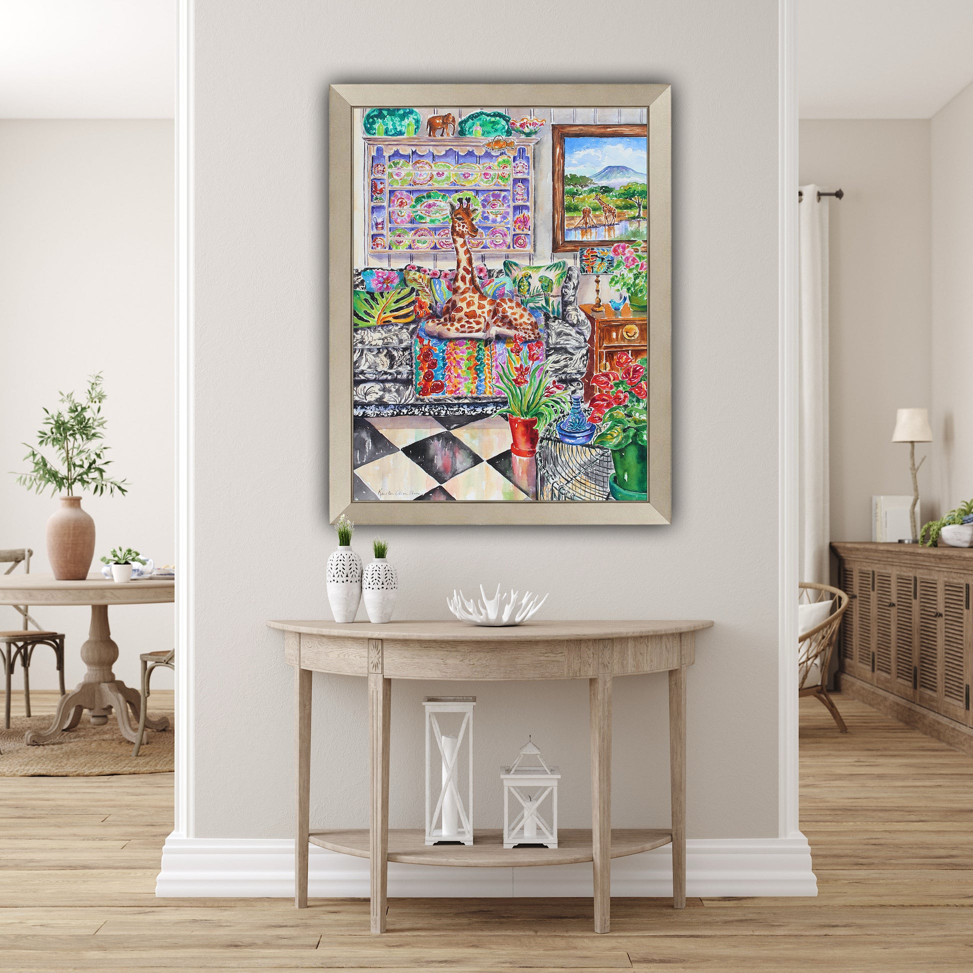 I especially love the side-eyed, smiley expression of the giraffe in this painting! This artwork is part of my series depicting cherished pets and wildlife coexisting under one roof! It's a powerful reminder that we can live in harmony with nature when we open our hearts and truly see the wonder in every living being. We become part of something bigger, an unbreakable bond that unites us all.