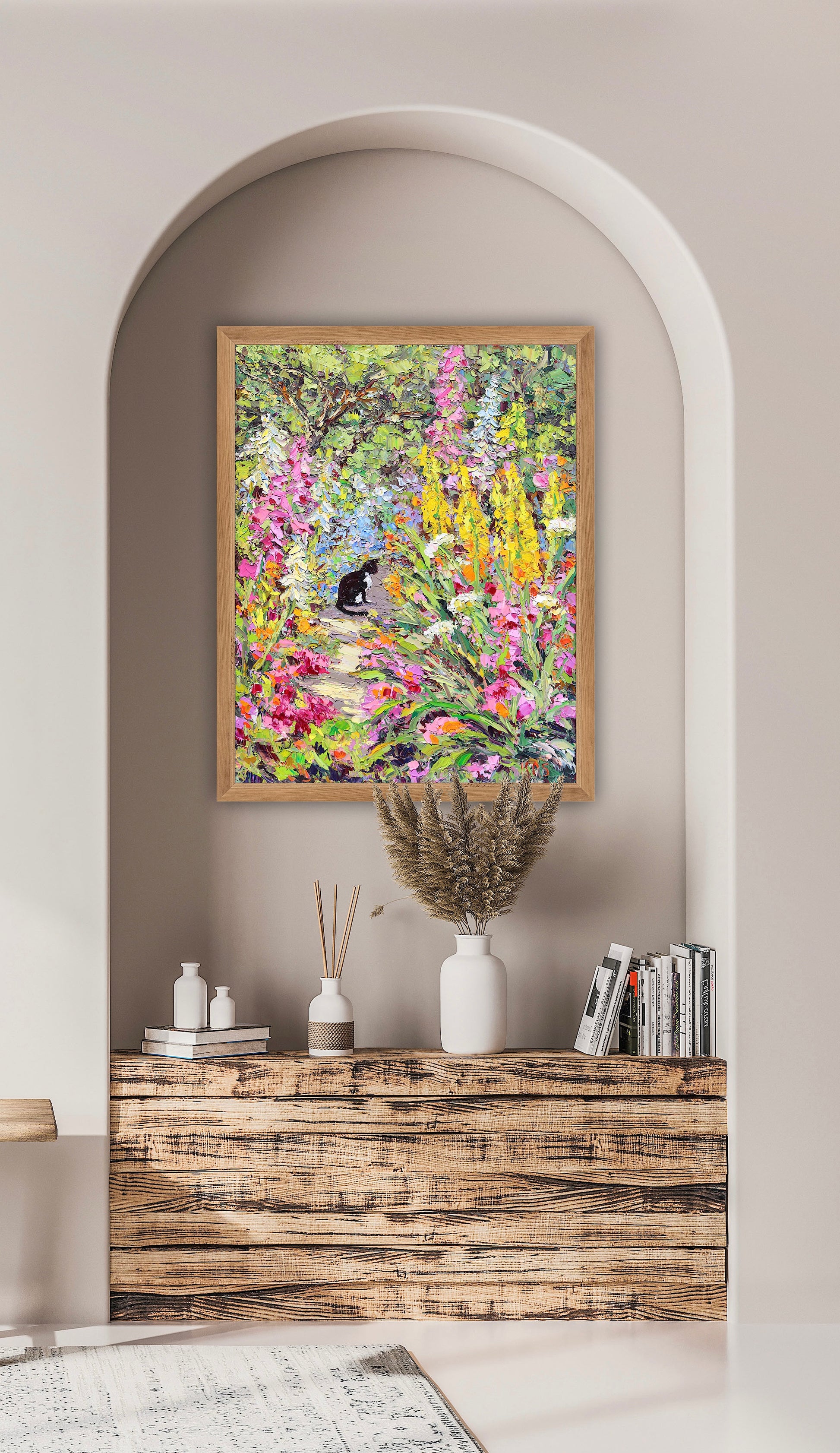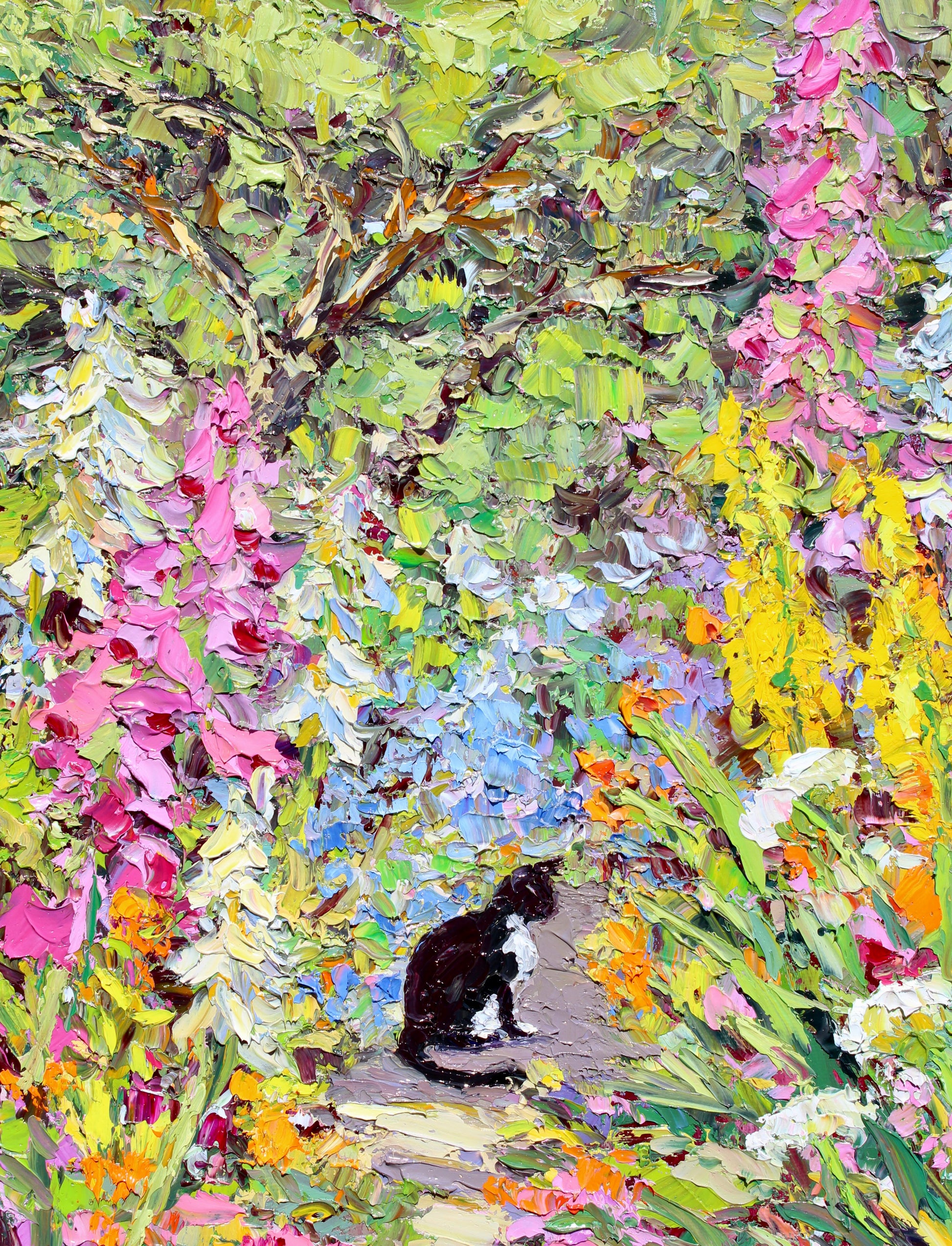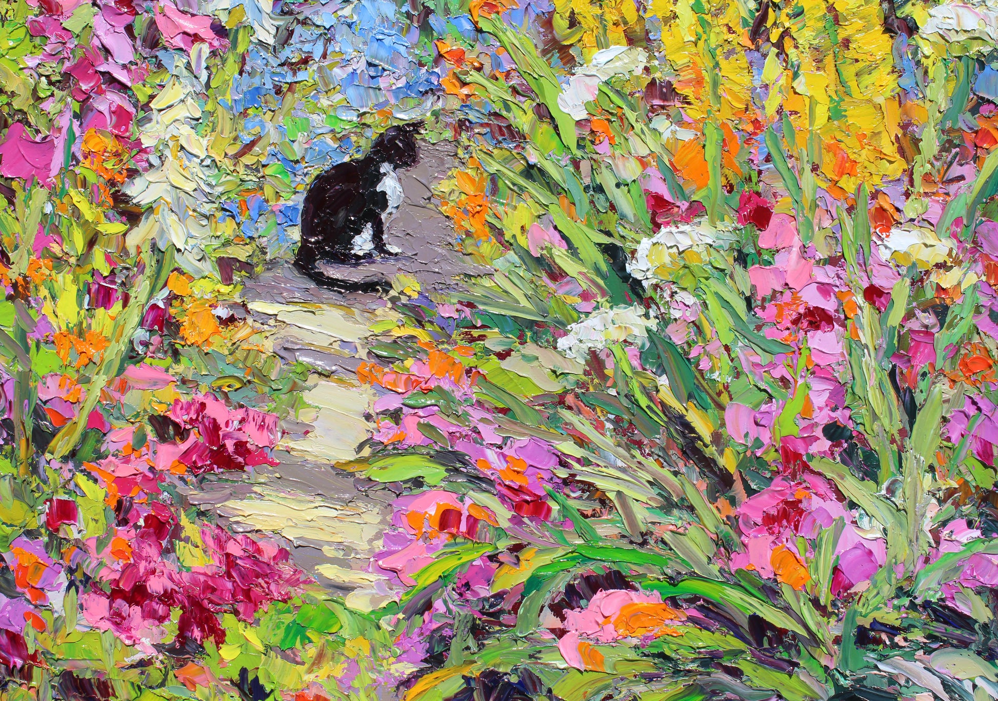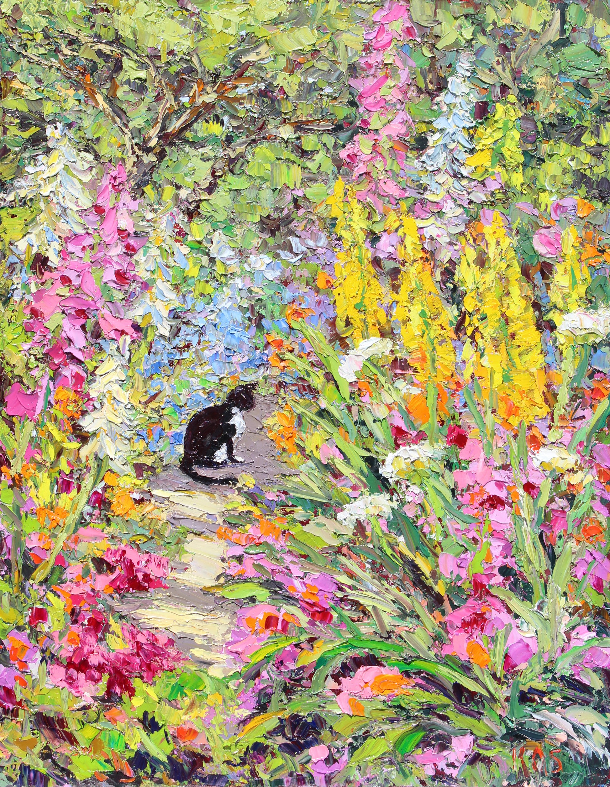An original impressionist garden landscape with a little black and white cat sitting on the pathway. Colorful delphiniums and other garden flowers are in full bloom. Bathed in warm sunshine, this scene is reminiscent of a beautiful summer morning!