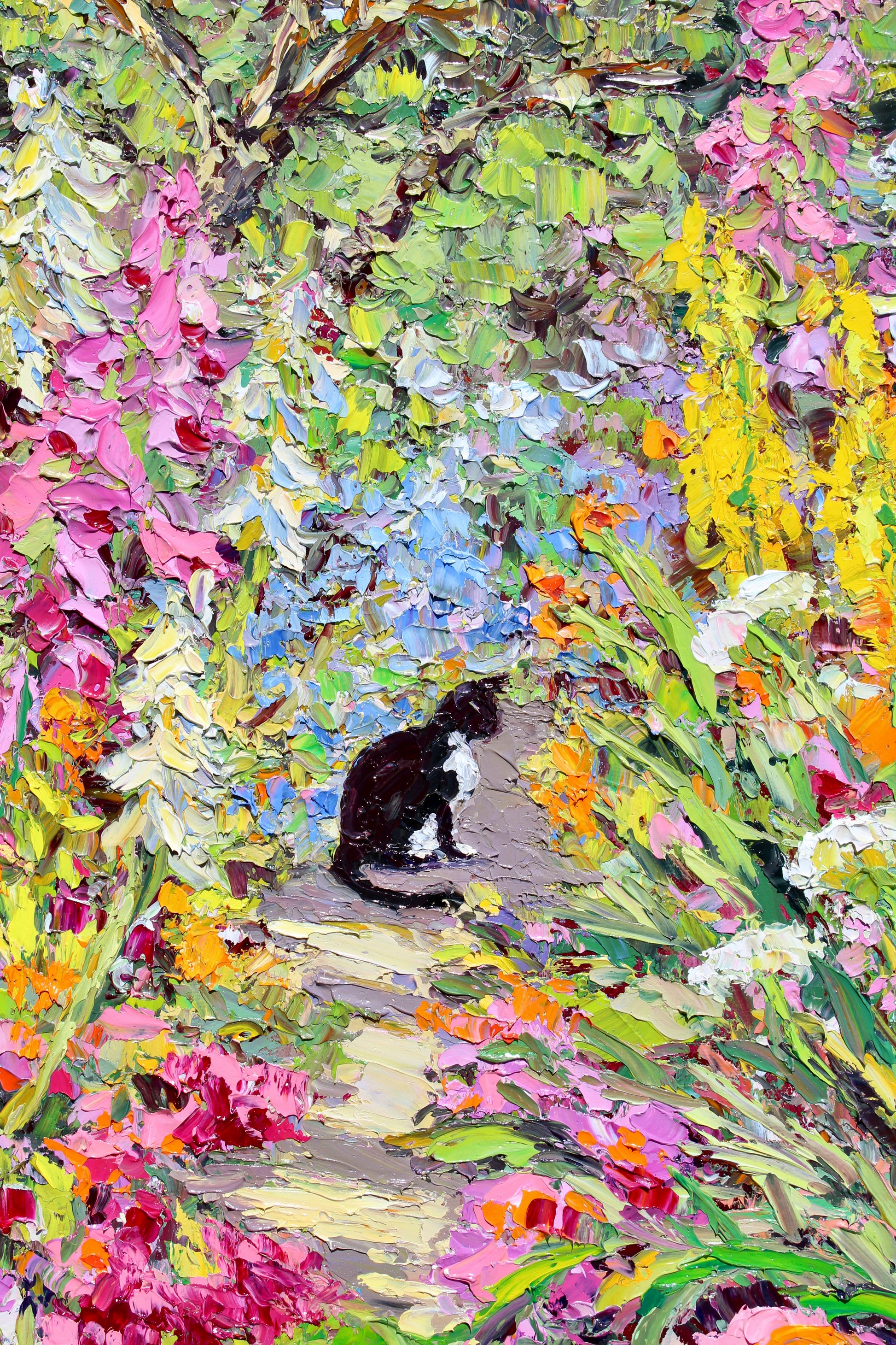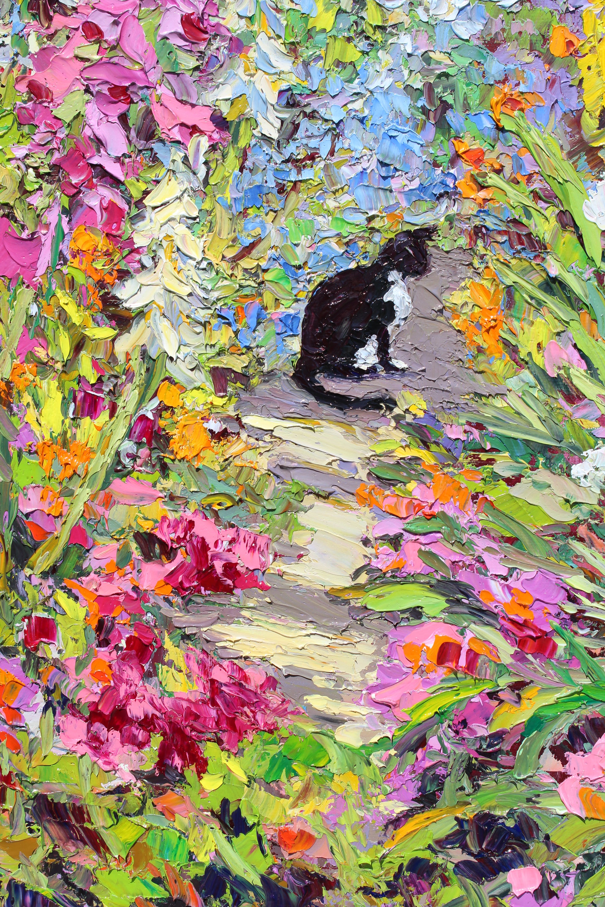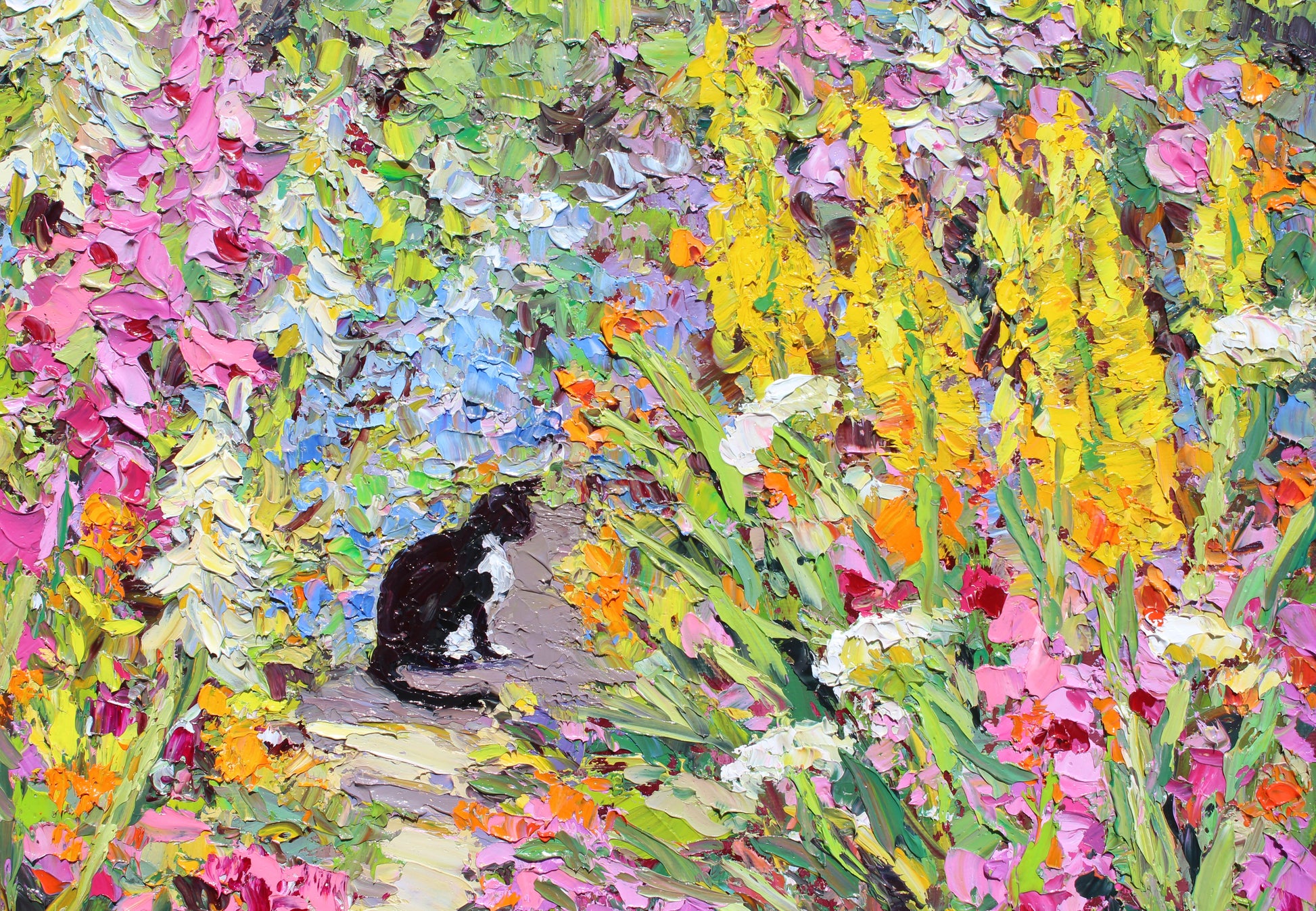 An original impressionist garden landscape with a little black and white cat sitting on the pathway. Colorful delphiniums and other garden flowers are in full bloom. Bathed in warm sunshine, this scene is reminiscent of a beautiful summer morning!
