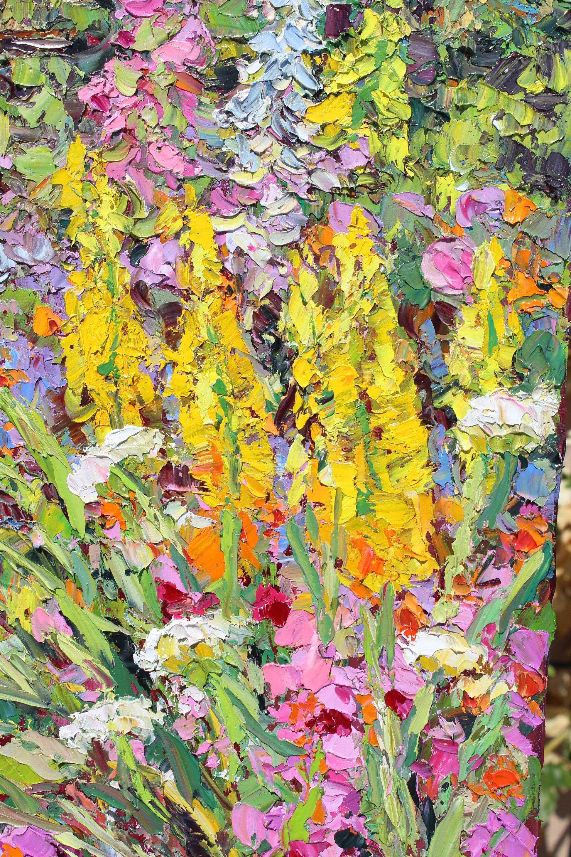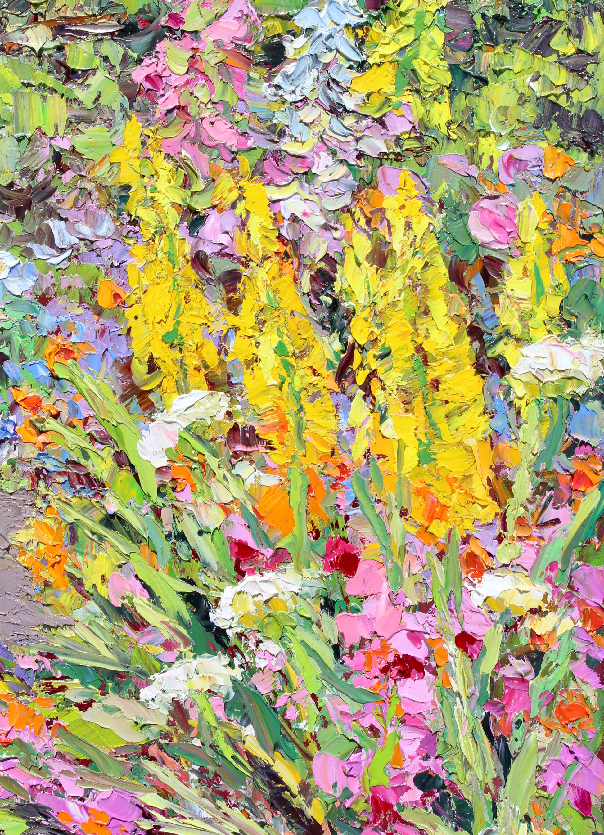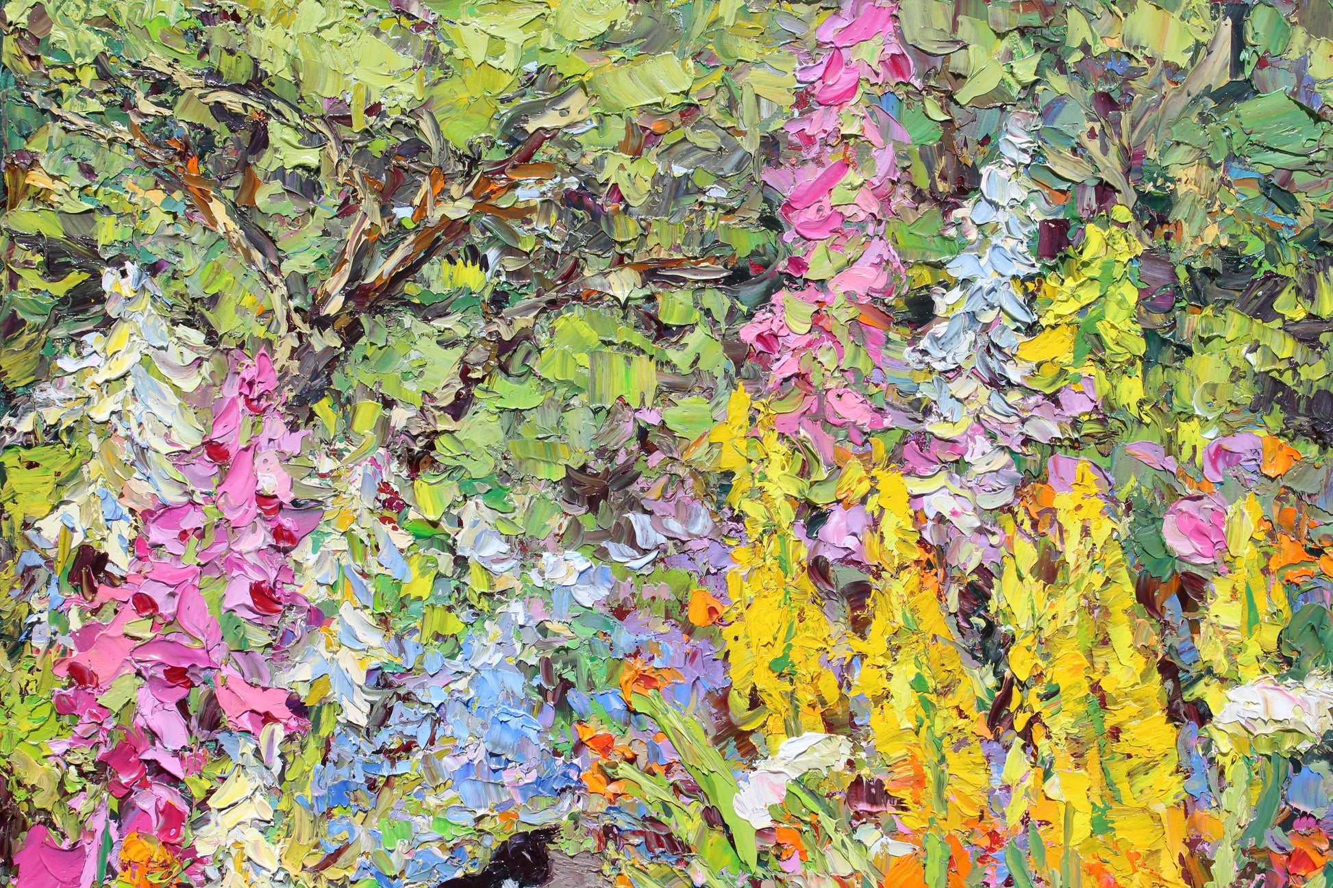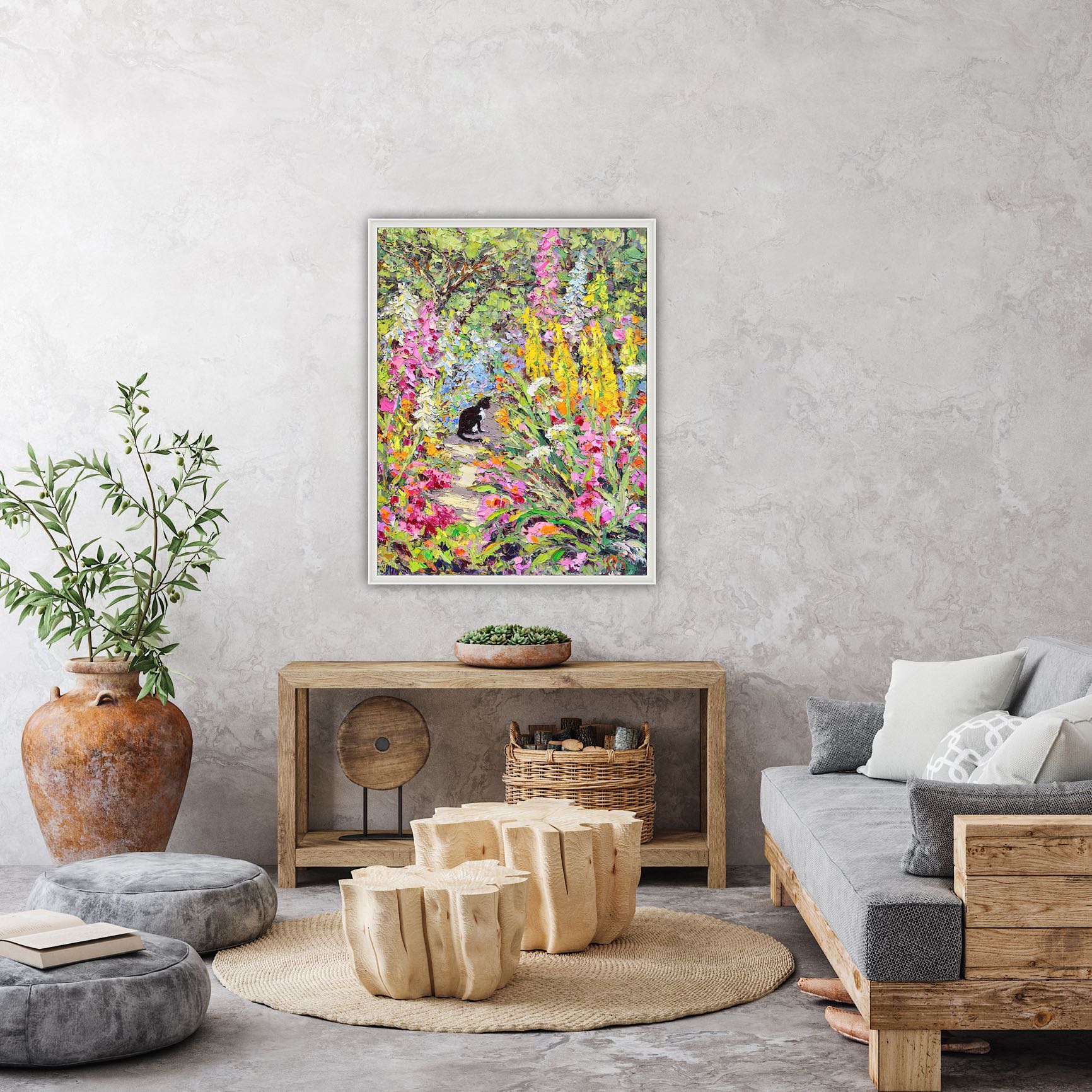An original impressionist garden landscape with a little black and white cat sitting on the pathway. Colorful delphiniums and other garden flowers are in full bloom. Bathed in warm sunshine, this scene is reminiscent of a beautiful summer morning!