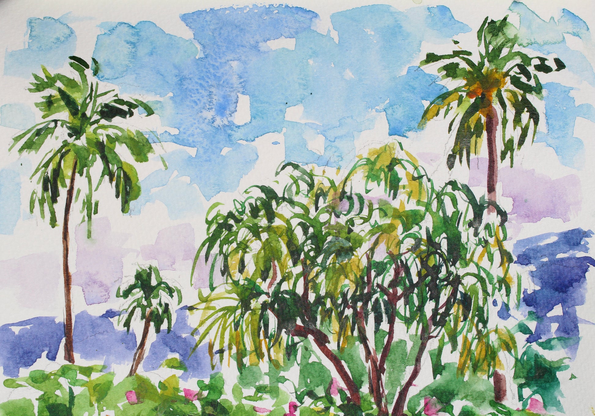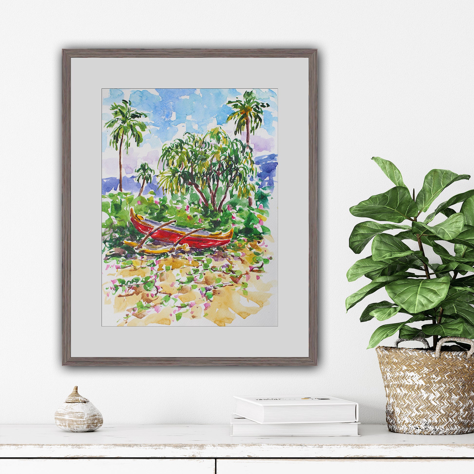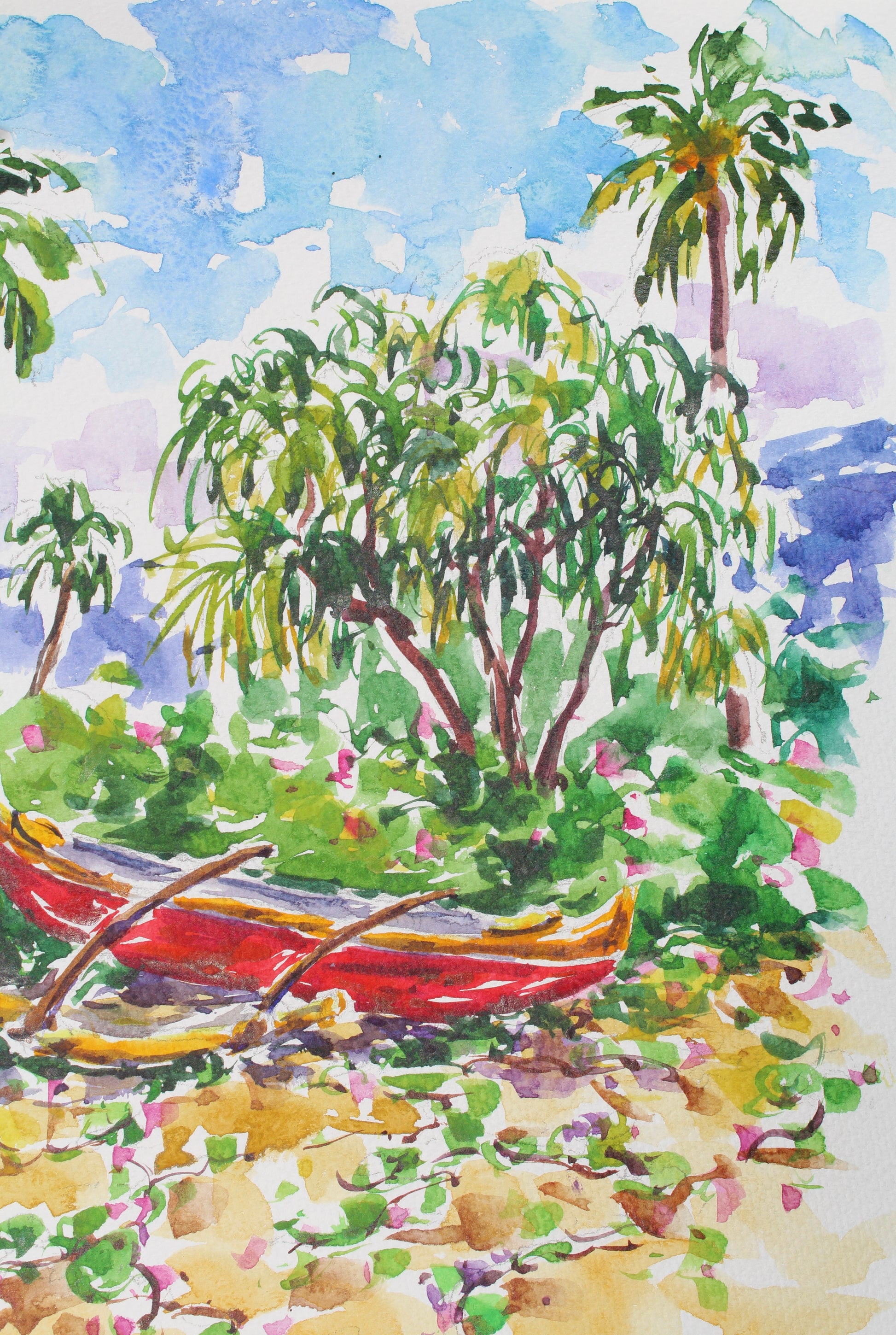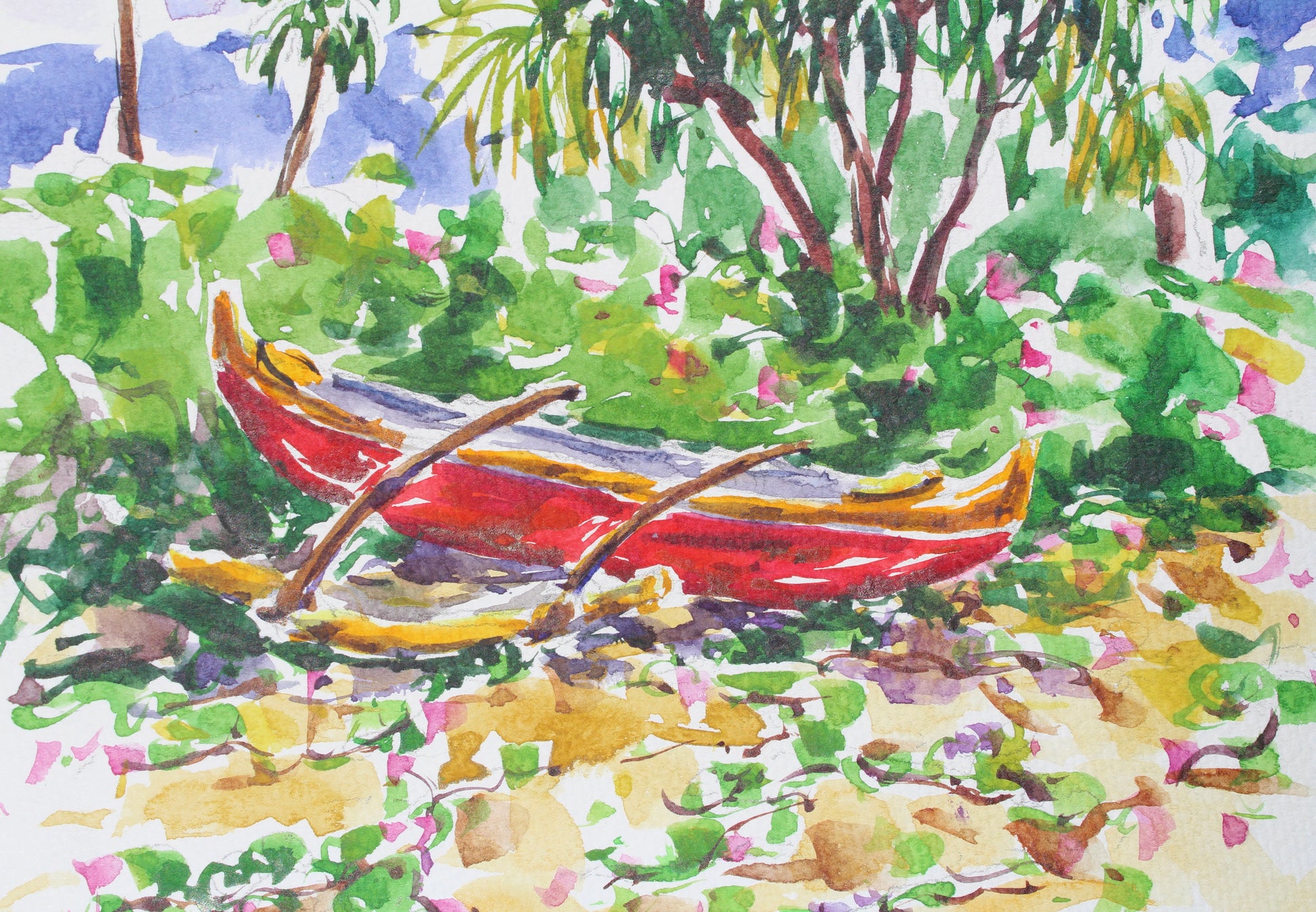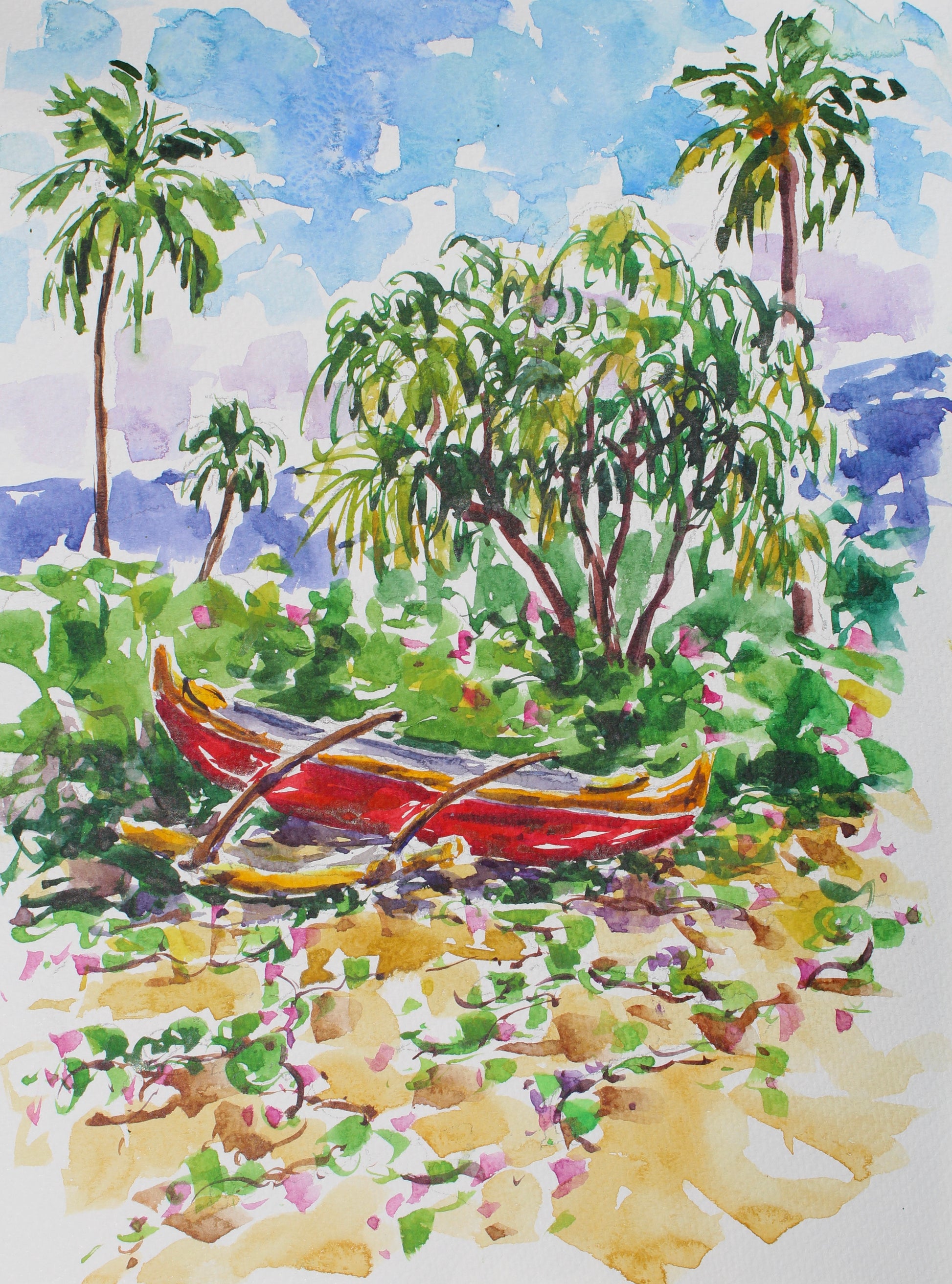 An original 11.5" x 8.25" watercolor and ink painting of a Hawaiian Outrigger Canoe sitting in the sand on the beach at Hanalei Bay, Kauai. This beautiful red canoe is sitting in front of a Hawaiian Lauhala tree and some coconut trees. The leaves of the Lauhala trees are used for weaving. In the sand are naupaka vines with little purple flowers.