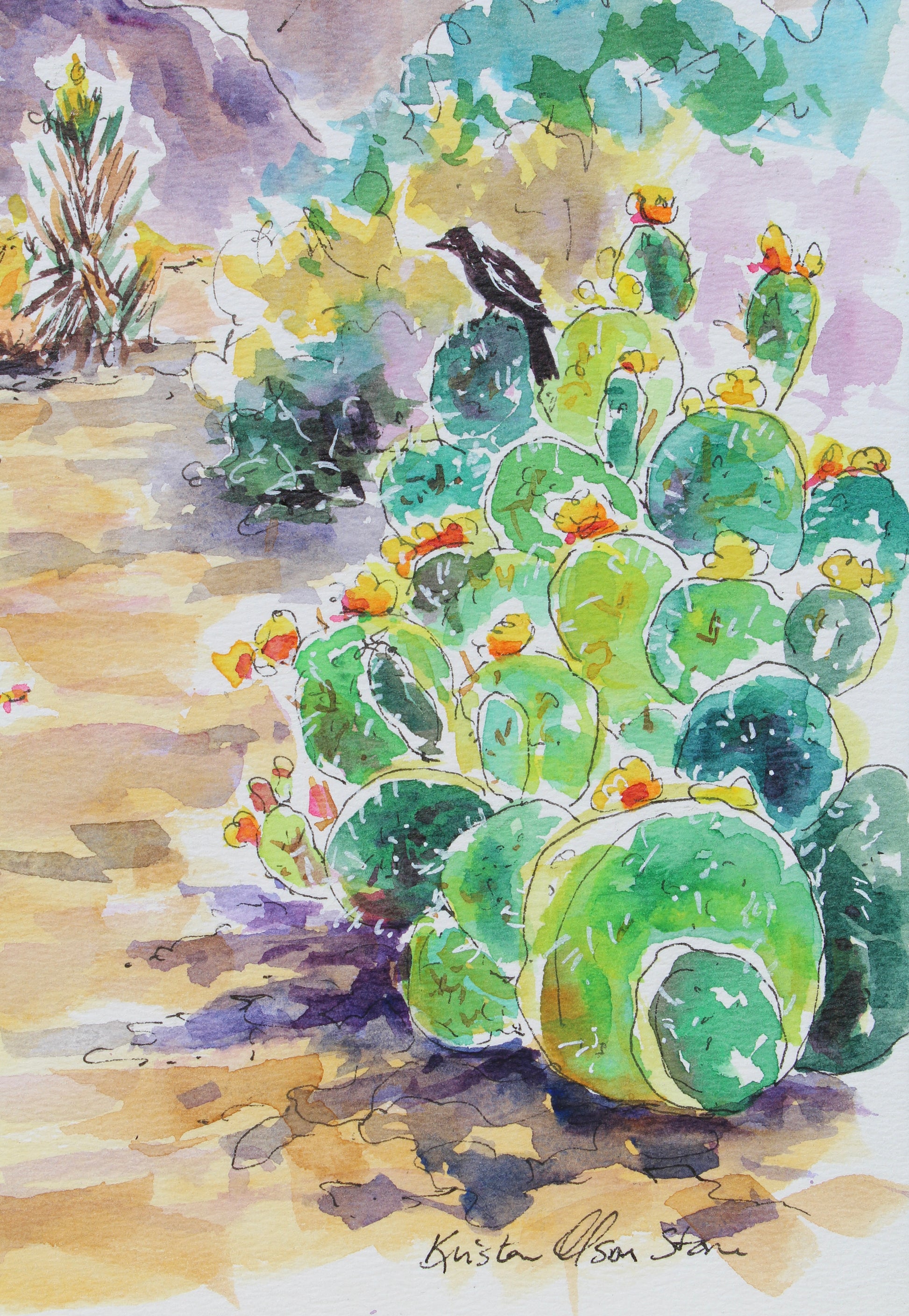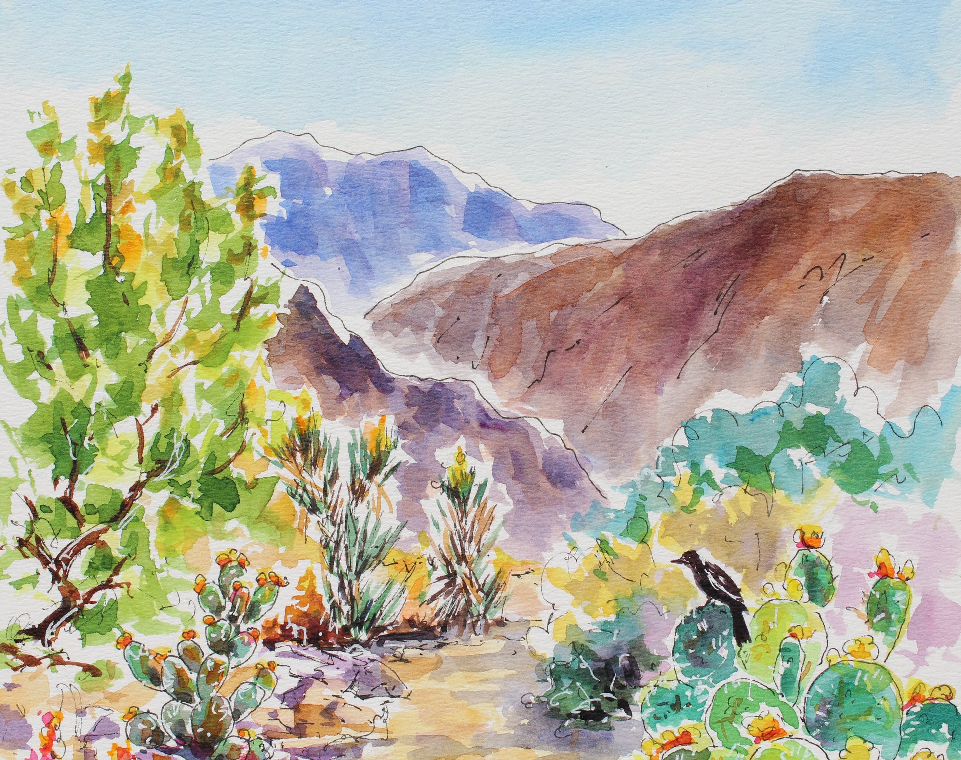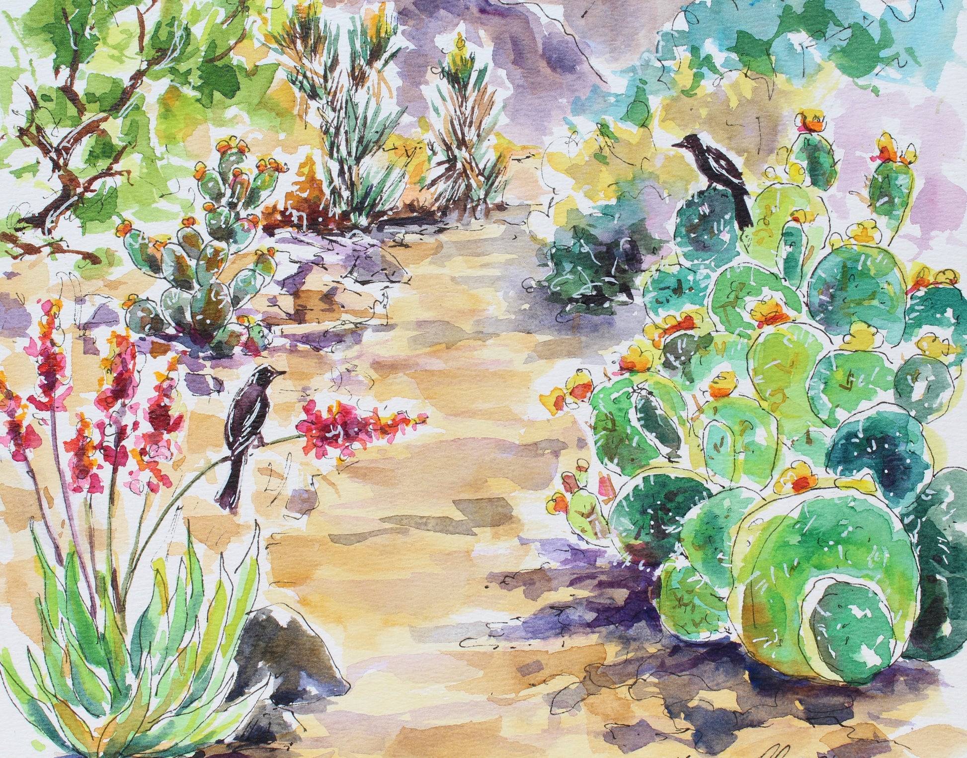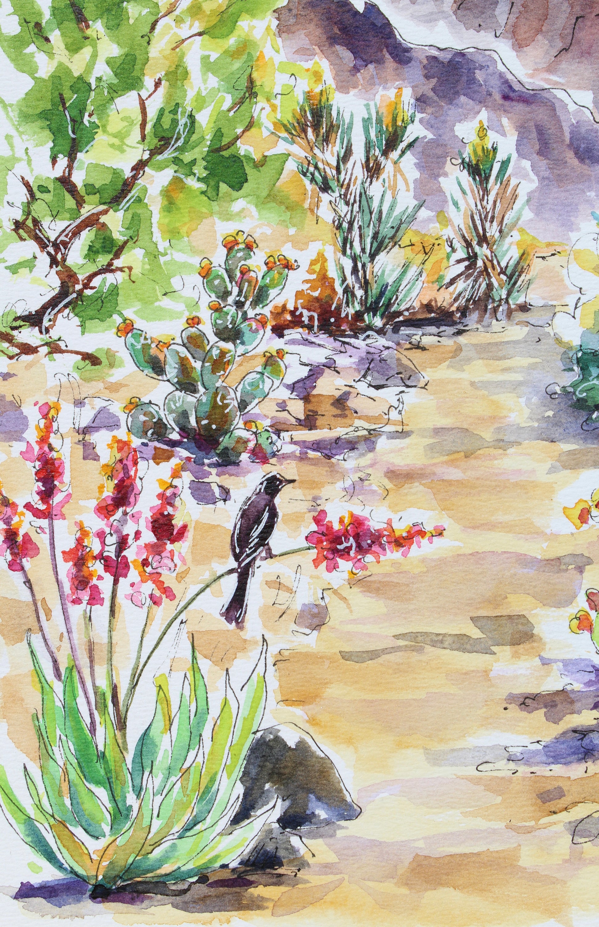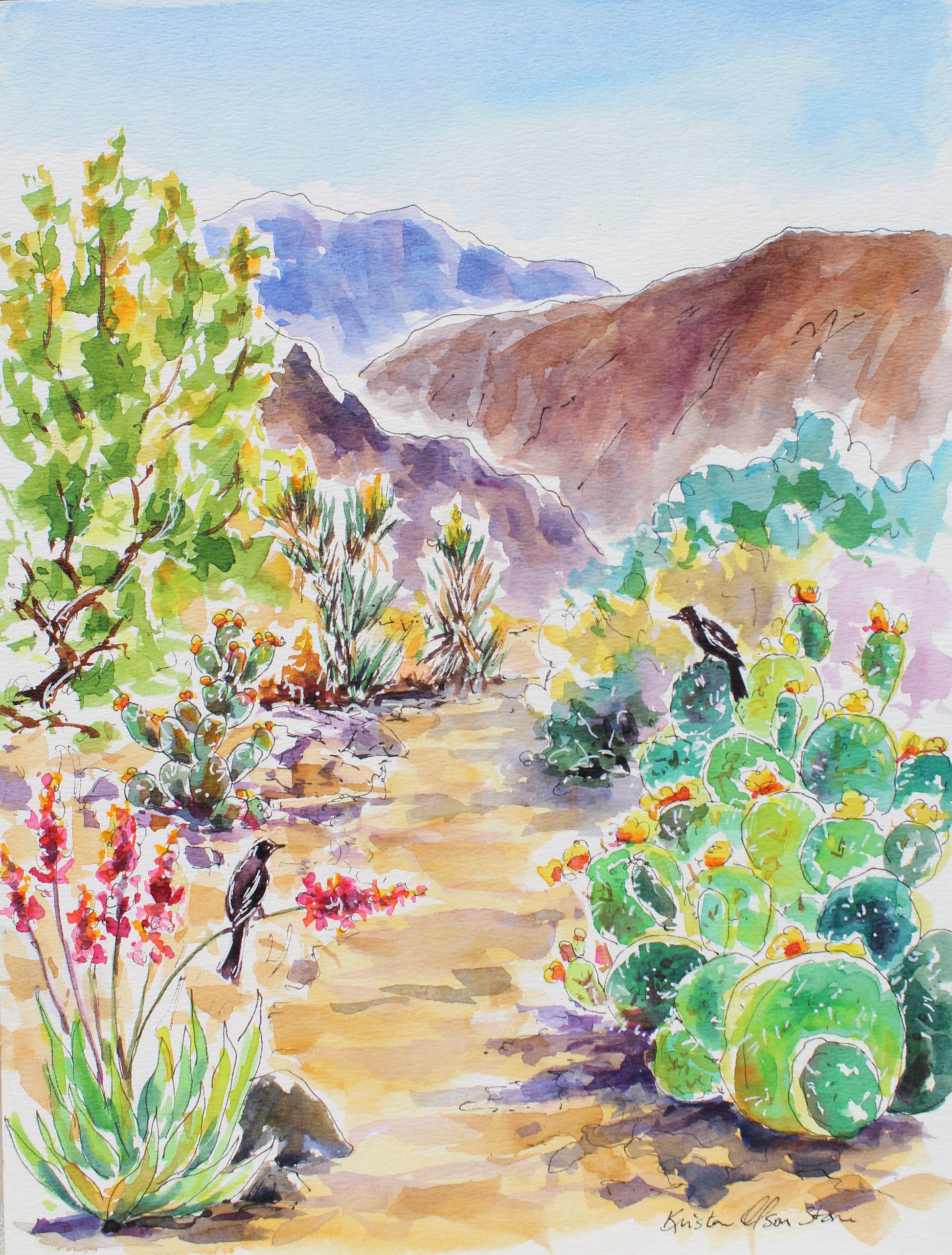 An original 12" x 9" or 23 x 30 cm, watercolor and ink painting of Palm Springs Desert scenery. I did this painting on location!