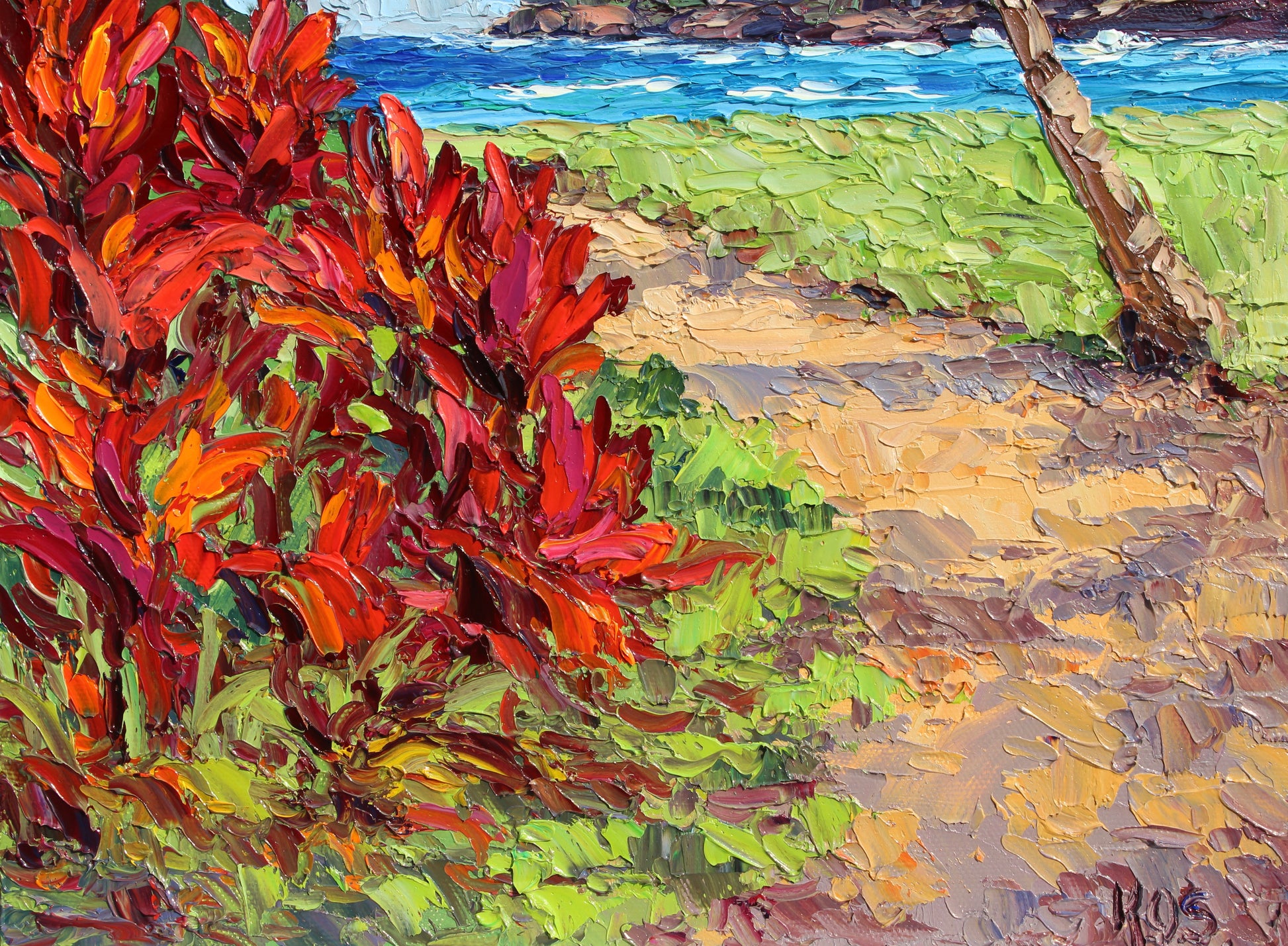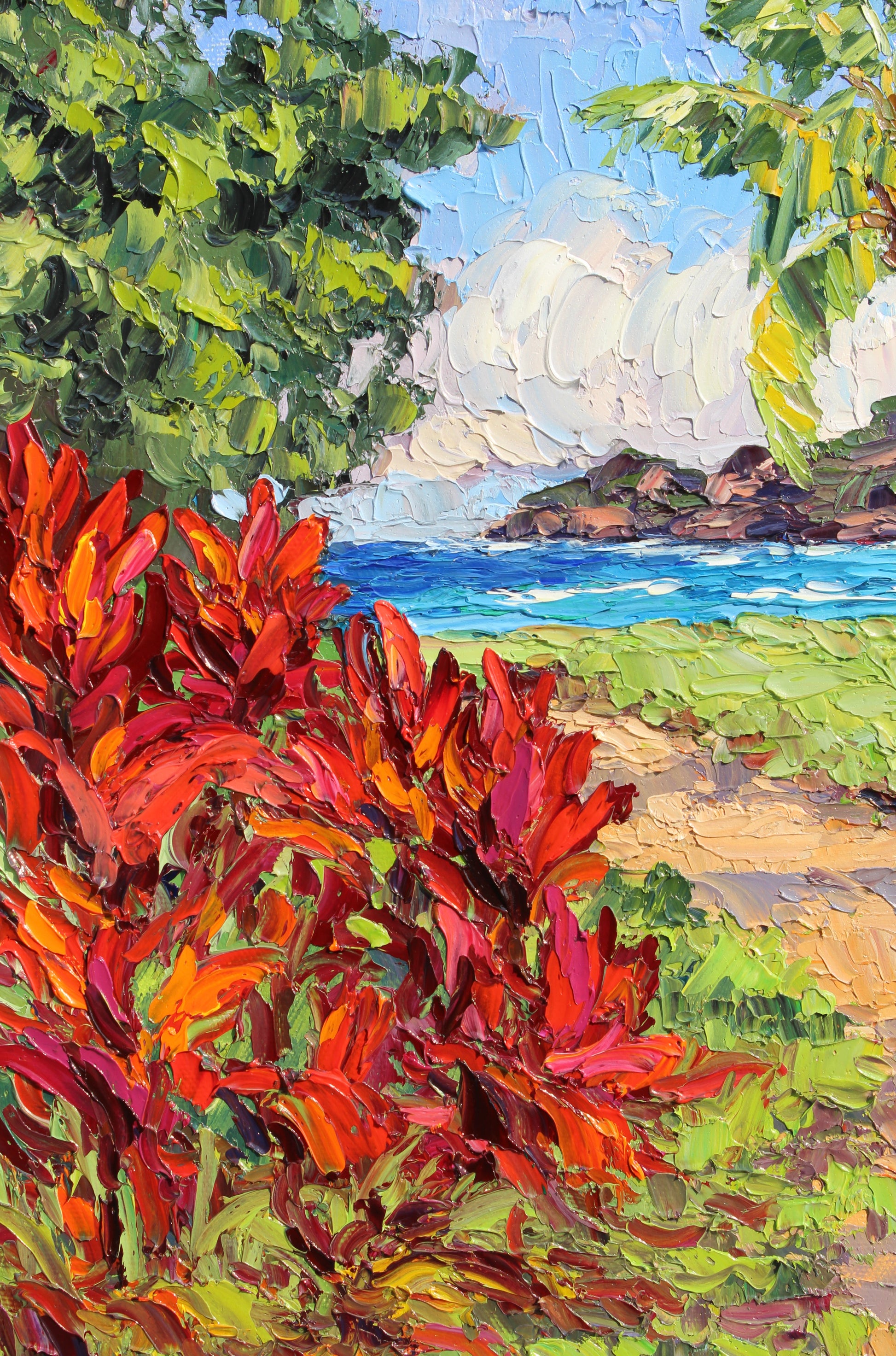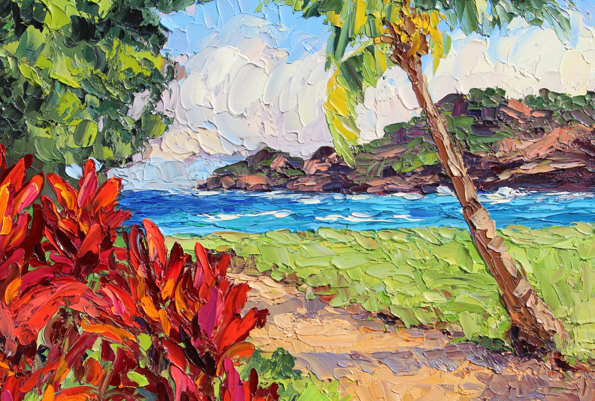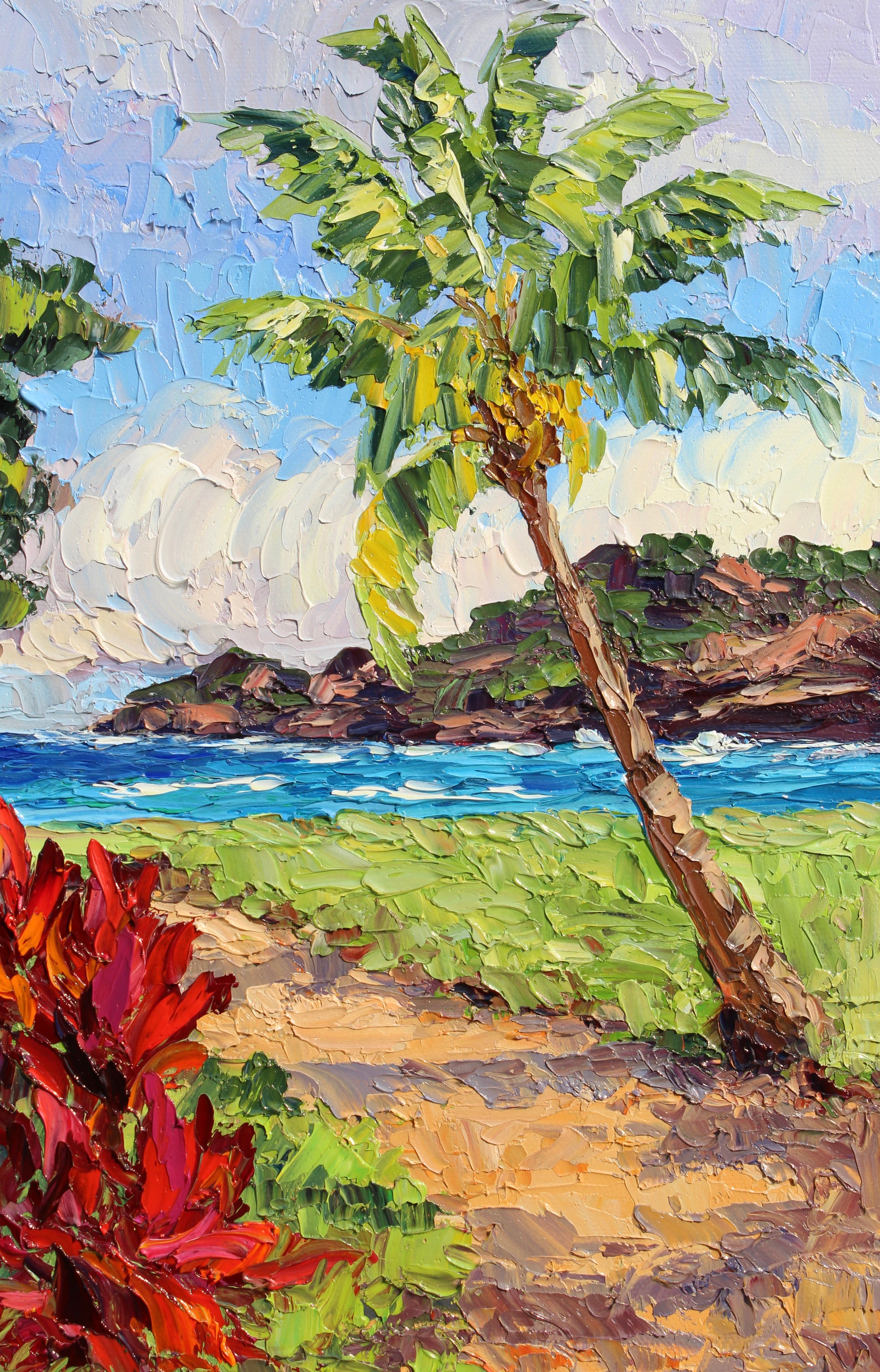 An original 14" x 11" or 35.56cm x 27.94cm, oil painting on canvas panel of beautiful Nawiliwili Harbor on the island of Kauai, Hawaii! This is the view from The Marriot Lagoon Resort. Red ti plants and a leaning coconut palm tree frame the ocean and the distant sea cliff.