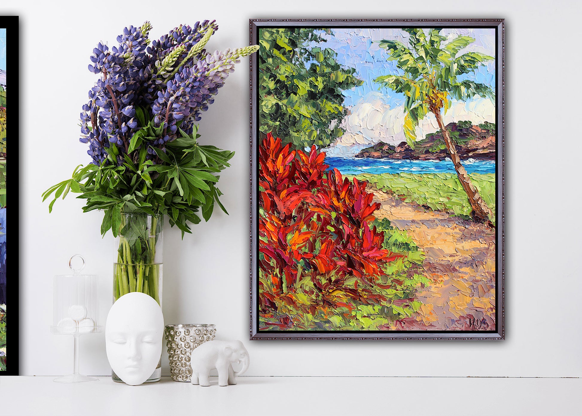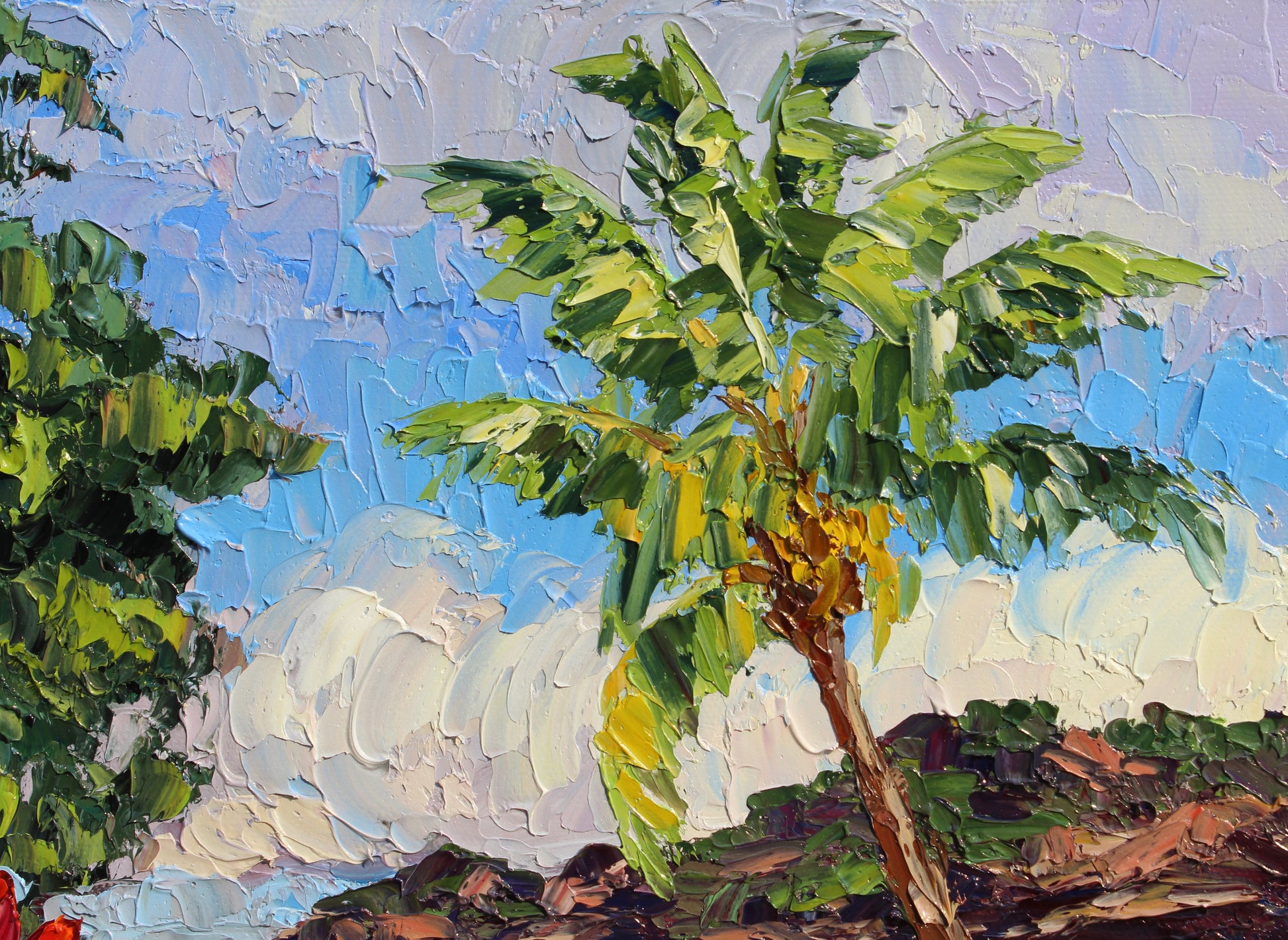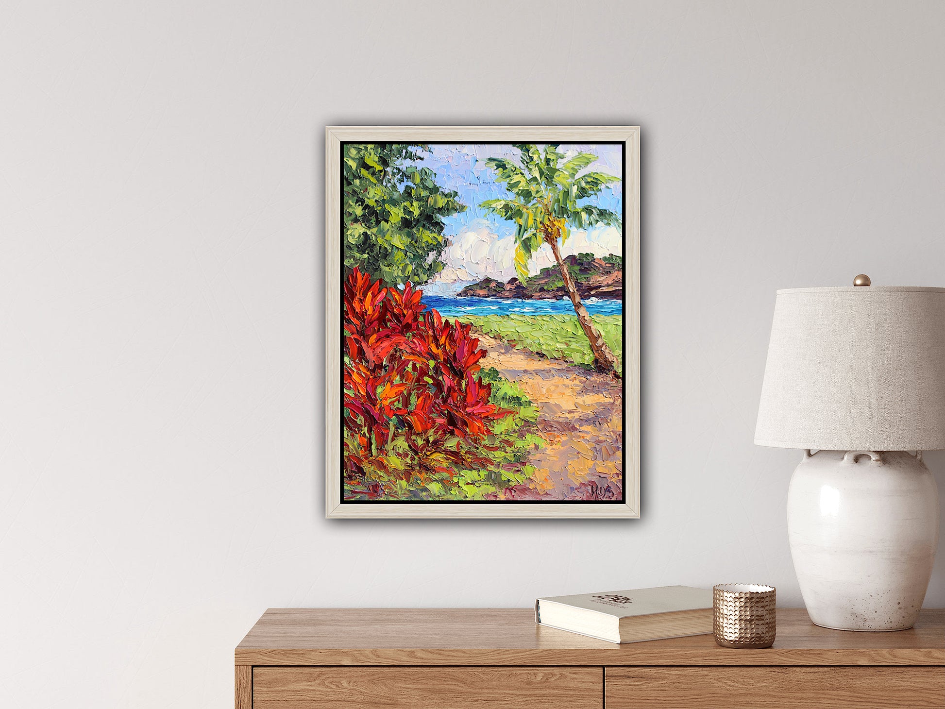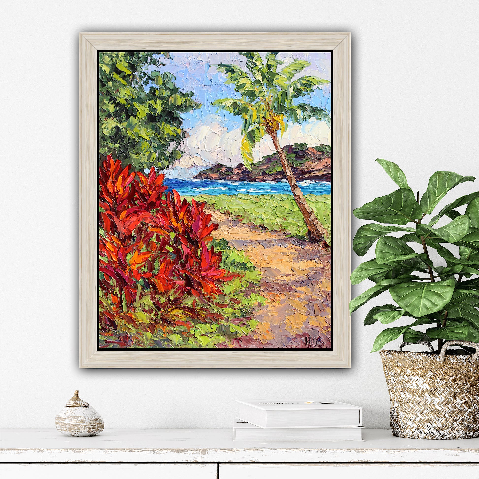 An original 14" x 11" or 35.56cm x 27.94cm, oil painting on canvas panel of beautiful Nawiliwili Harbor on the island of Kauai, Hawaii! This is the view from The Marriot Lagoon Resort. Red ti plants and a leaning coconut palm tree frame the ocean and the distant sea cliff.