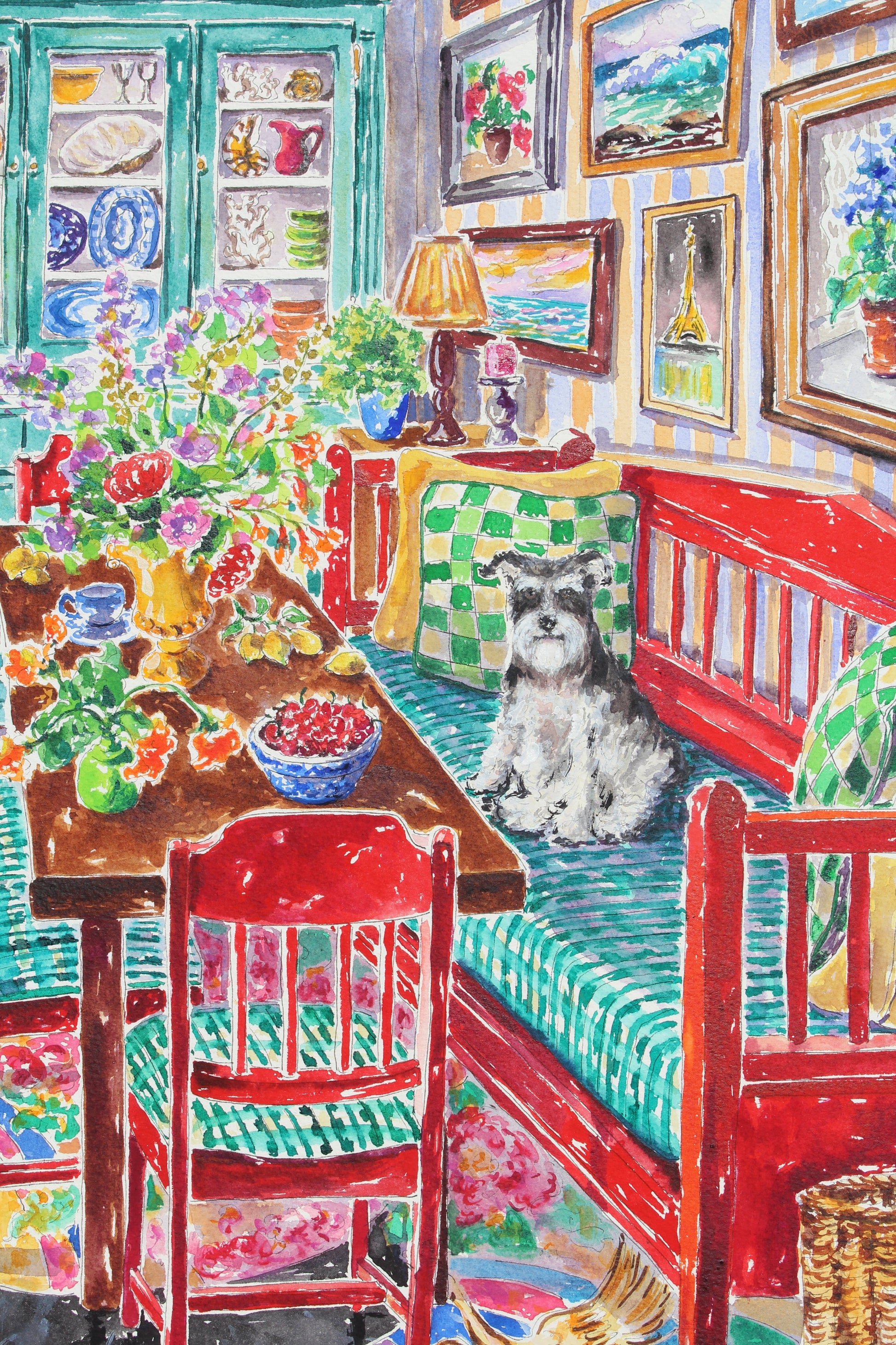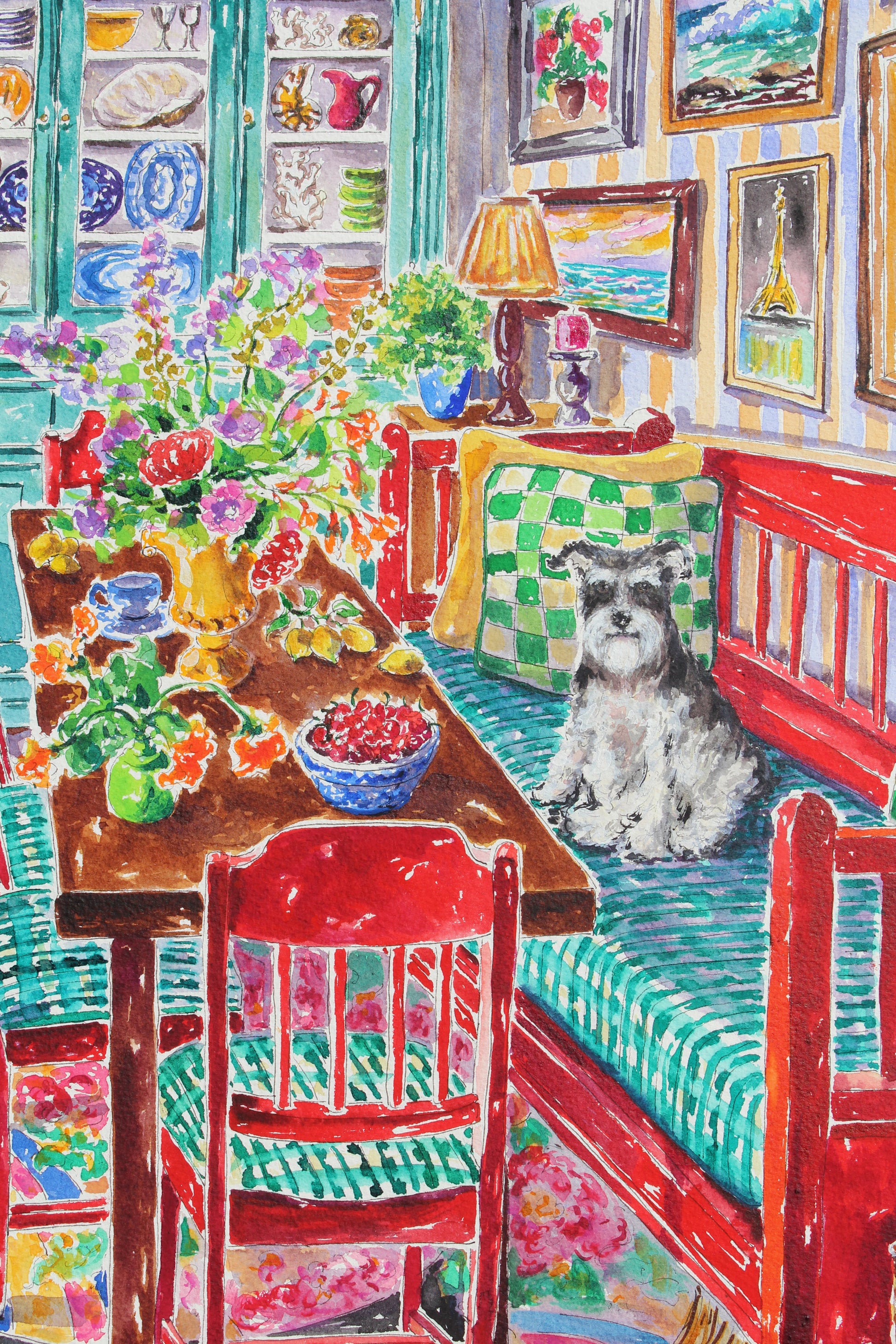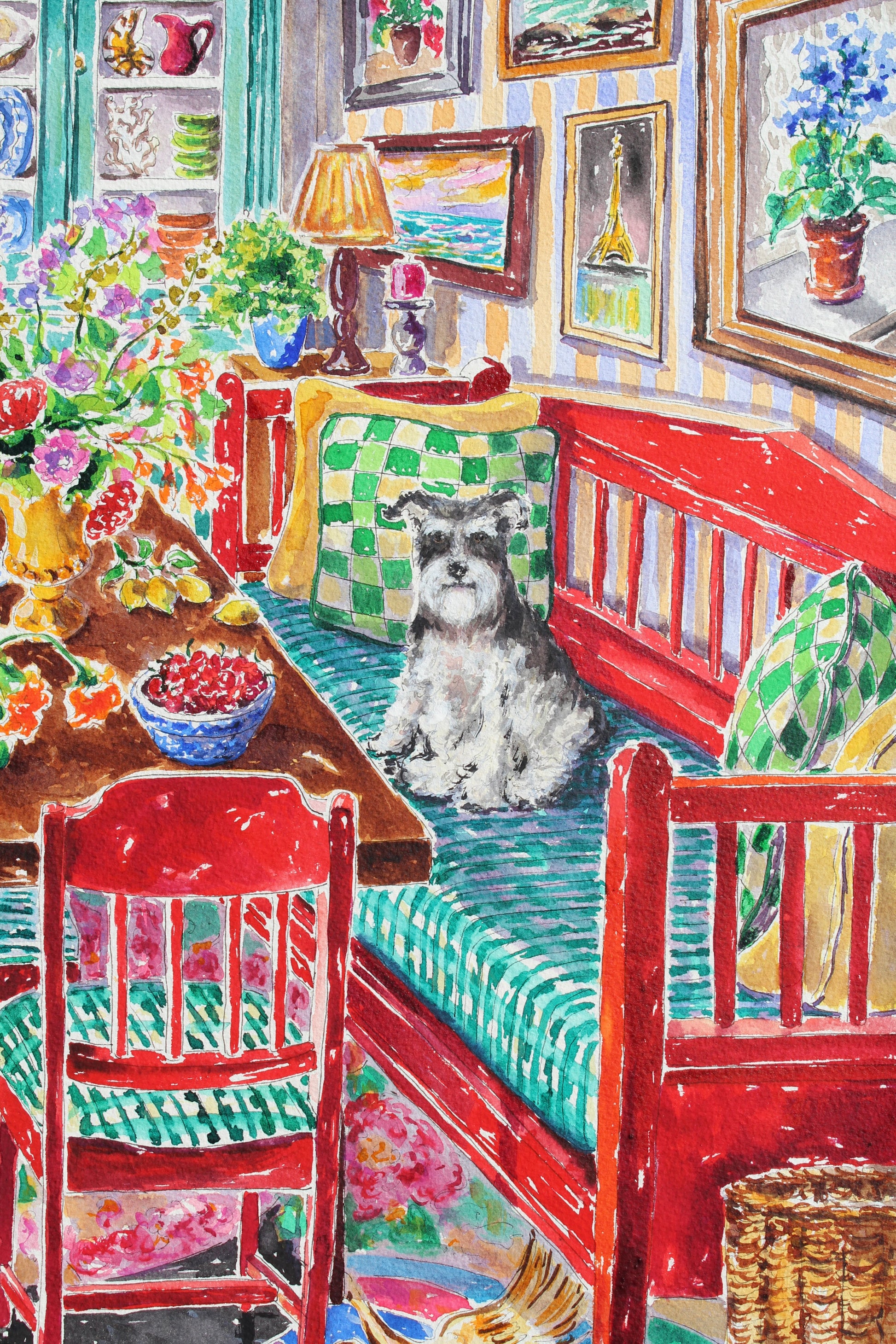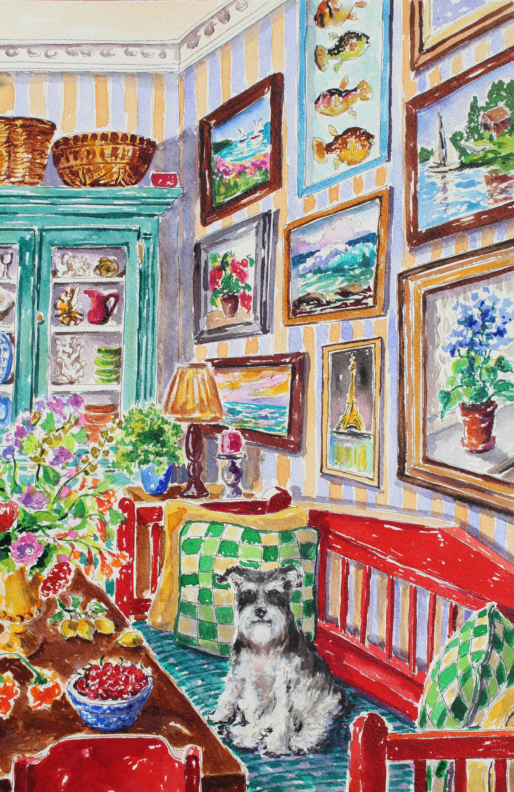 This is an original watercolor painting depicting a lovely little Miniature Schnauzer who is waiting for a treat or perhaps a nice walk! Sitting in a delightfully decorated room amongst coastal-themed treasures, this cherished little dog is very much at home.