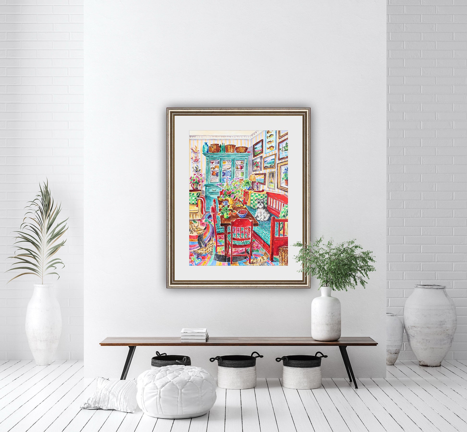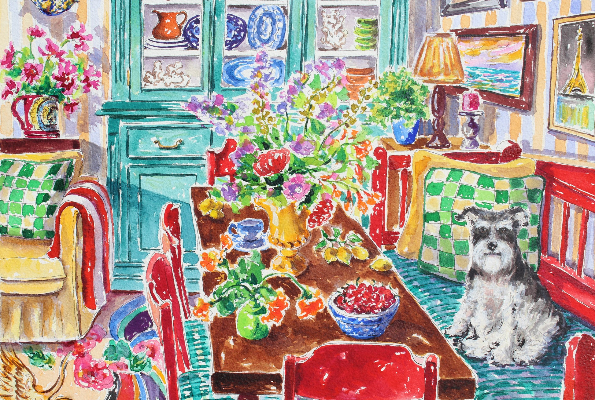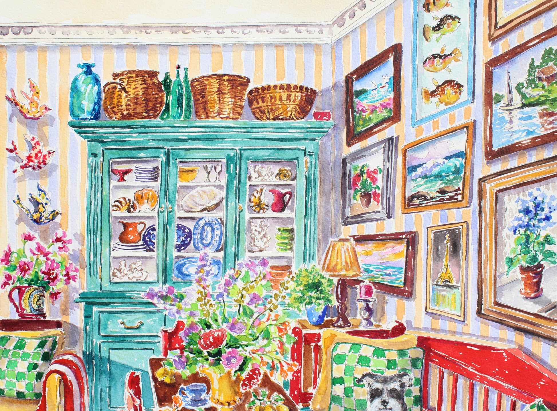 This is an original watercolor painting depicting a lovely little Miniature Schnauzer who is waiting for a treat or perhaps a nice walk! Sitting in a delightfully decorated room amongst coastal-themed treasures, this cherished little dog is very much at home.