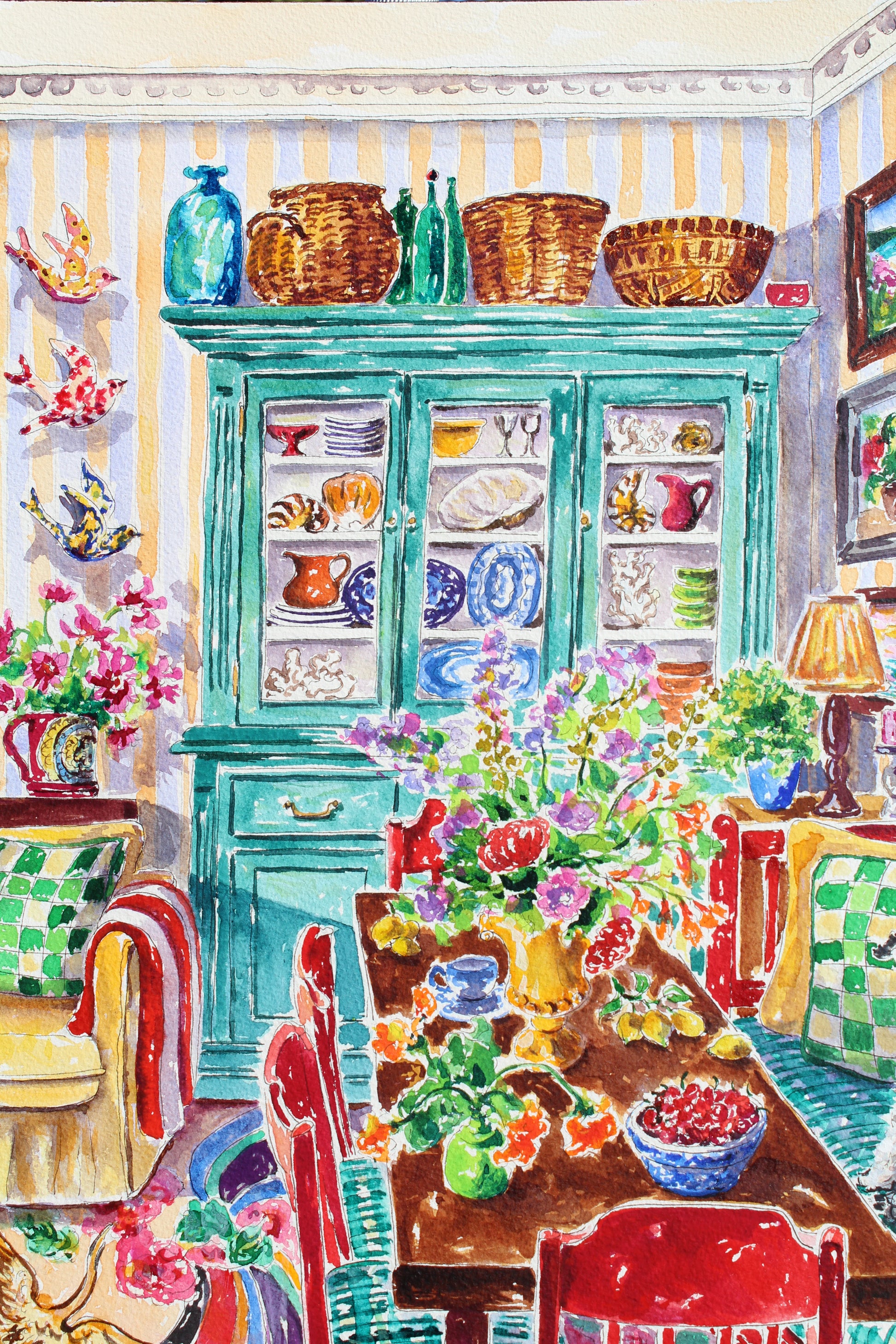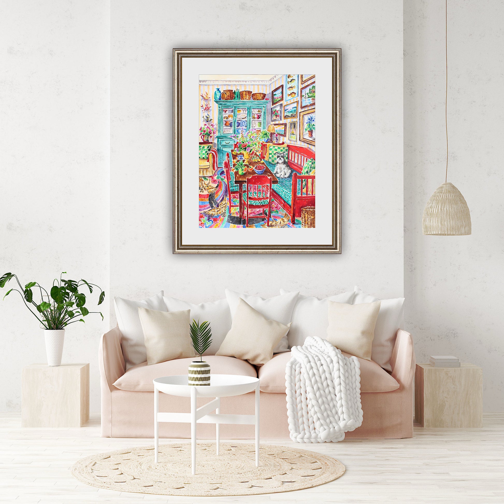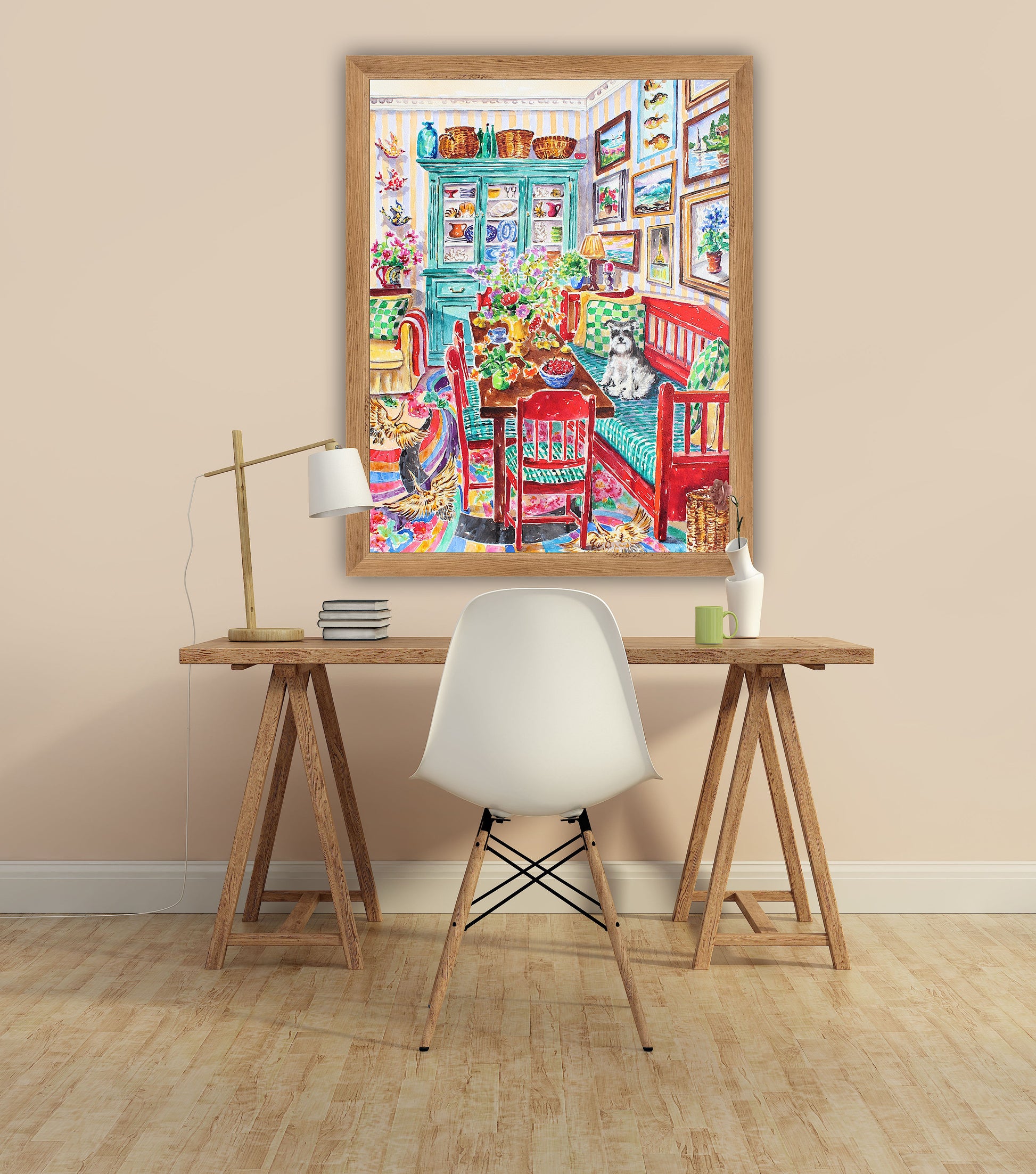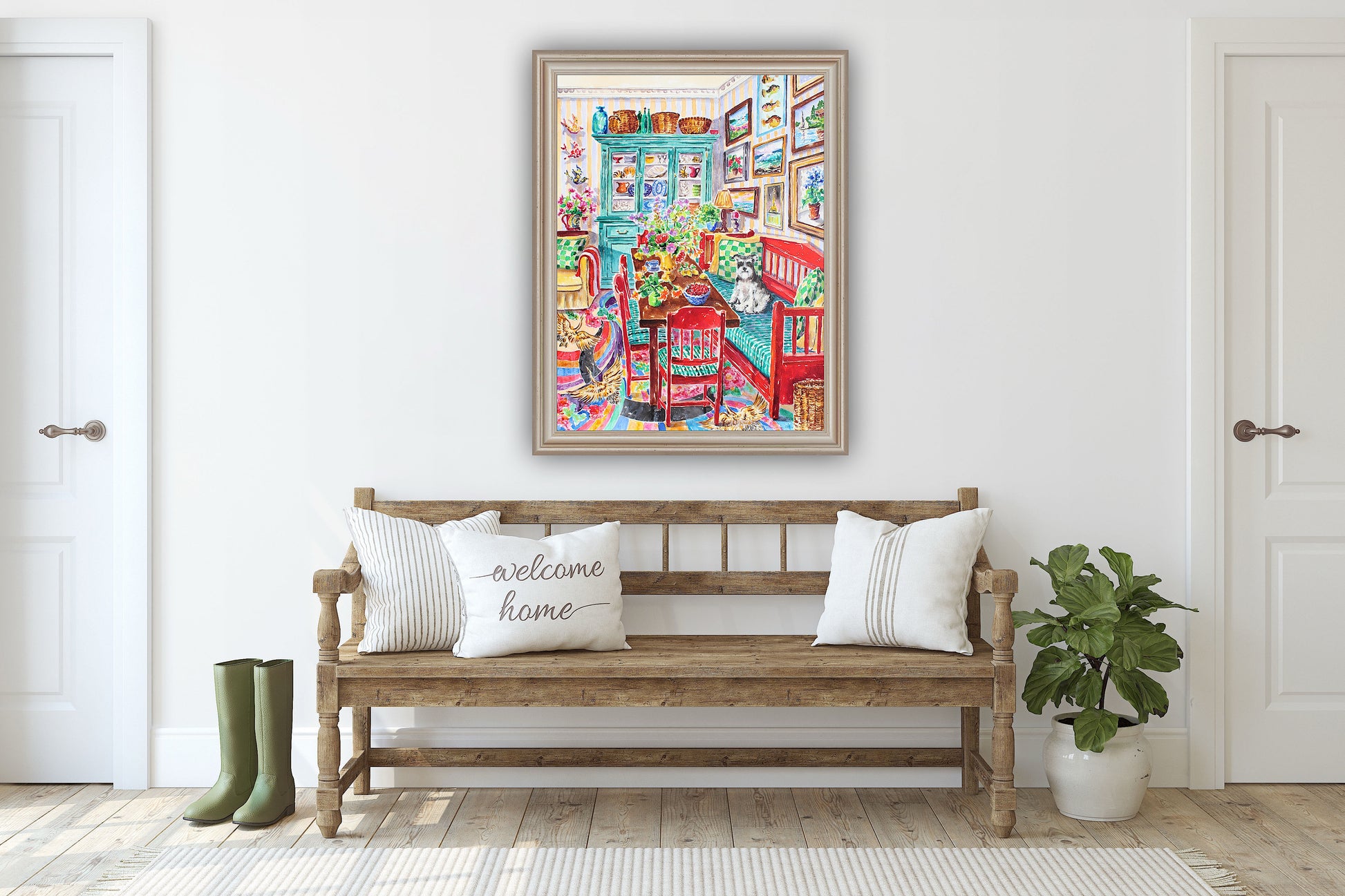 This is an original watercolor painting depicting a lovely little Miniature Schnauzer who is waiting for a treat or perhaps a nice walk! Sitting in a delightfully decorated room amongst coastal-themed treasures, this cherished little dog is very much at home.