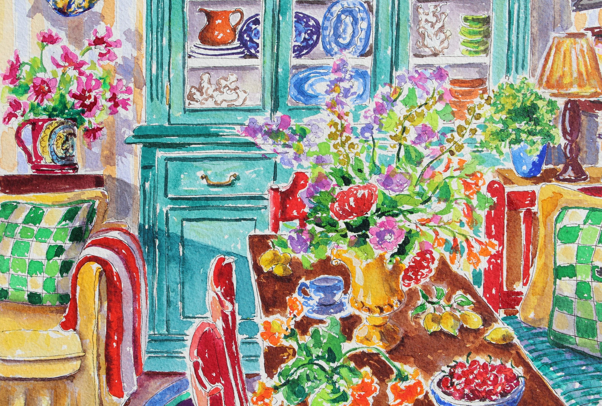 A bowl of ripe summer cherries, vases of flowers and some freshly picked lemons adorn the well-loved table.