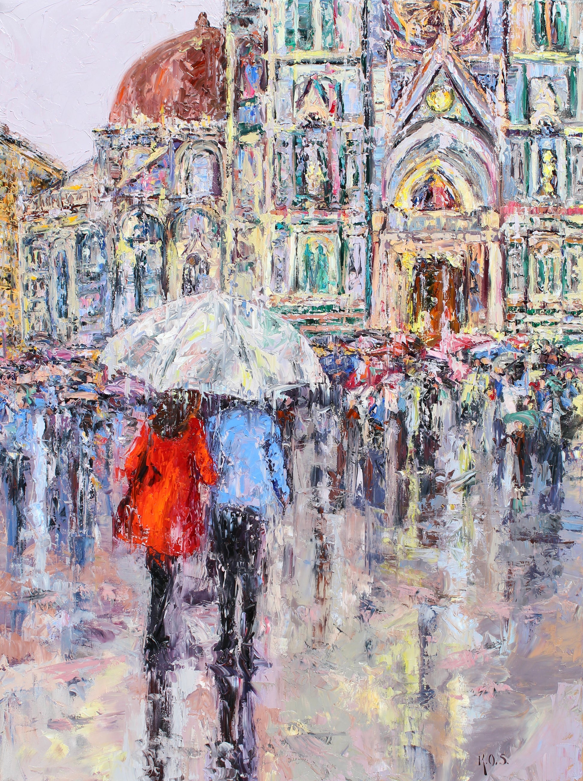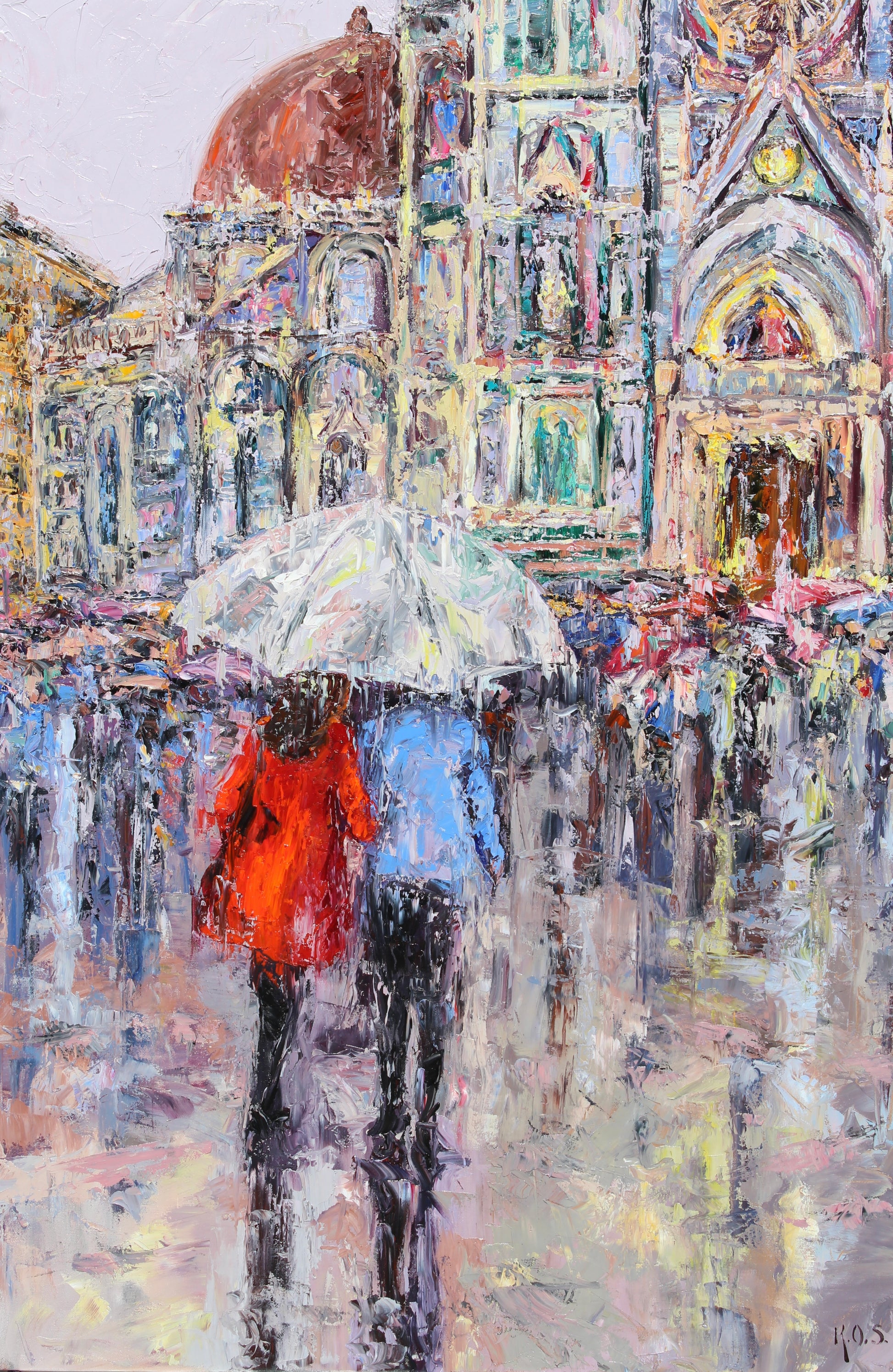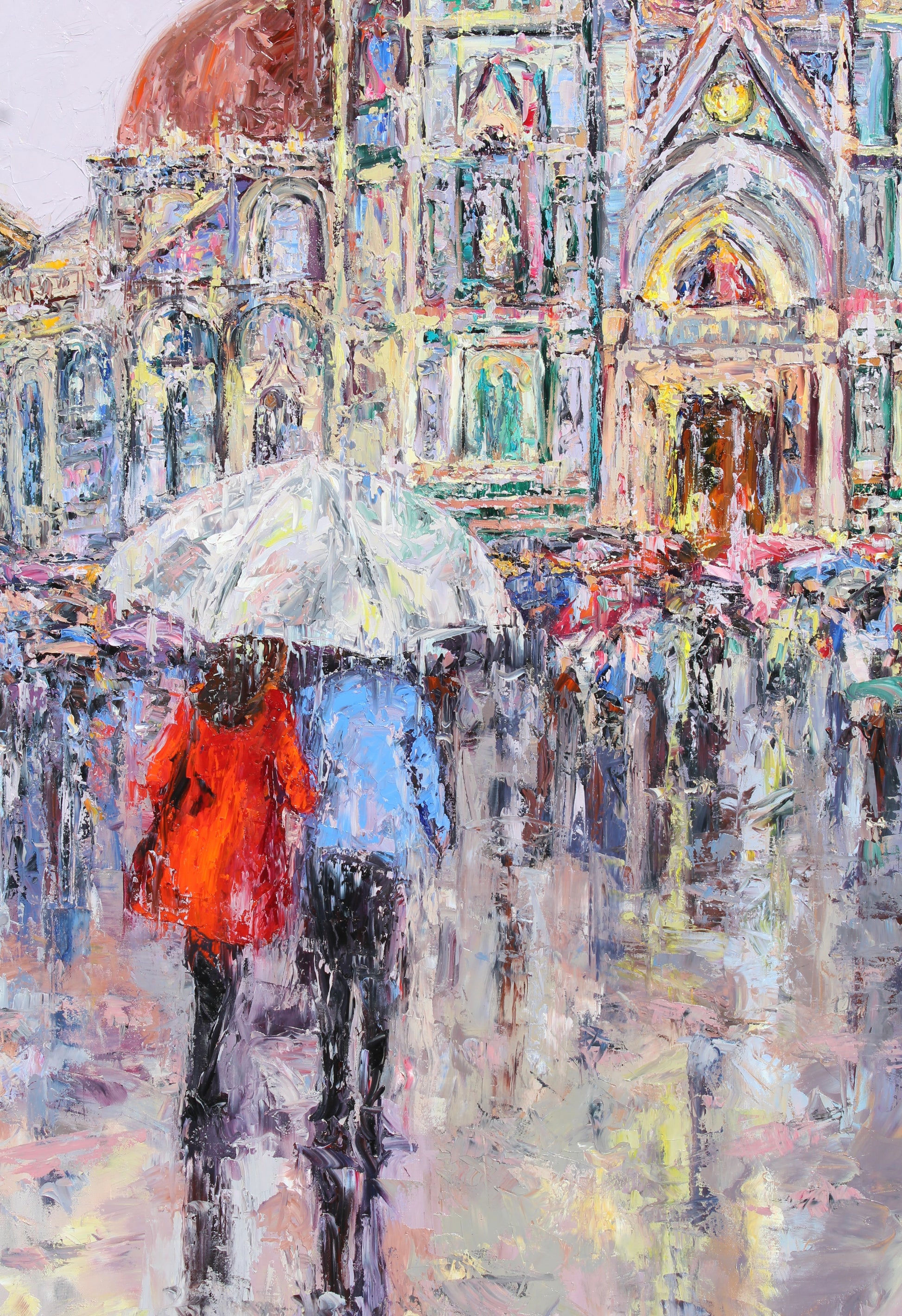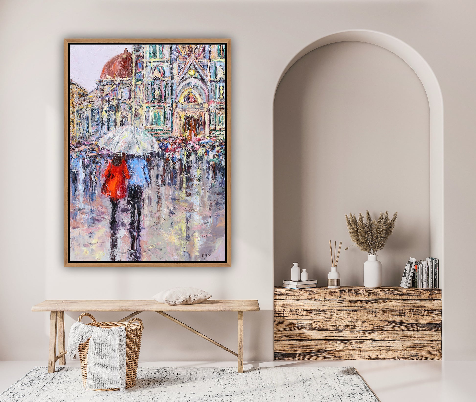 An original cityscape oil painting of a couple strolling through Florence with The Duomo in the background! The romantic scene depicts a rainy evening with reflections and people walking around and enjoying the historical architecture of this amazing city!