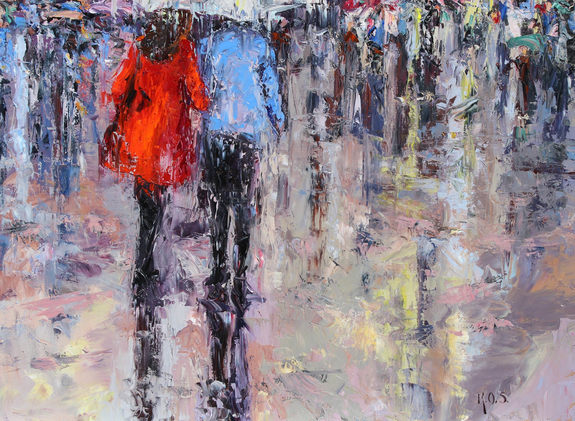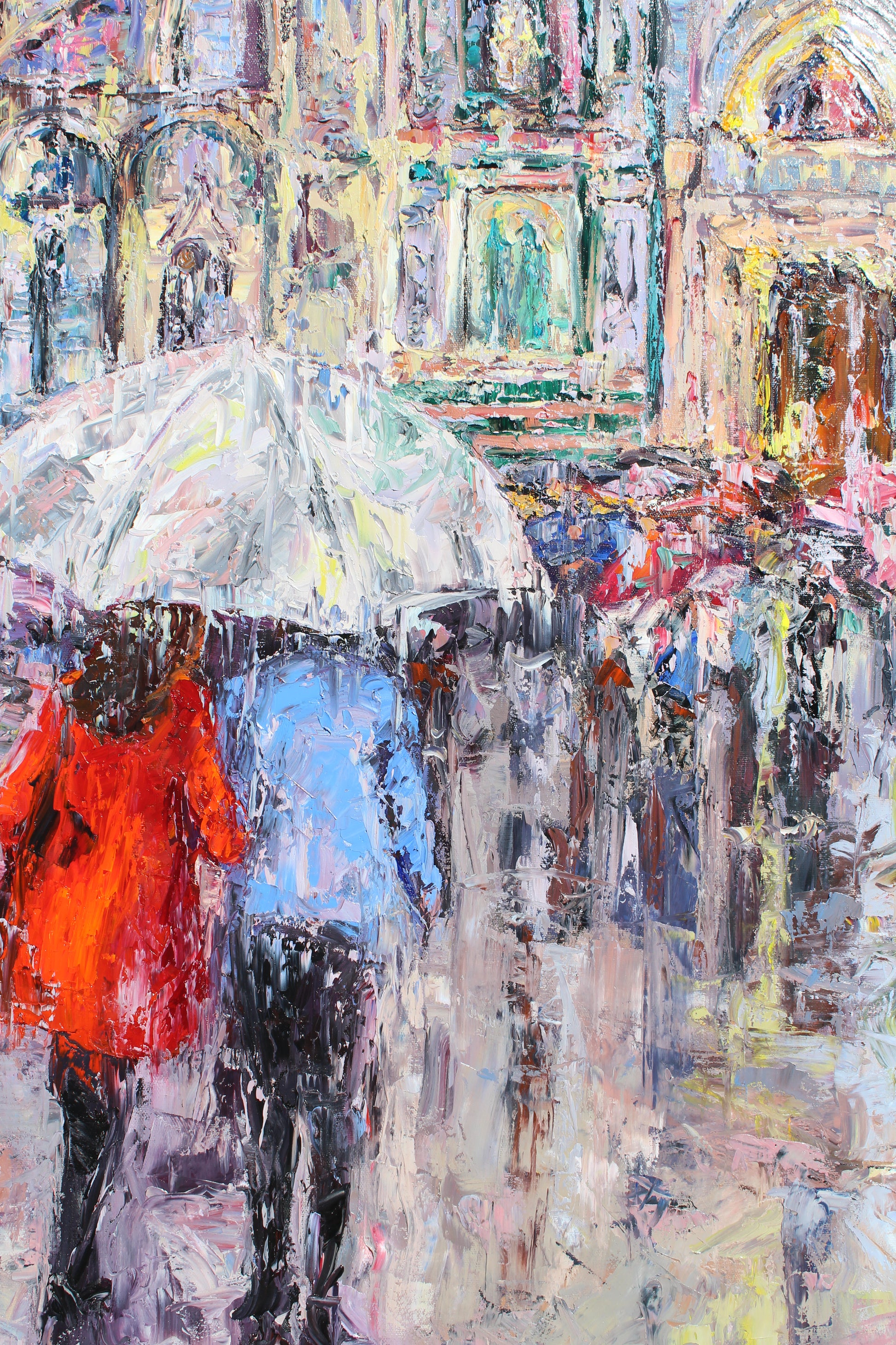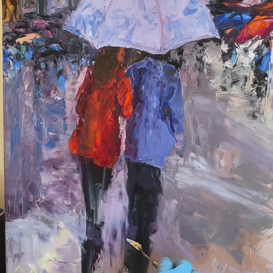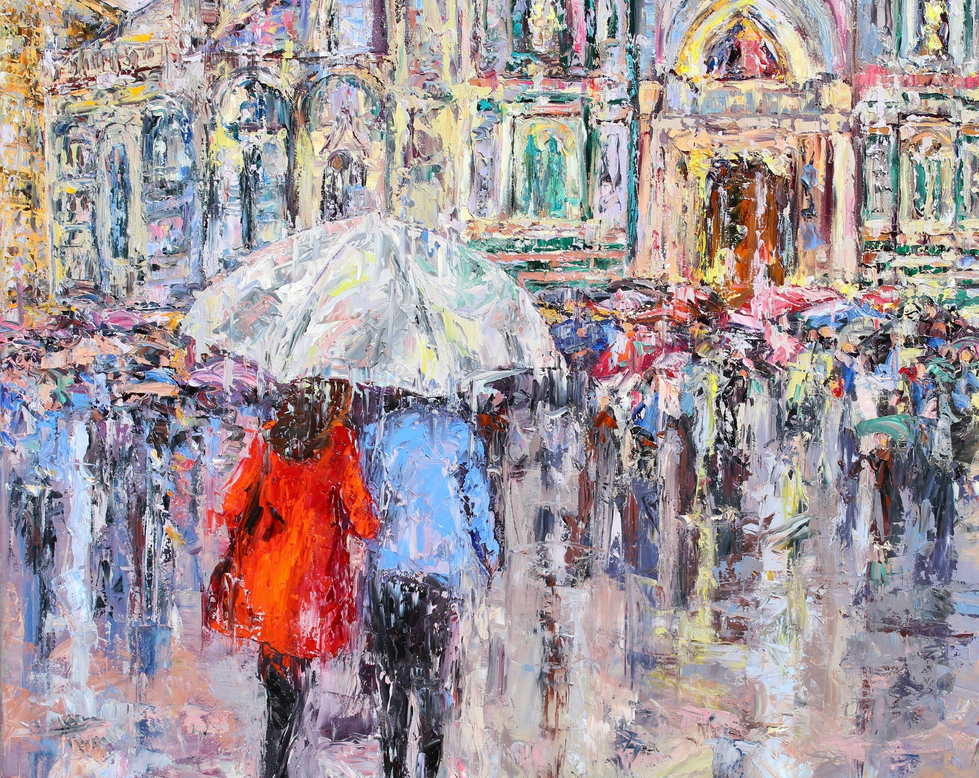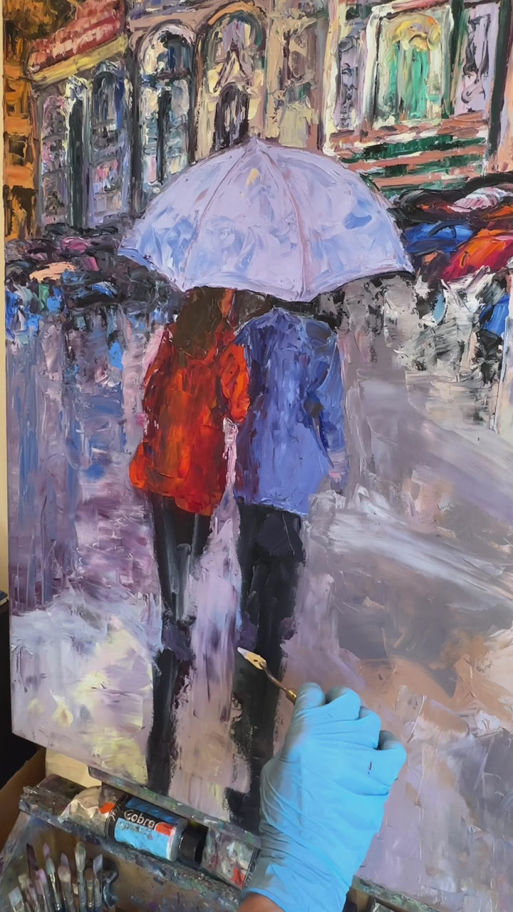An original cityscape oil painting of a couple strolling through Florence with The Duomo in the background! The romantic scene depicts a rainy evening with reflections and people walking around and enjoying the historical architecture of this amazing city!