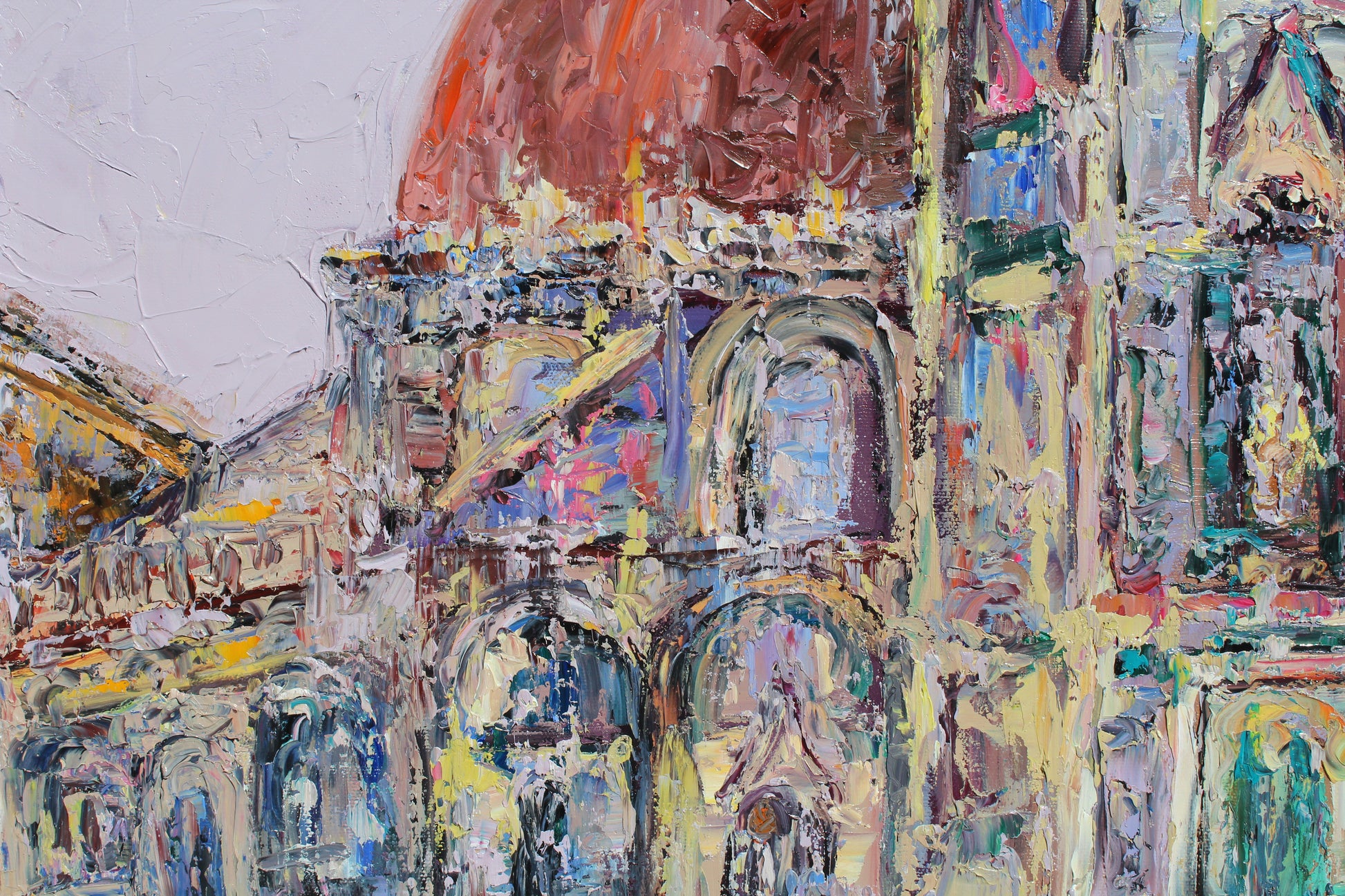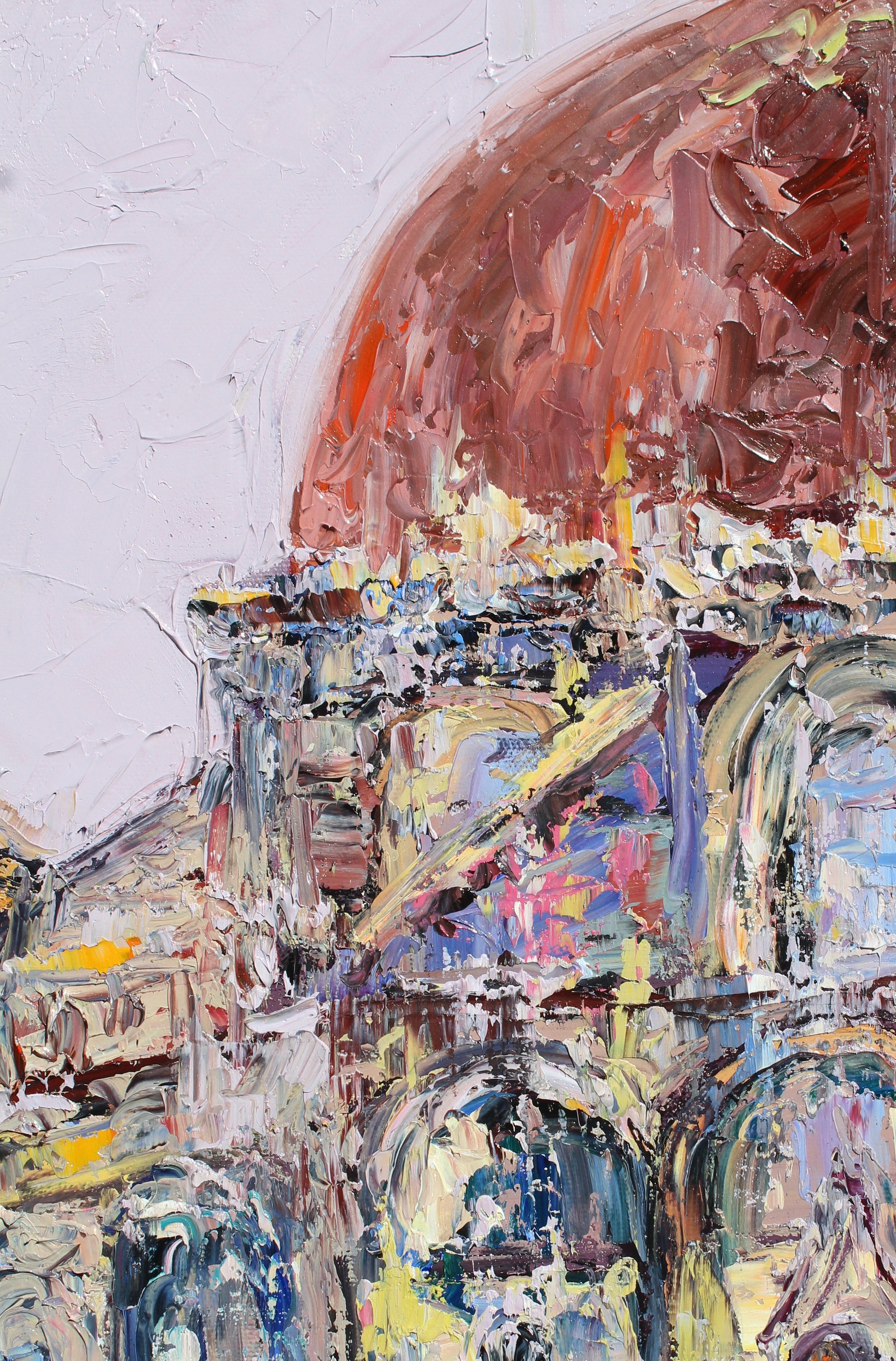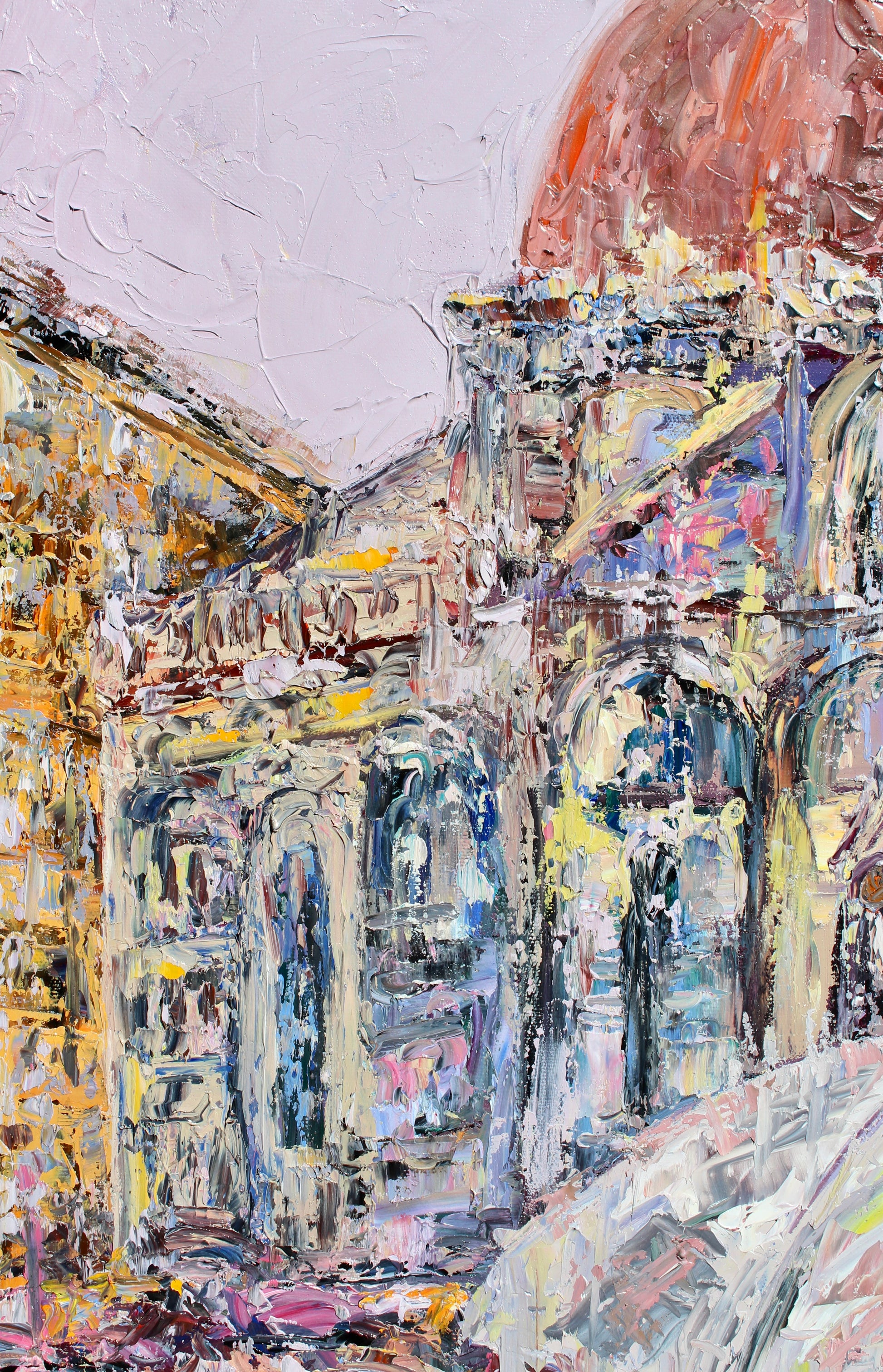 This impressionist style painting has a lot of thick strokes of colorful oil paint. It has a lively feel and is reminiscent of time spent in this beautiful city!