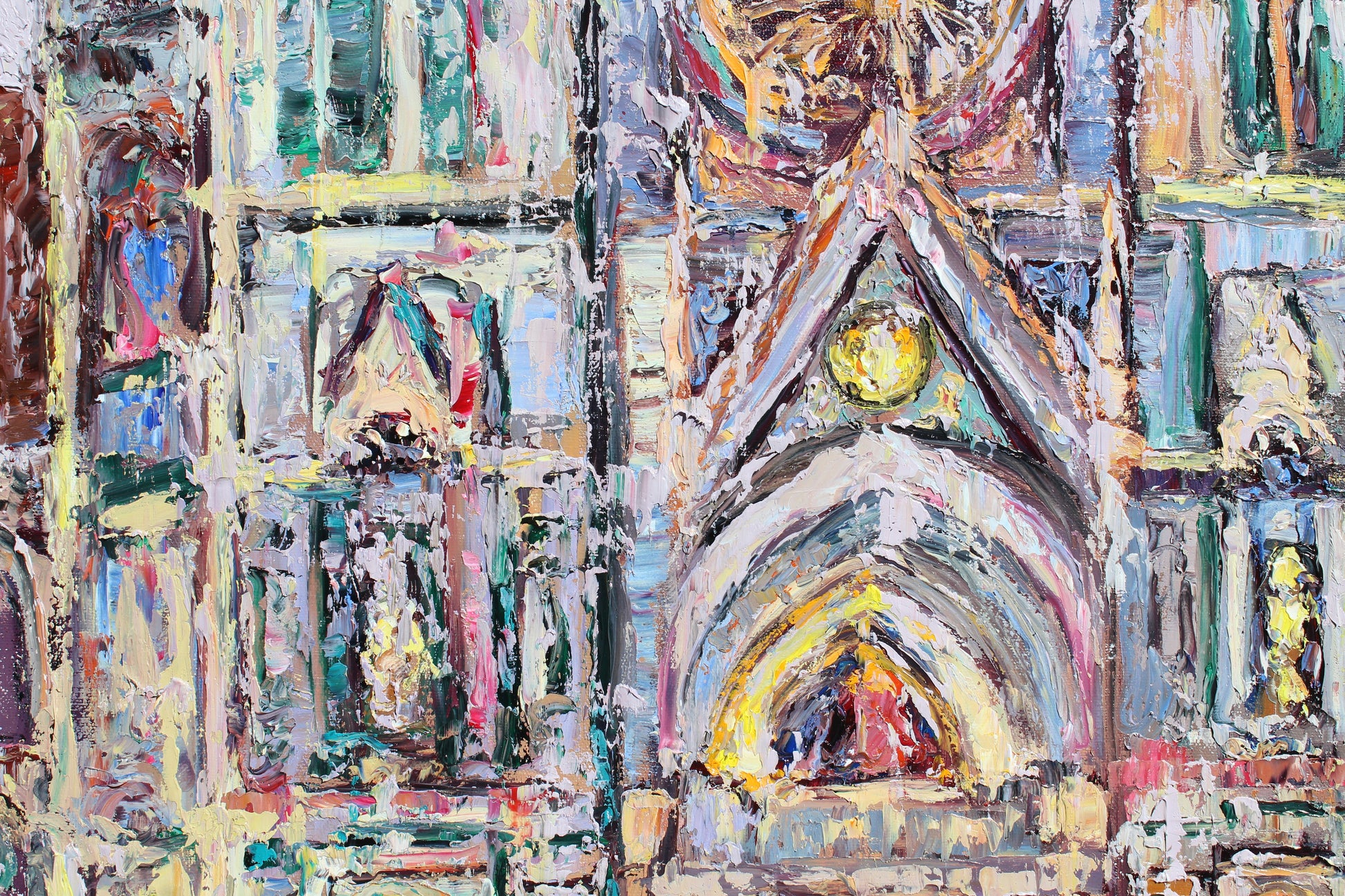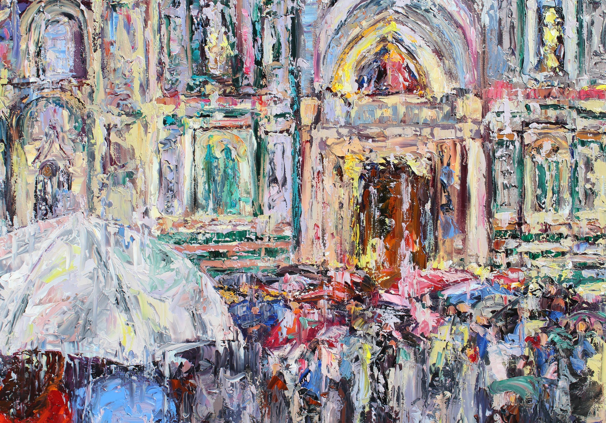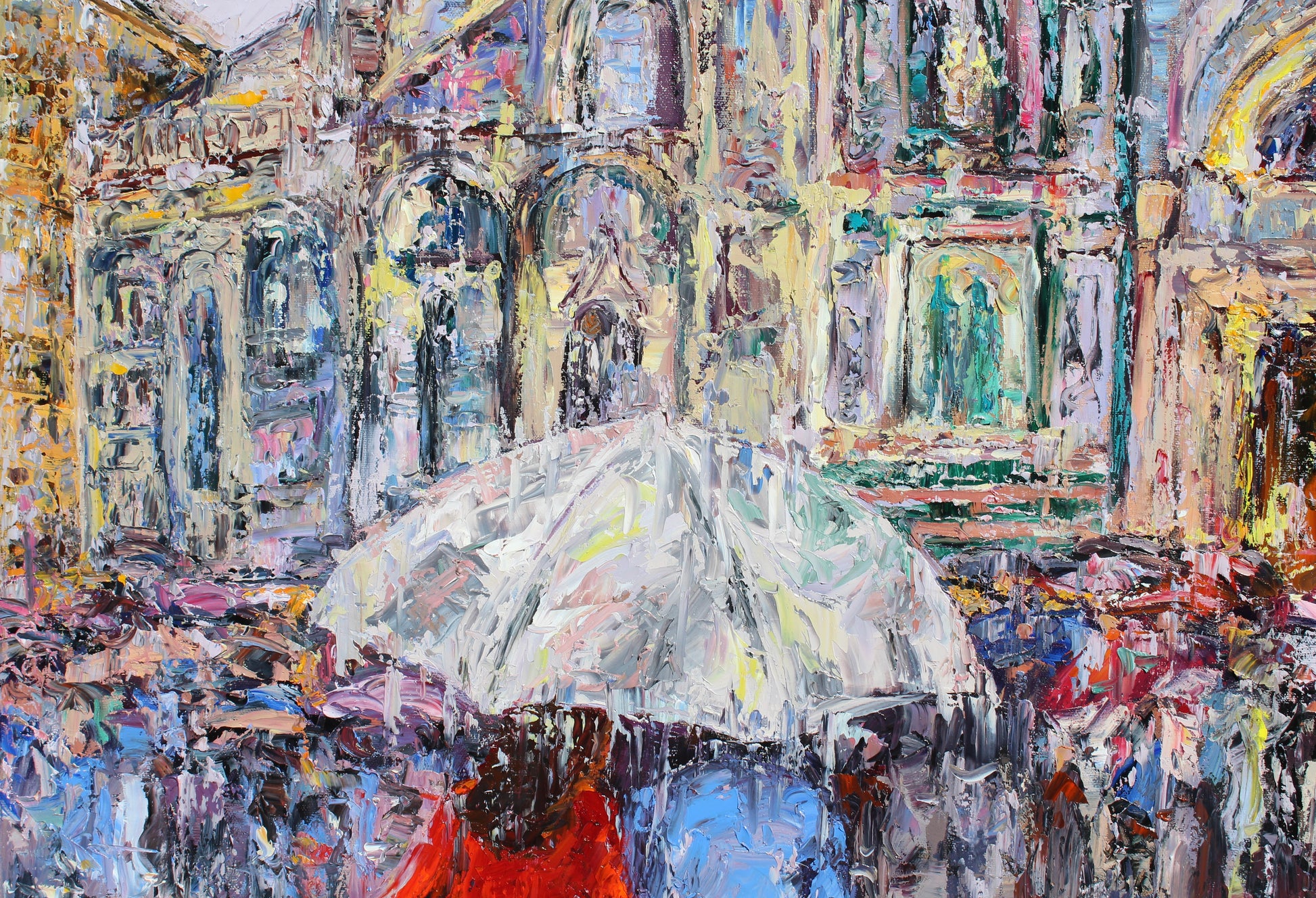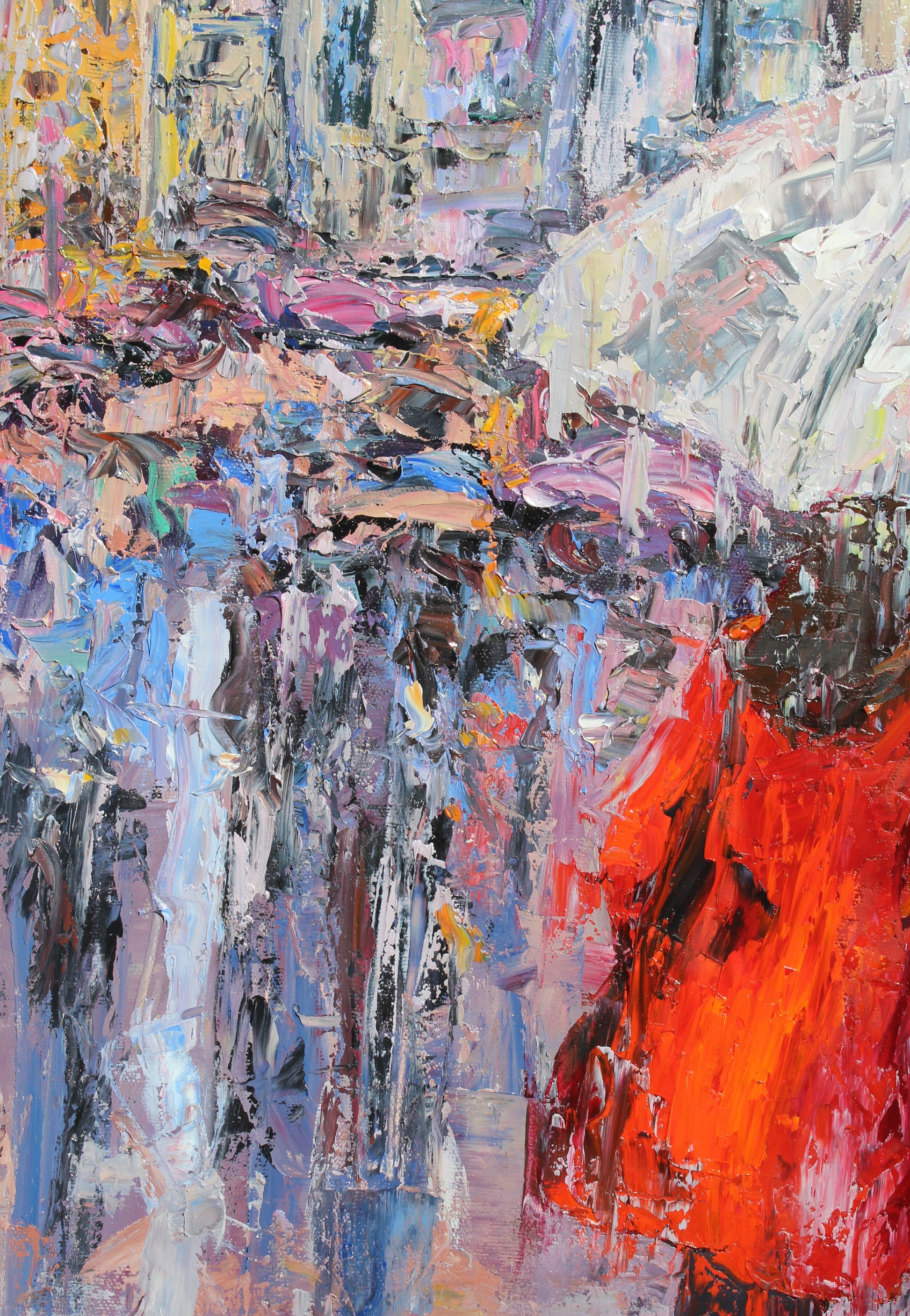 This impressionist style painting has a lot of thick strokes of colorful oil paint. It has a lively feel and is reminiscent of time spent in this beautiful city!