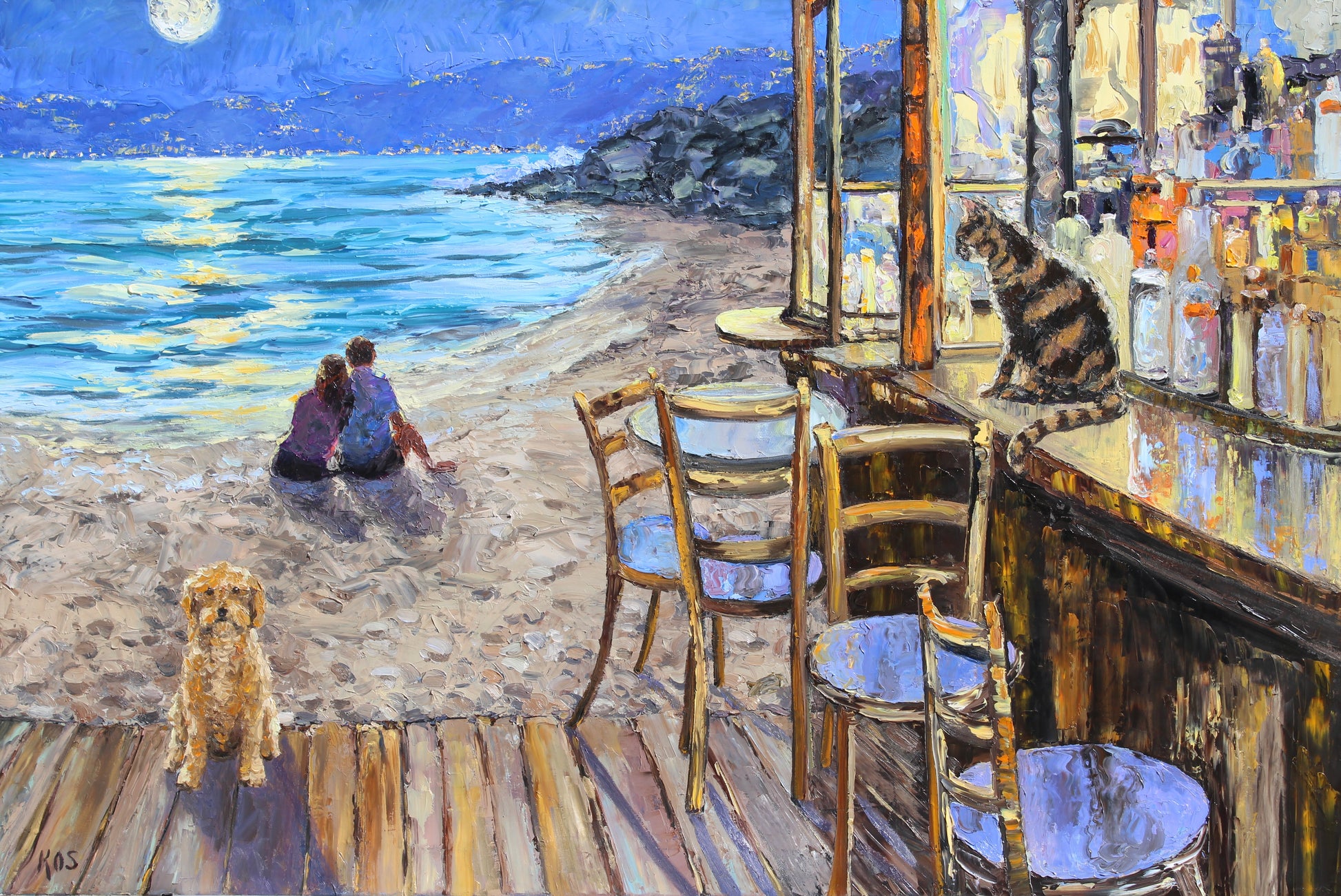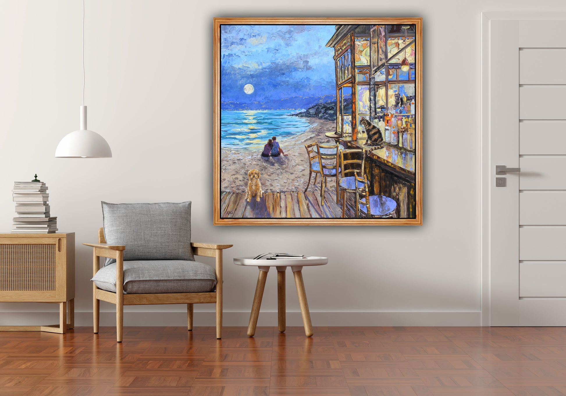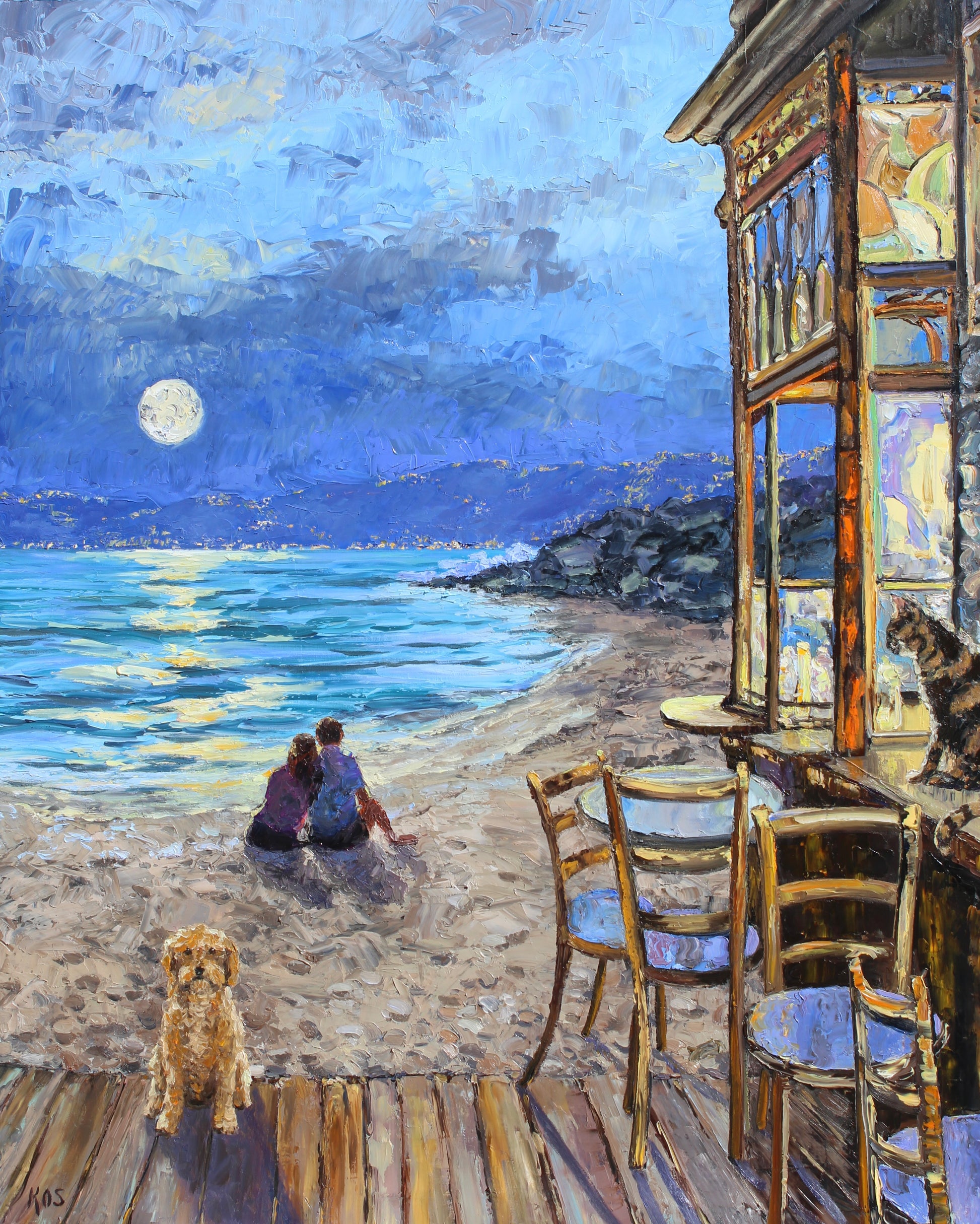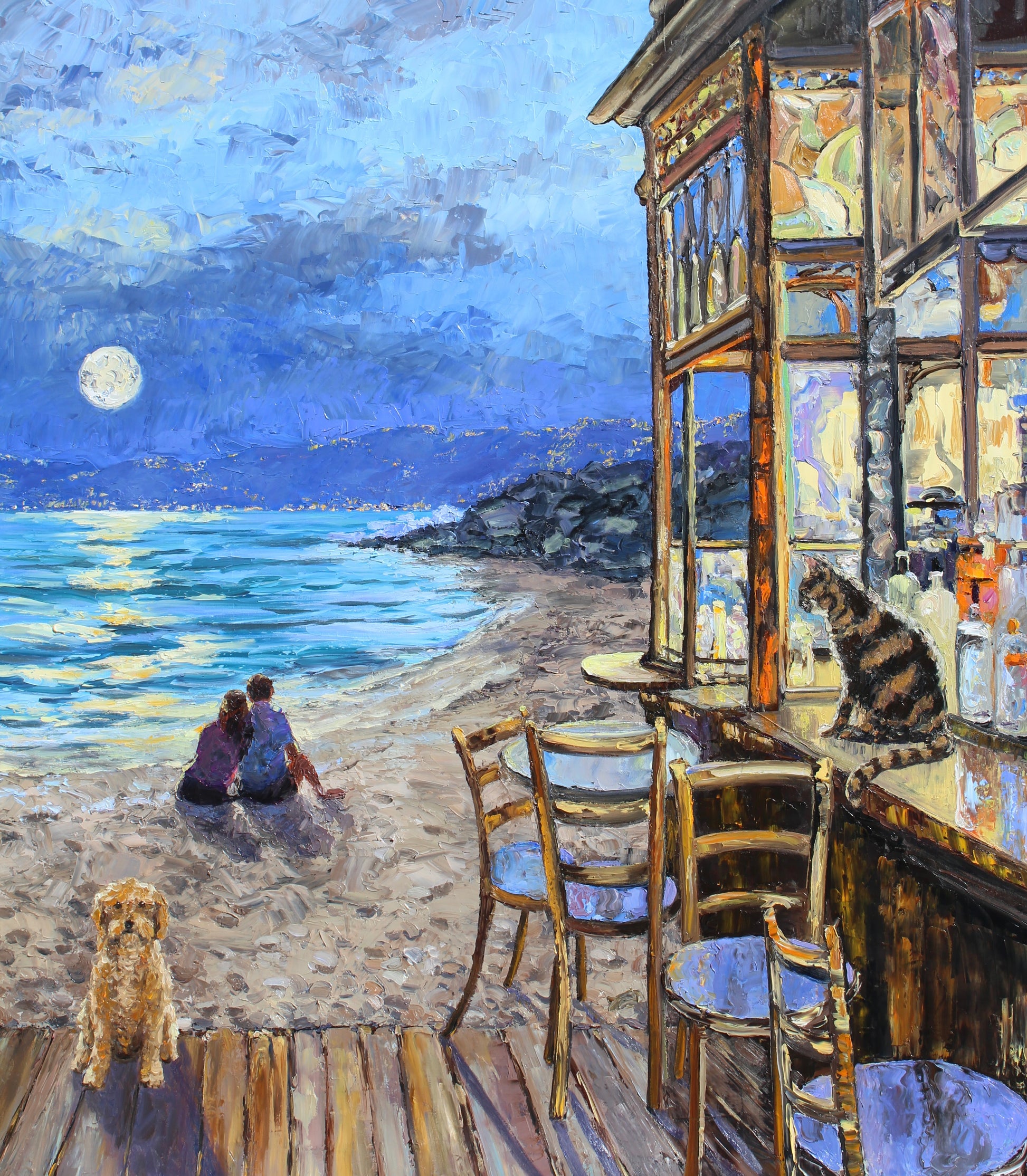 A softly lit seaside bar glows in colorful light. In silhouette, a cat is also gazing at the moon from atop the bar and a little dog is sitting quietly on the wooden boardwalk.