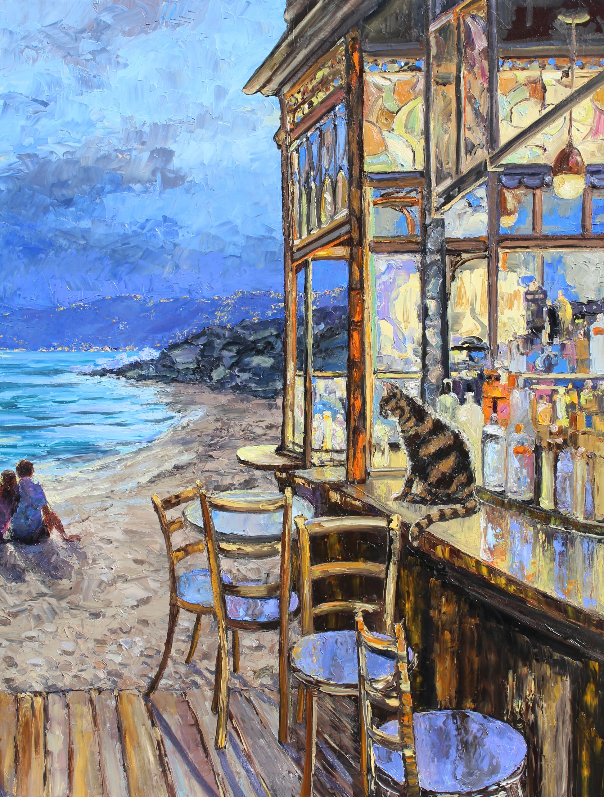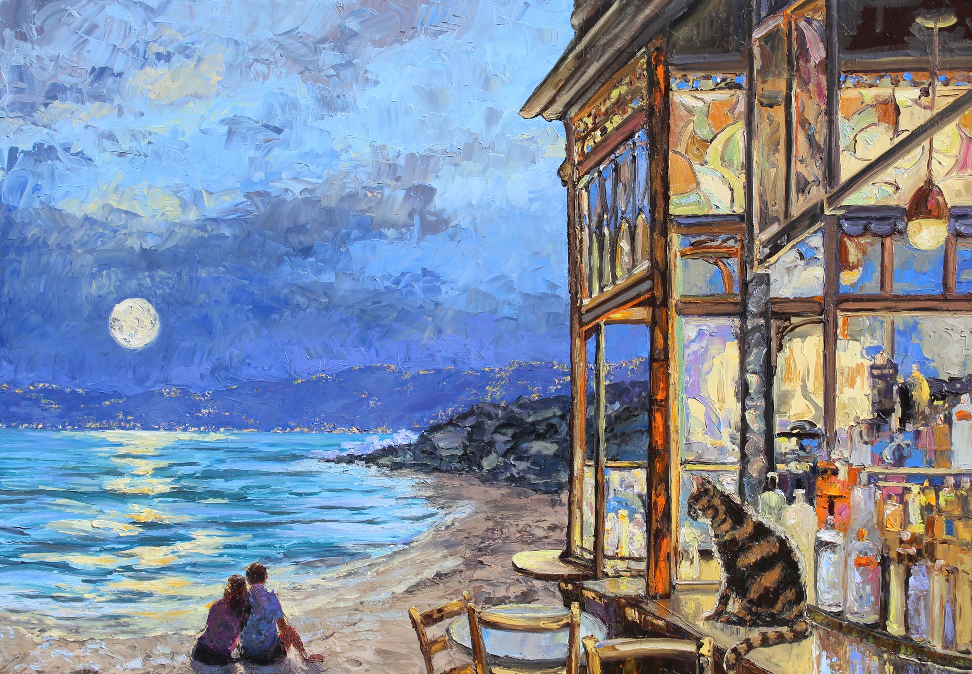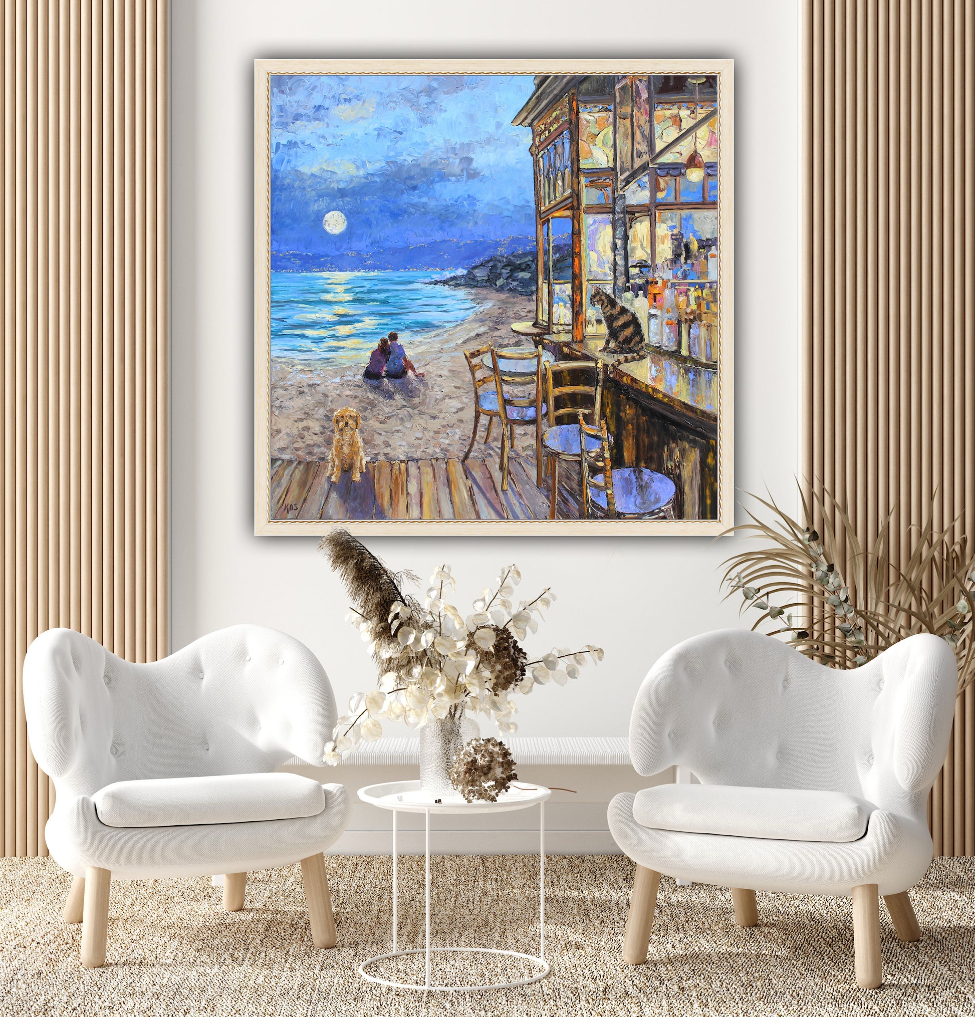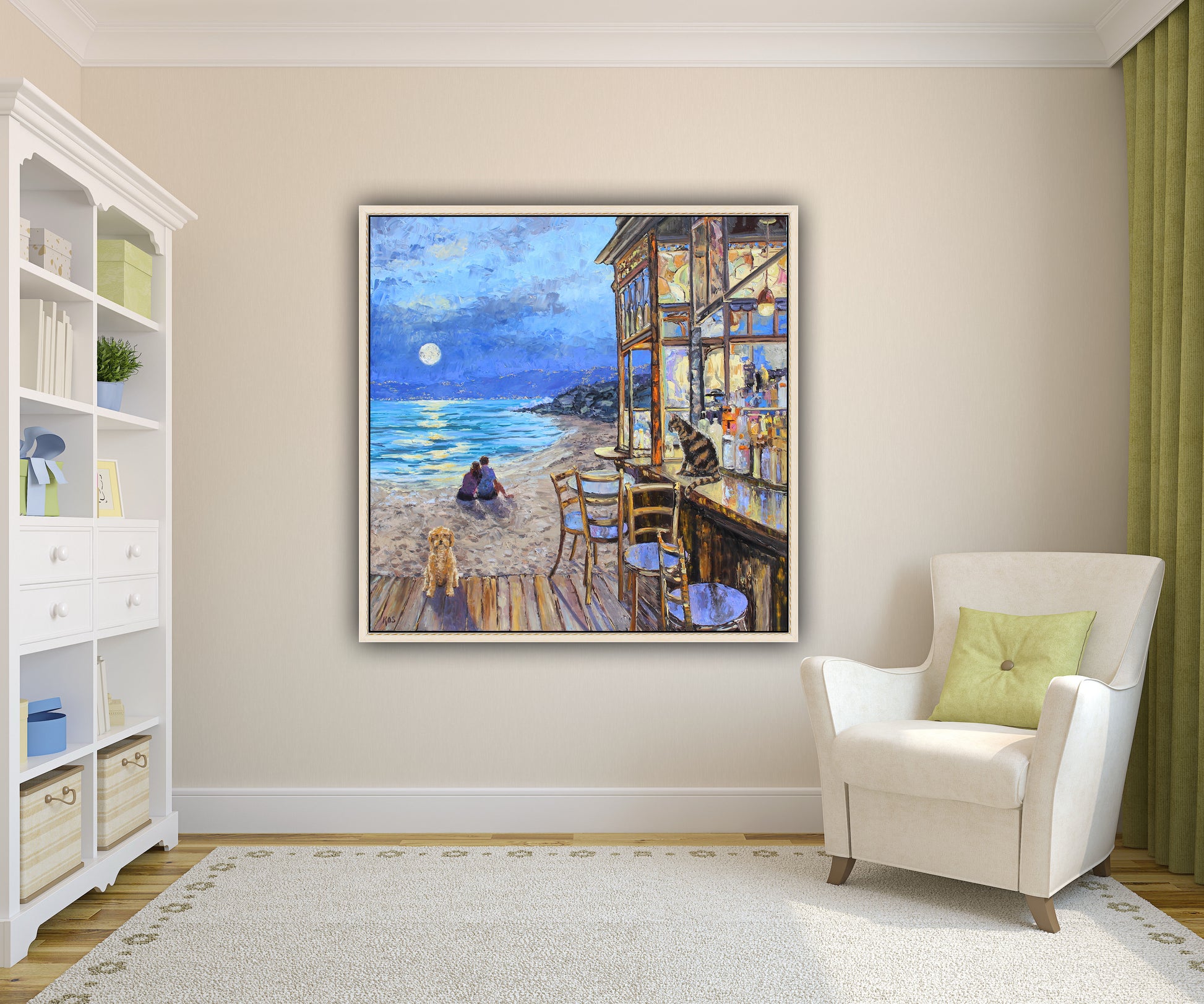A softly lit seaside bar glows in colorful light. In silhouette, a cat is also gazing at the moon from atop the bar and a little dog is sitting quietly on the wooden boardwalk.