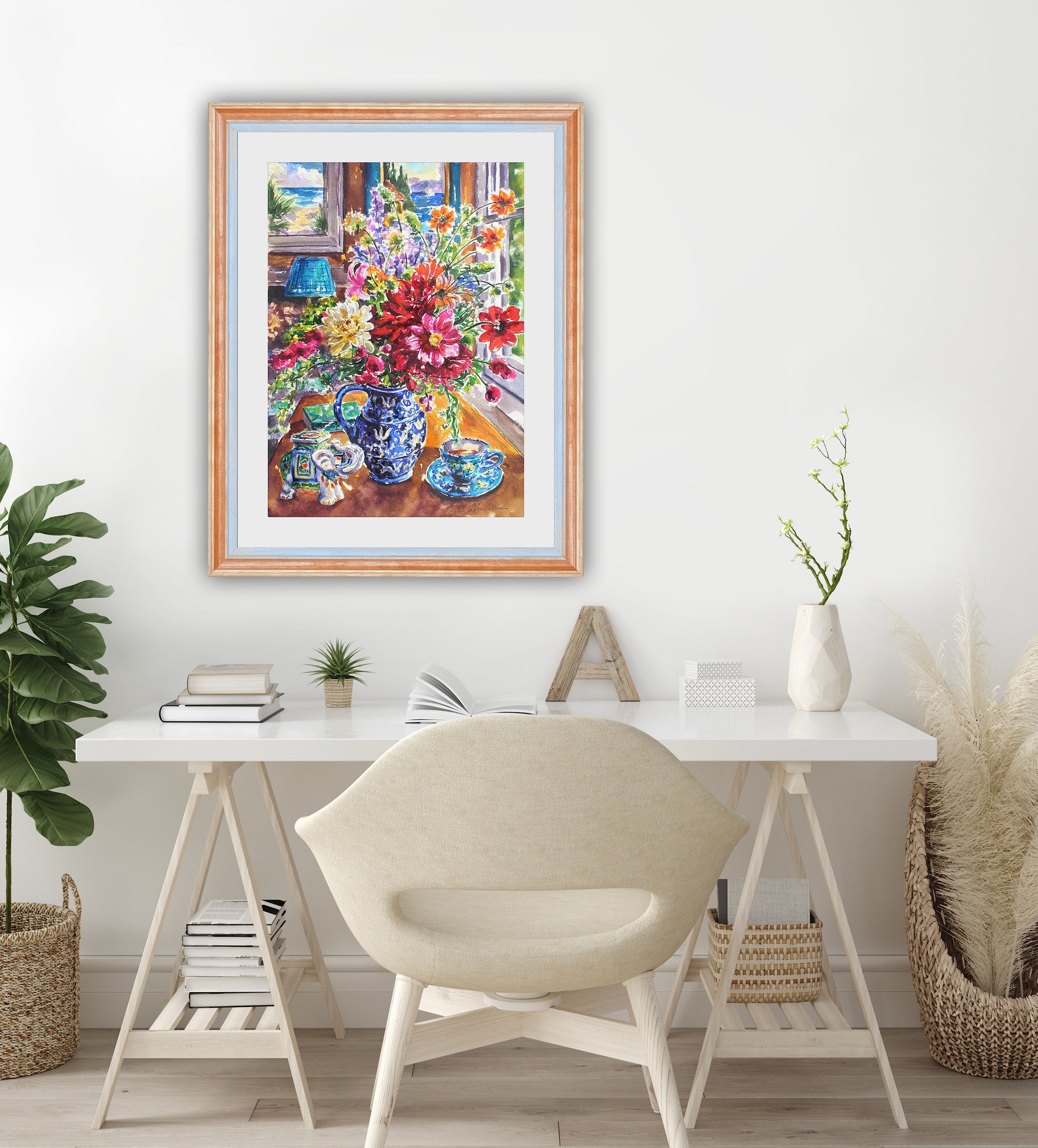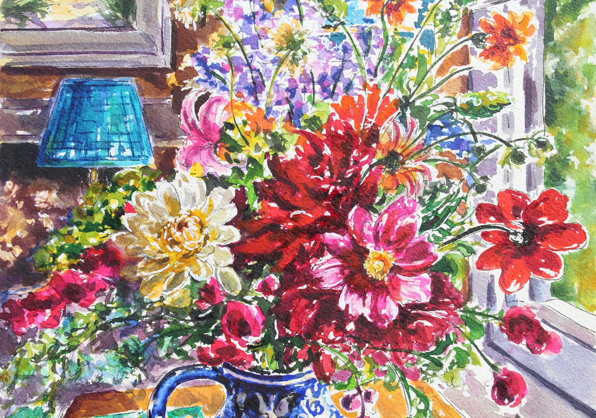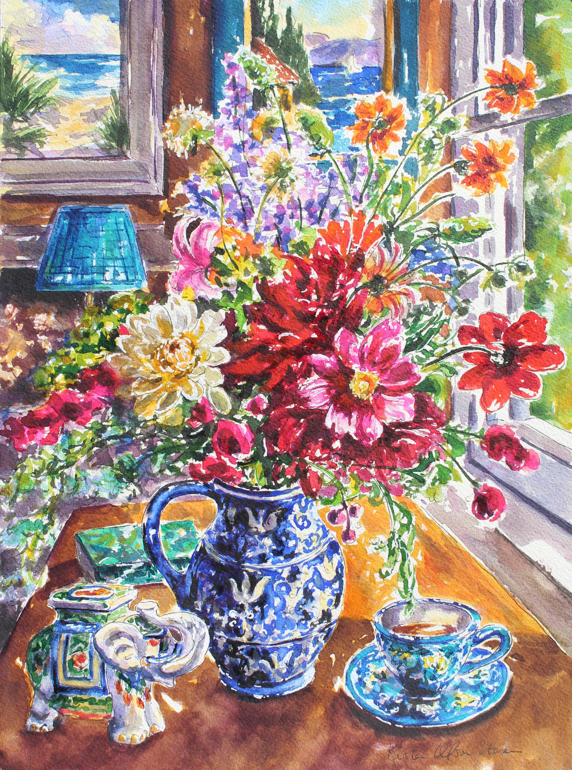 A colorful bouquet of dahlias and other beautiful flowers sits in a chinoiserie blue and white vase on a table by a sunlit window. The scene includes a decorative elephant and a teacup.