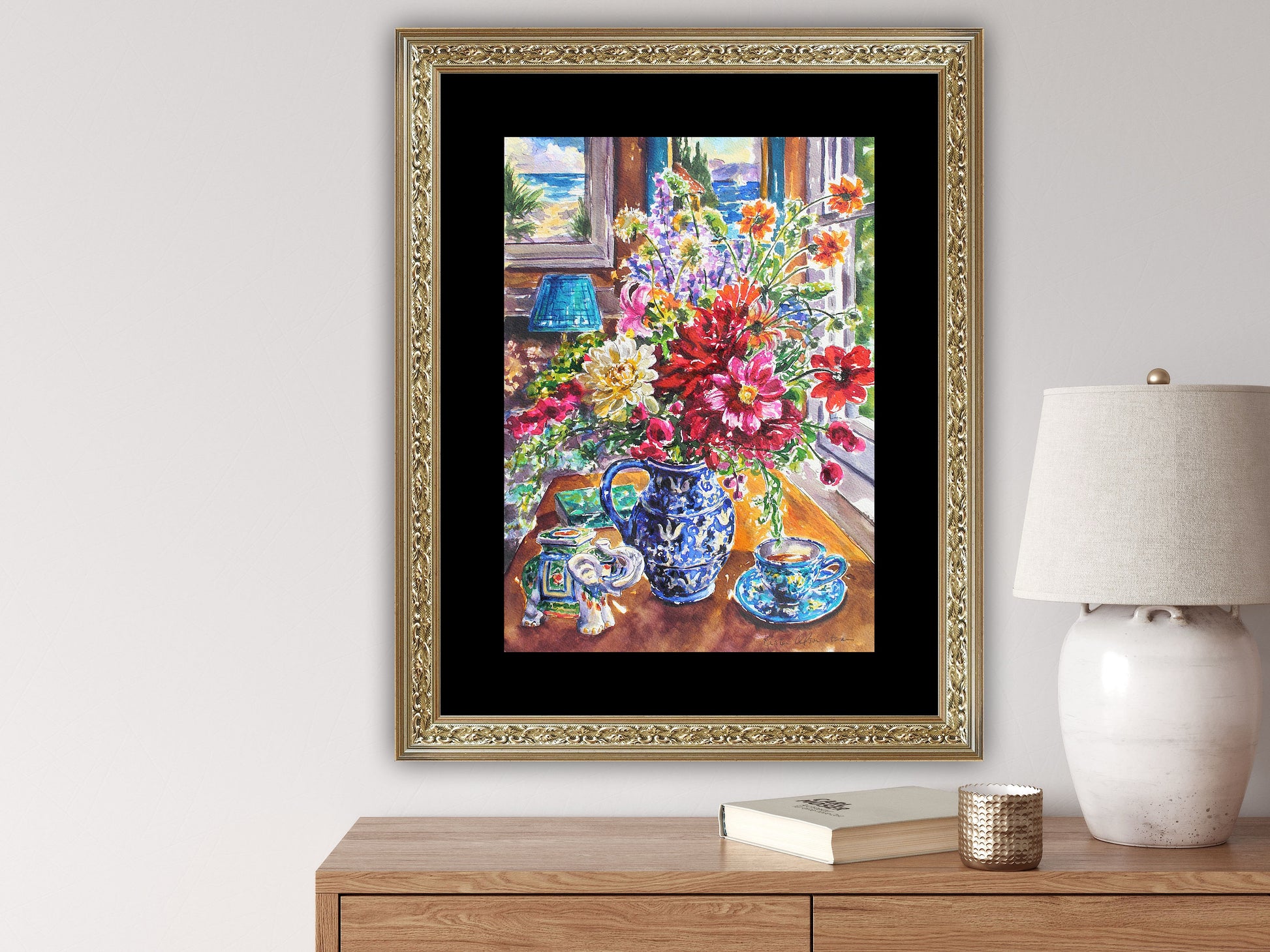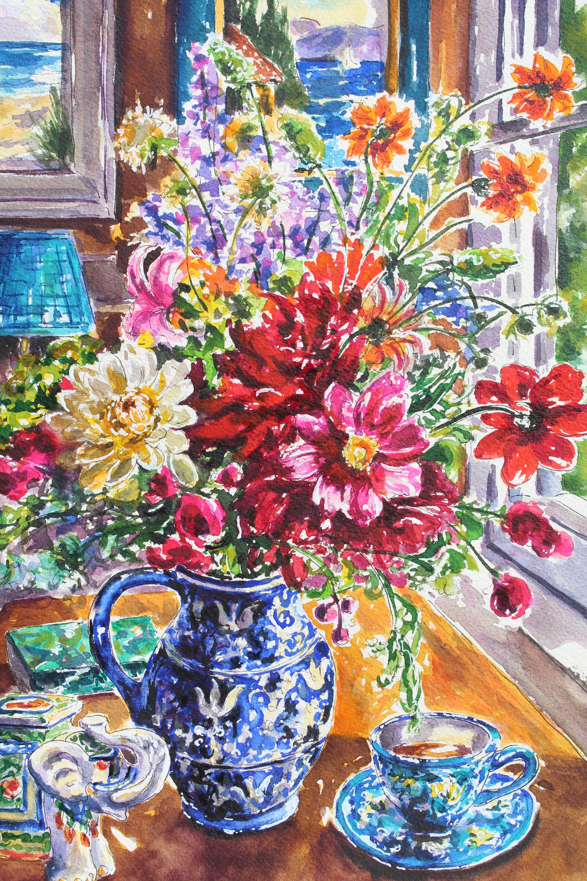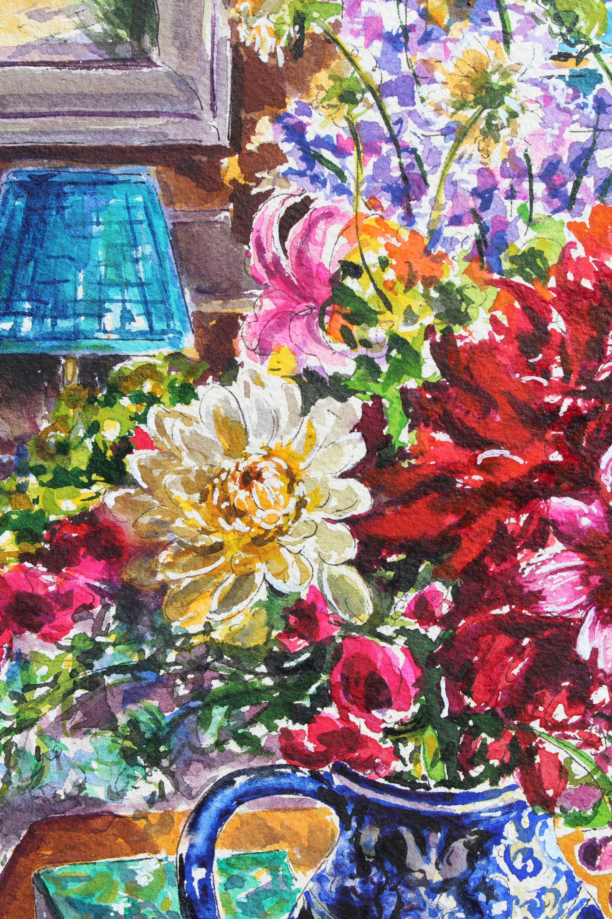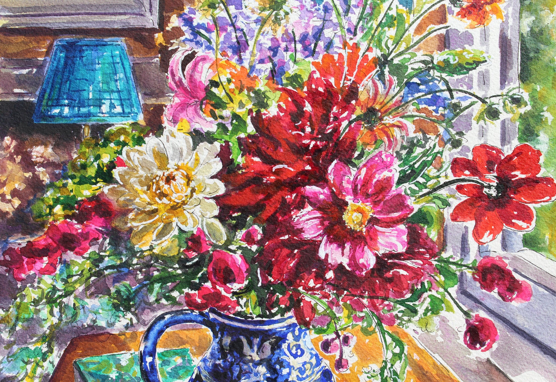 A colorful bouquet of dahlias and other beautiful flowers sits in a chinoiserie blue and white vase on a table by a sunlit window. The scene includes a decorative elephant and a teacup.