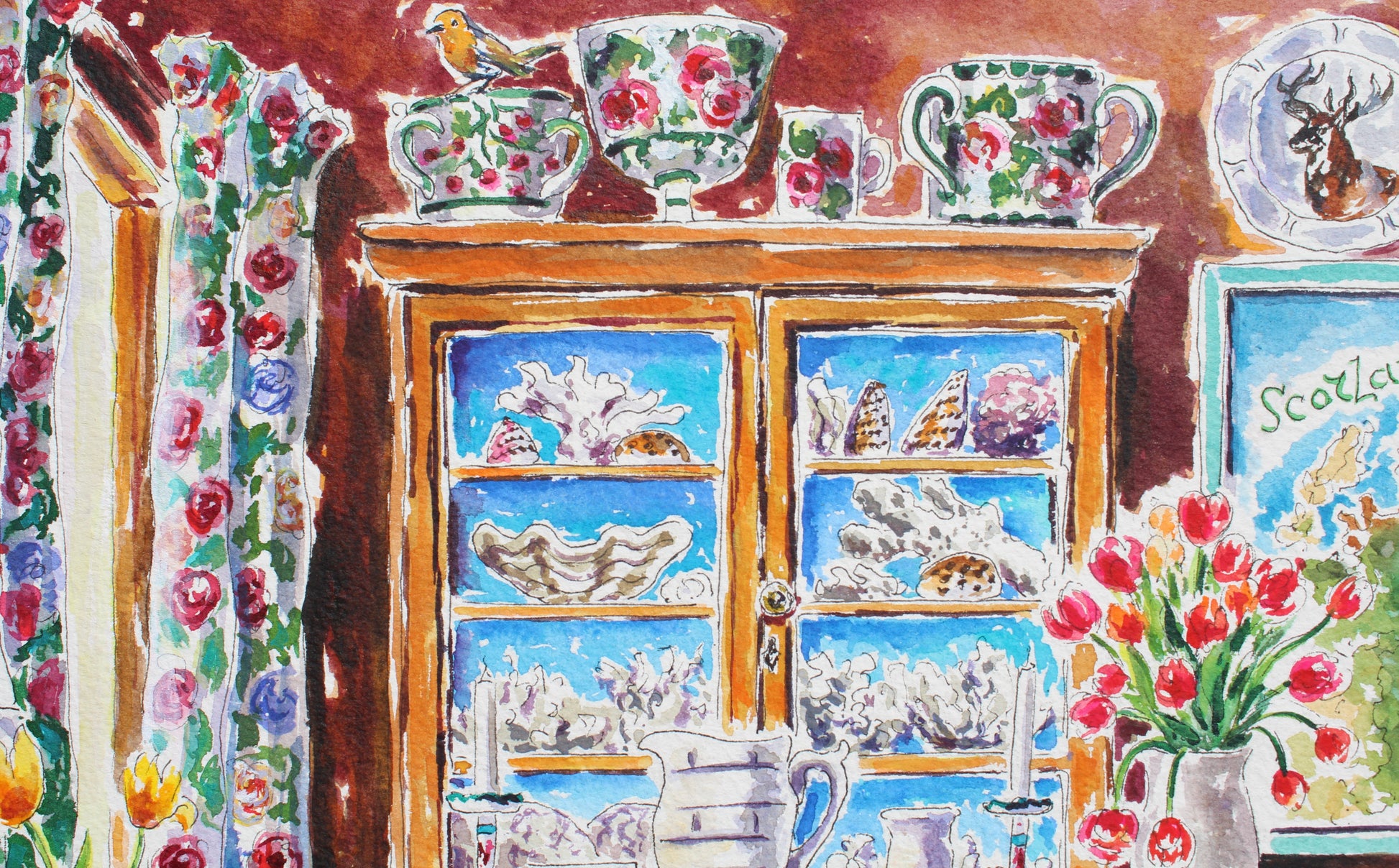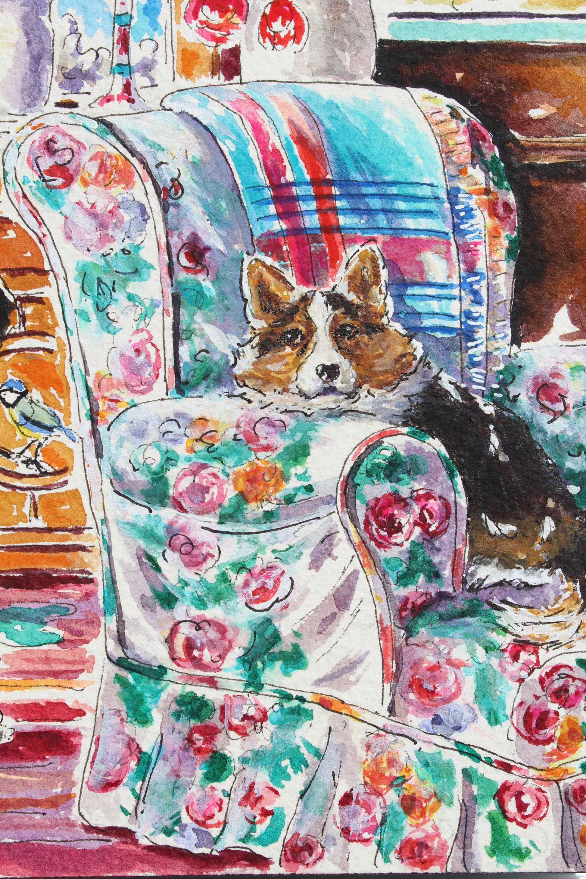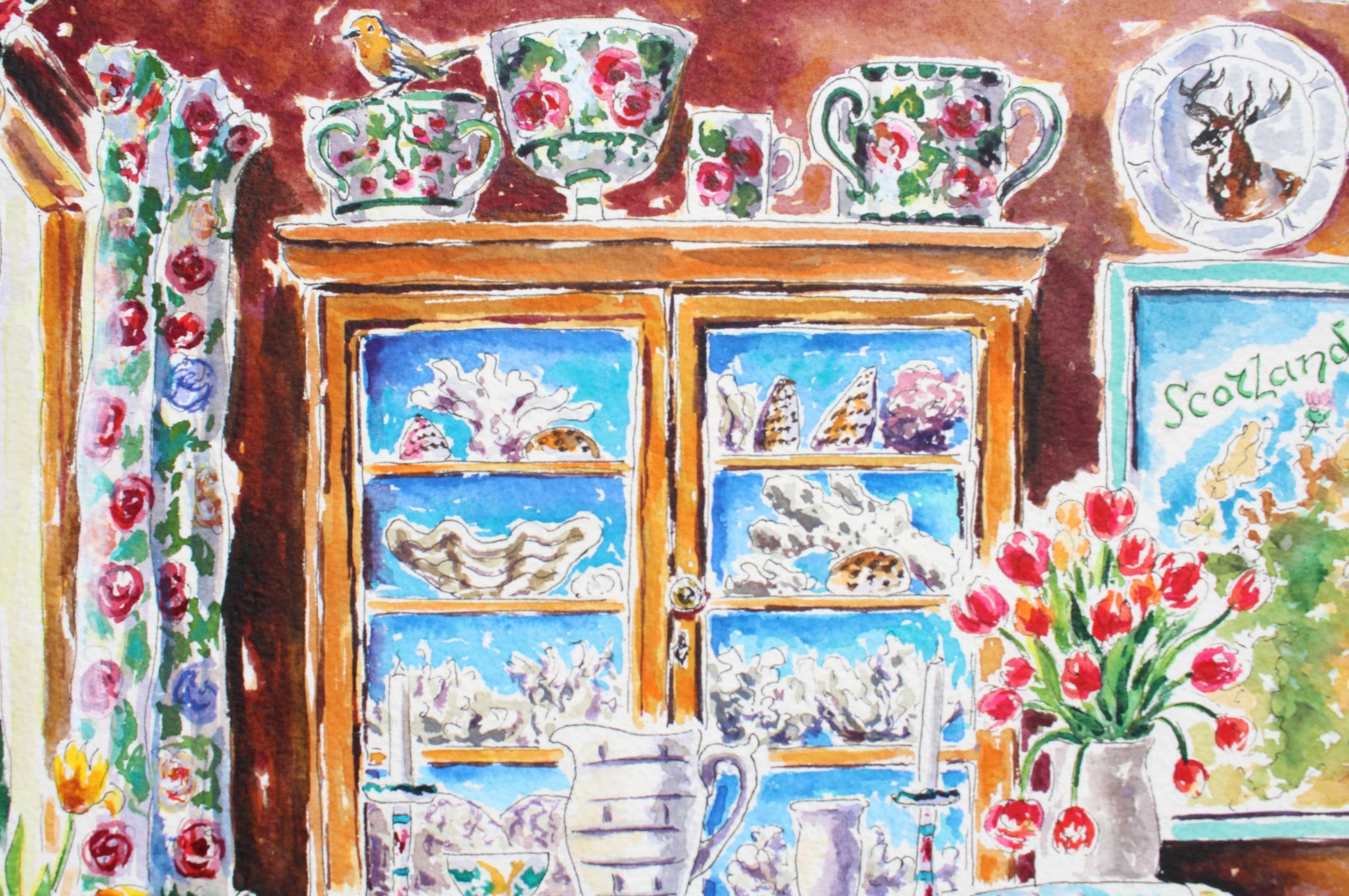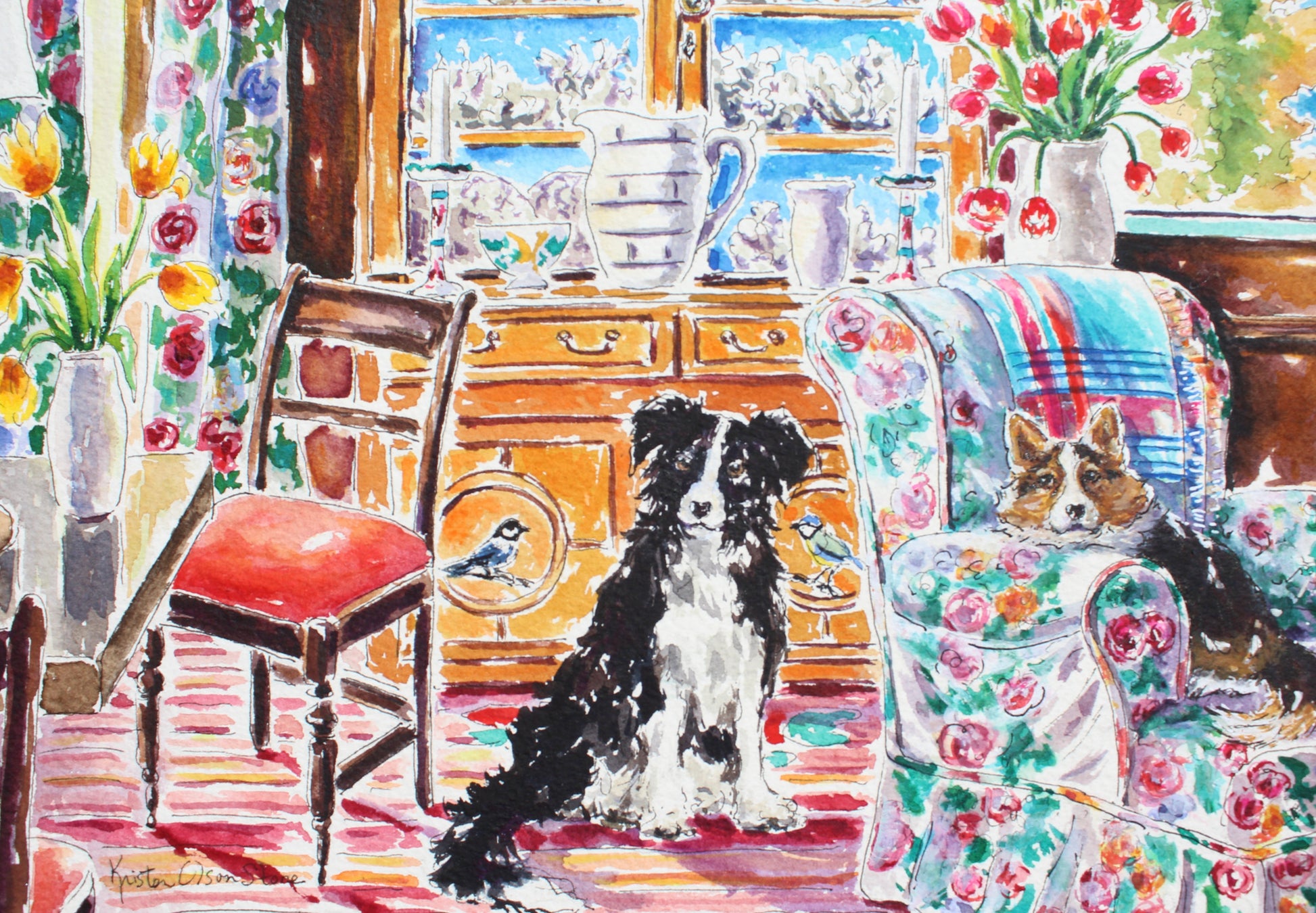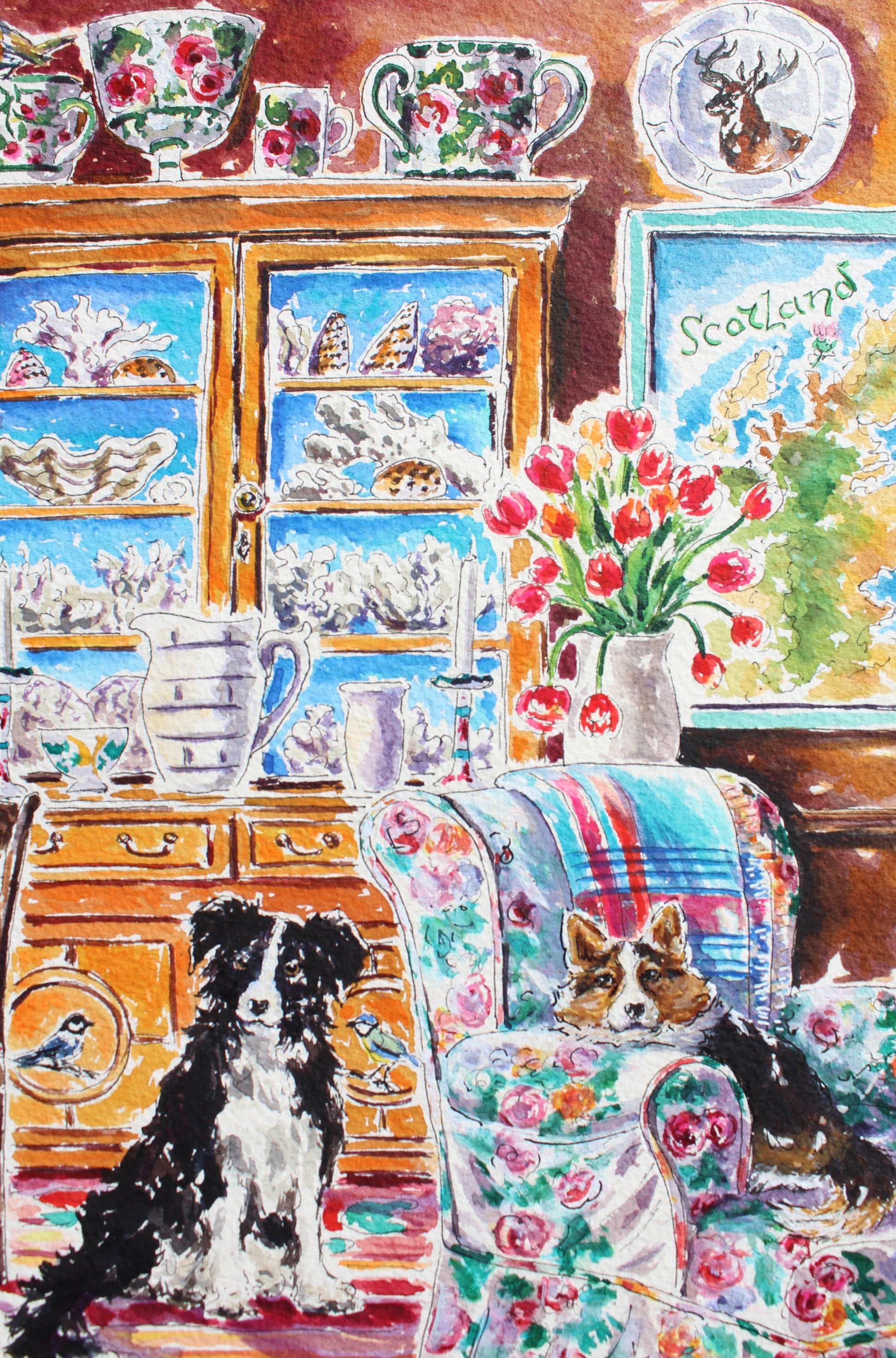 An open edition watercolor and ink painting of a Scottish home interior with a Border Collie and a Pembroke Corgi! Scottish birds are also featured in this painting including a Robin, a Blue Tit and a Coal Tit. This room invites you to sit down in front of the window and enjoy the warmth of this interior. Tulips and a cabinet filled with treasures from the sea add to it's charm.
